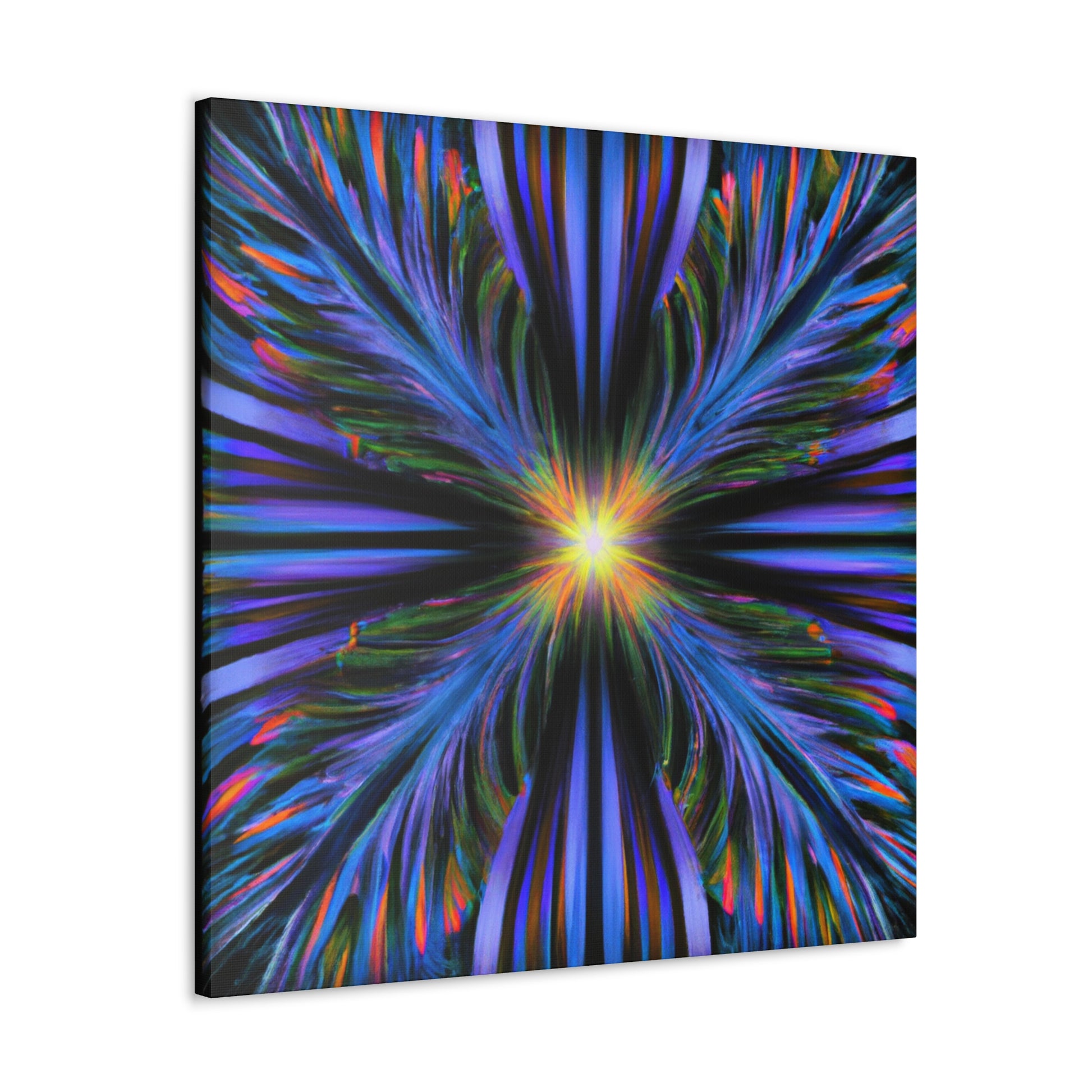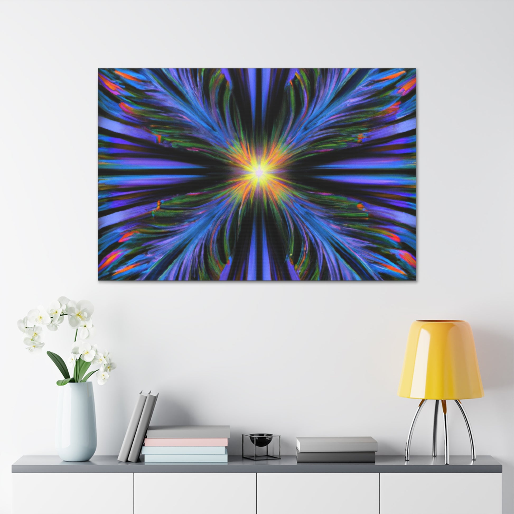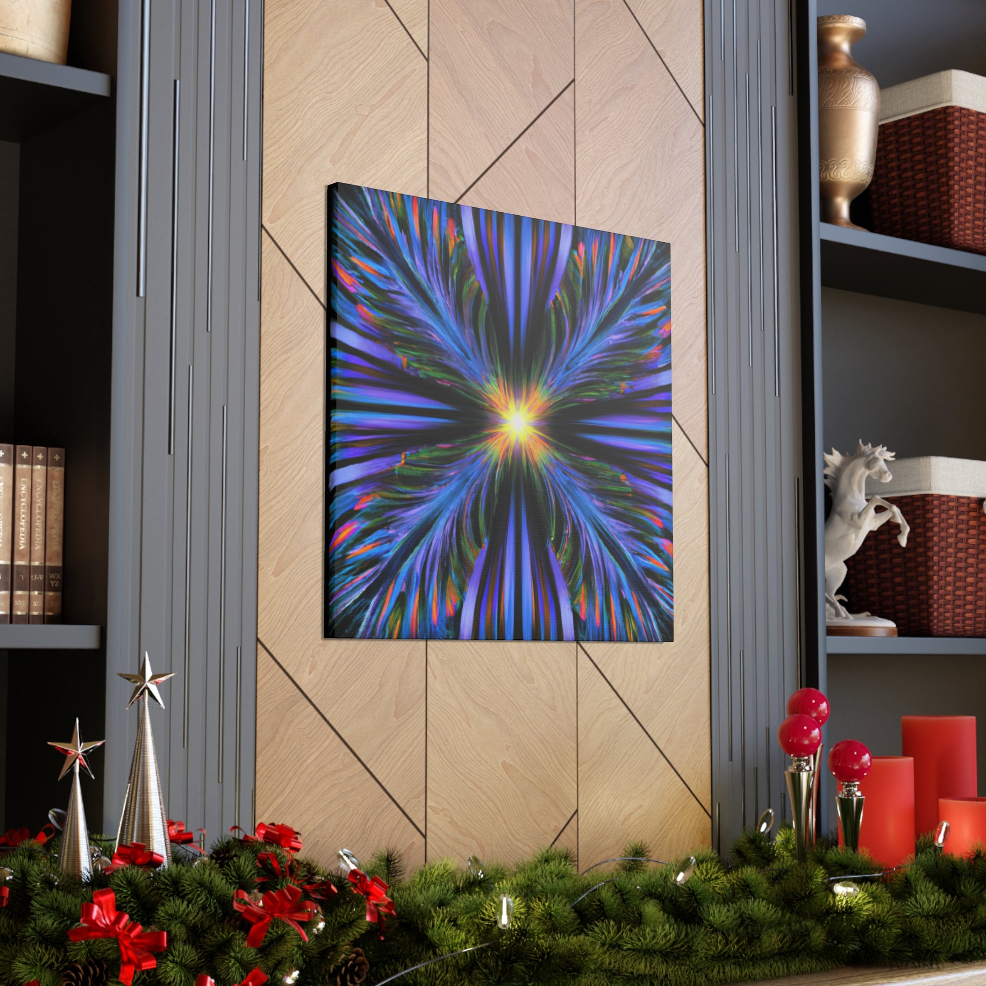 Make a statement with this captivating canvas featuring bold abstract art with an explosion of trippy geometric palm leaves, kaleidoscope, 3D lines and fractal. The vibrant colors and mesmerizing patterning will bring life and movement to any space, and is sure to be a conversation starter. #interiordesign #digitalart #wallart #statementpiece #canvasprint #kaleidoscope #palmleaves #trippy #fractal #abstractart #vibrantcolors