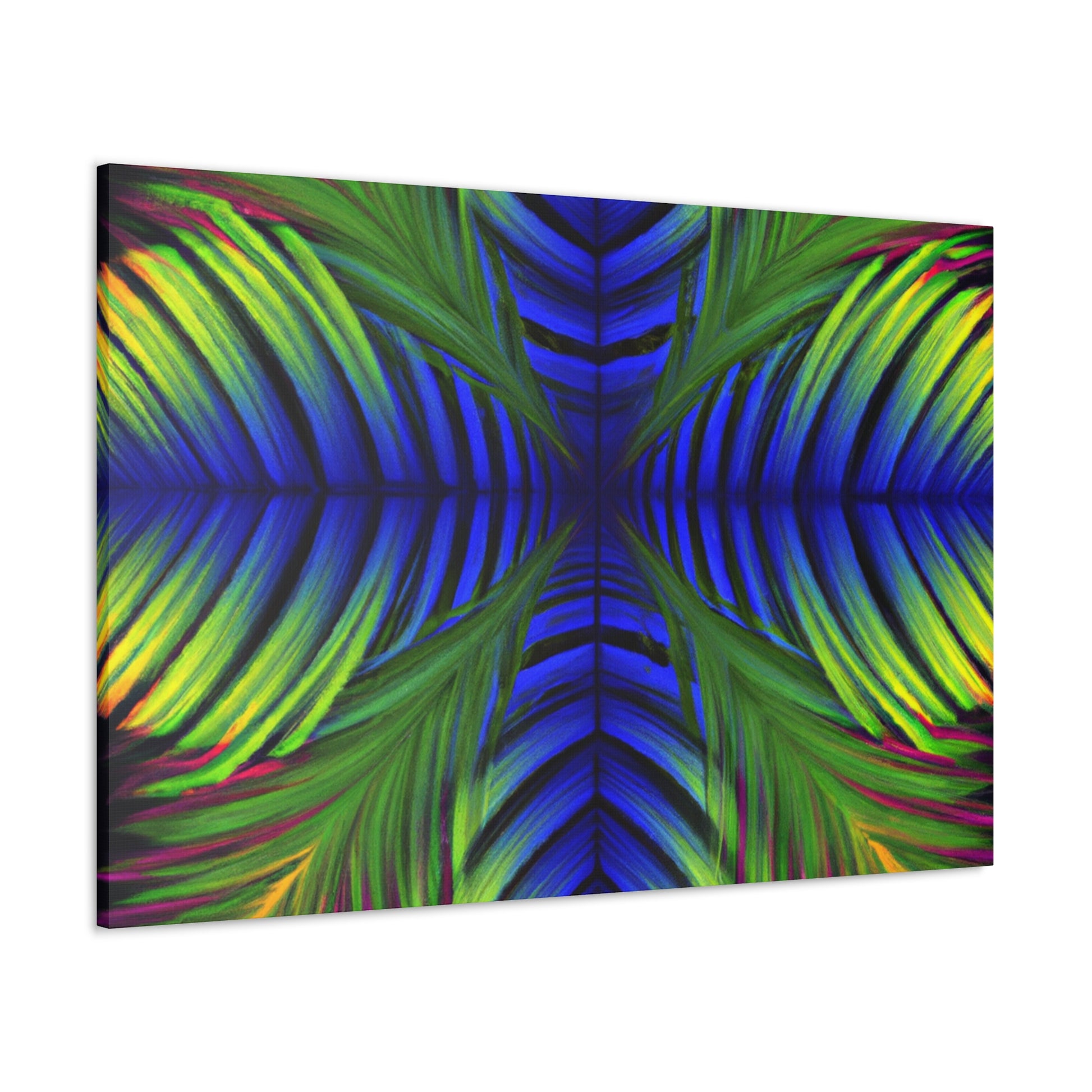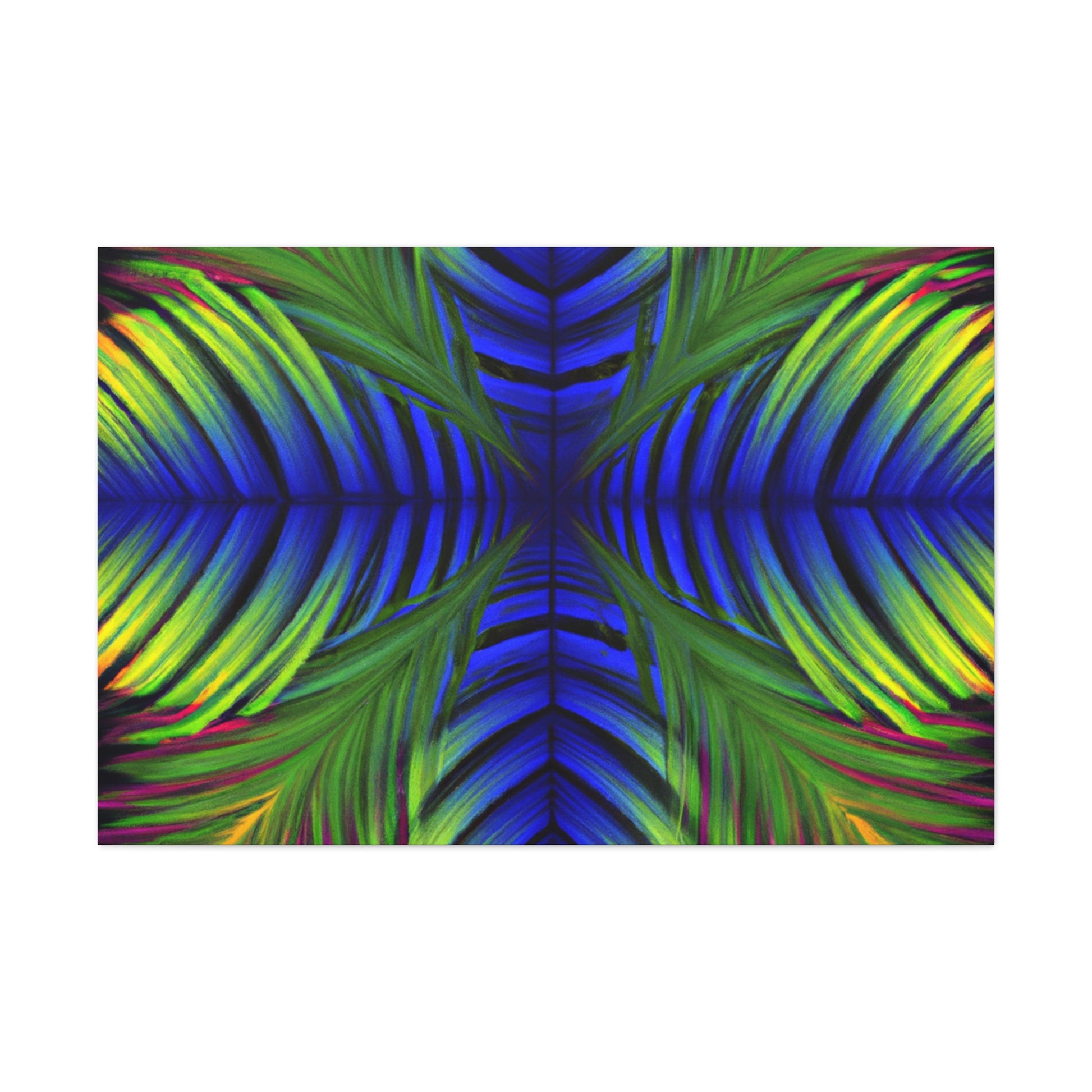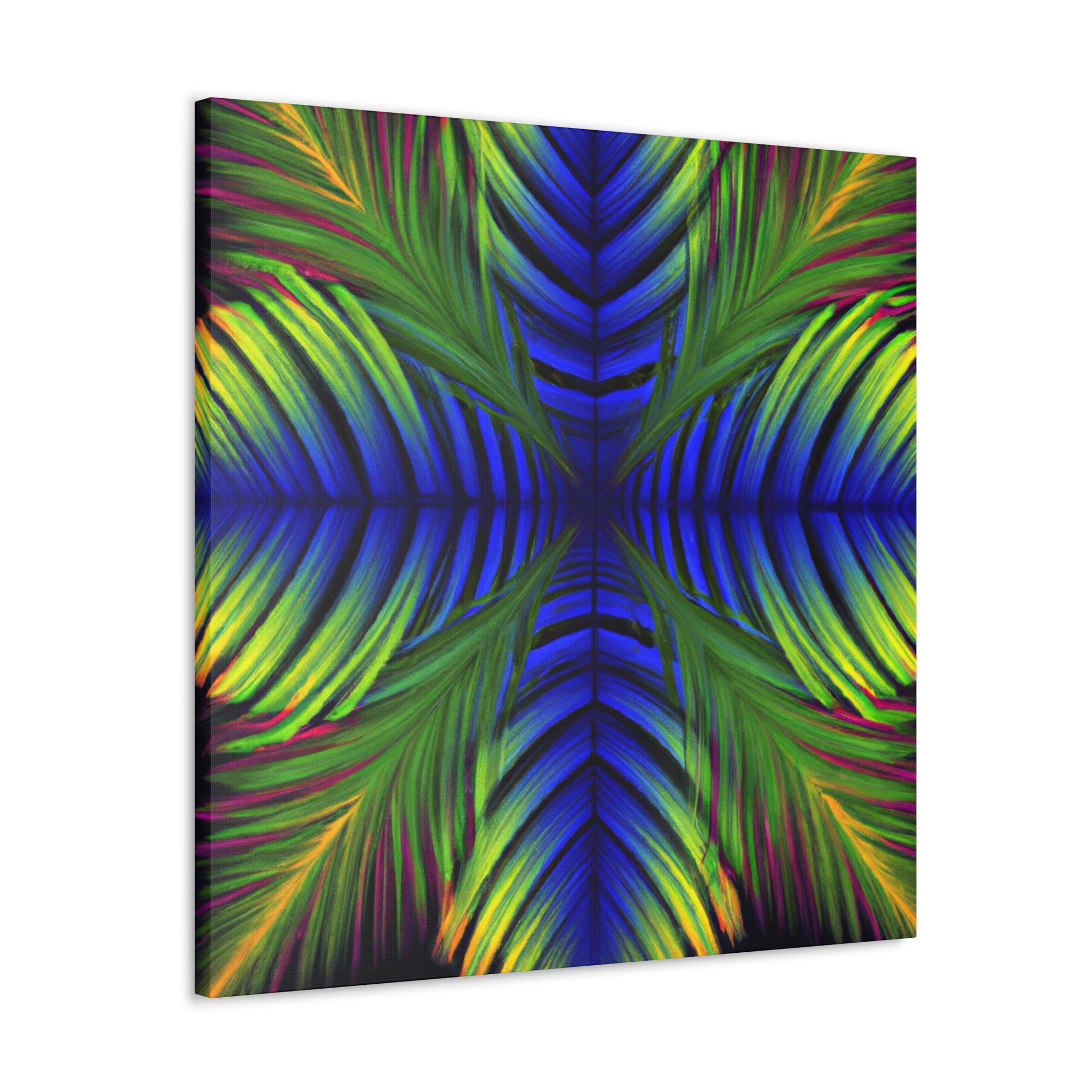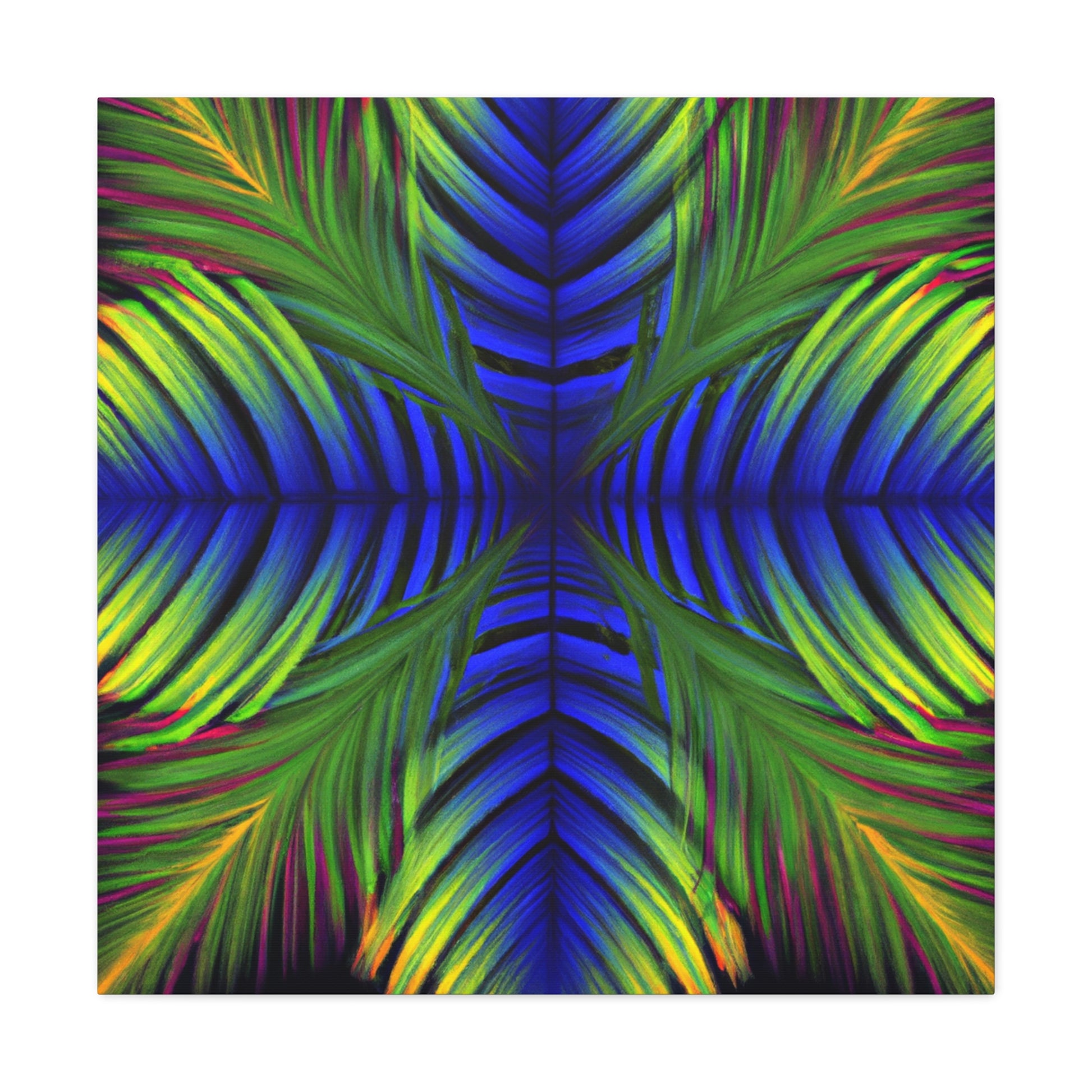 This canvas displays an exotic Trippy Geometric Palm Leaf with a myriad of abstract shapes, vibrant colors, deep 3D lines, and a hypnotizing Fractal. It's a modern combination of vibrant digital art and psychedelic design, creating a captivating work of art that will bring life and color to any space! #canvasart #trippyart #modernart #kaleidoscope #psychedelicdesign #abstractart #fractalart #colorsplash #3Dlines #vibrantcolors #palmleafart
