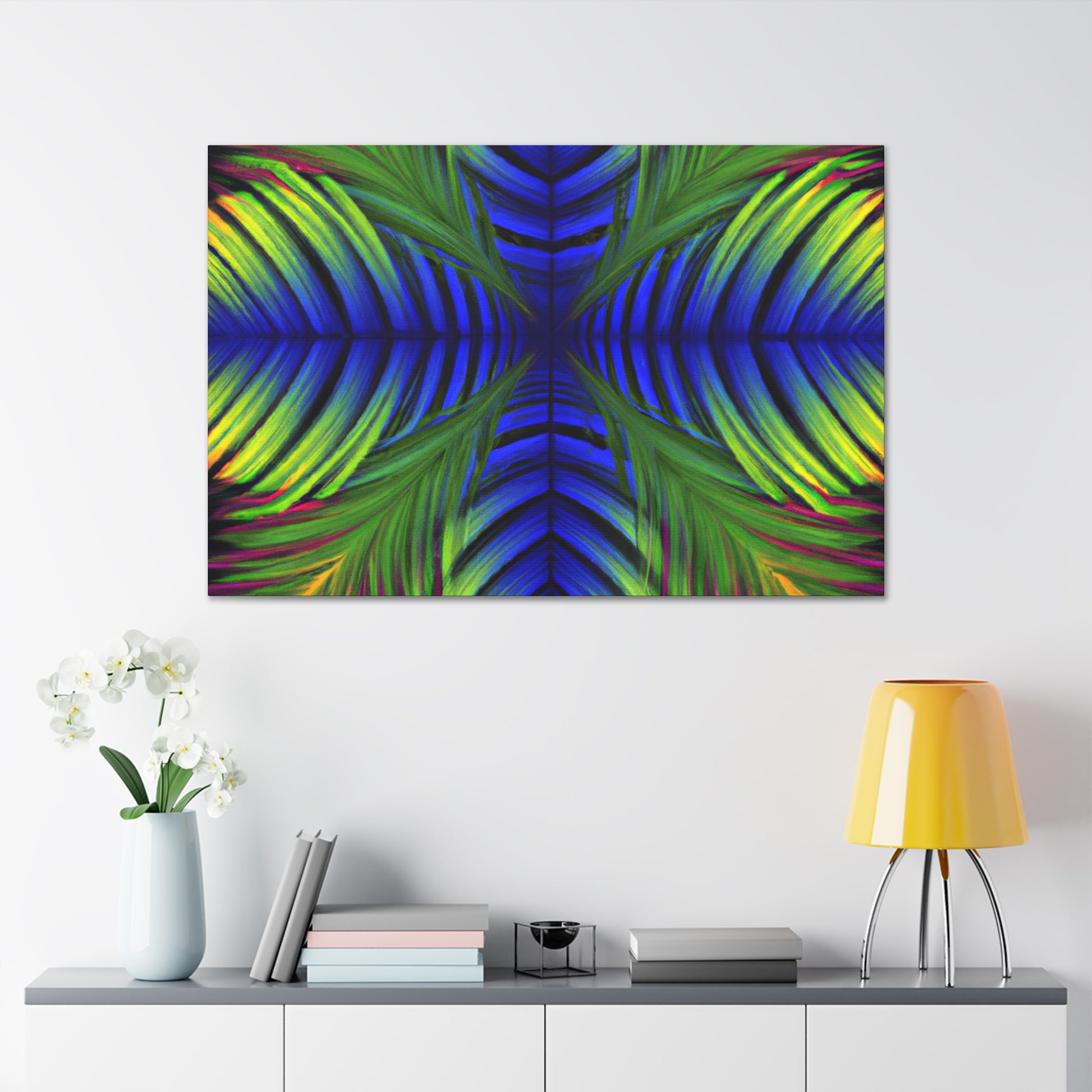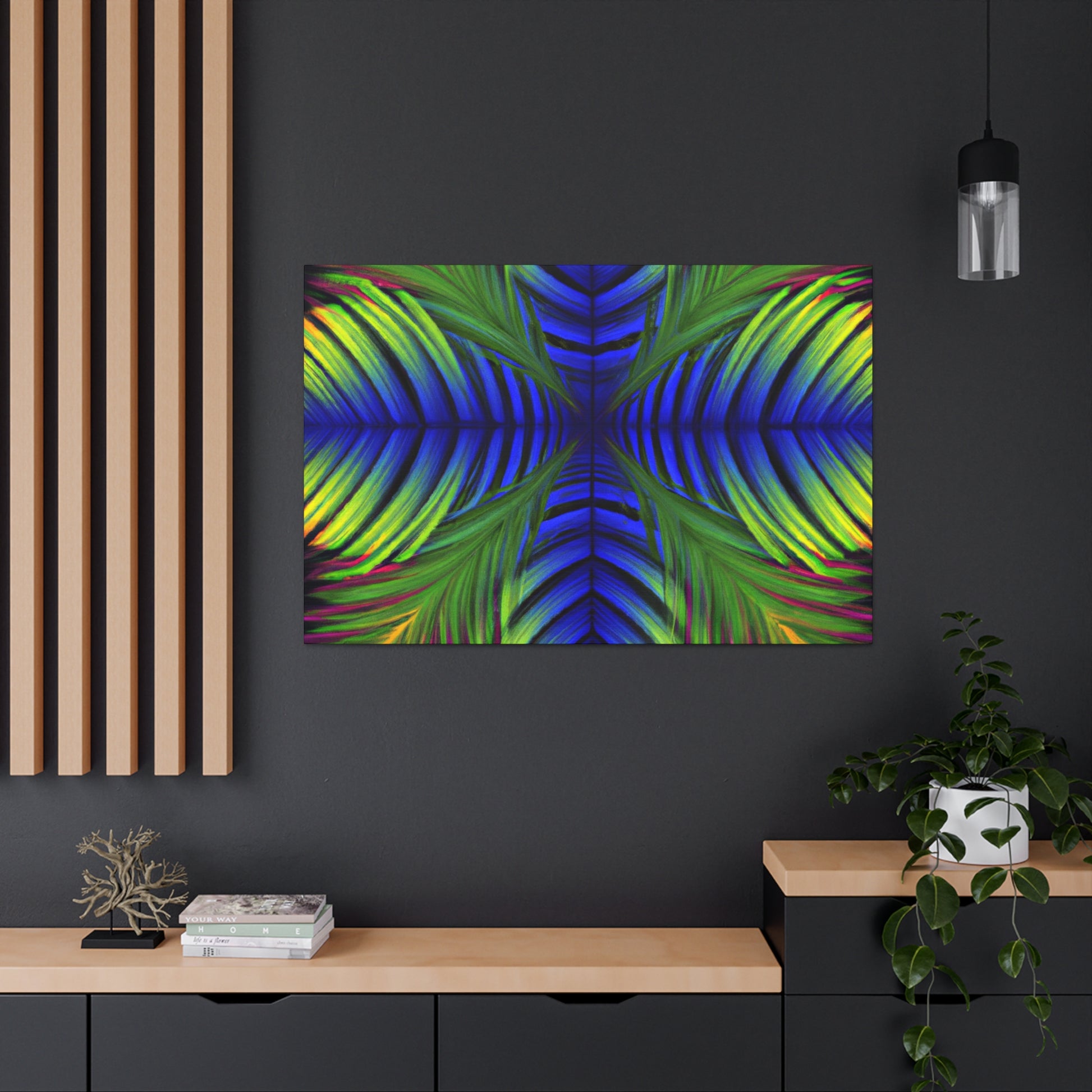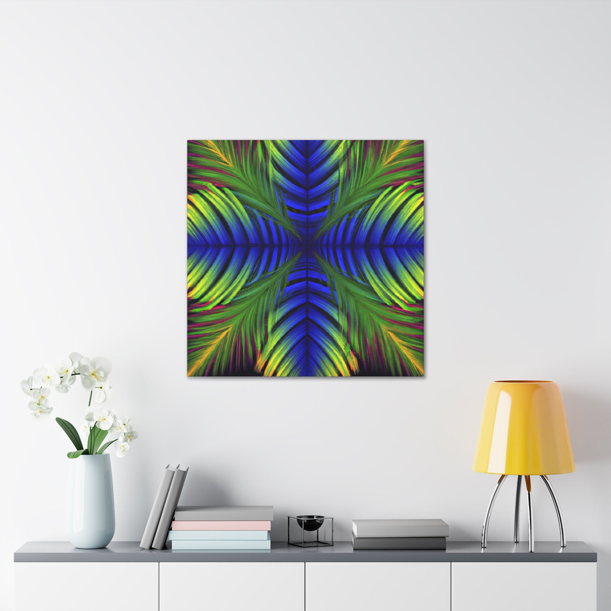 This canvas displays an exotic Trippy Geometric Palm Leaf with a myriad of abstract shapes, vibrant colors, deep 3D lines, and a hypnotizing Fractal. It's a modern combination of vibrant digital art and psychedelic design, creating a captivating work of art that will bring life and color to any space! #canvasart #trippyart #modernart #kaleidoscope #psychedelicdesign #abstractart #fractalart #colorsplash #3Dlines #vibrantcolors #palmleafart