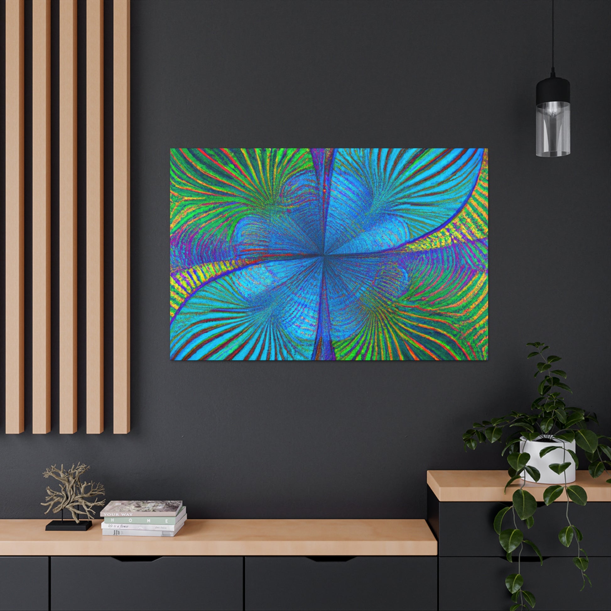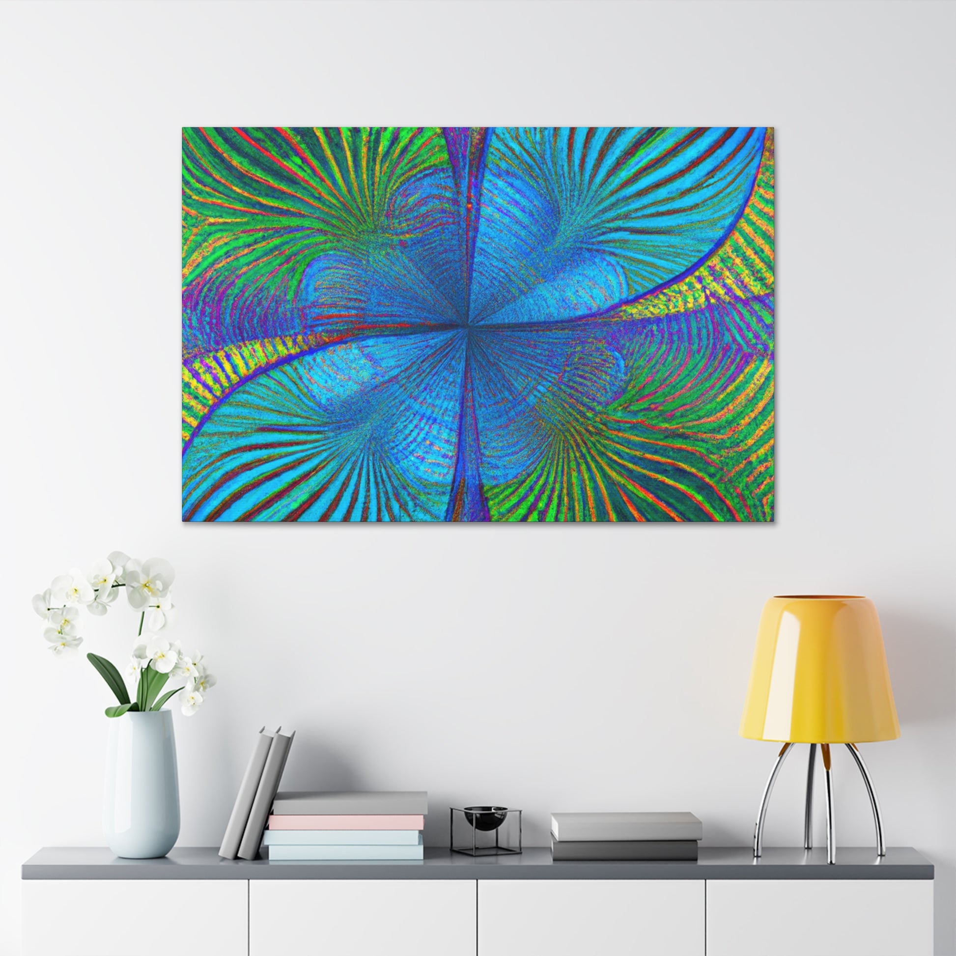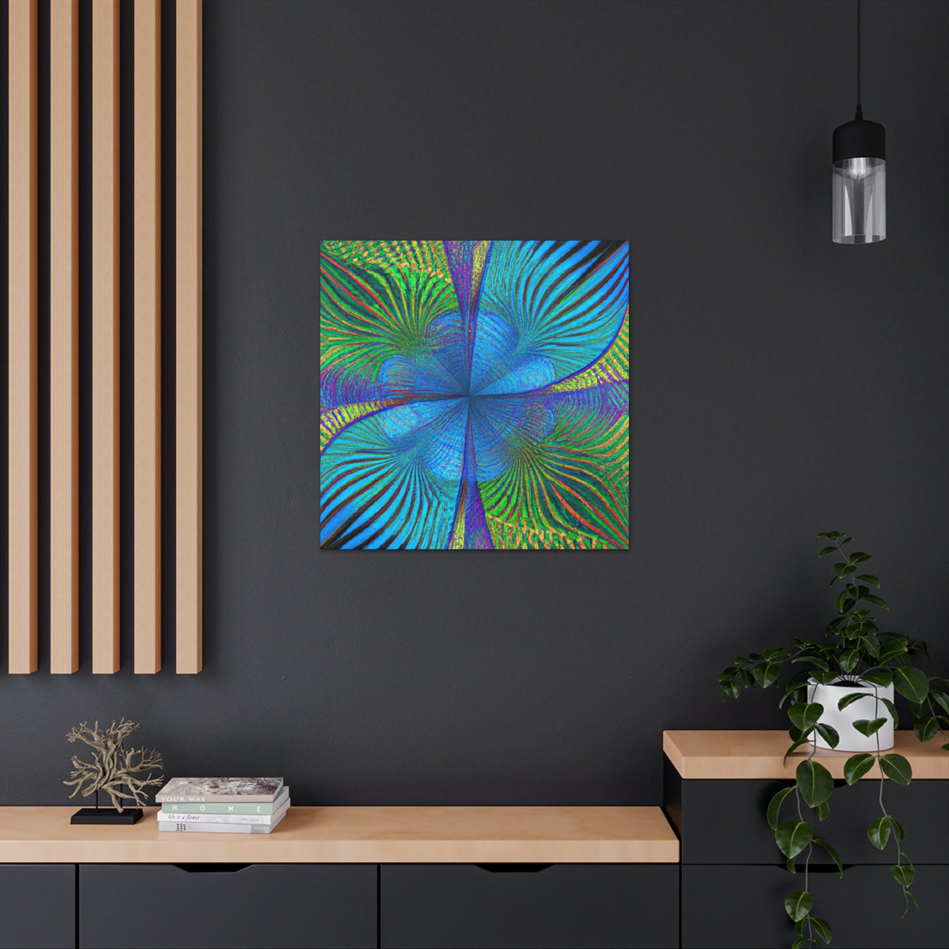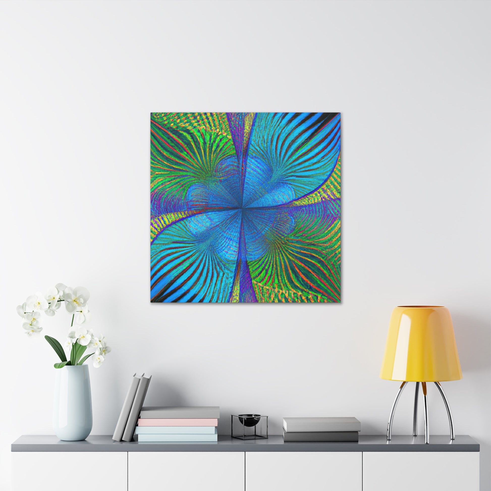 This vivid, abstract canvas features a distinct geometric pattern of kaleidoscope palm leaves in luxurious, eye-catching 3D lines and an electric color palette. The combination of ultra-modern and depth creates a mesmerizing effect that will make a statement in any room. Invite a luxurious, trippy vibe into your living space and experience the energy this art brings. #abstractart #digitalart #vibrantcolors #kaleidoscope #fractal #trippyart #palmleaves #3Dlines #geometricart #interiorinspo #modernart