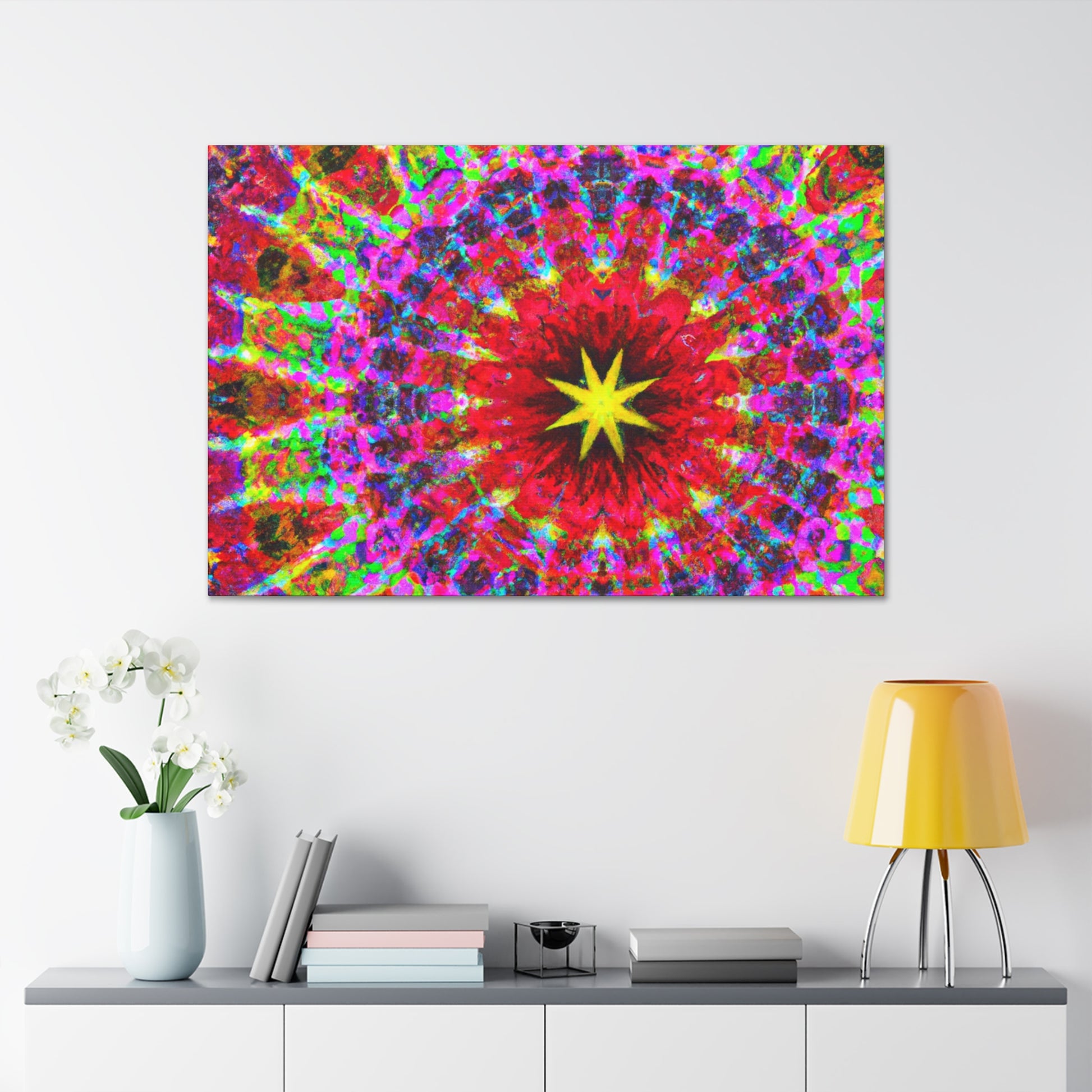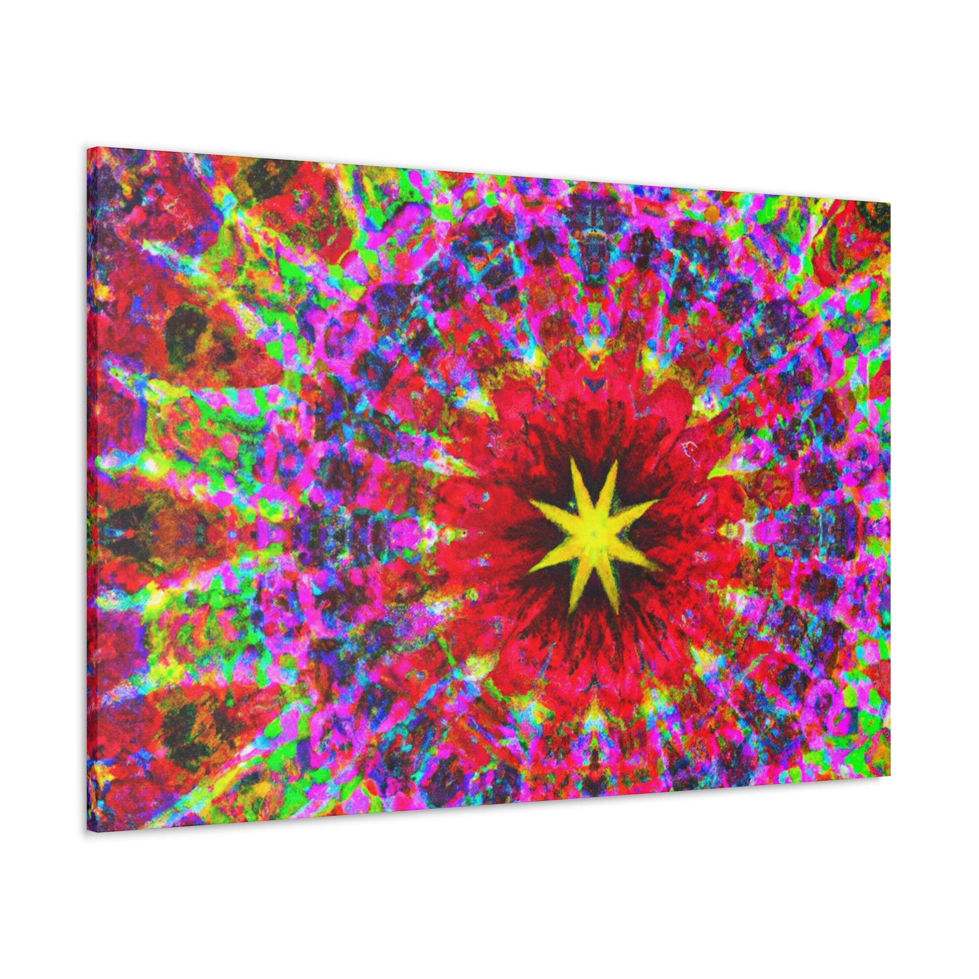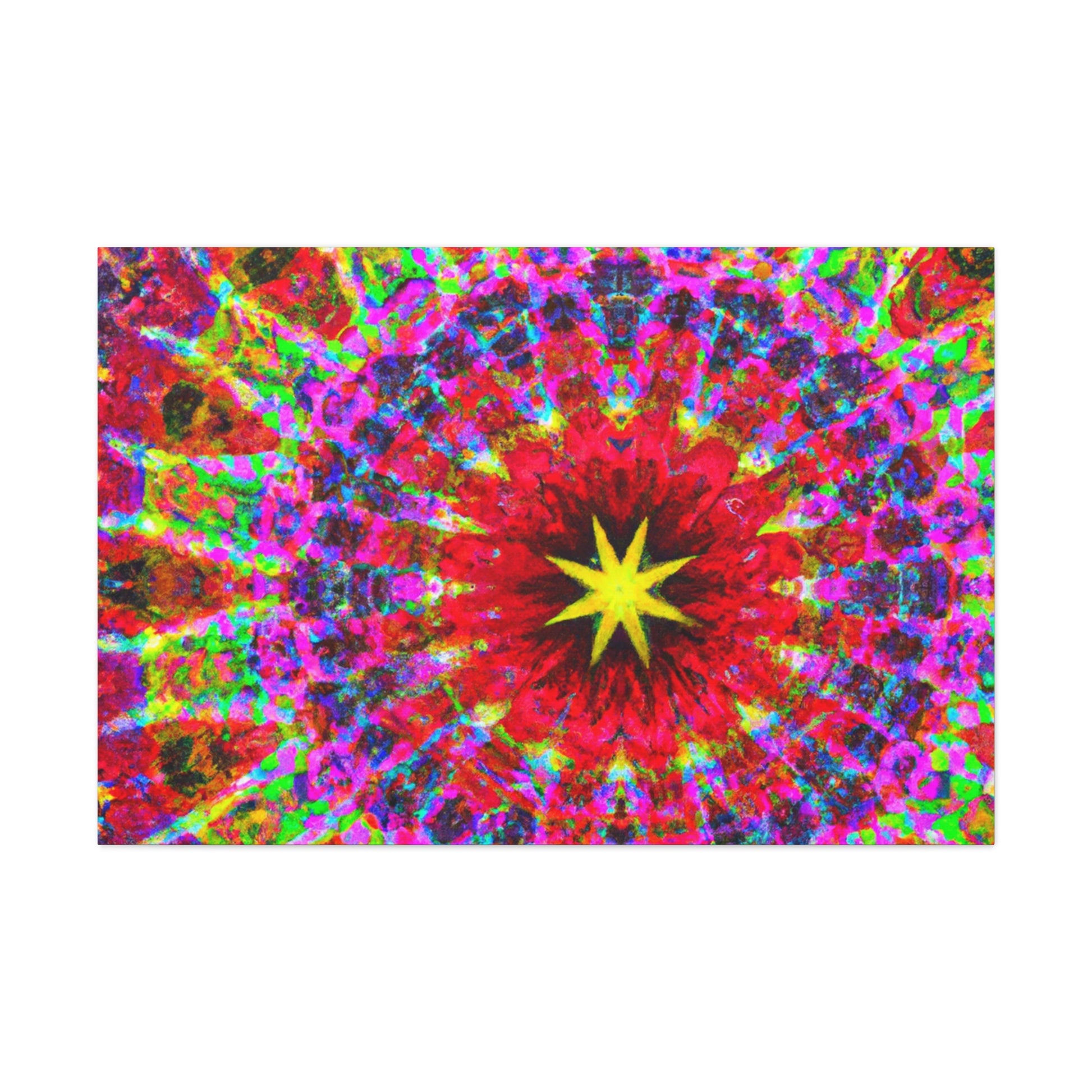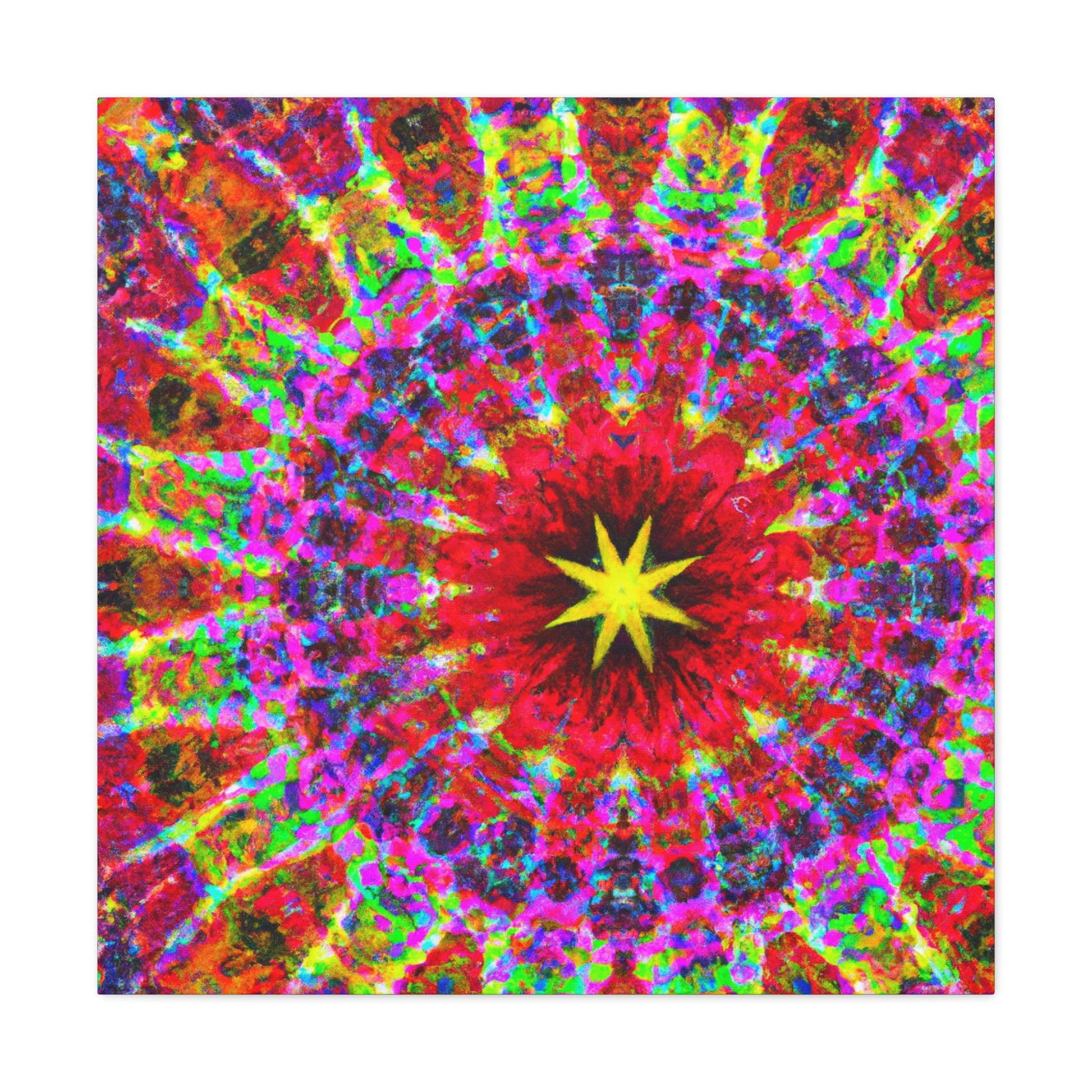 This vivid and captivating canvas is sure to make a statement in any space. Featuring trippy stars, a kaleidoscope of abstract shapes, and vibrant colors, the HD artwork is digitally printed on premium canvas and symmetrically laid out. Bring a bold and creative touch to your home and impress your guests with this unique piece. #trippystars #kaleidoscope #abstractart #digitalart #vibrantcolors #hdquality #canvas #wallart #homedecor #interiordesign #unique