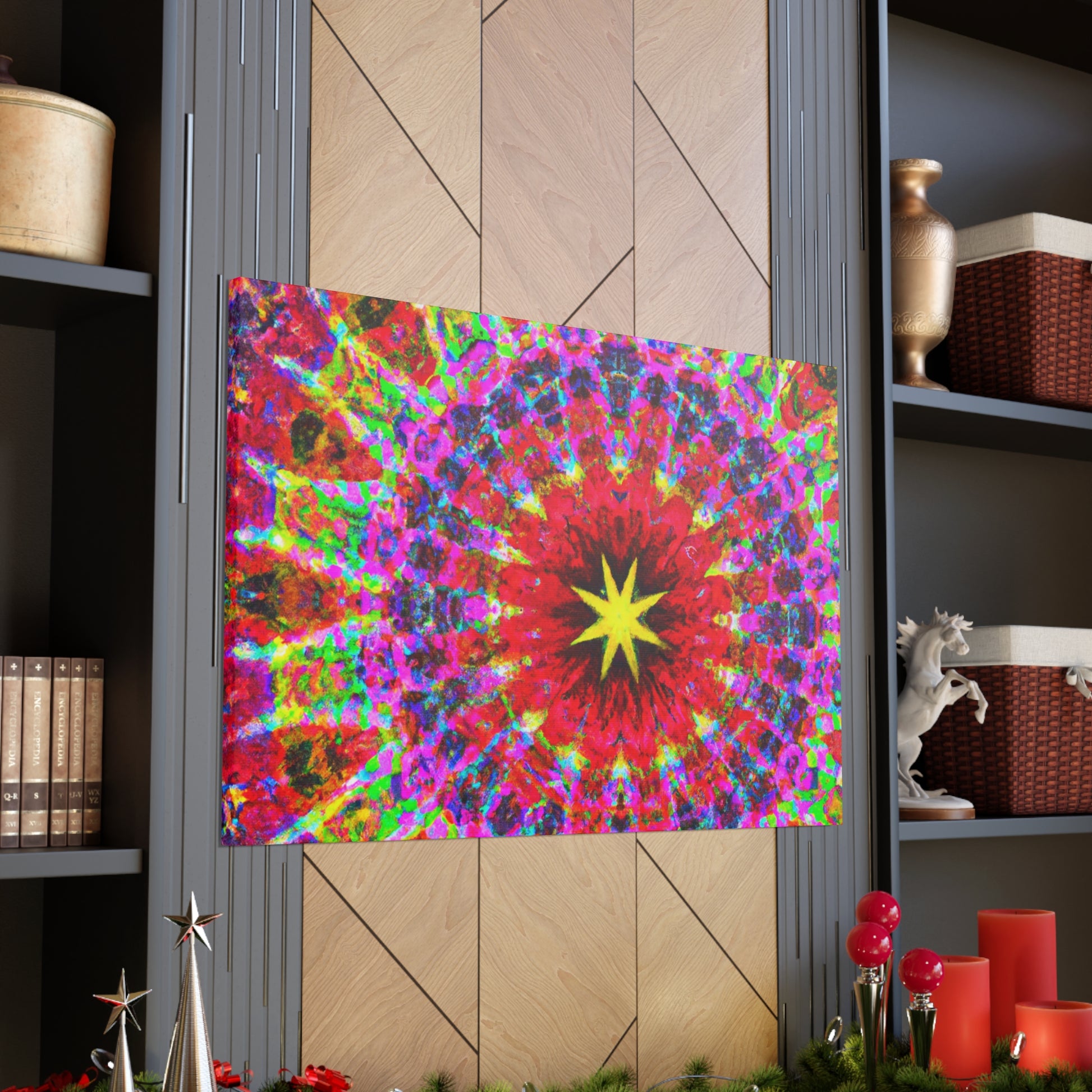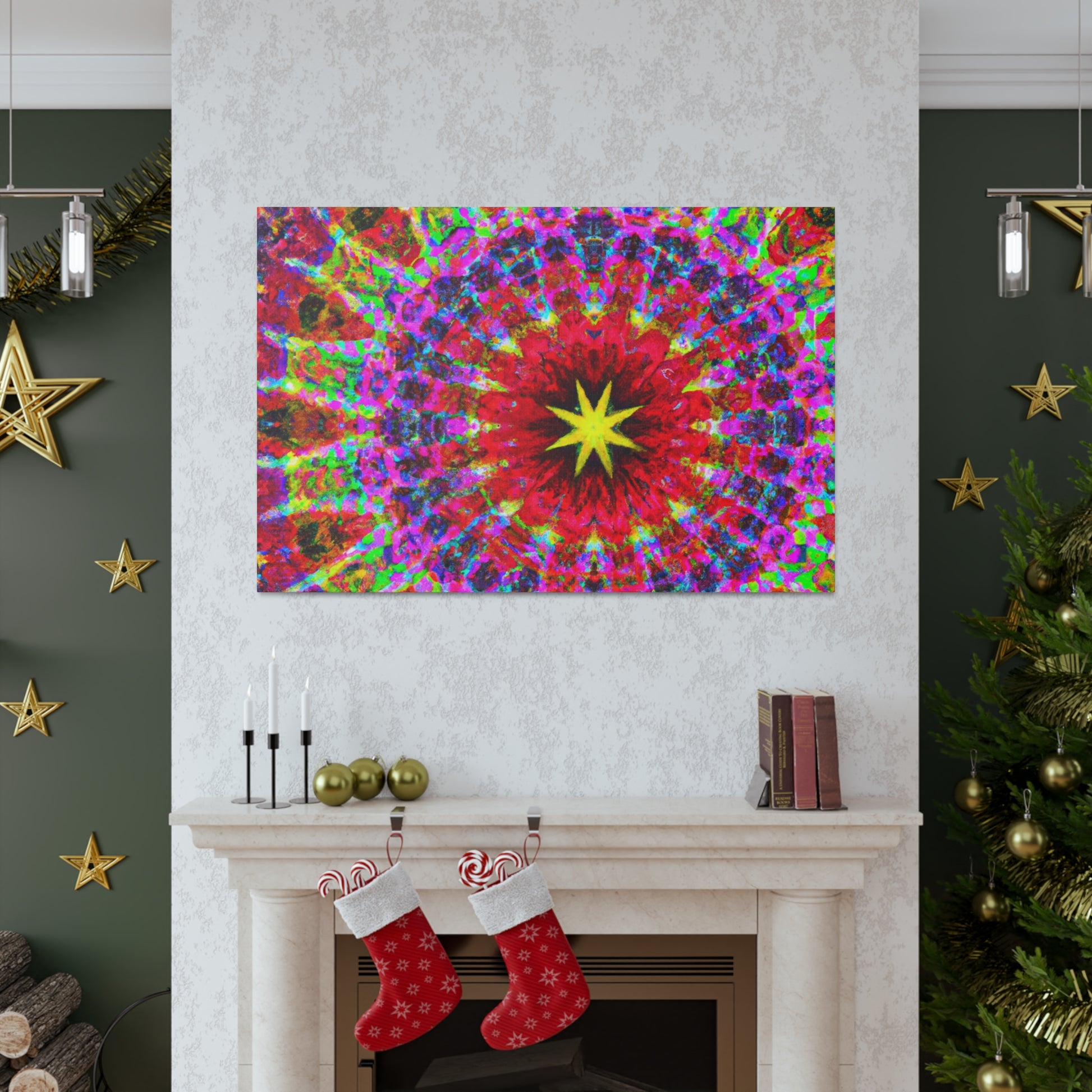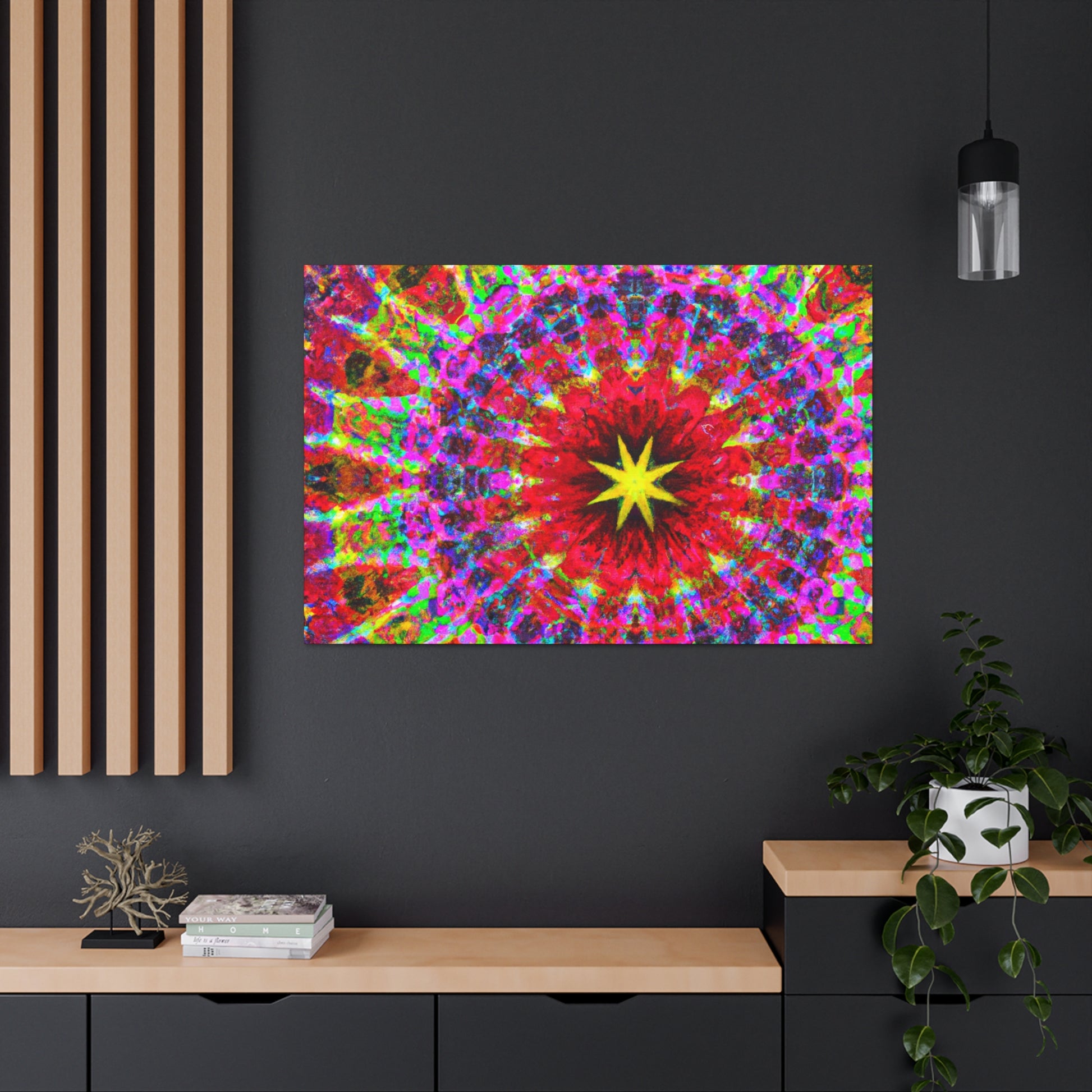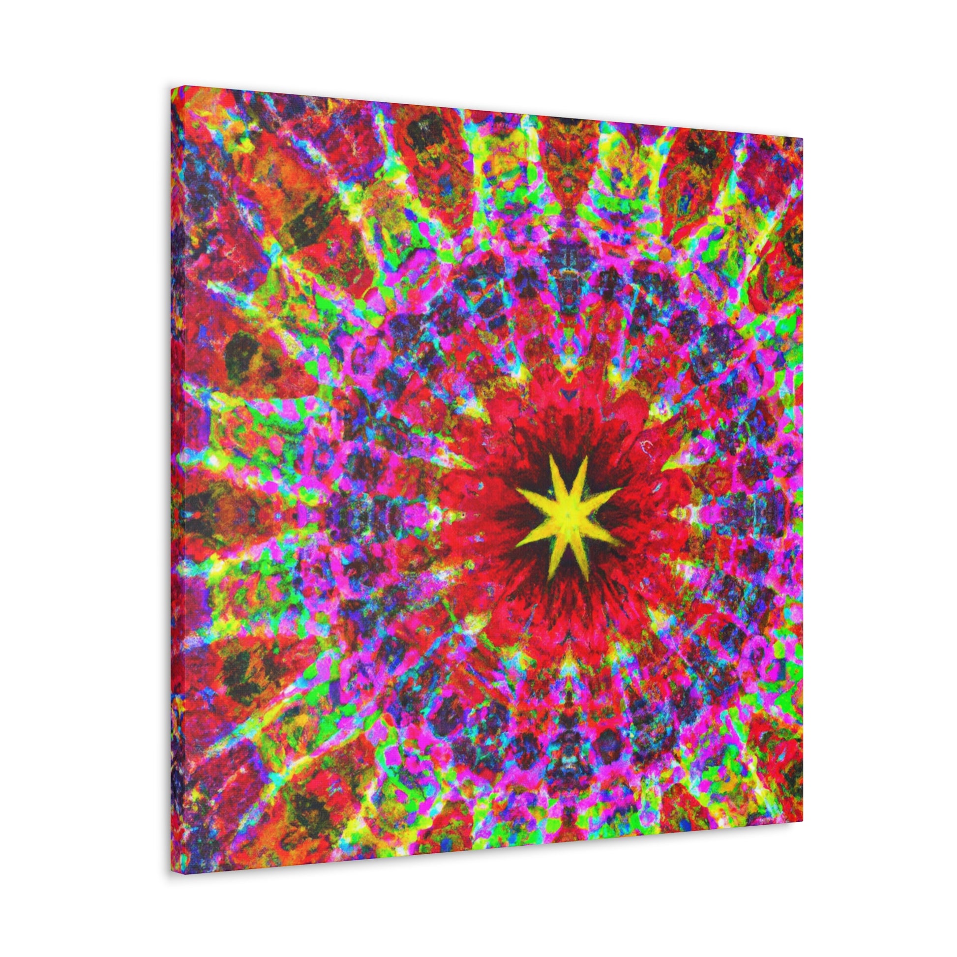 This vivid and captivating canvas is sure to make a statement in any space. Featuring trippy stars, a kaleidoscope of abstract shapes, and vibrant colors, the HD artwork is digitally printed on premium canvas and symmetrically laid out. Bring a bold and creative touch to your home and impress your guests with this unique piece. #trippystars #kaleidoscope #abstractart #digitalart #vibrantcolors #hdquality #canvas #wallart #homedecor #interiordesign #unique
