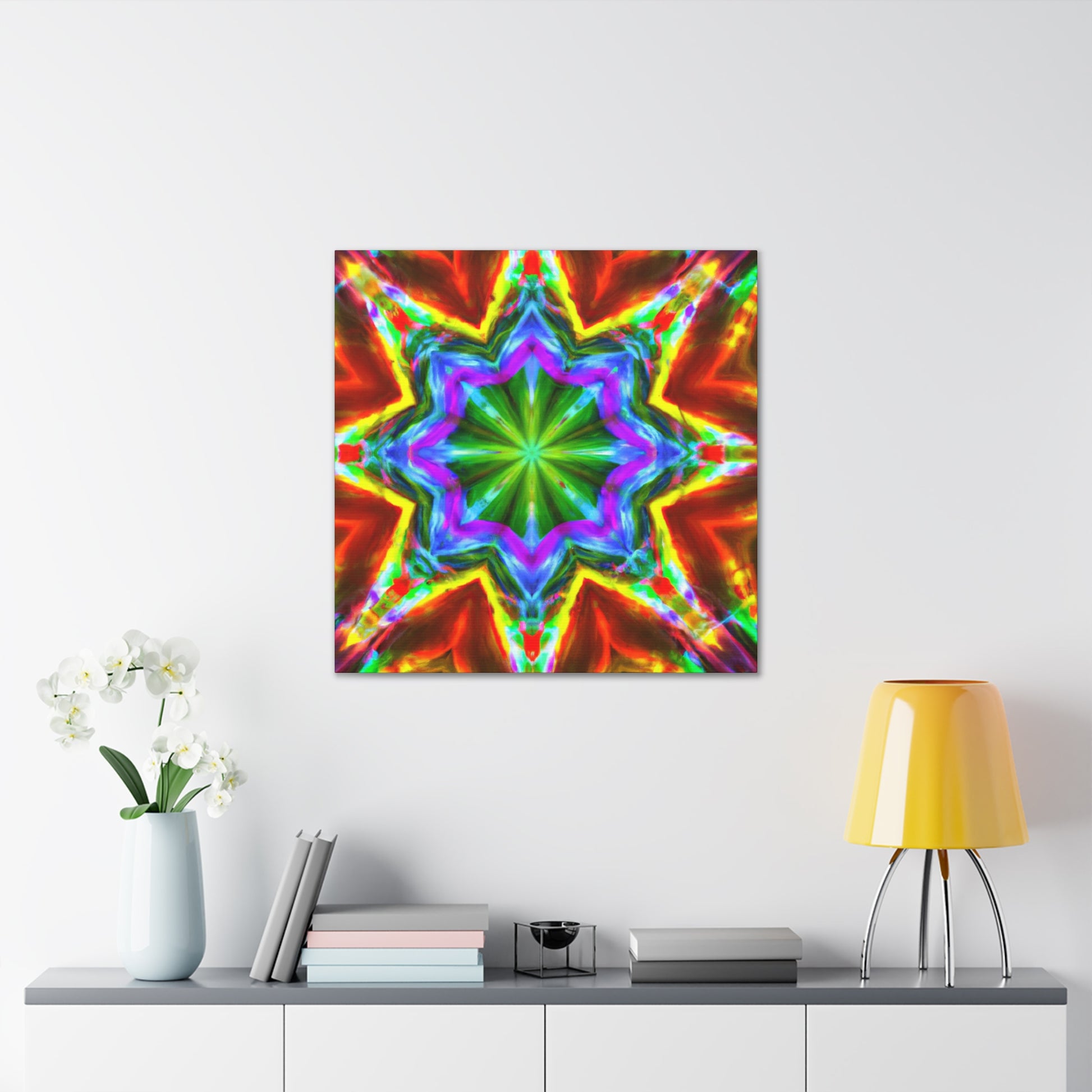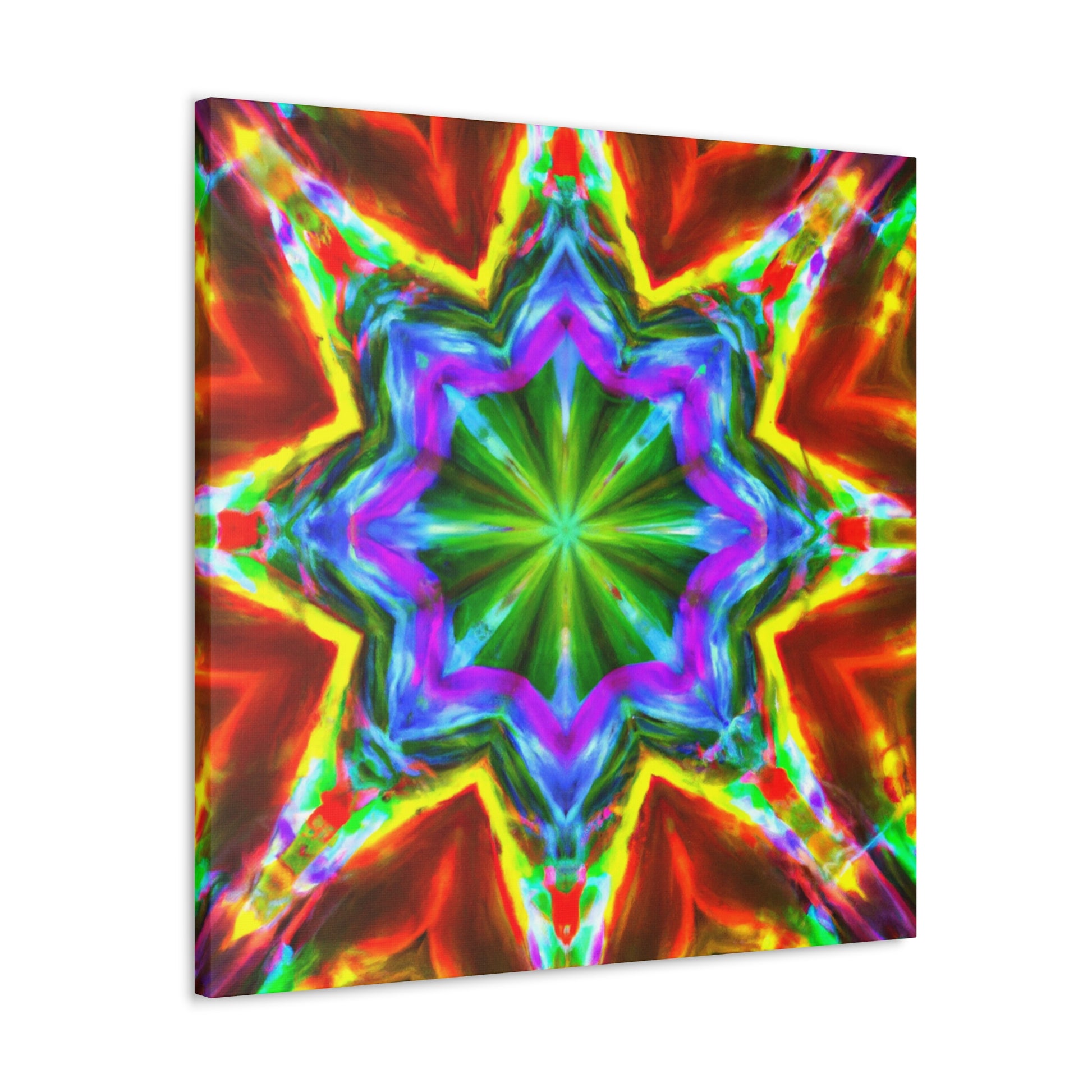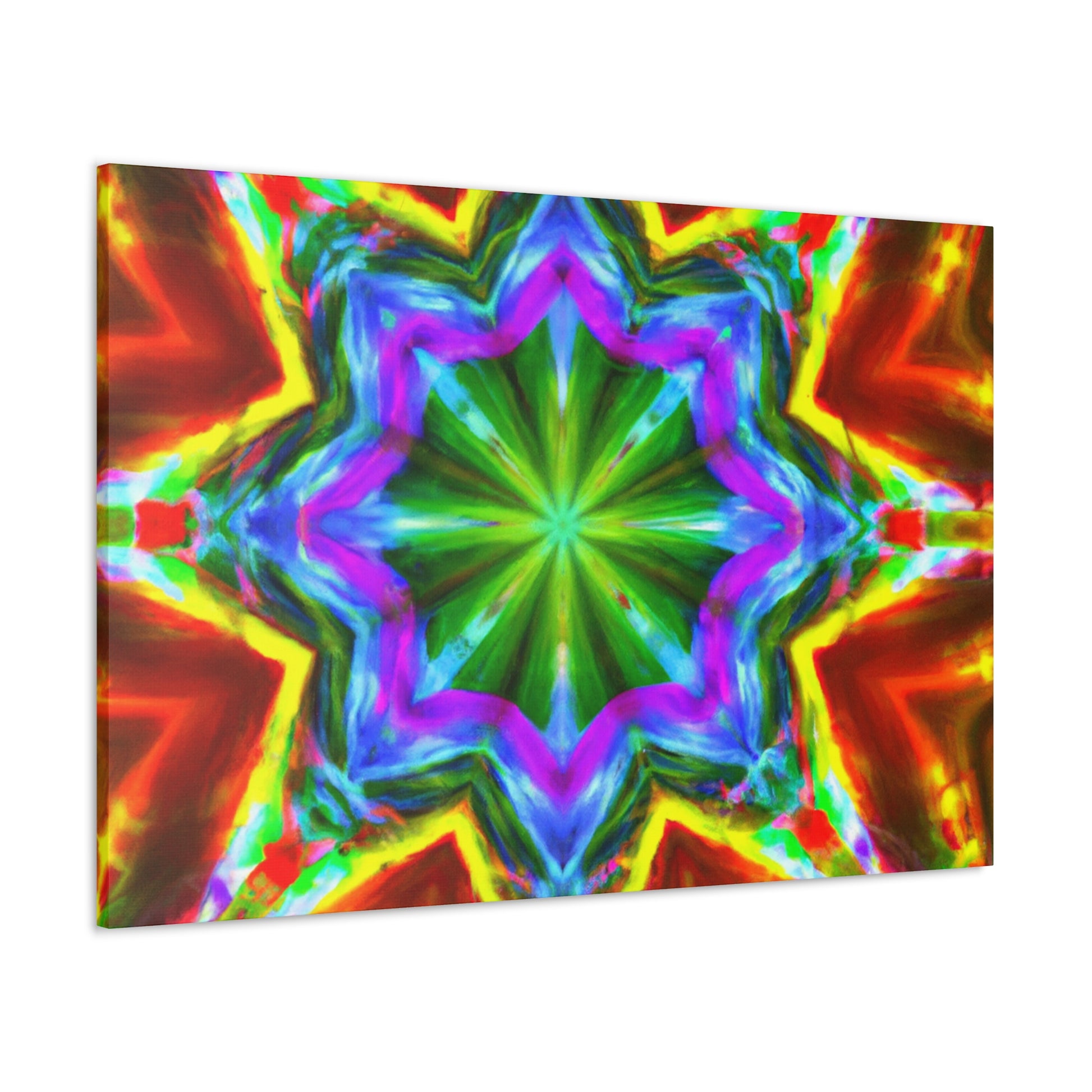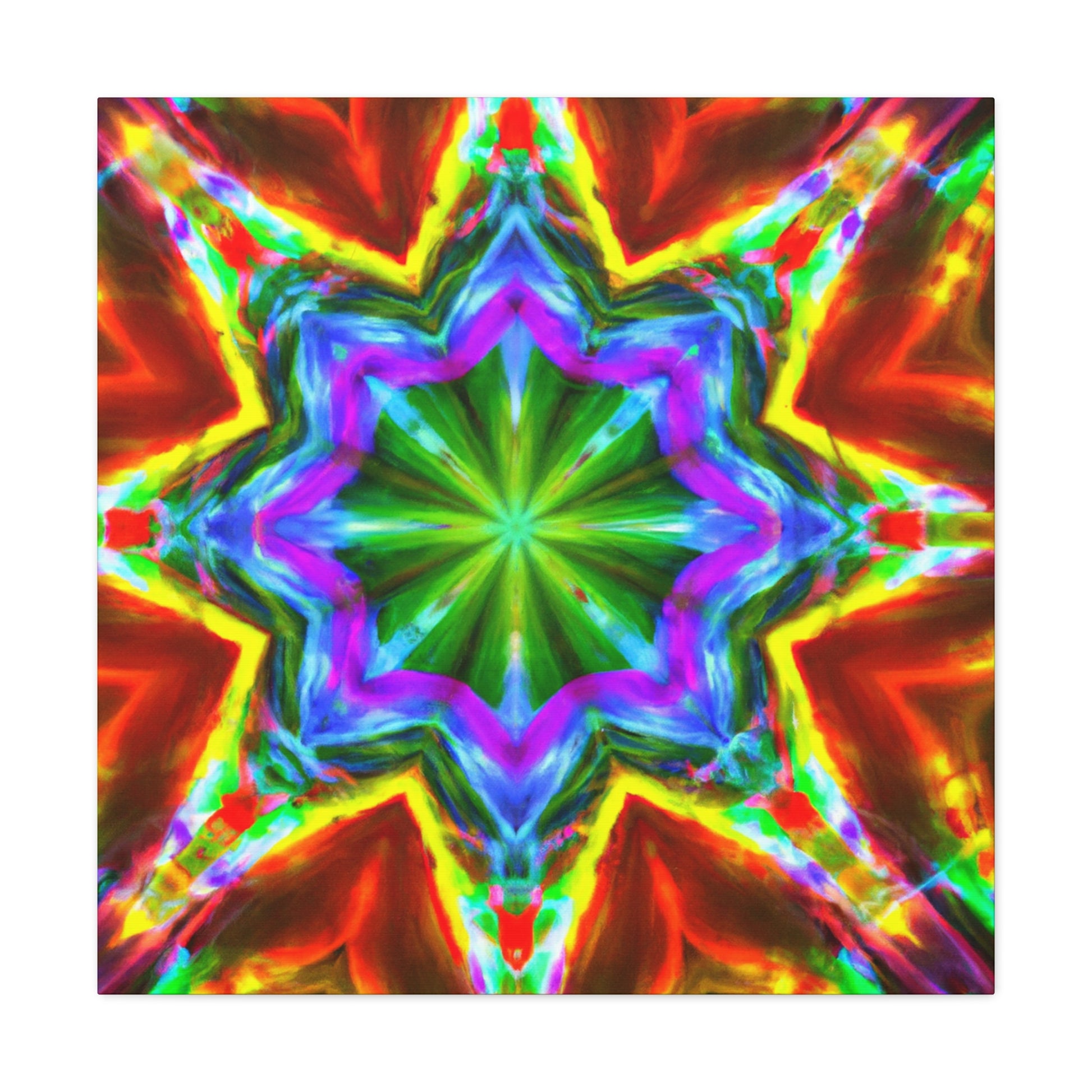 This vibrant and eye-catching digital art canvas depicts a kaleidoscope of stars in captivating hues. The symmetrical composition is crafted using HD technology for optimal picture quality, and the abstract graphics and bright colors are sure to enliven any space. #art #canvas #digitalart #abstractart #vibrant #starart #kaleidoscopeart #hdart #trippyart #symmetricalart #colors