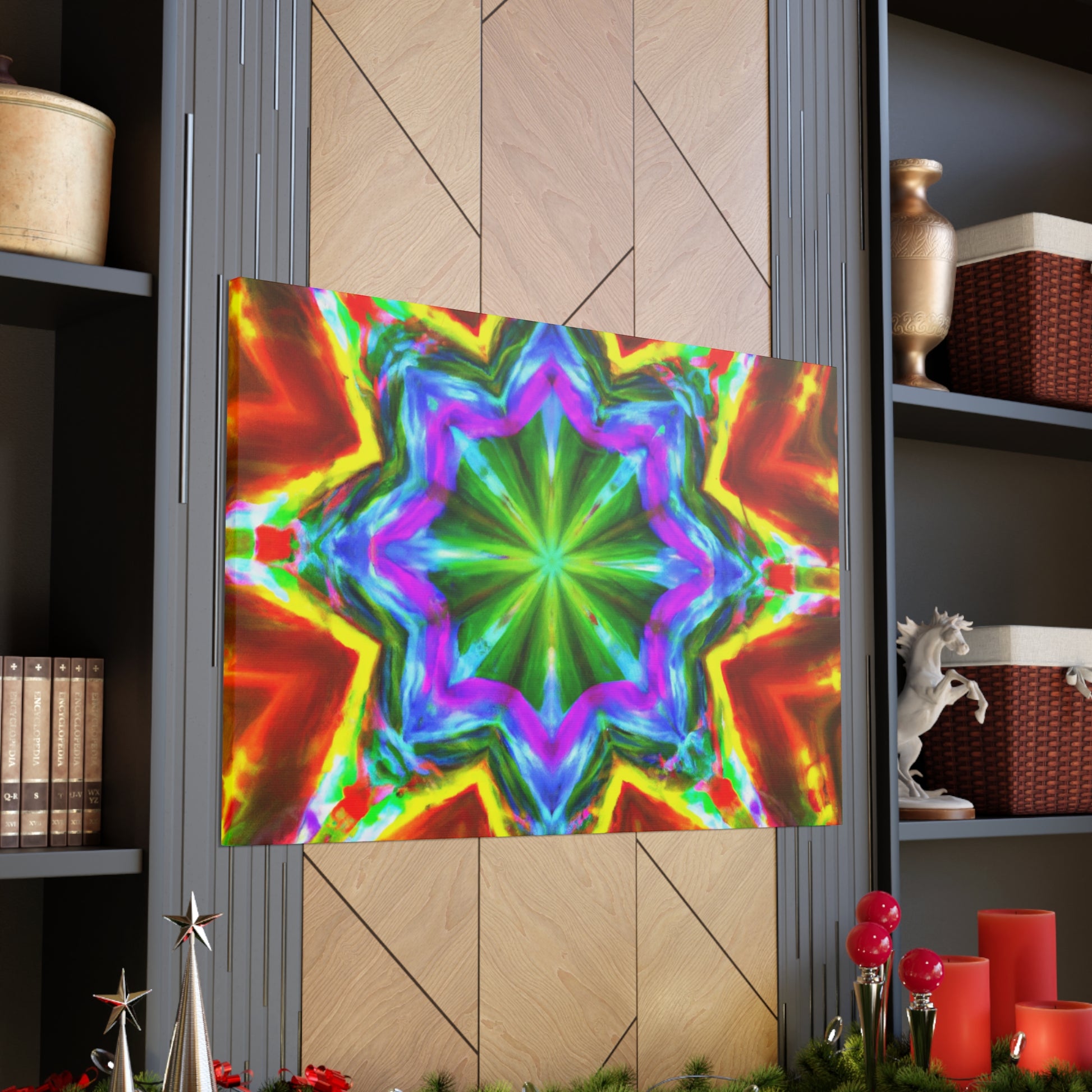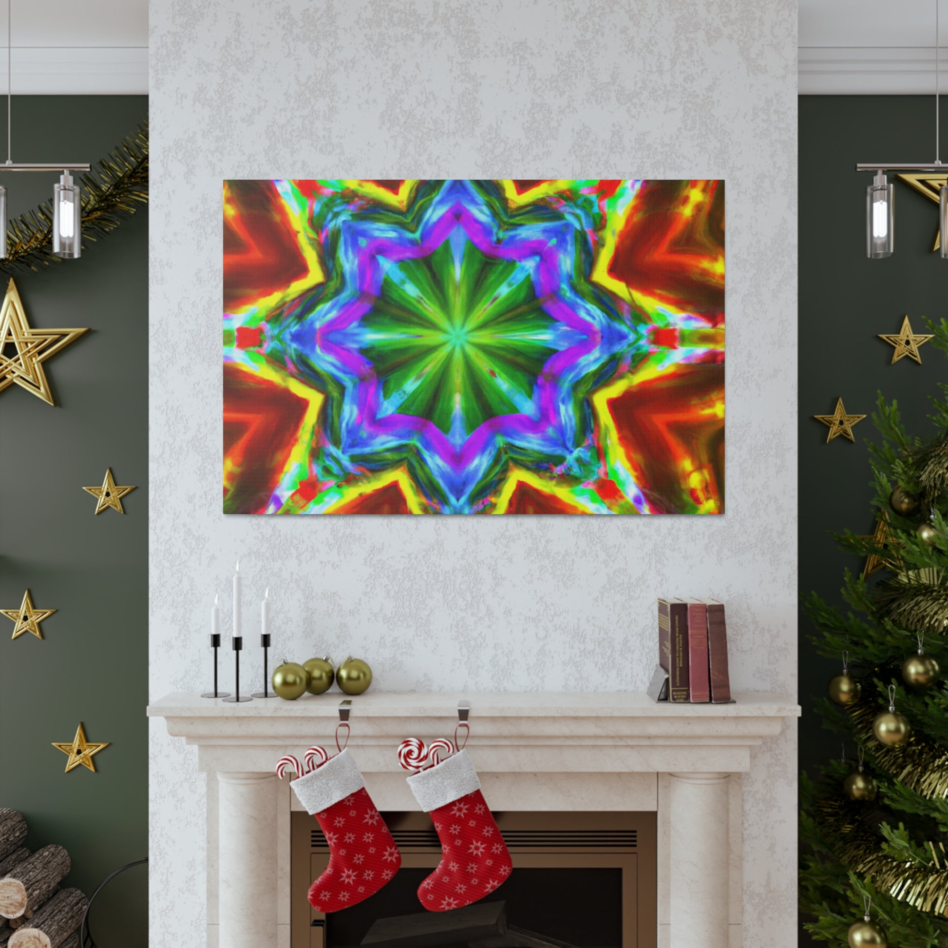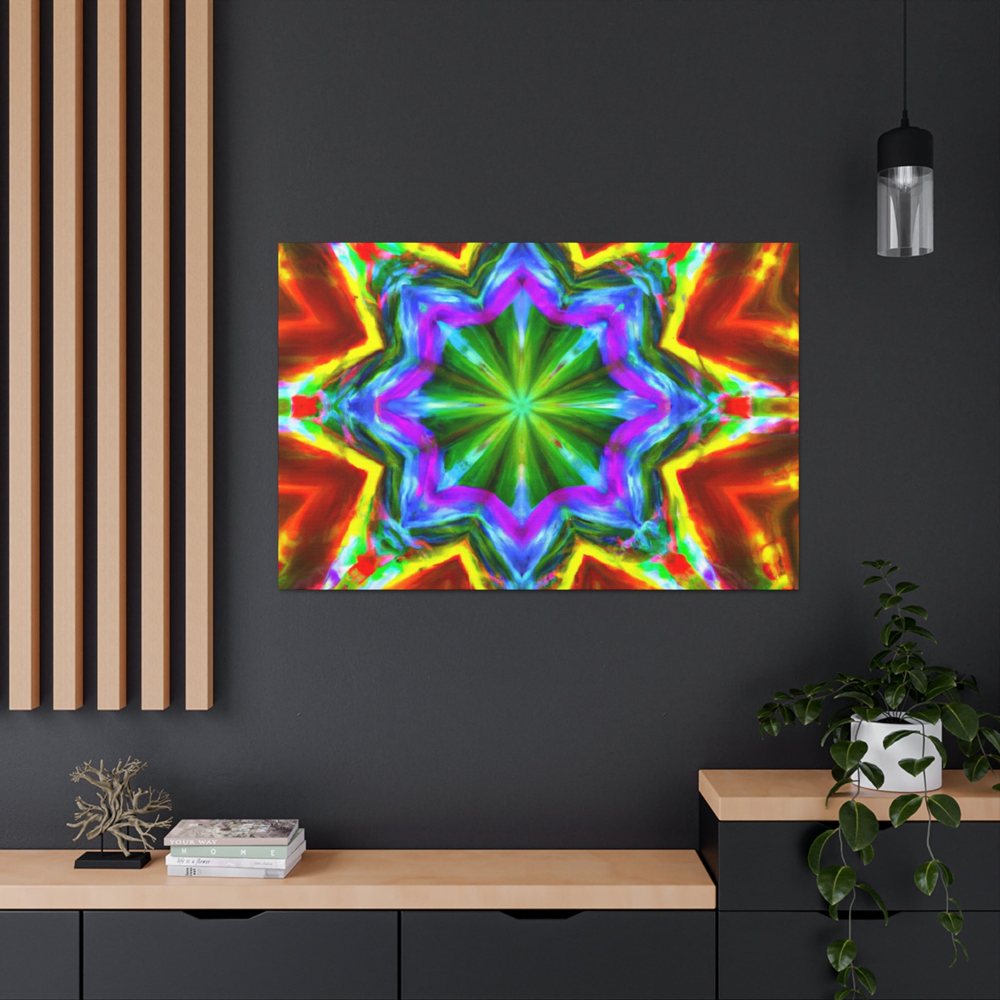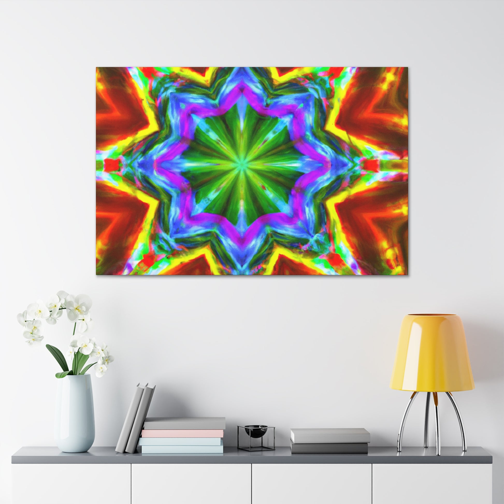 This vibrant and eye-catching digital art canvas depicts a kaleidoscope of stars in captivating hues. The symmetrical composition is crafted using HD technology for optimal picture quality, and the abstract graphics and bright colors are sure to enliven any space. #art #canvas #digitalart #abstractart #vibrant #starart #kaleidoscopeart #hdart #trippyart #symmetricalart #colors