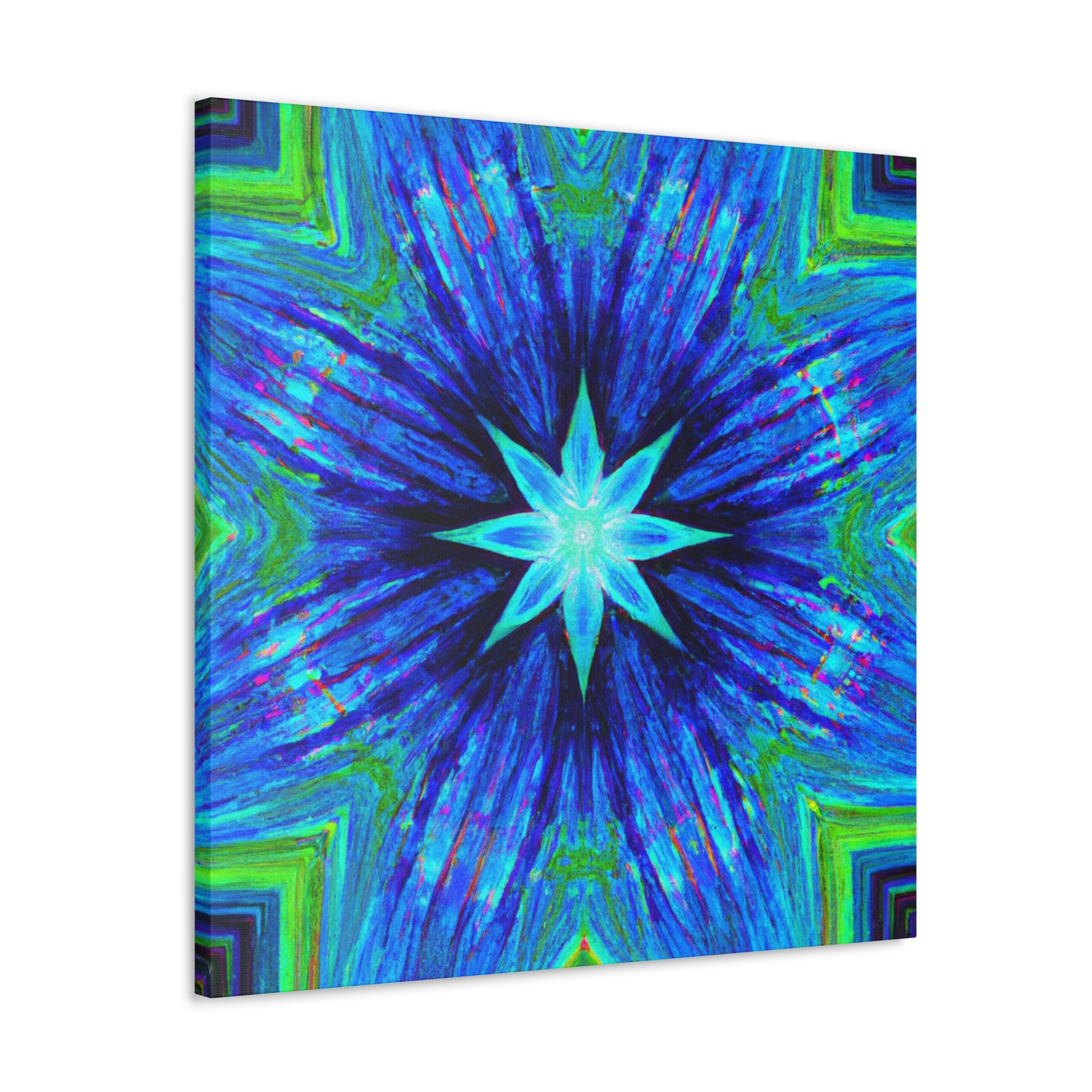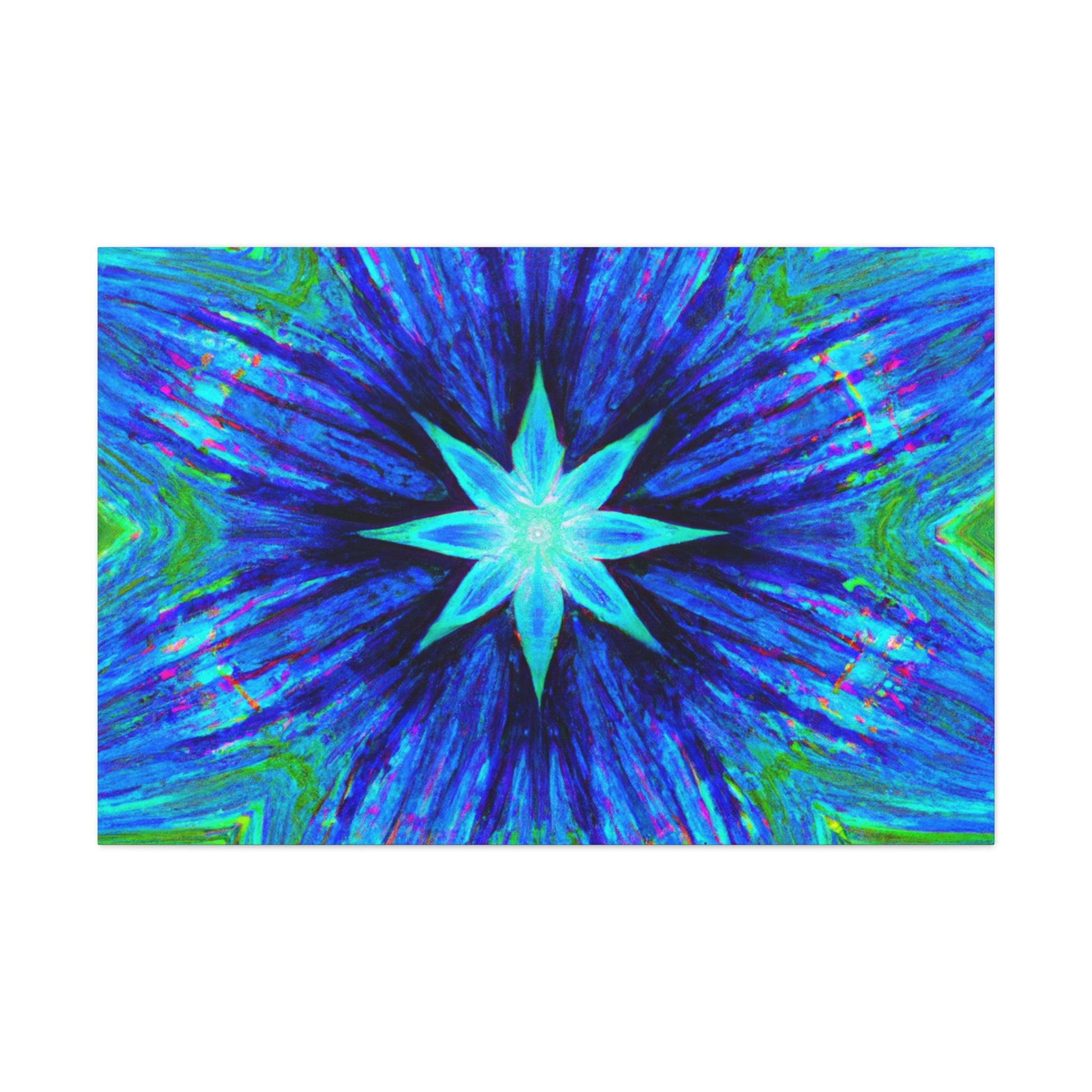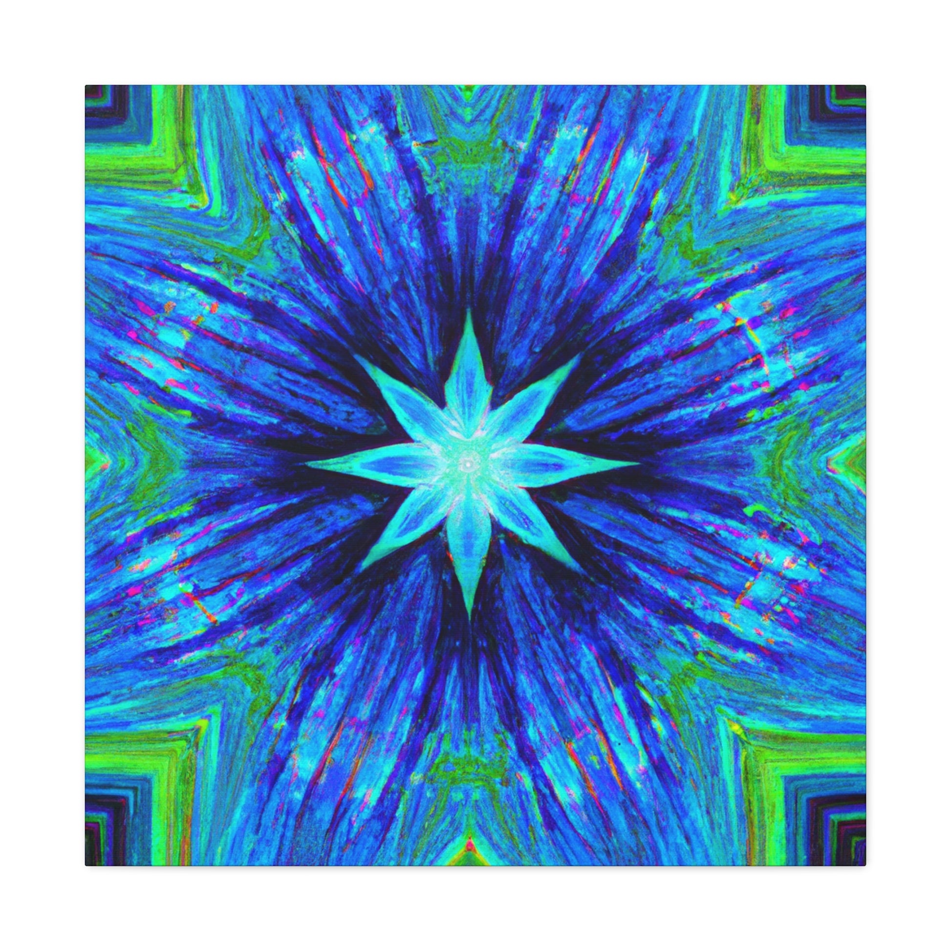 This one-of-a-kind canvas is perfect for adding a unique, modern look to any room. The vibrant digital art features symmetrical, trippy stars, kaleidoscope effects, and abstract shapes and colors in HD. Available in a variety of sizes, this eye-catching canvas is sure to be a conversation starter. #trippystars #kaleidoscope #abstract #digitalart #vibrantcolors #HD #symmetrical #canvas #homedecor #artwork #gallerydecor