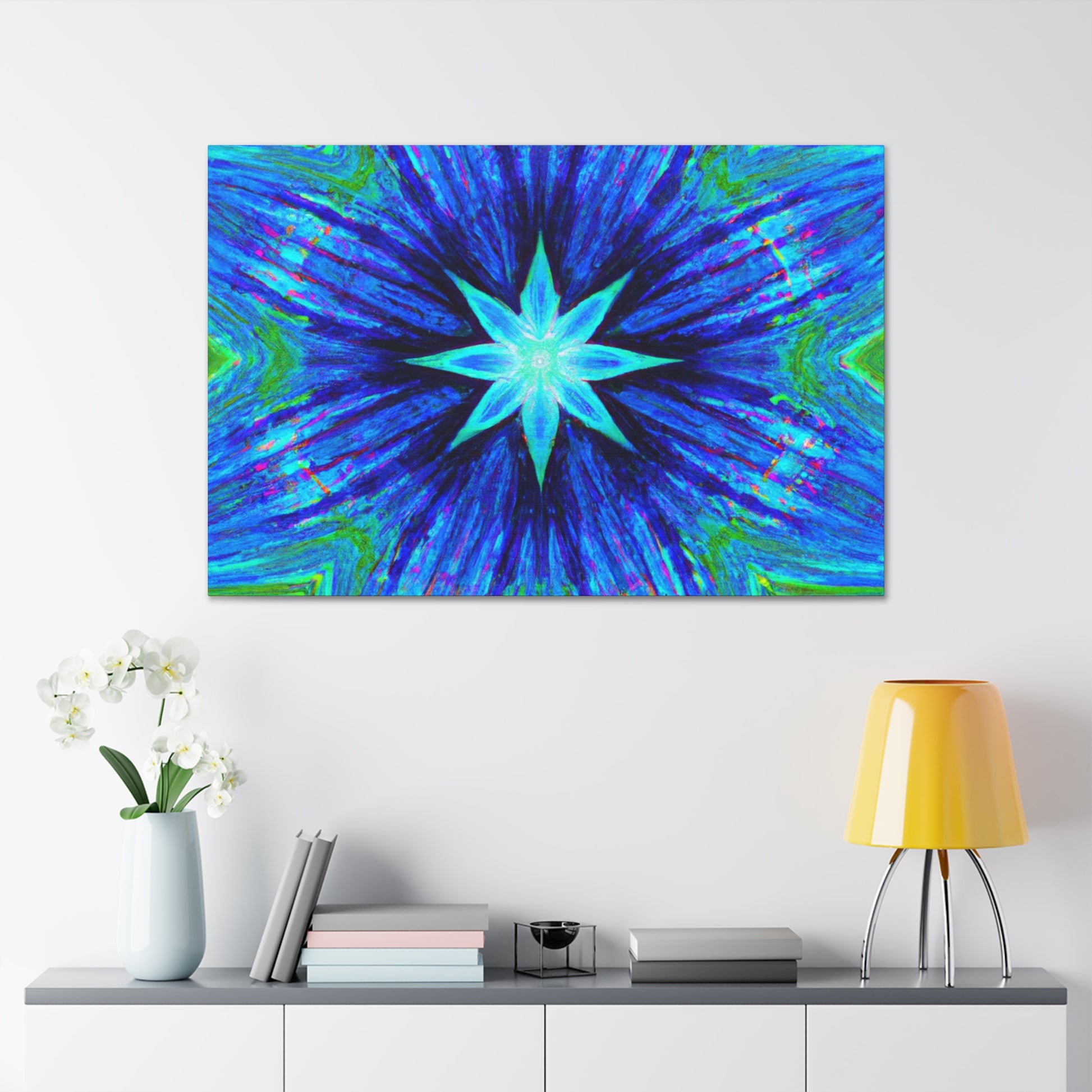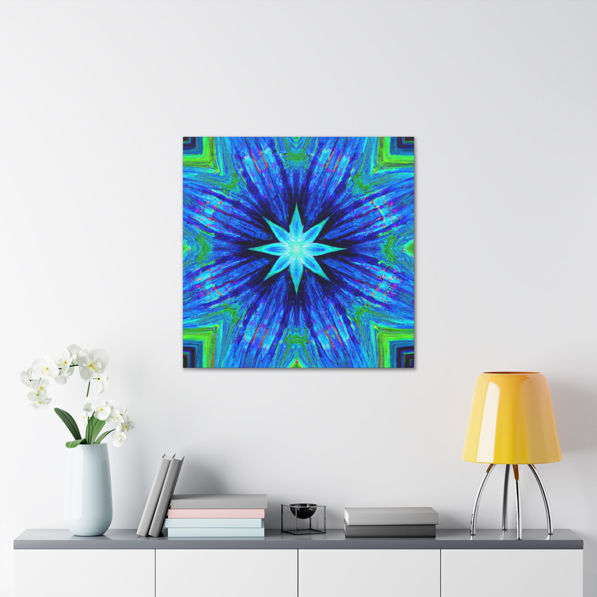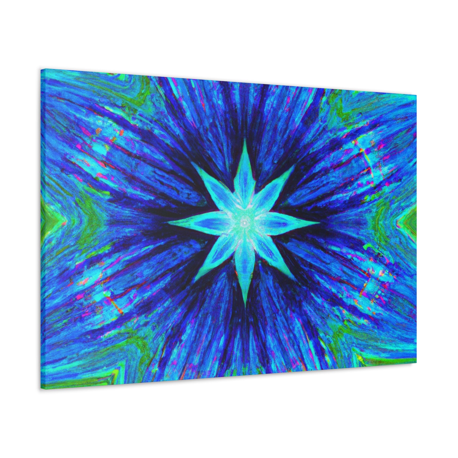 This one-of-a-kind canvas is perfect for adding a unique, modern look to any room. The vibrant digital art features symmetrical, trippy stars, kaleidoscope effects, and abstract shapes and colors in HD. Available in a variety of sizes, this eye-catching canvas is sure to be a conversation starter. #trippystars #kaleidoscope #abstract #digitalart #vibrantcolors #HD #symmetrical #canvas #homedecor #artwork #gallerydecor