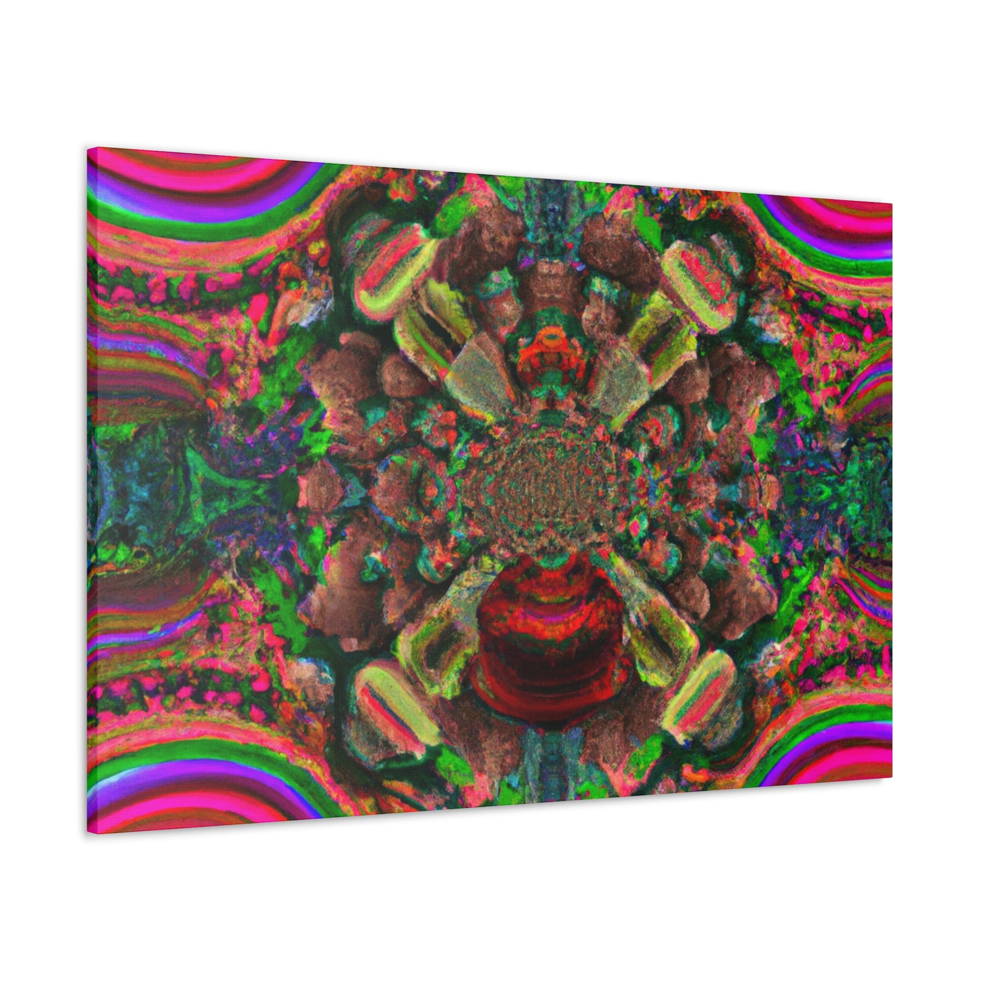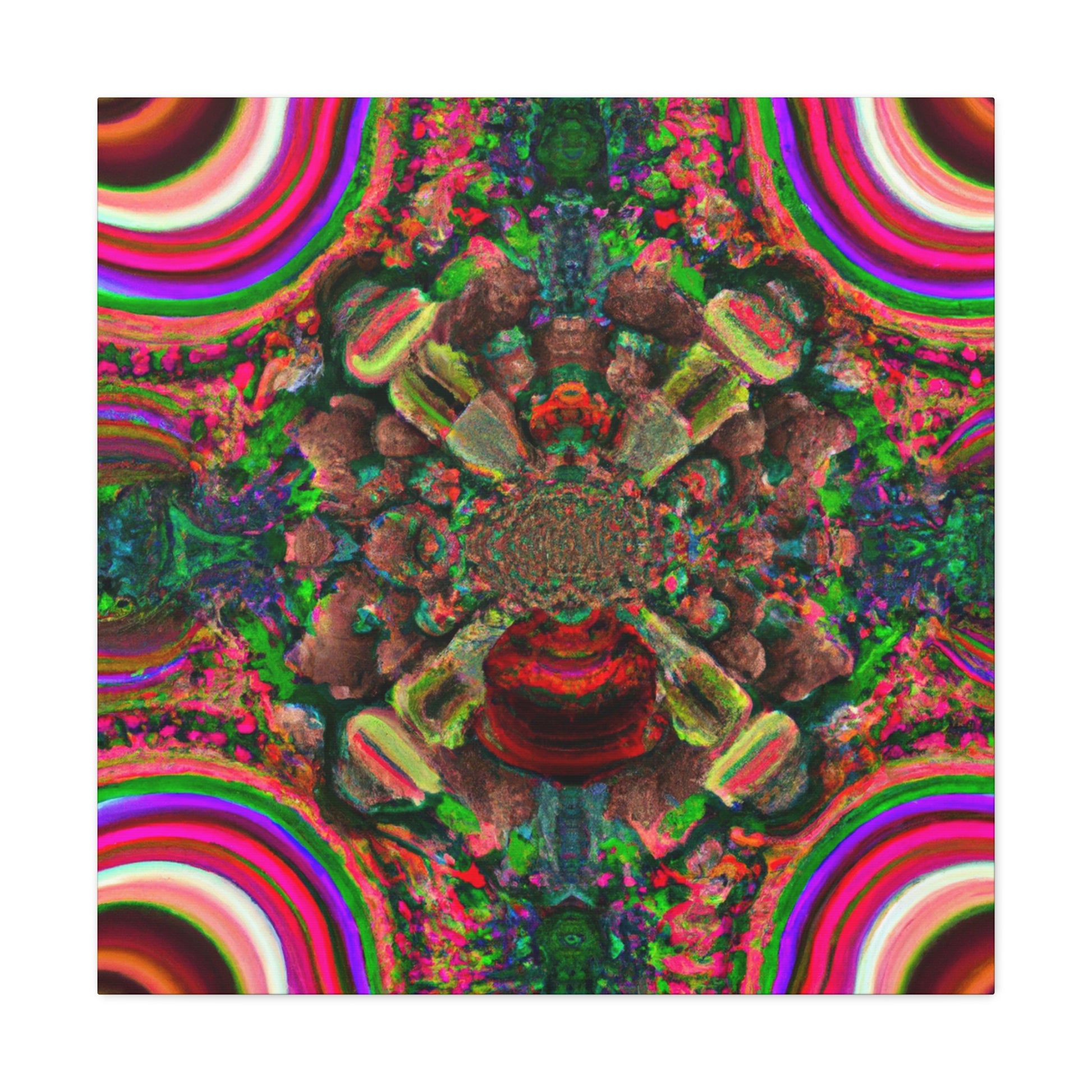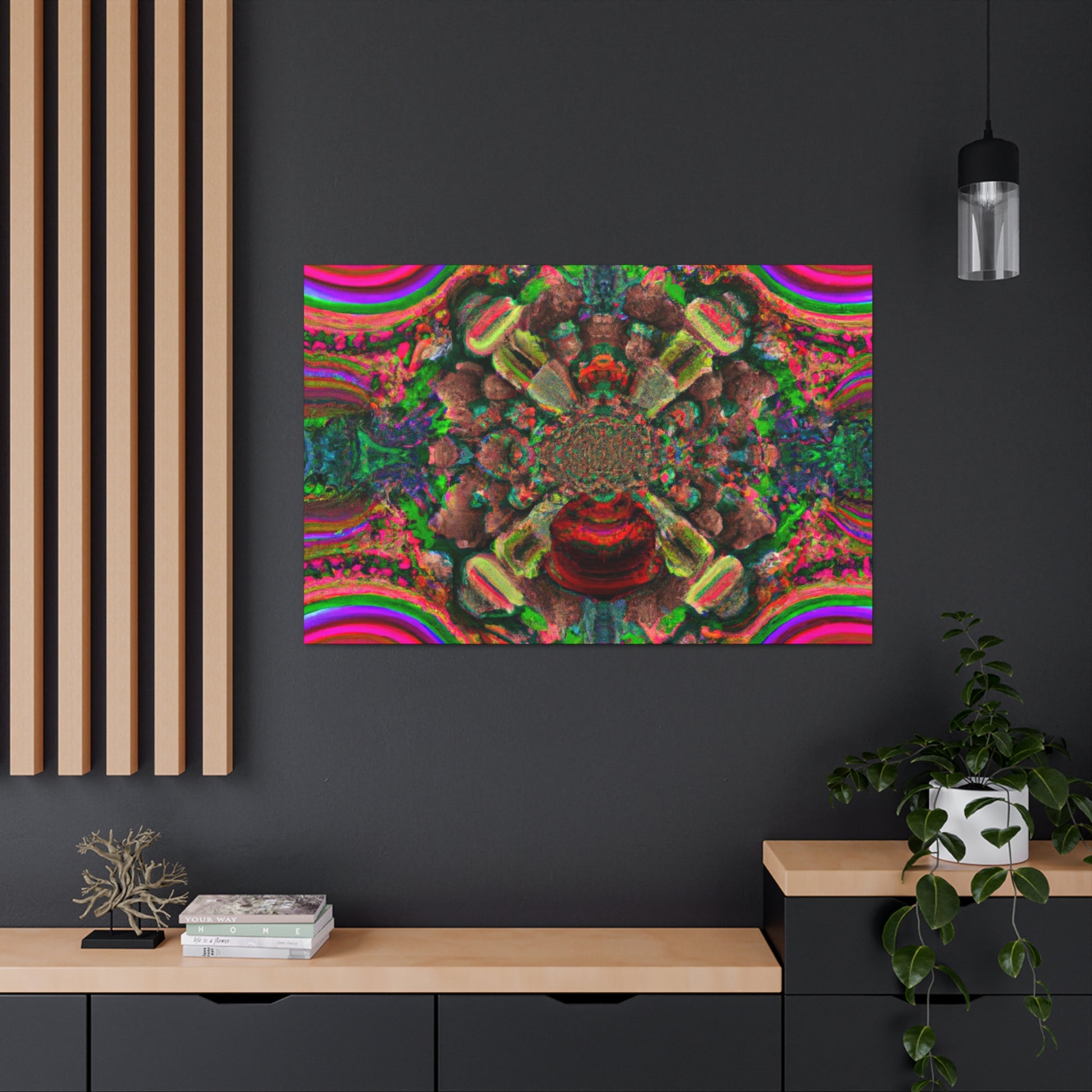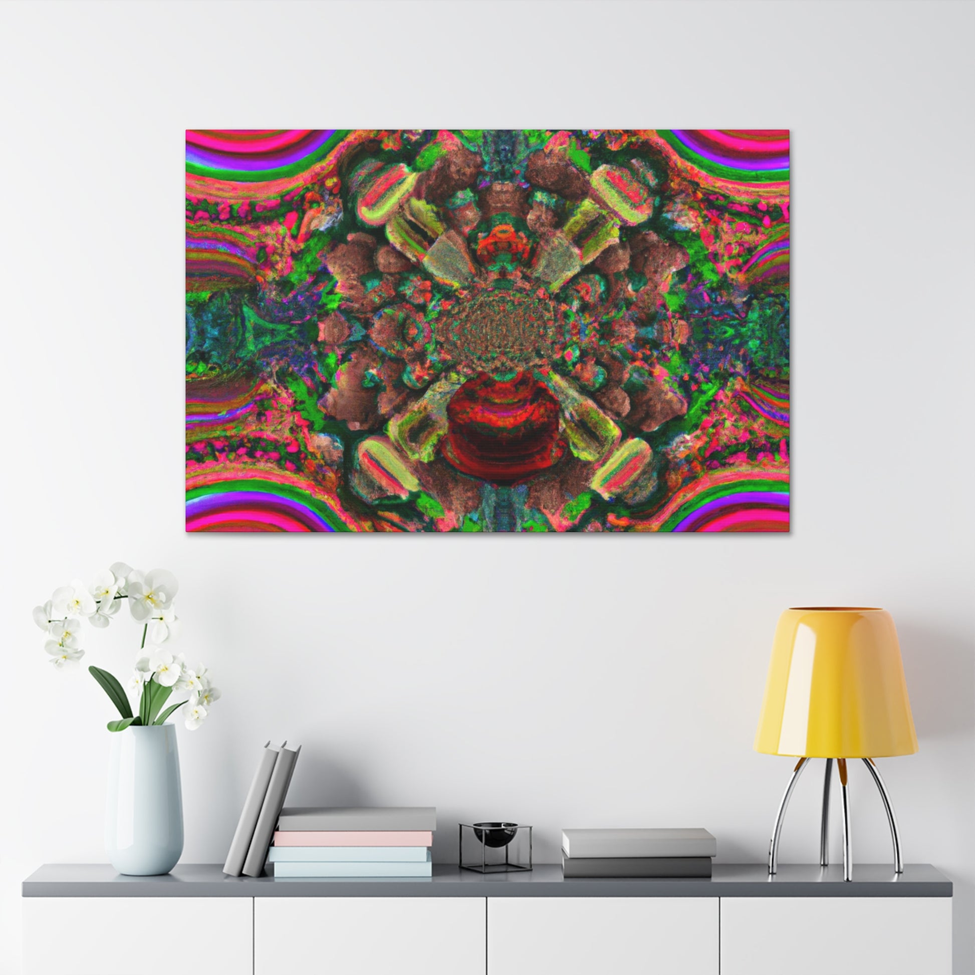 This awe-inspiring digital artwork is sure to bring an eye-catching visual to any space. Let your imagination run wild with trippy mushrooms, kaleidoscope fades, abstract shapes, vibrant colors and 3D lines that make this canvas a show stopping piece. Instantly add some positive vibes to your home or office and enjoy the energy the artwork exudes! #artwork #canvas #mushrooms #kaleidoscope #abstract #digitalart #vibrantcolors #3Dlines #trippyart #homedecor #interiordesign