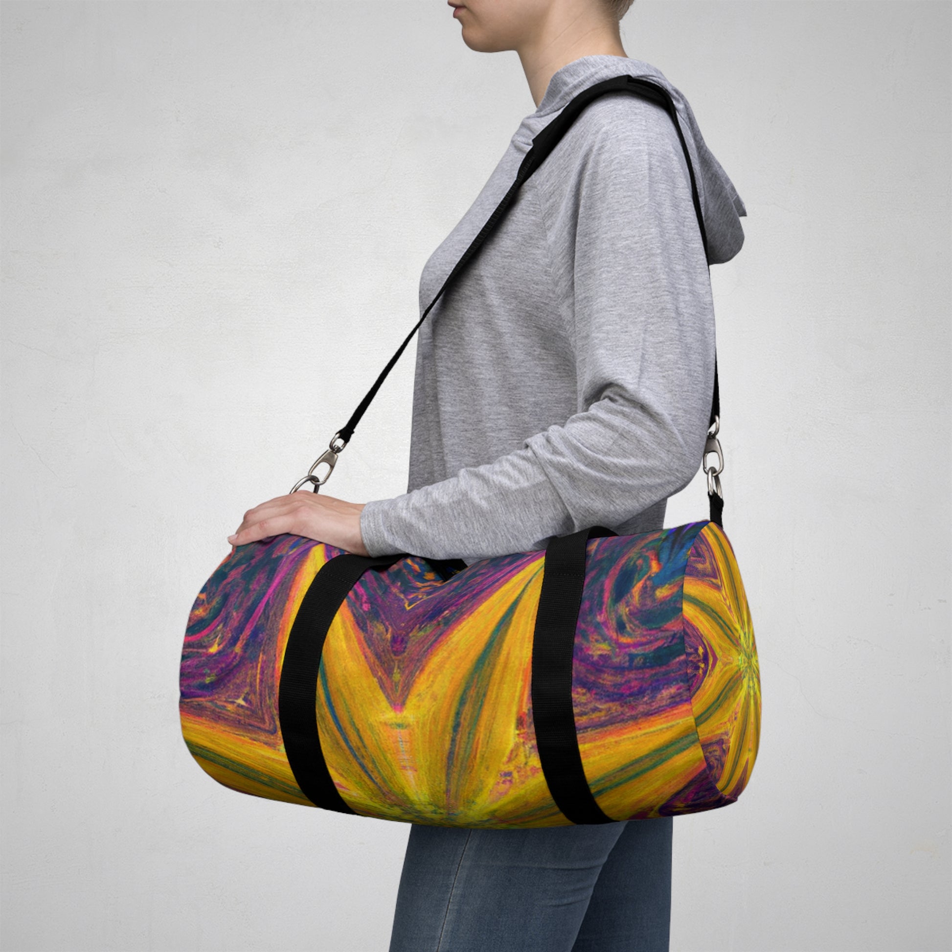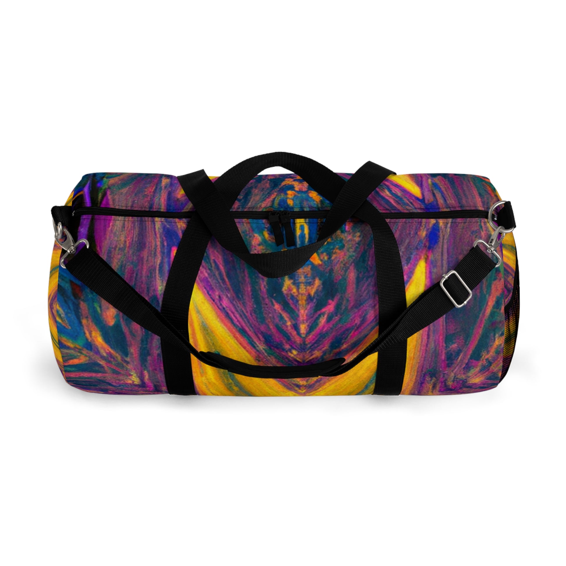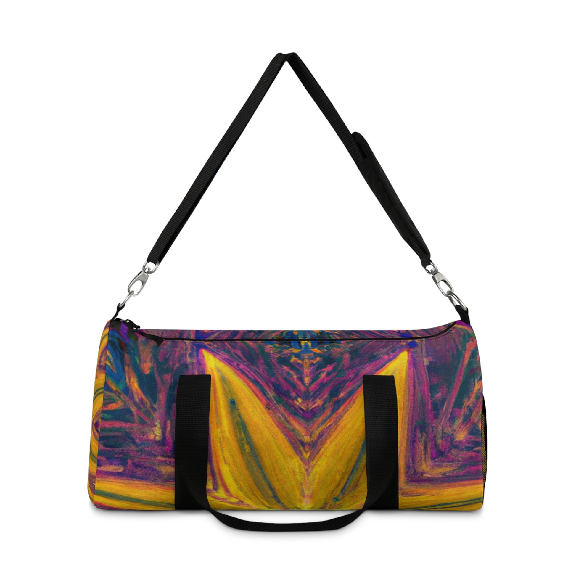 The Trippy Stars Dufflebag packs a visually stimulating punch of abstract, digital art, vibrant colors, and 3D lines! Get ready to be transported into a vibrant world - this duffle bag makes a bold and stylish statement. The eye-catching kaleidoscope of designs will have heads swiveling in your direction and make you stand out from the crowd. #fashion #dufflebag #bag #style #trendy #brightcolors #trippystars #kaleidoscope #digitalart #3Dlines #statementbag #abstractdesign #velvet #vibrantcolors #highquality #coolbag #unique #whimsical #colorful #instastyle #fashionable #daring #boldandbeautiful #unconventional #eye-catching #vibes #creative #colorfulvibes #colorfulstyle