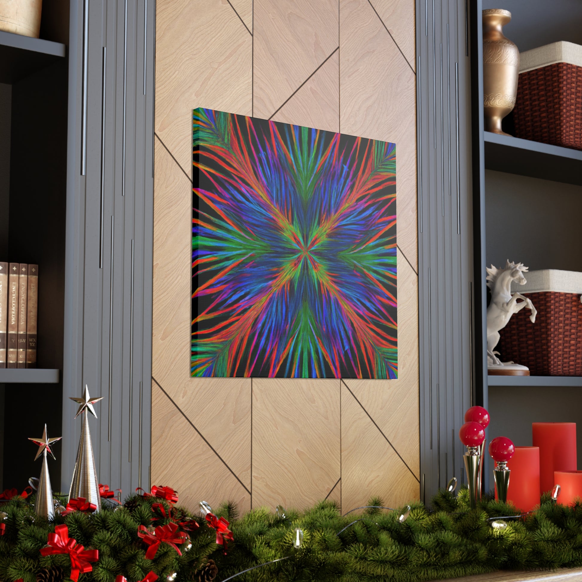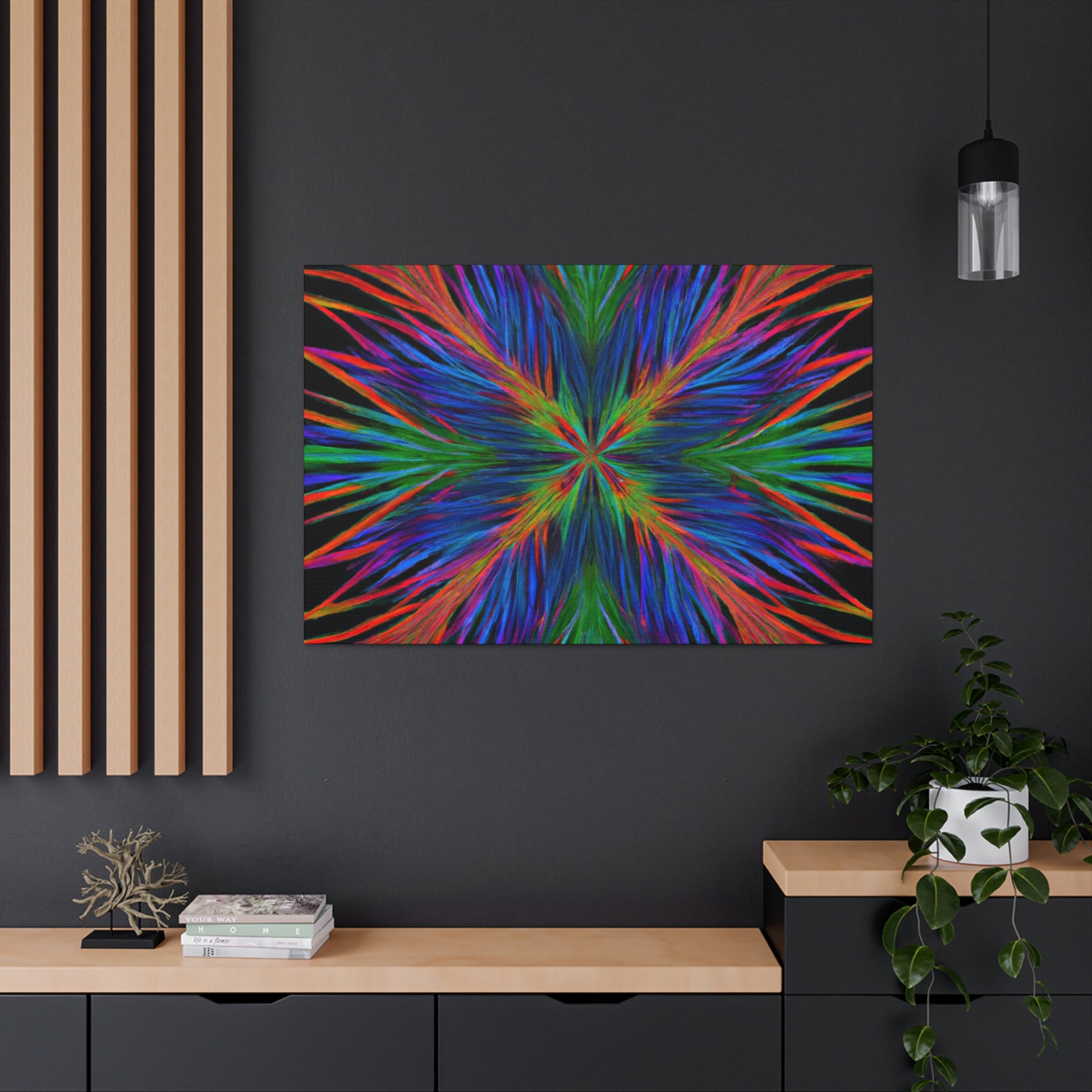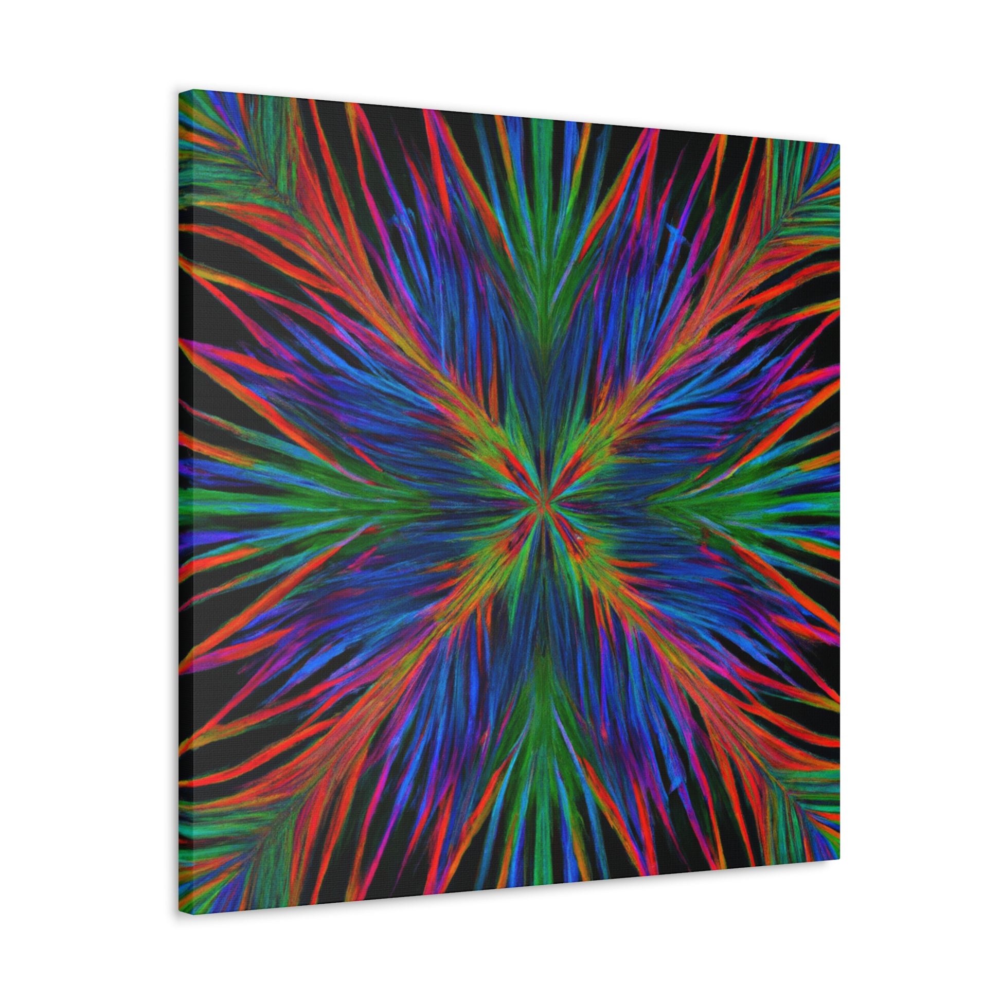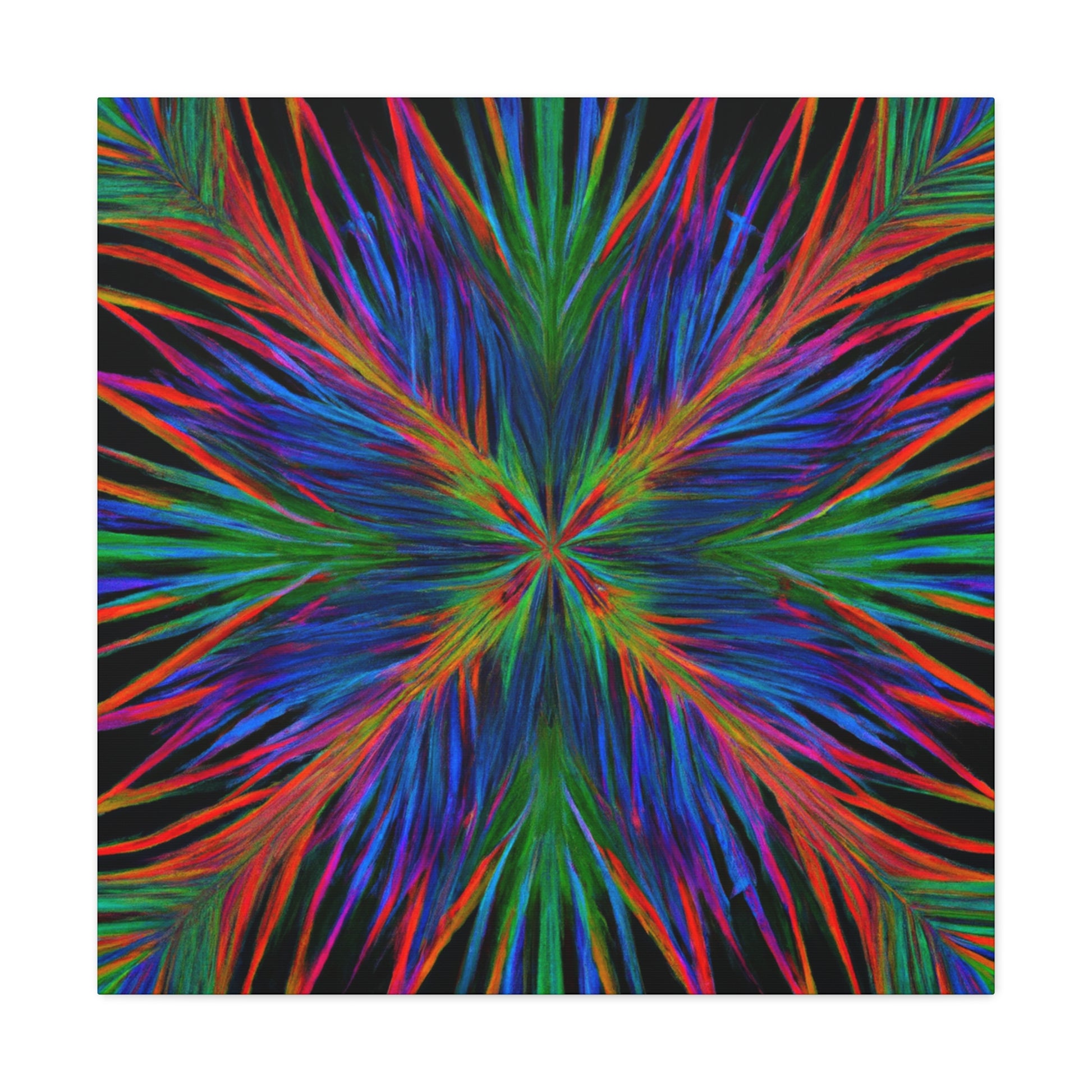This canvas is a stunning artwork with bold colors popping from the wall. Trippy geometric palm leaves, kaleidoscope patterns, abstract designs, and 3D lines blend together to create a captivating fractal. Perfect for any modern home, this artwork will instantly transform your space and bring vibrancy to any room. #geometricart #abstractart #canyvasart #palms #vibrant #3Dlines #fractalart #modernart #kaleidoscope #digitalart #artisticvibes
