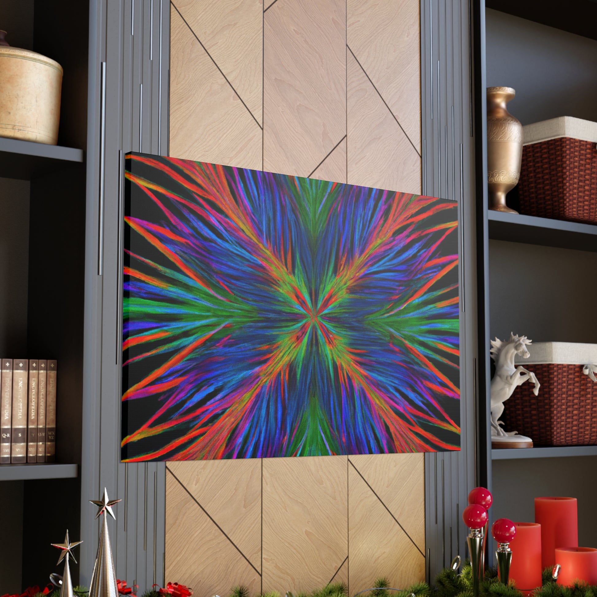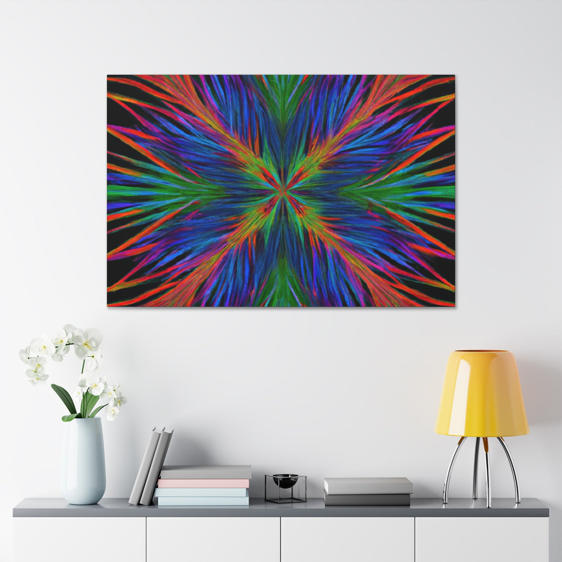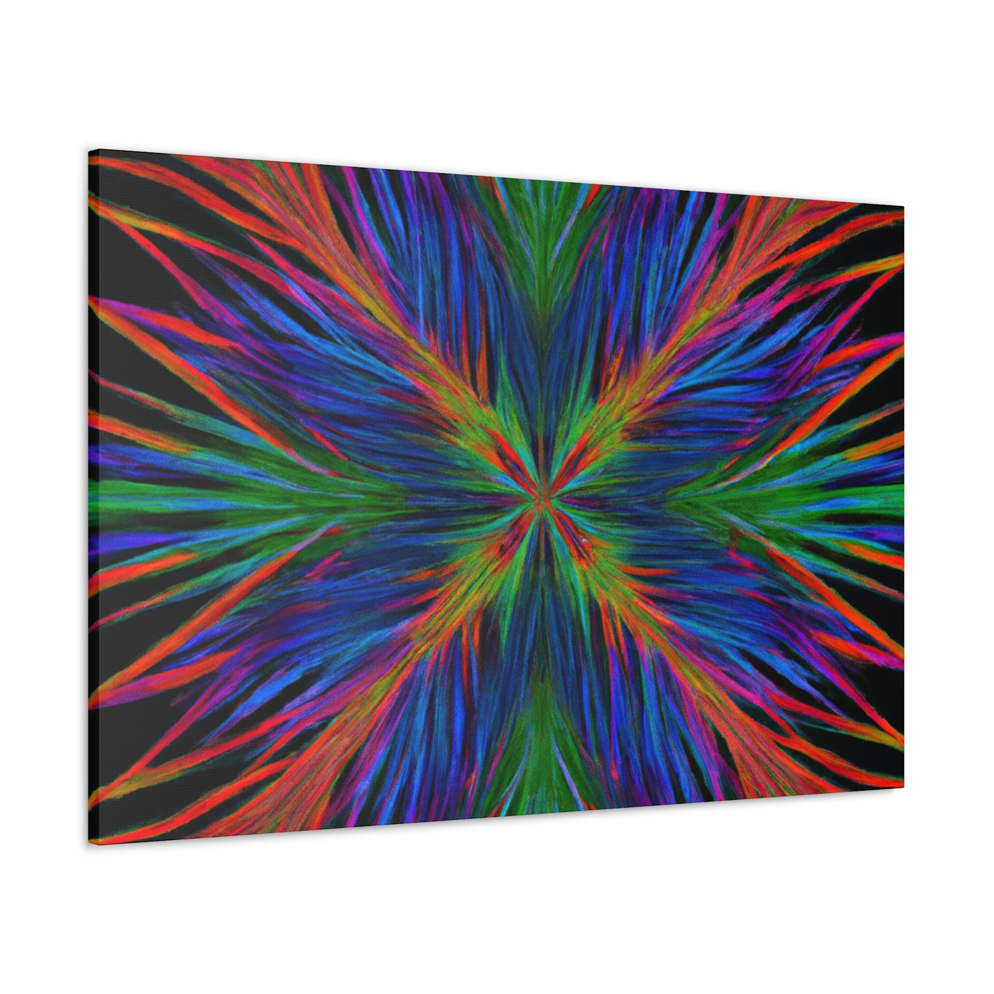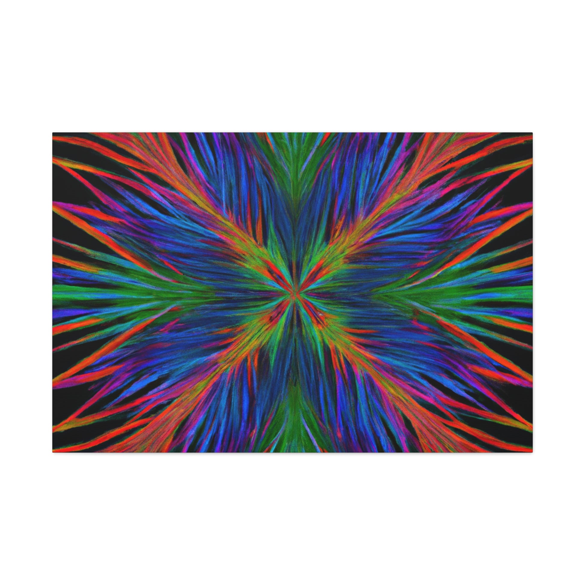 This canvas is a stunning artwork with bold colors popping from the wall. Trippy geometric palm leaves, kaleidoscope patterns, abstract designs, and 3D lines blend together to create a captivating fractal. Perfect for any modern home, this artwork will instantly transform your space and bring vibrancy to any room. #geometricart #abstractart #canyvasart #palms #vibrant #3Dlines #fractalart #modernart #kaleidoscope #digitalart #artisticvibes