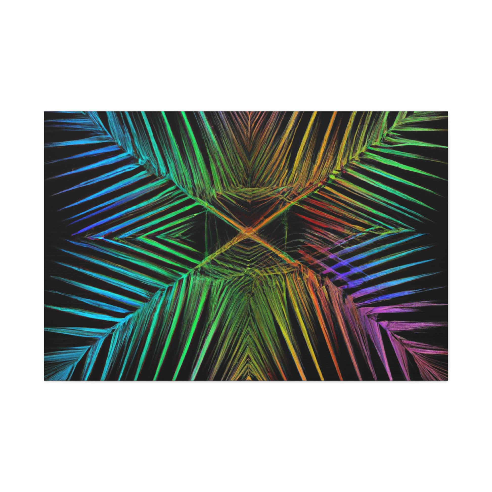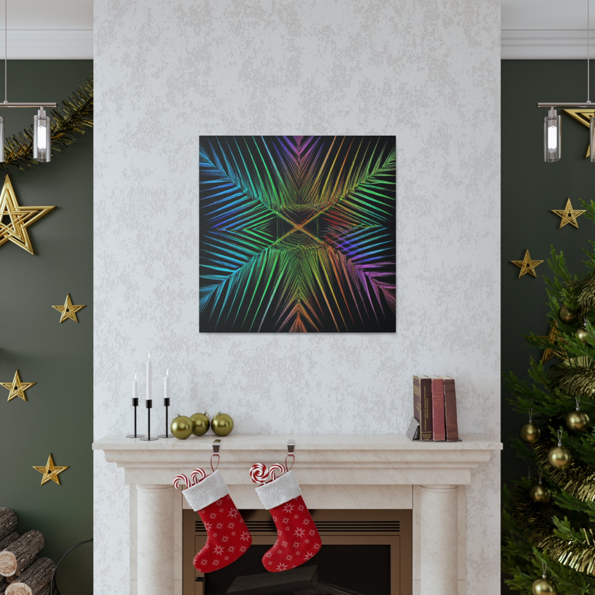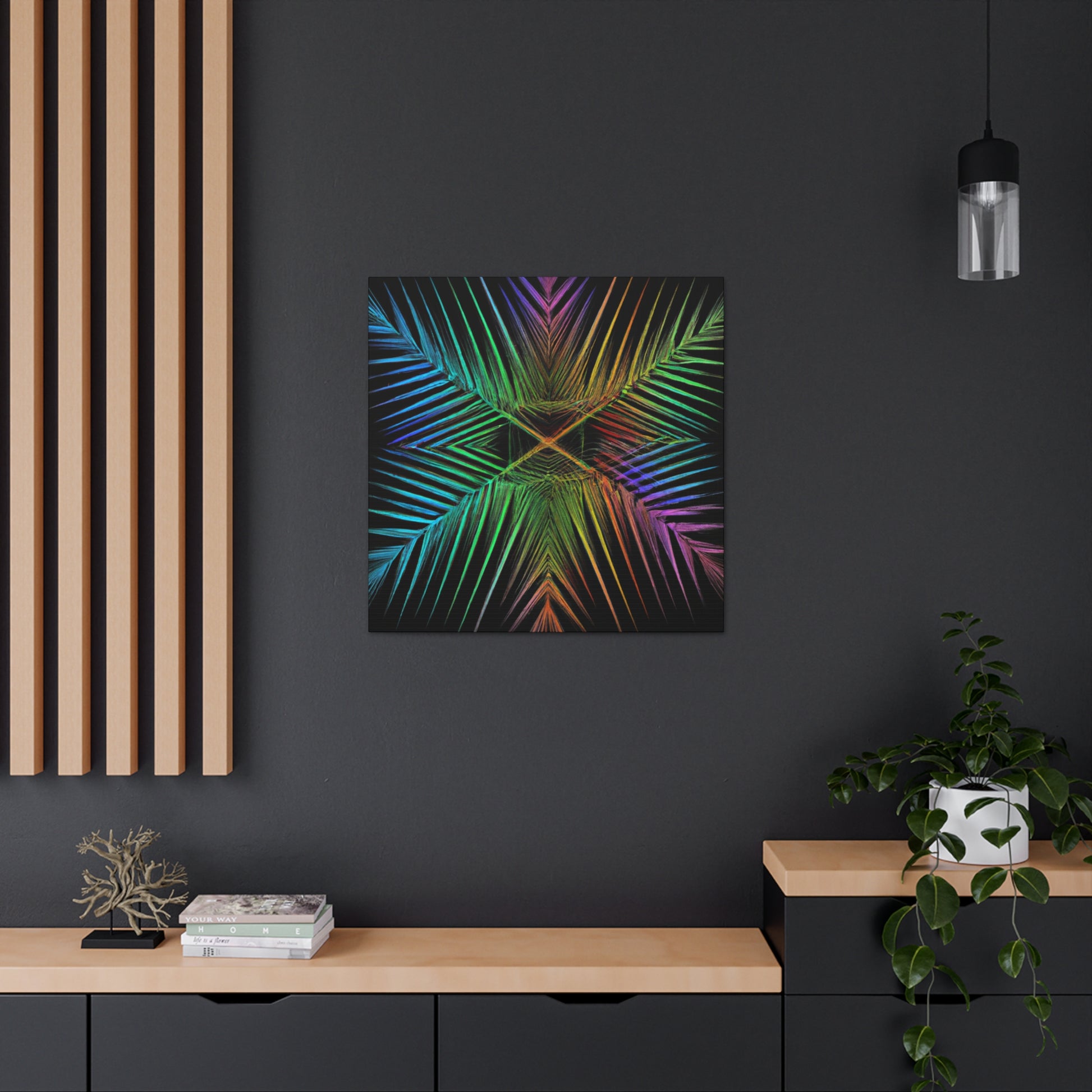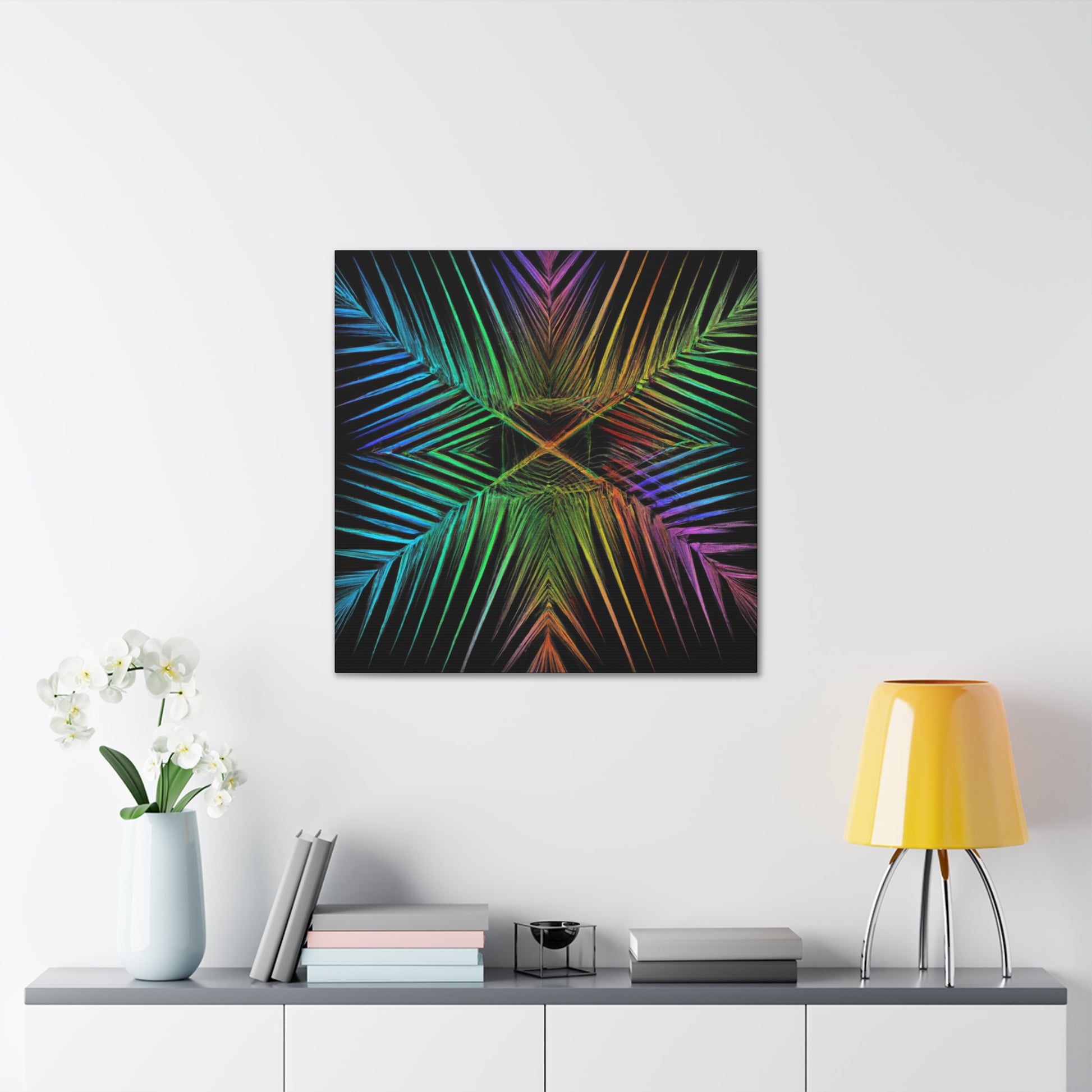 Lose yourself in the mesmerizingly psychedelic contemporary design of this canvas. Featuring vivid hues, bold 3D lines, and abstract geometric palm leaves that blend into a kaleidoscopic world, this art will create a vibrant focal point in any room. Its mesmerizing effects of light and color will energize your living space and captivate your guests. Perfectly encapsulating the essence of modern art, this canvas will bring out the designer in you. #contemporaryart #modernart #canvas #psychedelicart #palmleaves #kaleidoscope #abstract #3dlines #fractal #digitalart #vibrantcolors