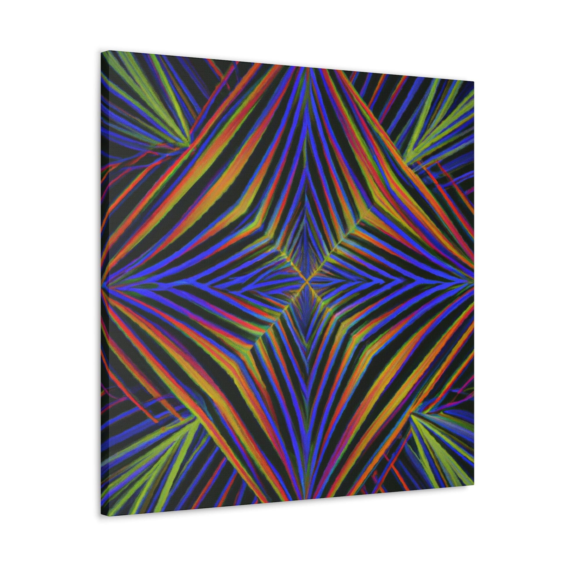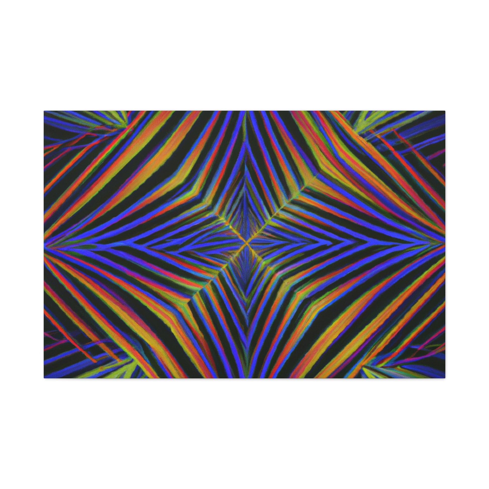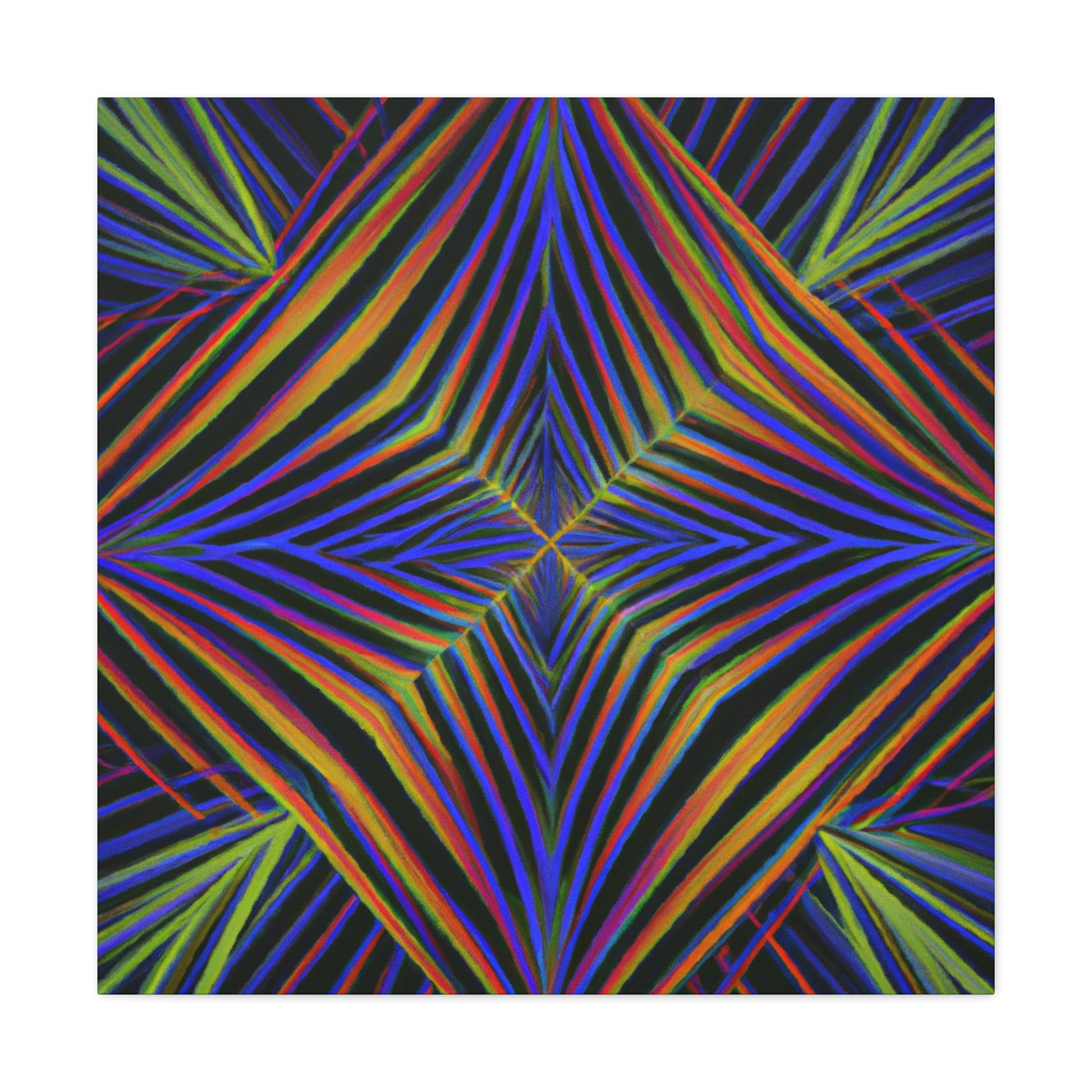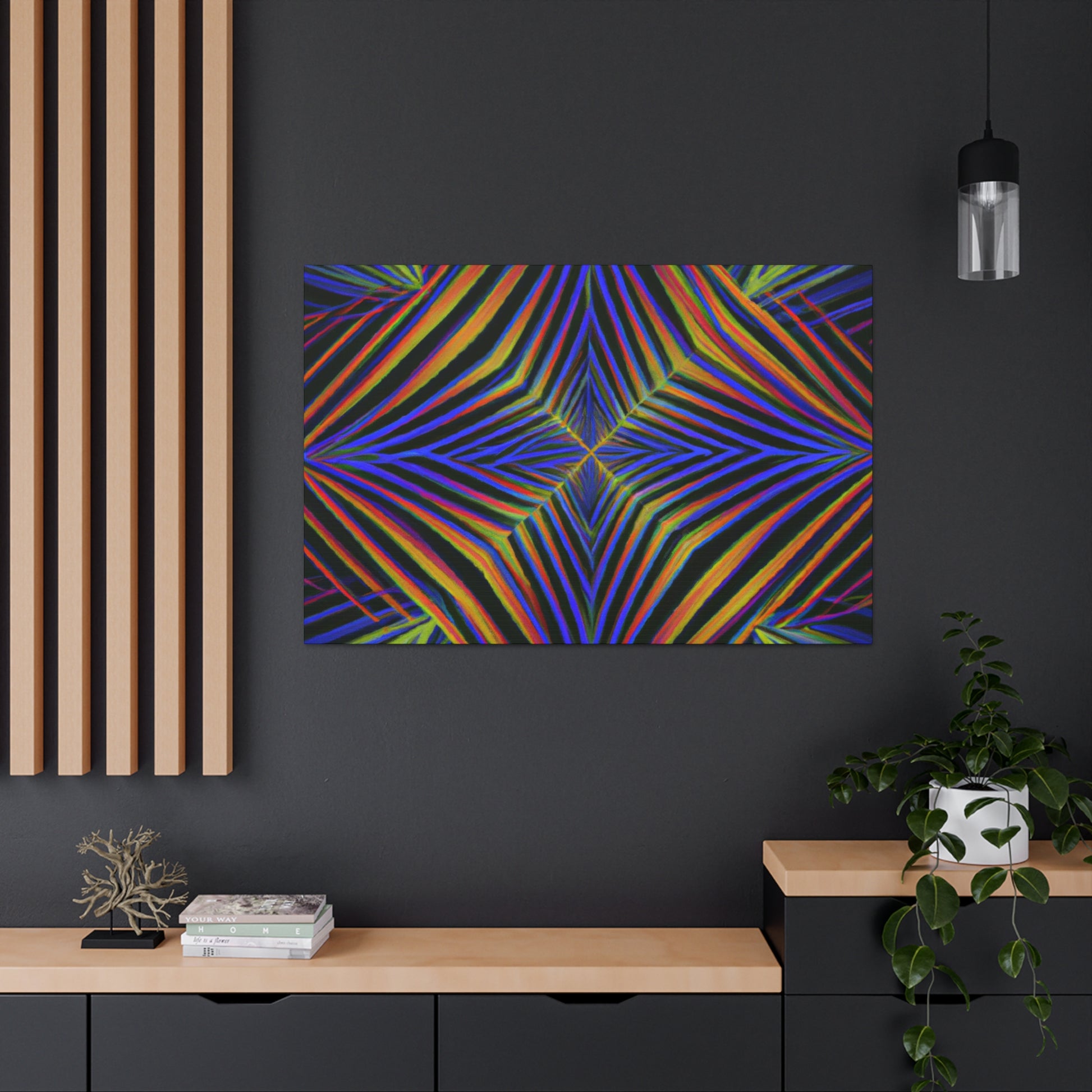 This Trippy Geometric Palm Leaves canvas uses abstract, digital art, vibrant colors, 3D lines, and fractal to create a psychedelic yet calming piece. Perfect for any room in your home, the work is sure to take your breath away. Ready to hang and enjoy the kaleidoscope beauty! #trippyart #geometricart #palmleaves #kaleidoscope #abstractart #digitalart #vibrantcolors #3dlines #fractal #psychedelicart #homedecorart