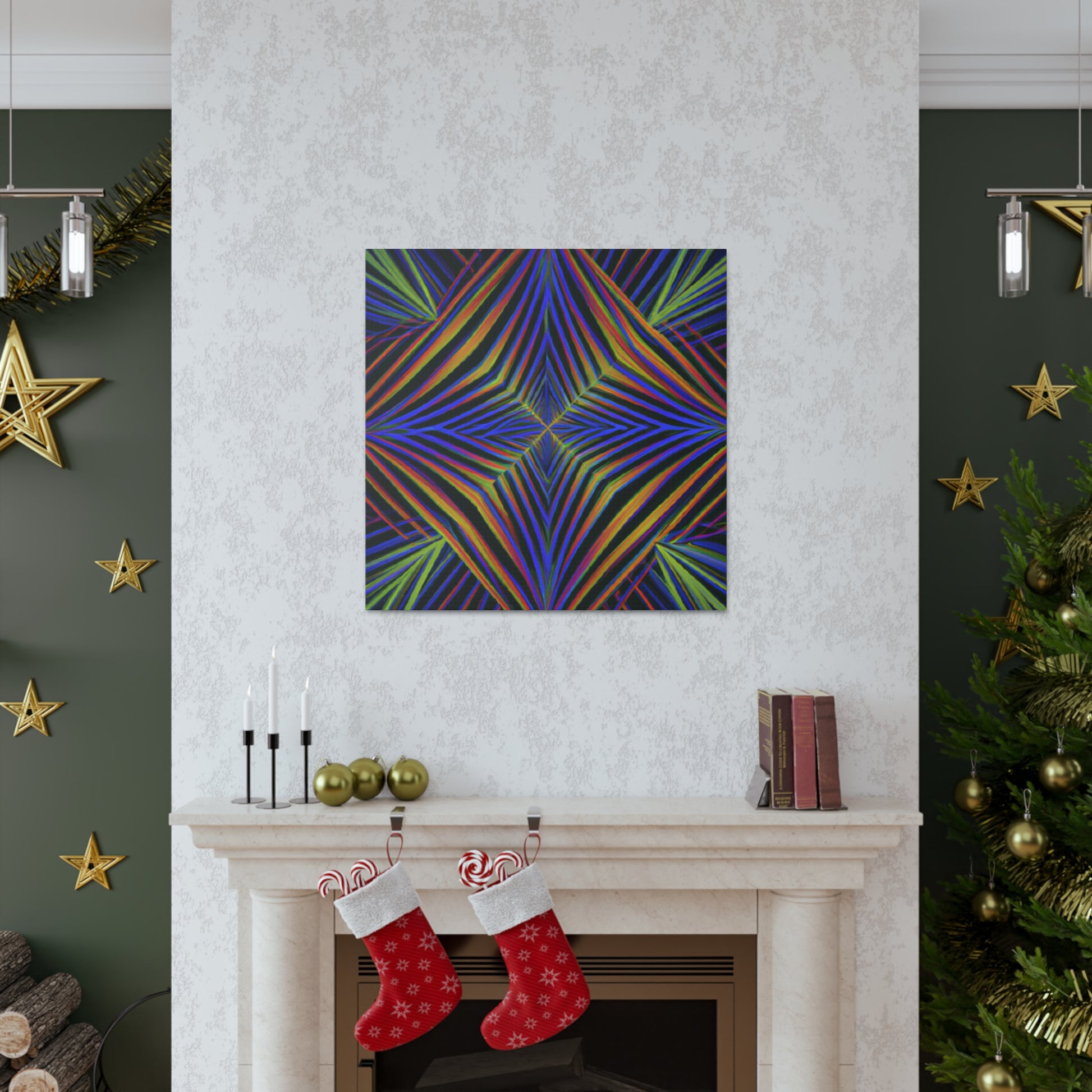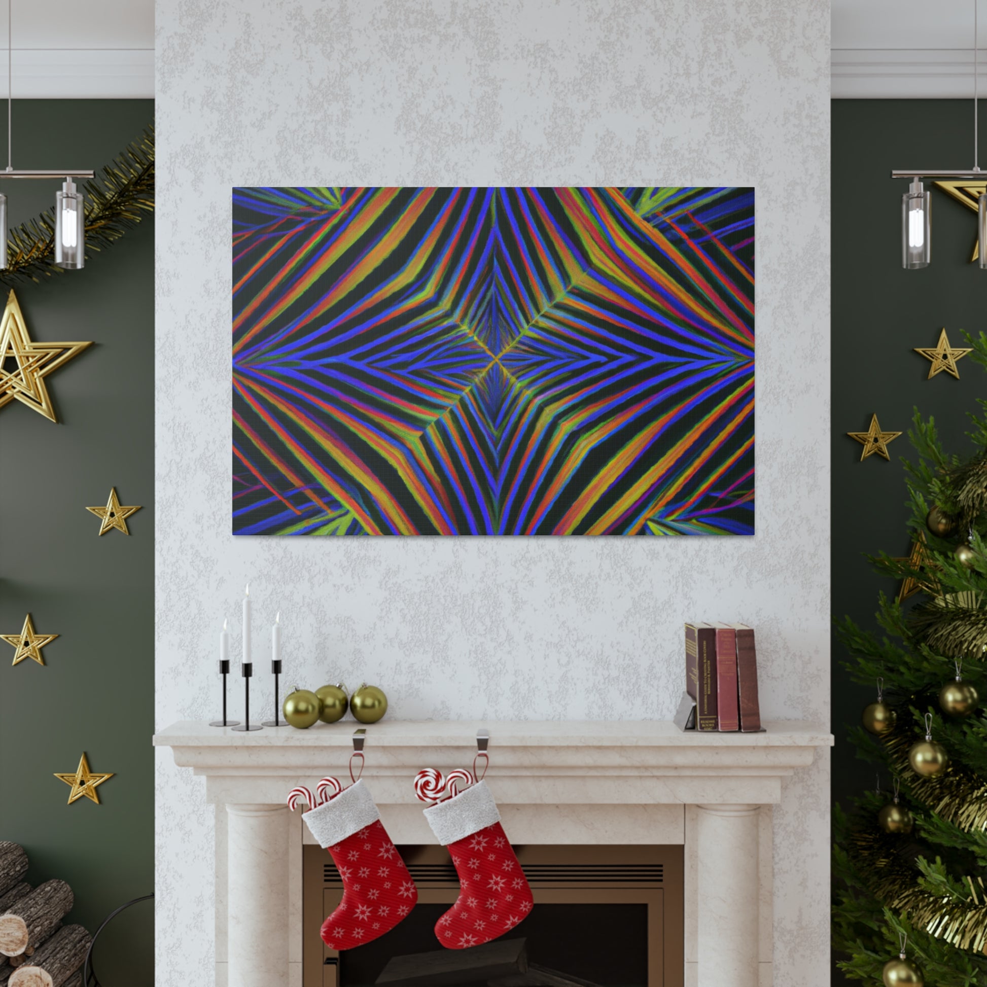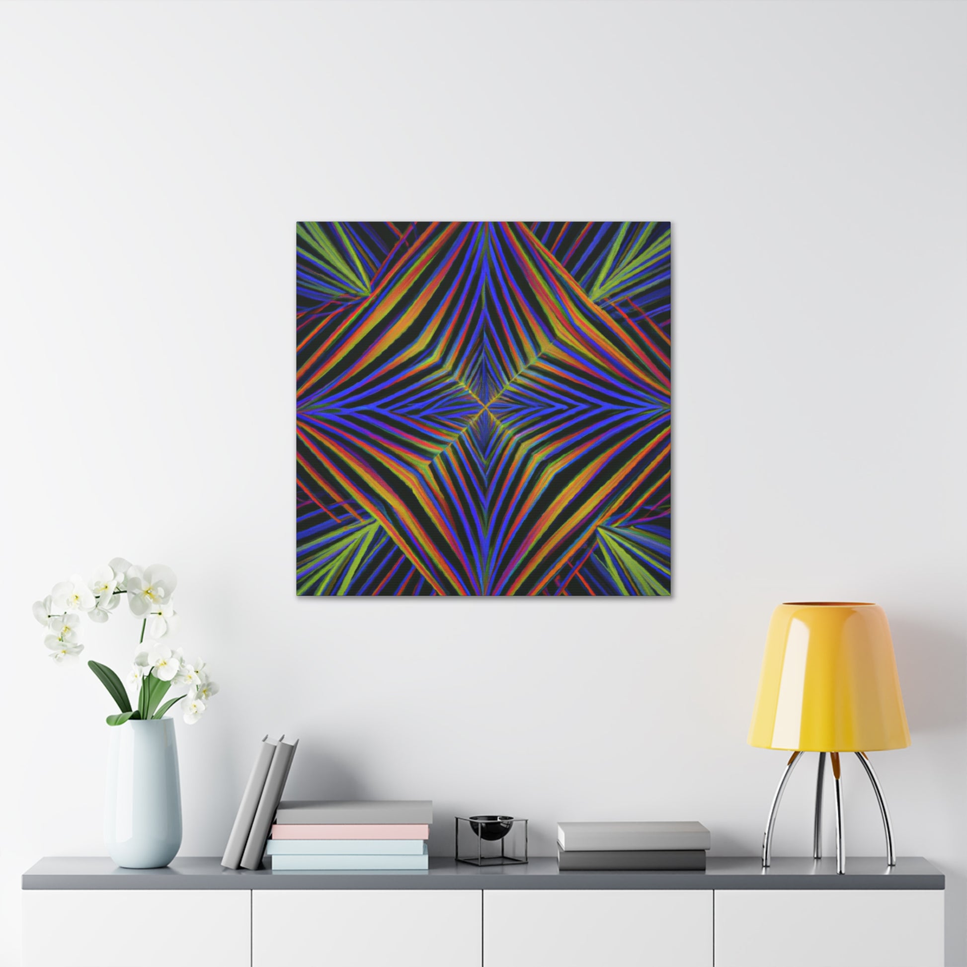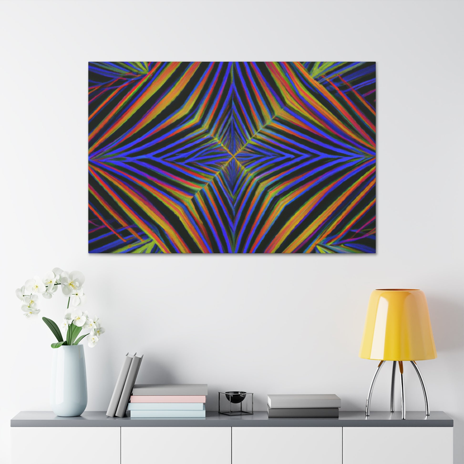 This Trippy Geometric Palm Leaves canvas uses abstract, digital art, vibrant colors, 3D lines, and fractal to create a psychedelic yet calming piece. Perfect for any room in your home, the work is sure to take your breath away. Ready to hang and enjoy the kaleidoscope beauty! #trippyart #geometricart #palmleaves #kaleidoscope #abstractart #digitalart #vibrantcolors #3dlines #fractal #psychedelicart #homedecorart