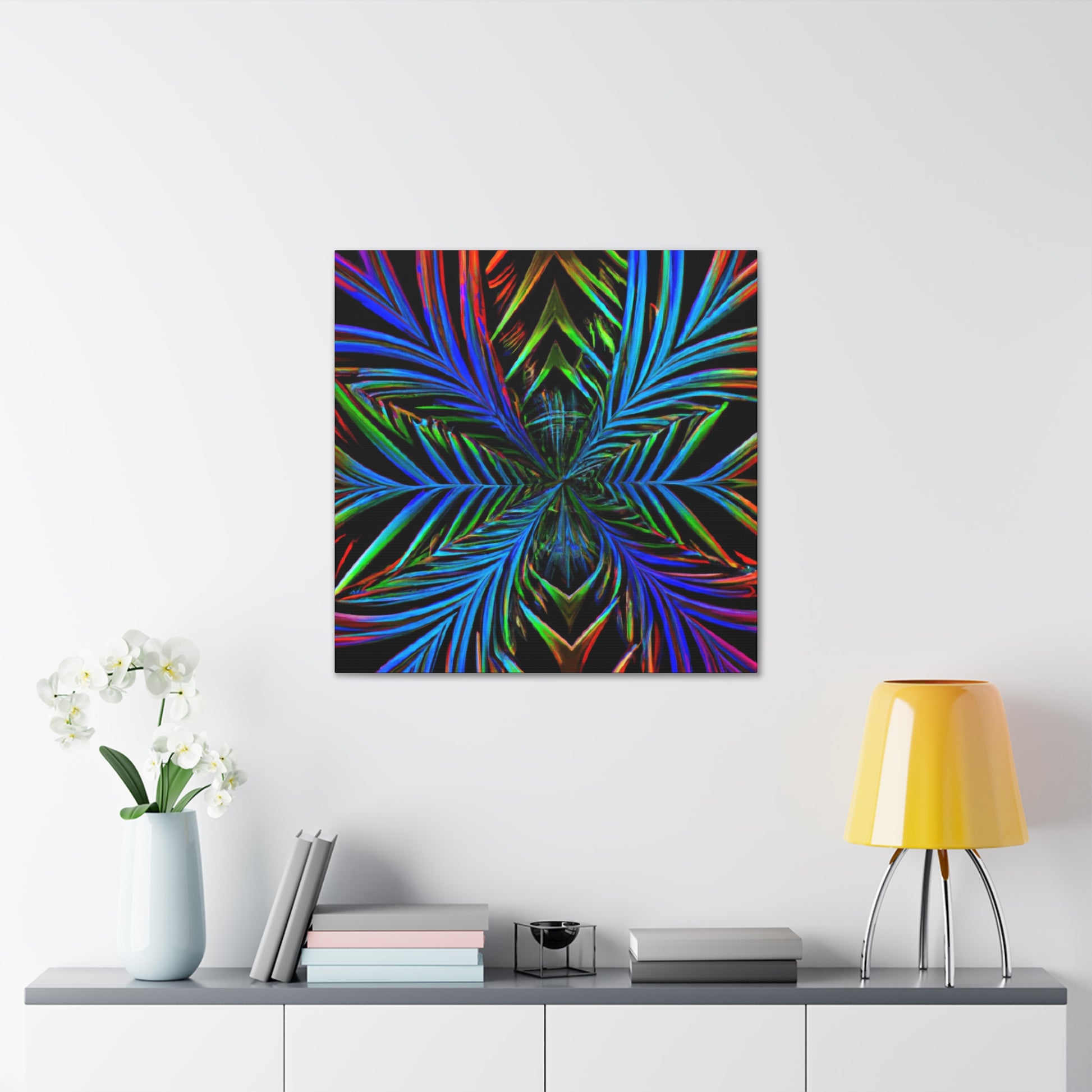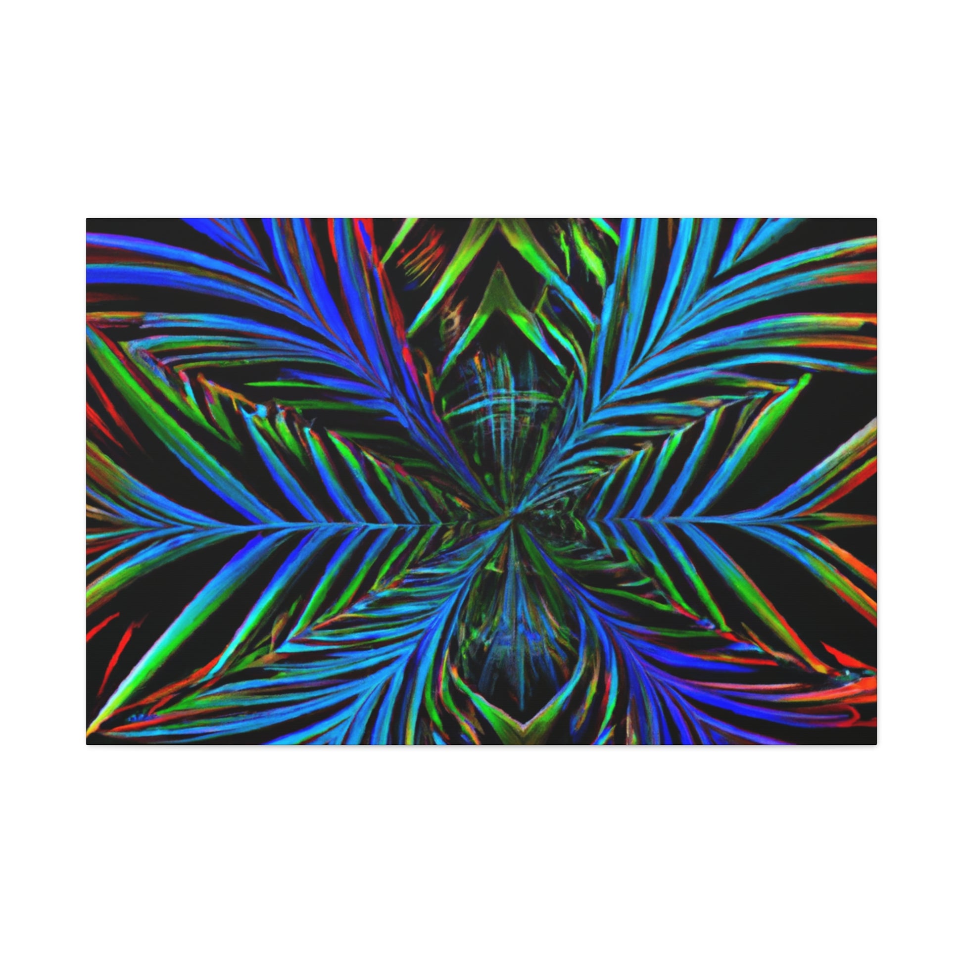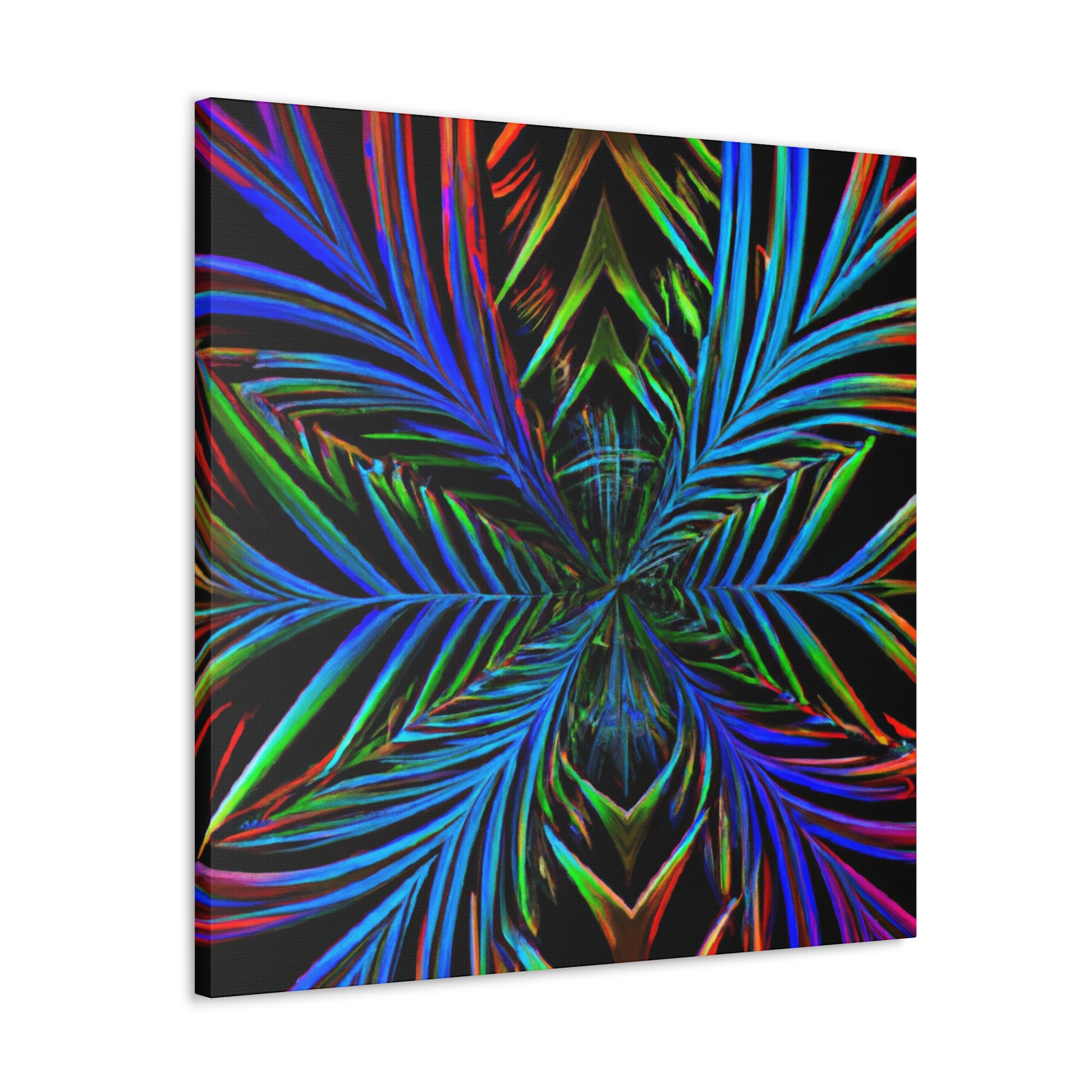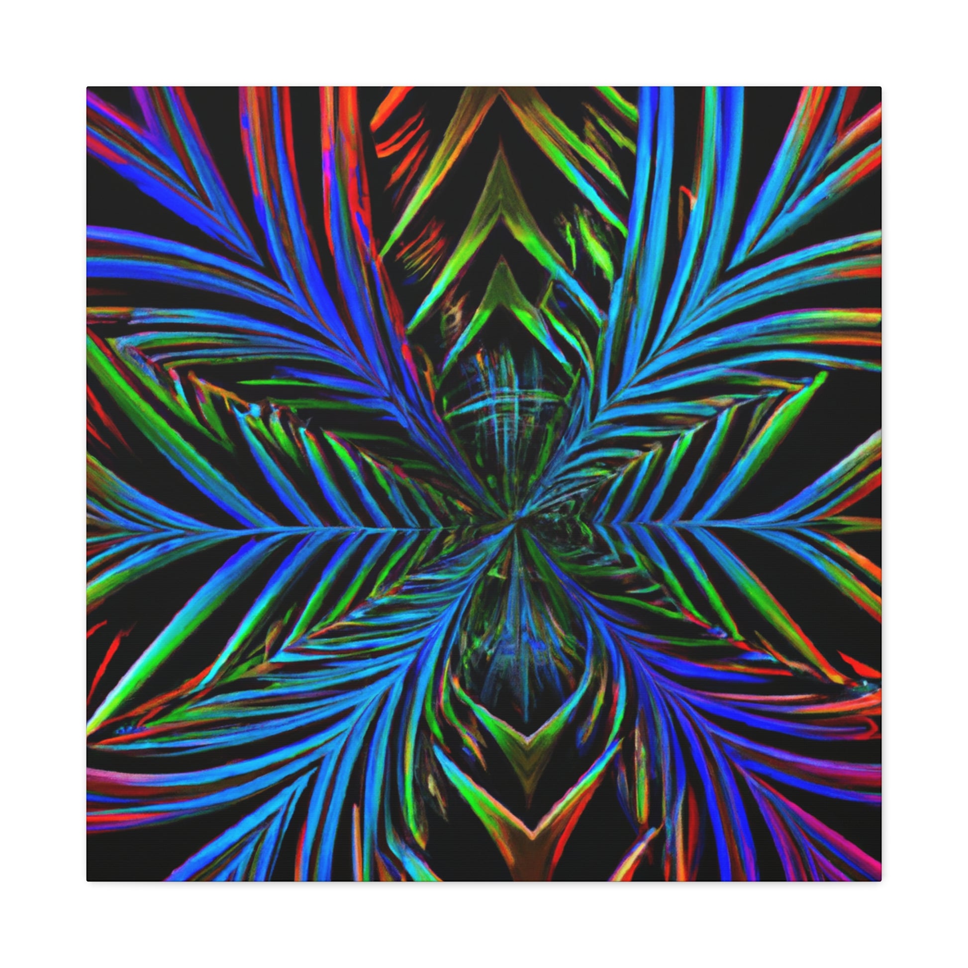 This striking canvas art features bright and bold colors, creating a stunning trippy, geometric design. It features kaleidoscope, abstract, digital art, vibrant colors, 3D lines, and fractal all together in one unique piece. A perfect combination of modern and abstract, lend a stunning look to any wall in your space. #geometricpalmleaves #kaleidoscope #digitalart #abstractart #3Dlines #fractal #vibrantcolors #canvasart #trippyart #modernart #contemporaryart
