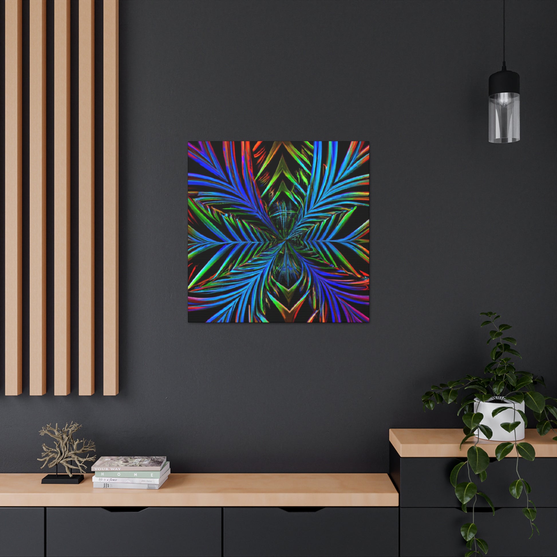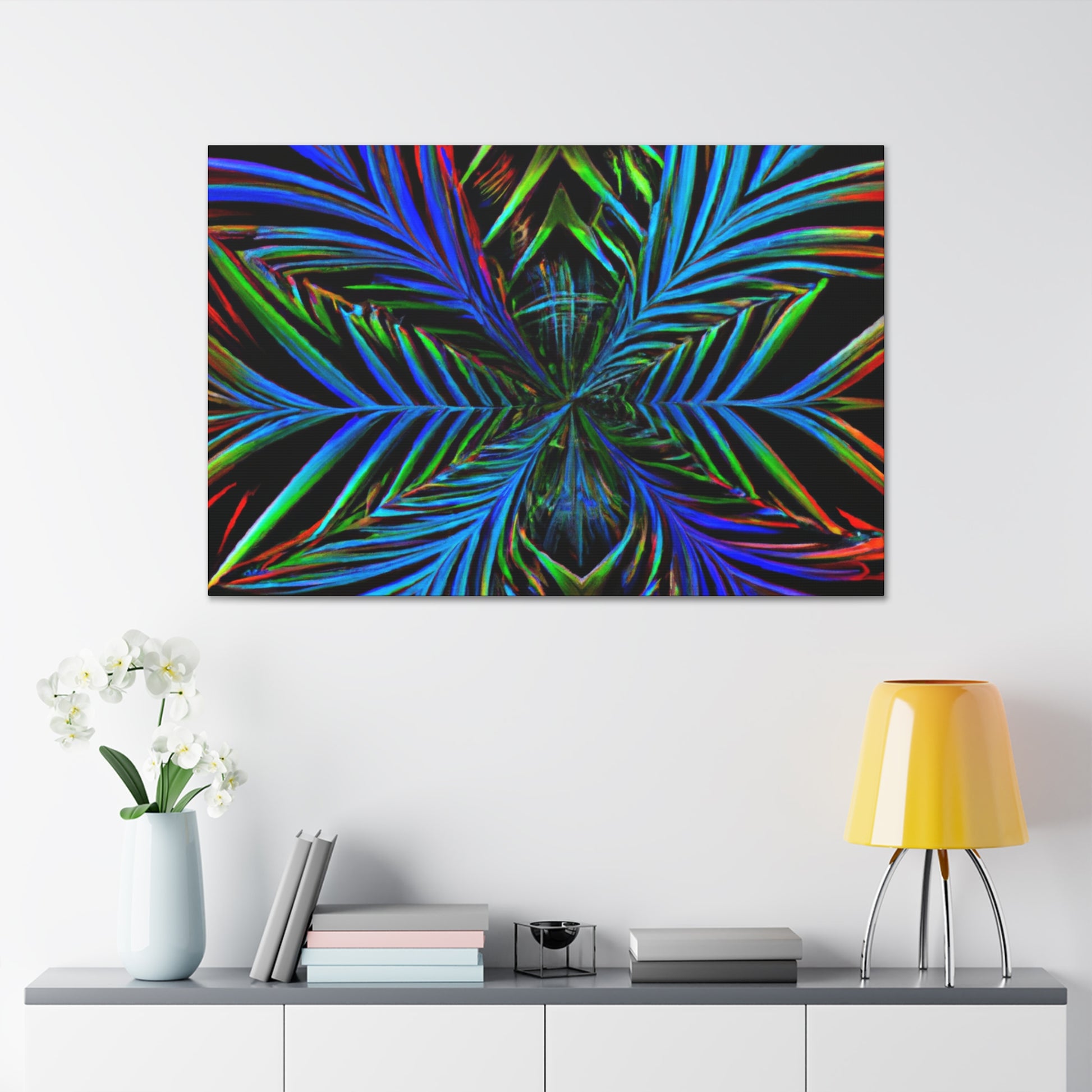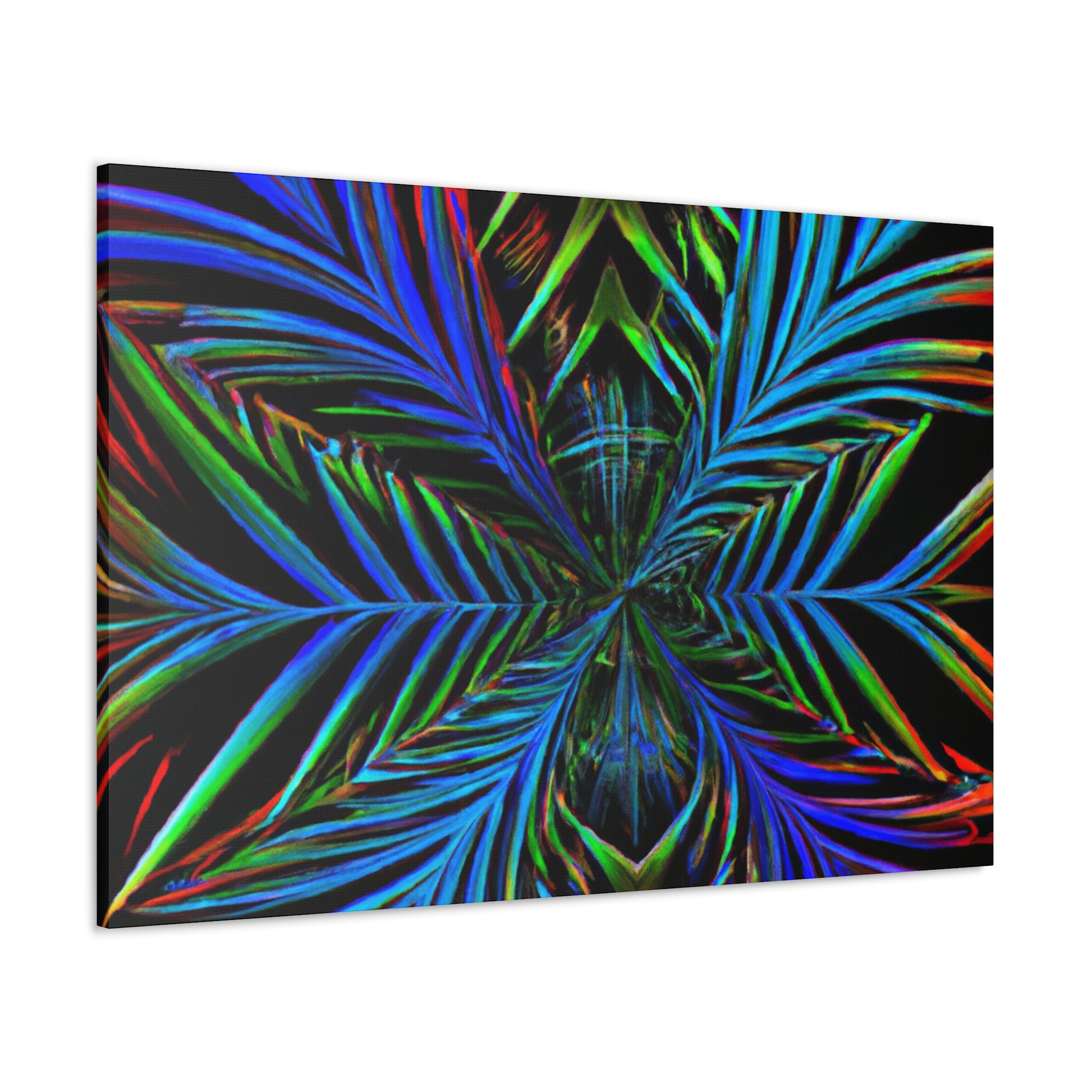 This striking canvas art features bright and bold colors, creating a stunning trippy, geometric design. It features kaleidoscope, abstract, digital art, vibrant colors, 3D lines, and fractal all together in one unique piece. A perfect combination of modern and abstract, lend a stunning look to any wall in your space. #geometricpalmleaves #kaleidoscope #digitalart #abstractart #3Dlines #fractal #vibrantcolors #canvasart #trippyart #modernart #contemporaryart