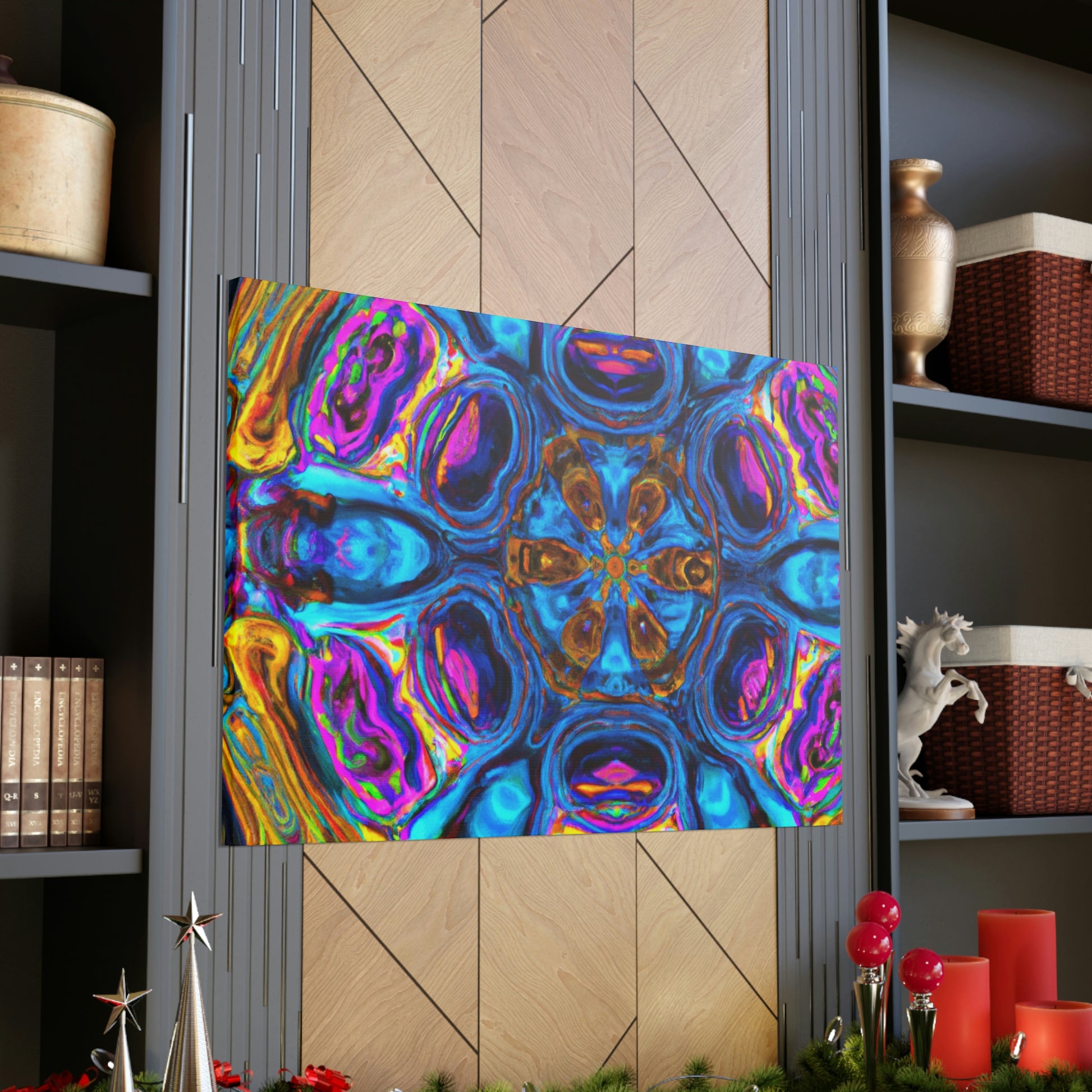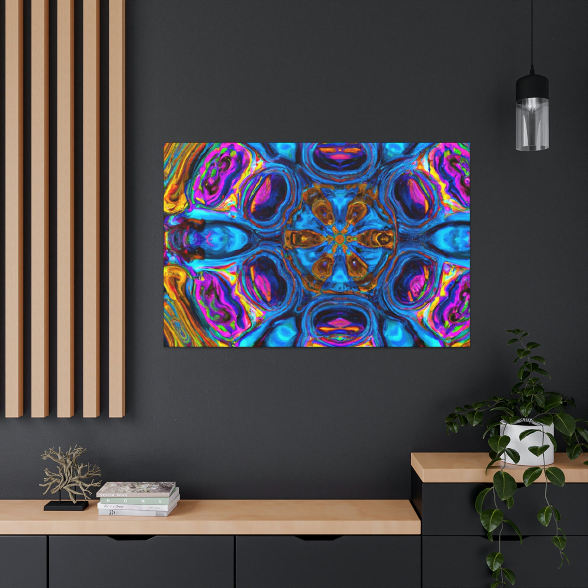 This eye-catching work of art features bright, vibrant colors and 3D lines to create the look of a psychedelic landscape. The abstract design features mushrooms and kaleidoscope shapes that will look beautiful in any room. The resolution-independent design of this piece of digital art ensures it will look good on any wall. Delight in the colorful, trippy design of this canvas wall art and add a unique touch to your home today!