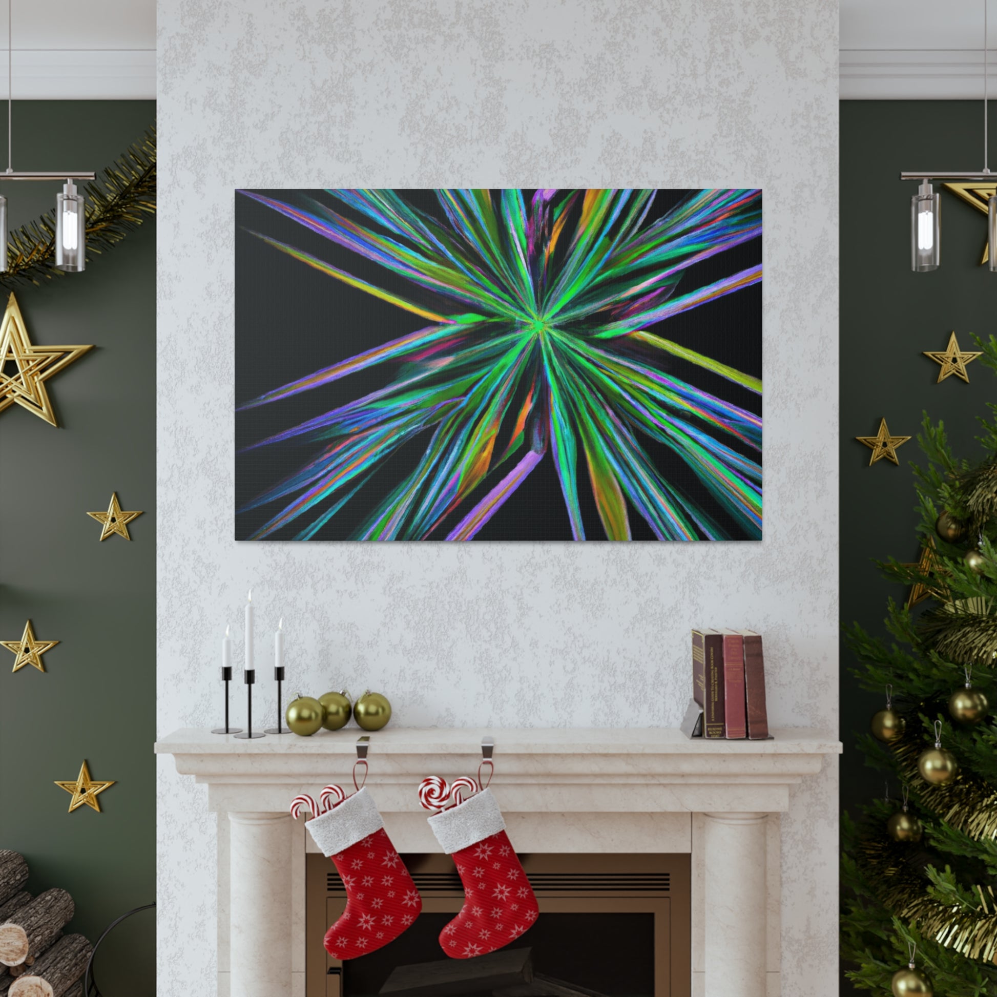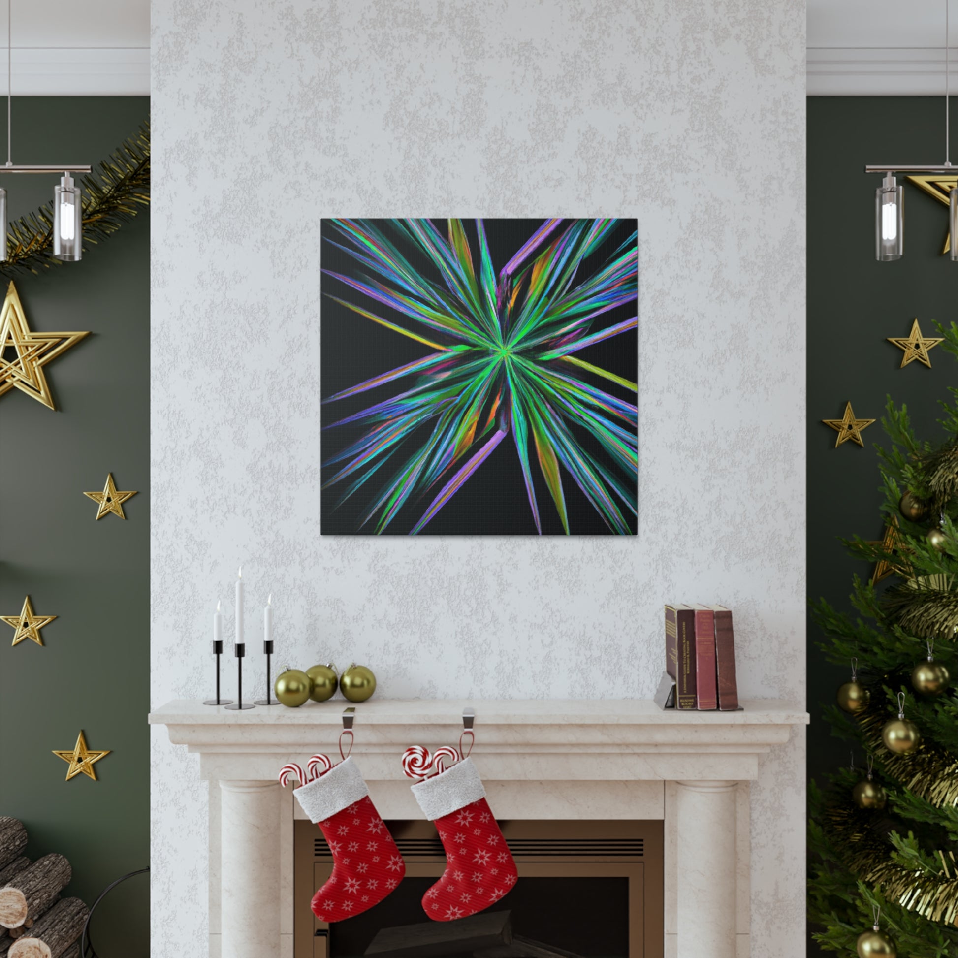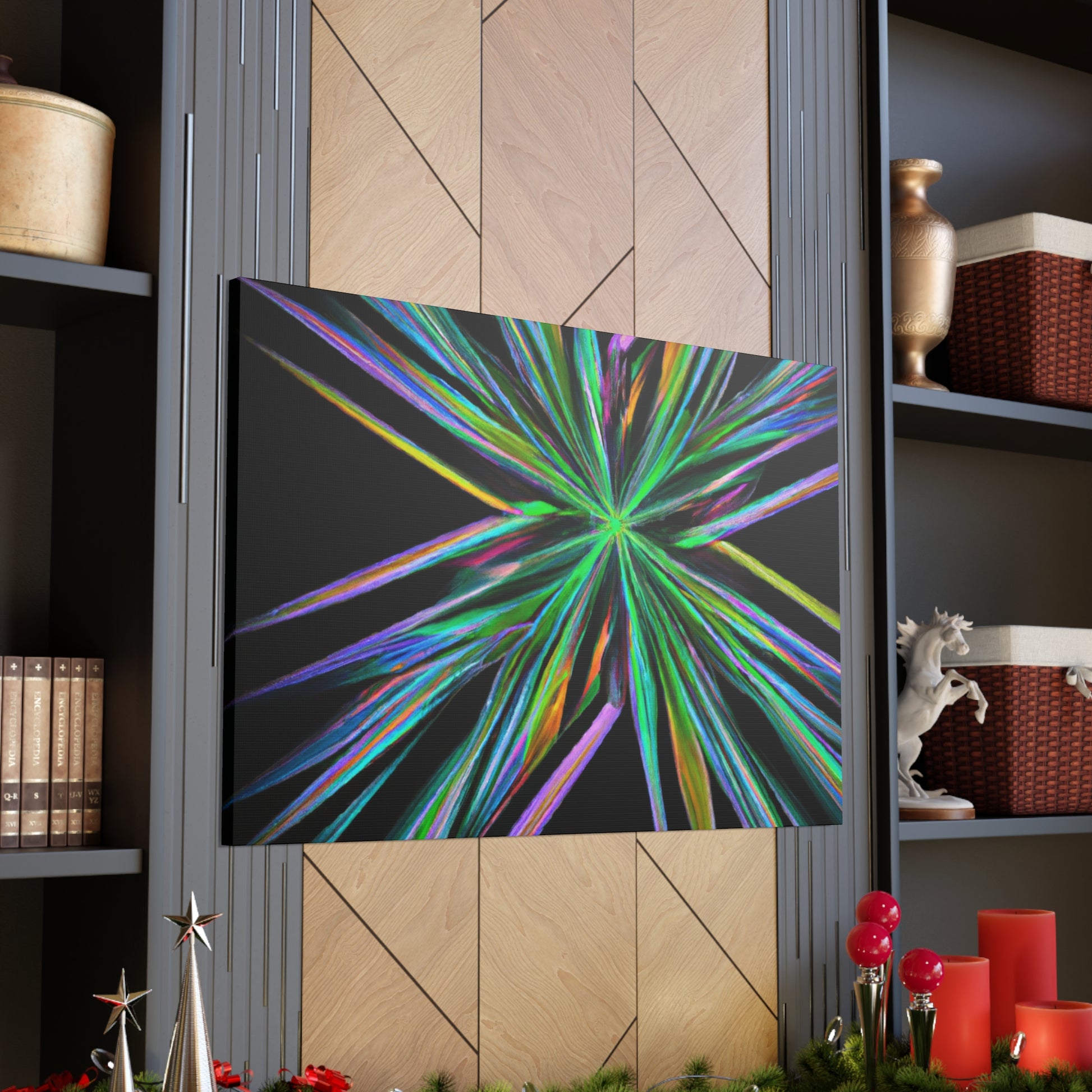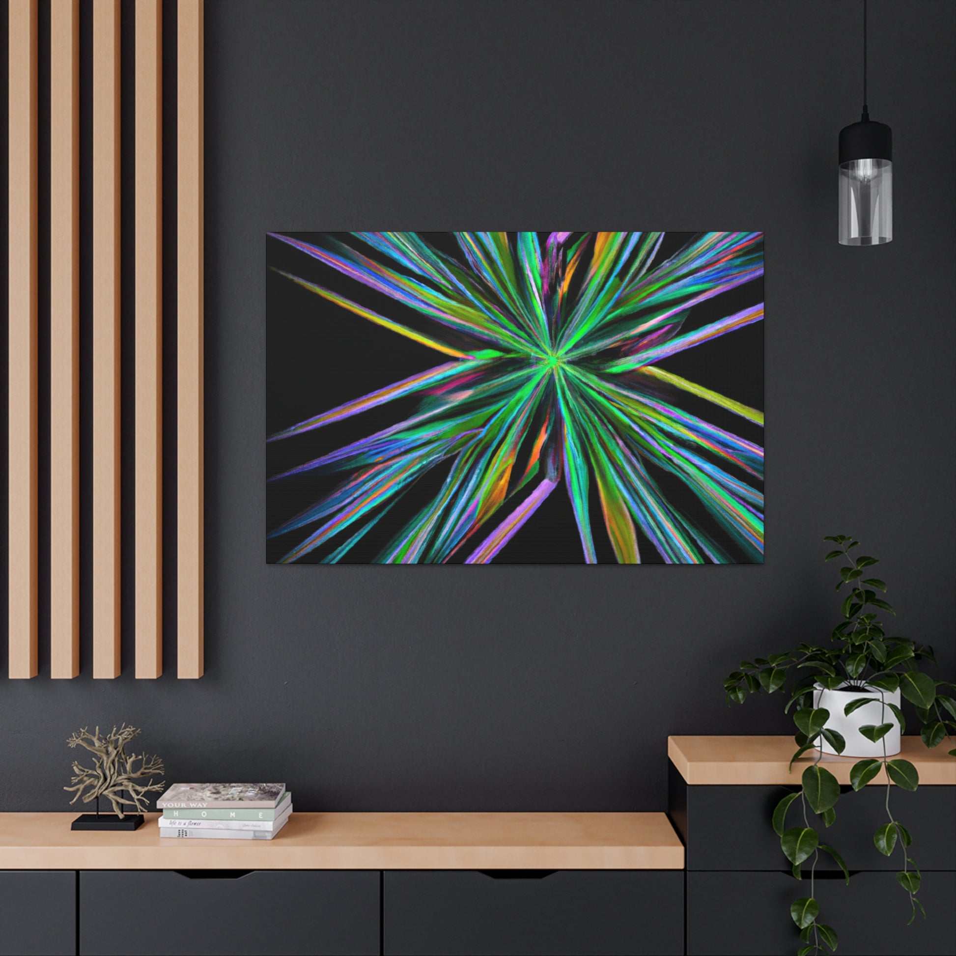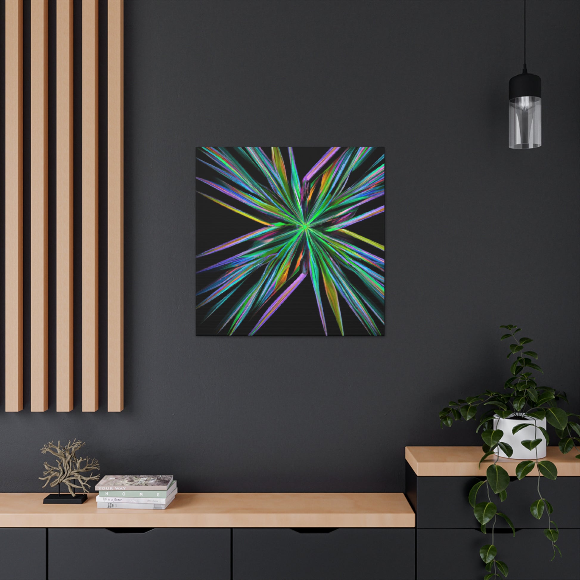 Bring the beauty of geometry to life with this Trippy Geometric Palm Leaves, Kaleidoscope, Abstract, Digital Art, Vibrant Colors, 3D Lines, & Fractal Canvas. Take your