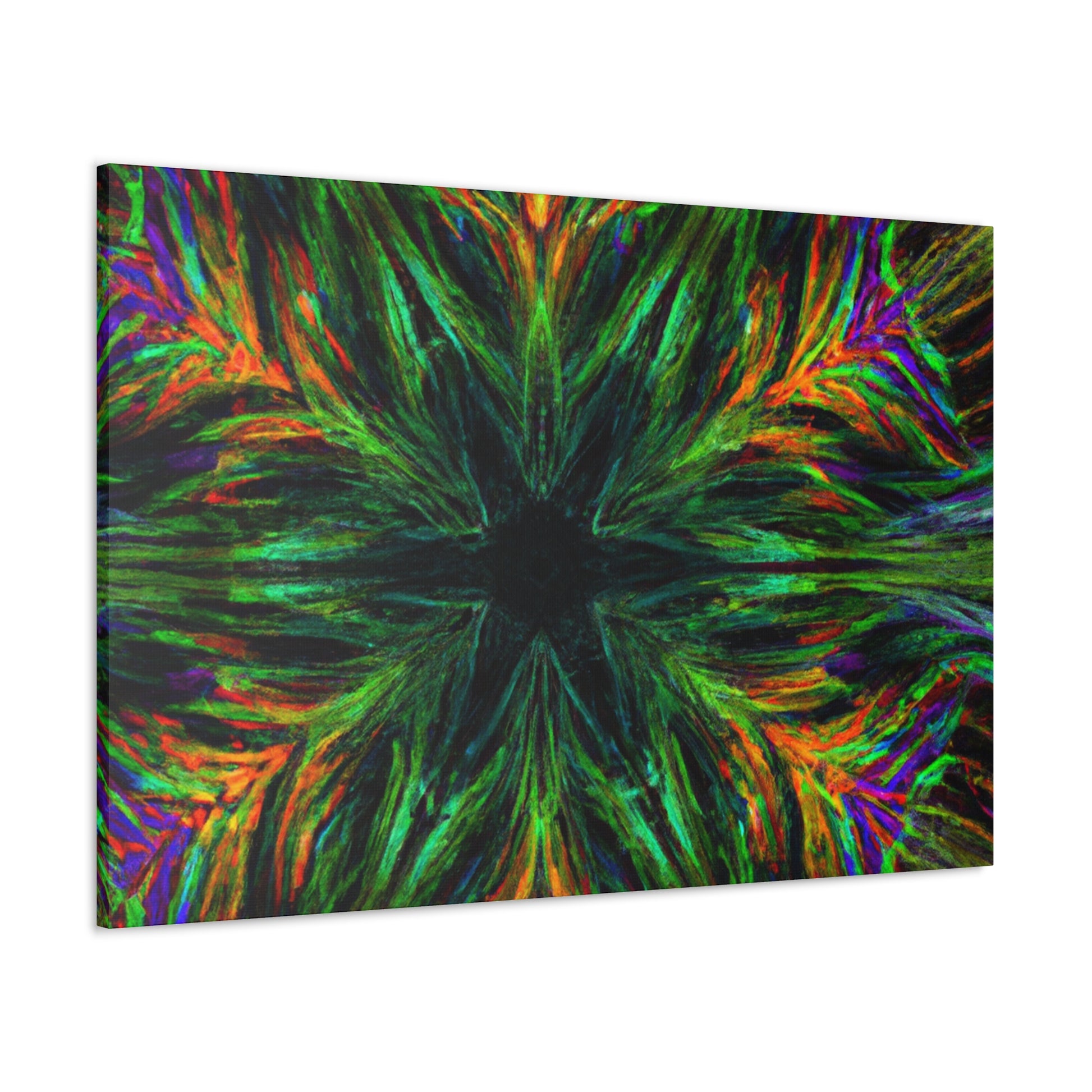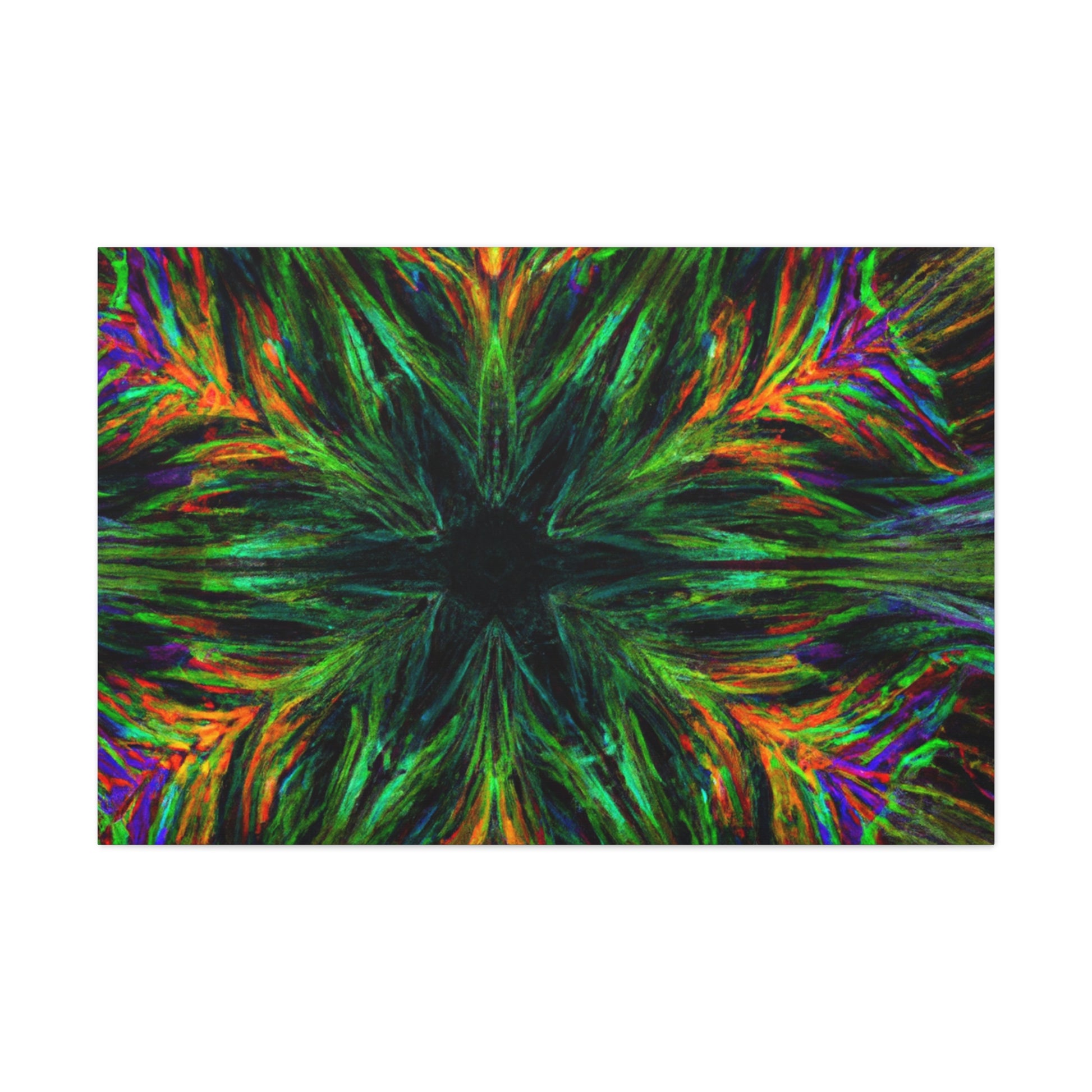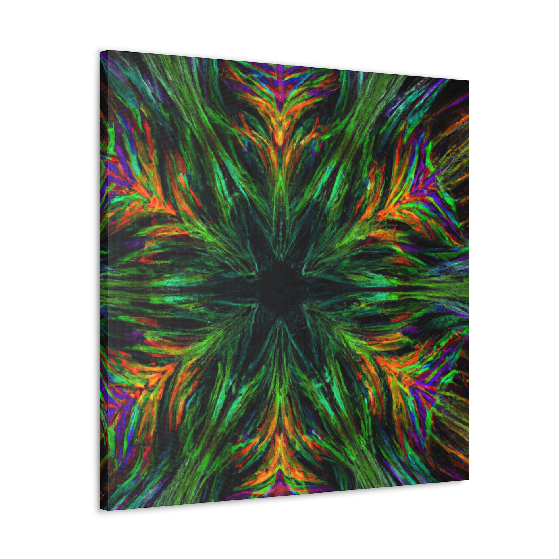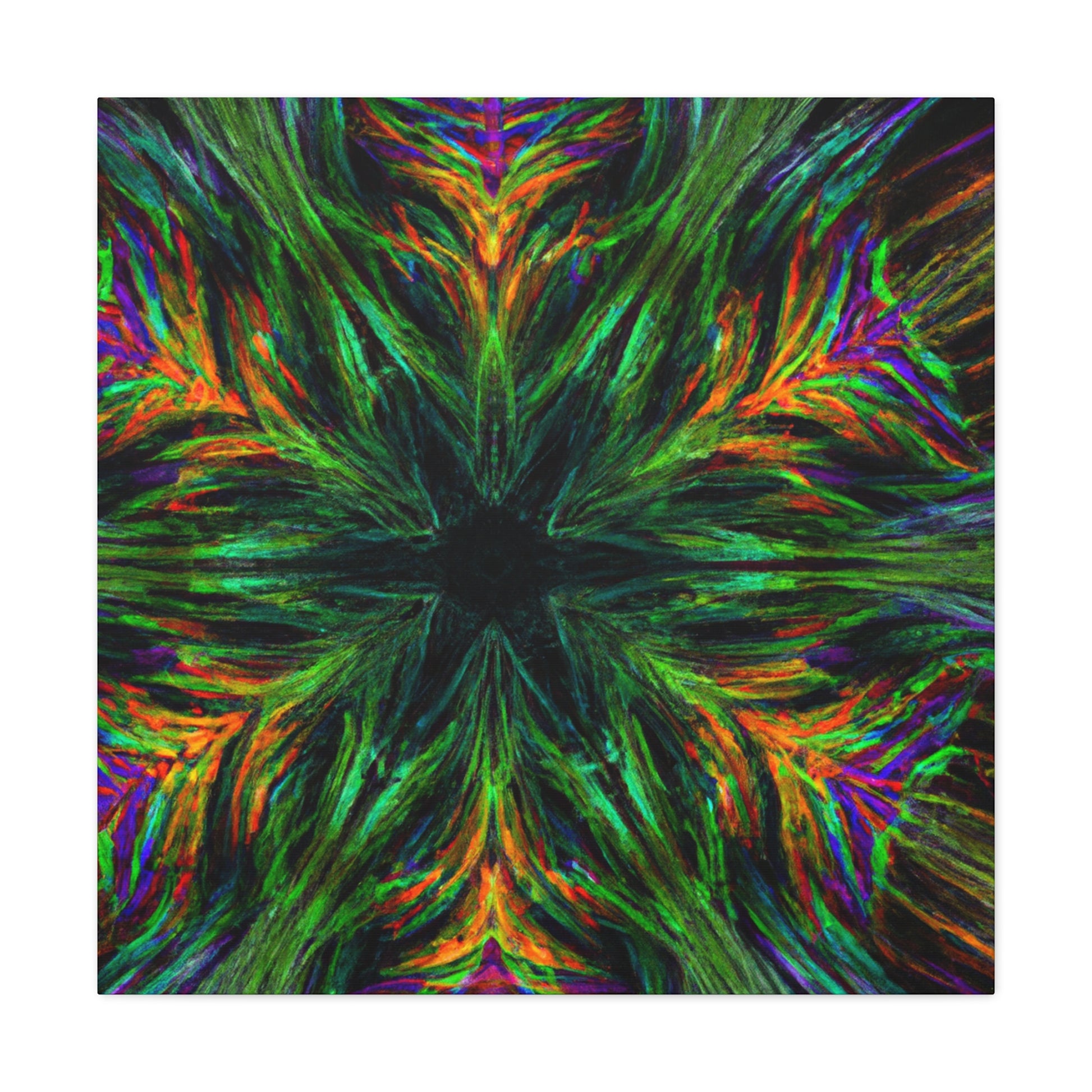 This one-of-a-kind canvas features trippy geometric palm leaves, kaleidoscope designs, 3D lines, abstract art, and vivid colors that create a stunning fractal. Boldly add something unique to your décor with this beautiful digital art piece! #abstractart #fractalart #vibrantcolors #canvasart #kaliedescope #trippyart #3Dlines #palmeleaves #digitlaart #vividcolors #fractaldesign