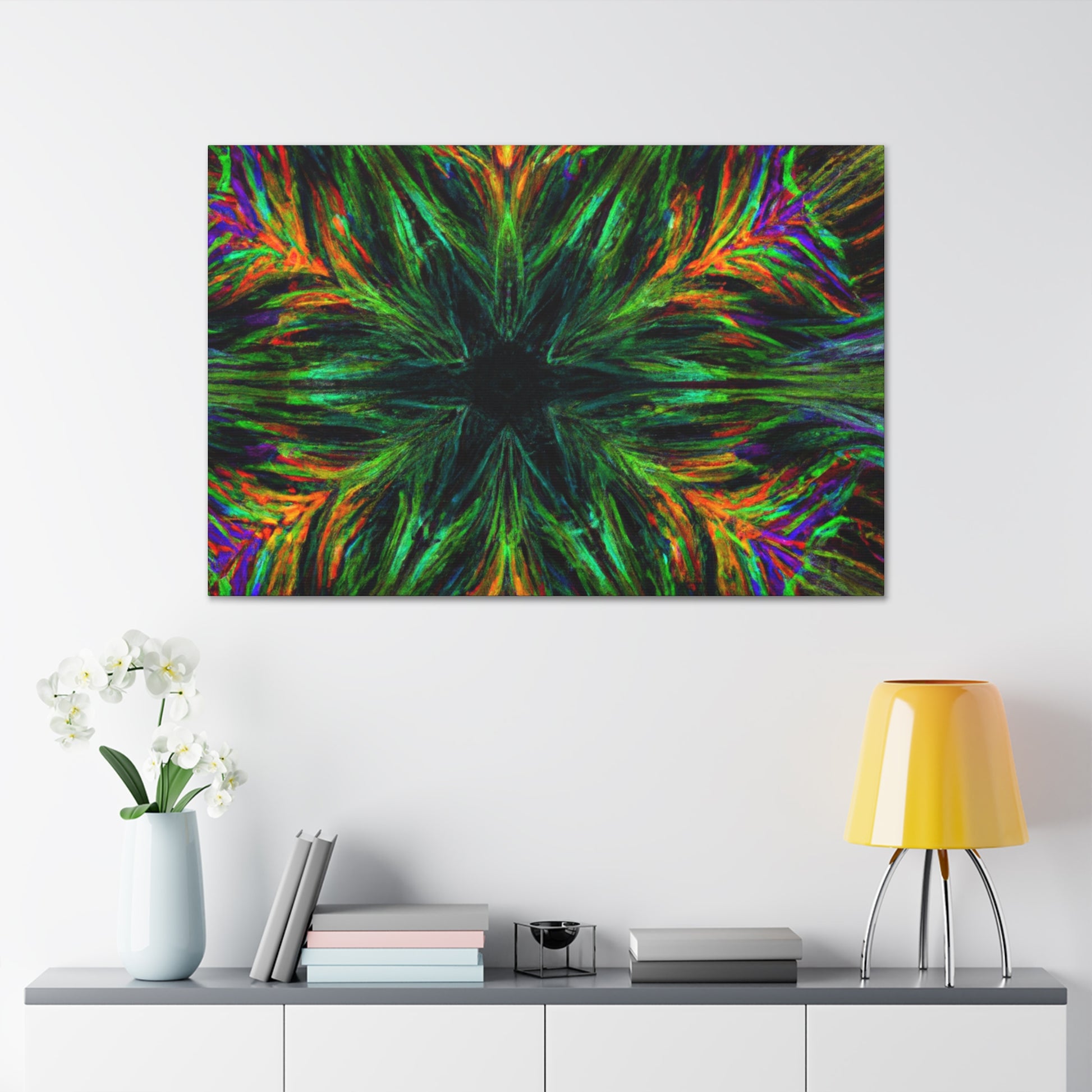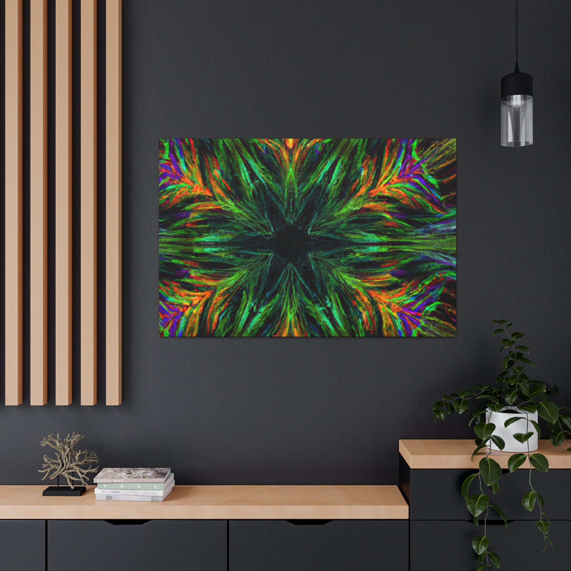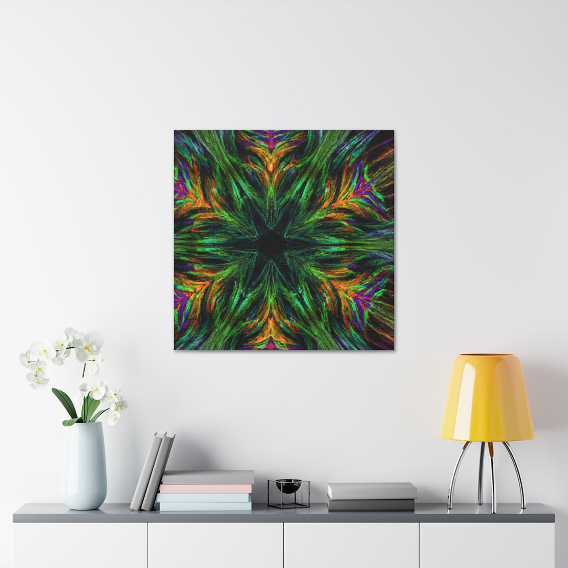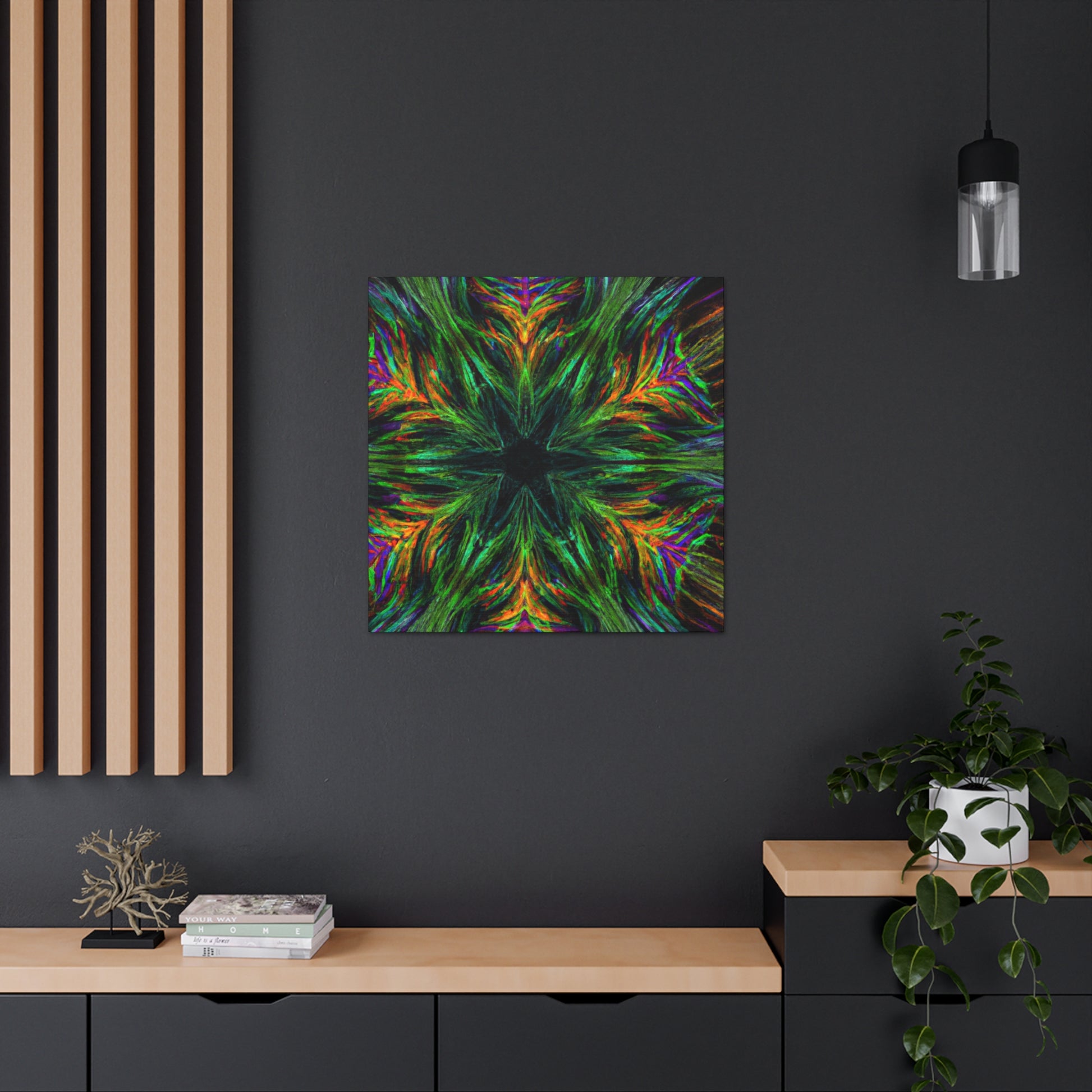 This one-of-a-kind canvas features trippy geometric palm leaves, kaleidoscope designs, 3D lines, abstract art, and vivid colors that create a stunning fractal. Boldly add something unique to your décor with this beautiful digital art piece! #abstractart #fractalart #vibrantcolors #canvasart #kaliedescope #trippyart #3Dlines #palmeleaves #digitlaart #vividcolors #fractaldesign