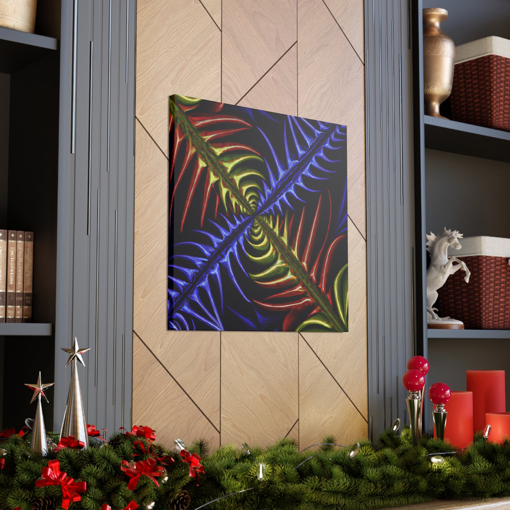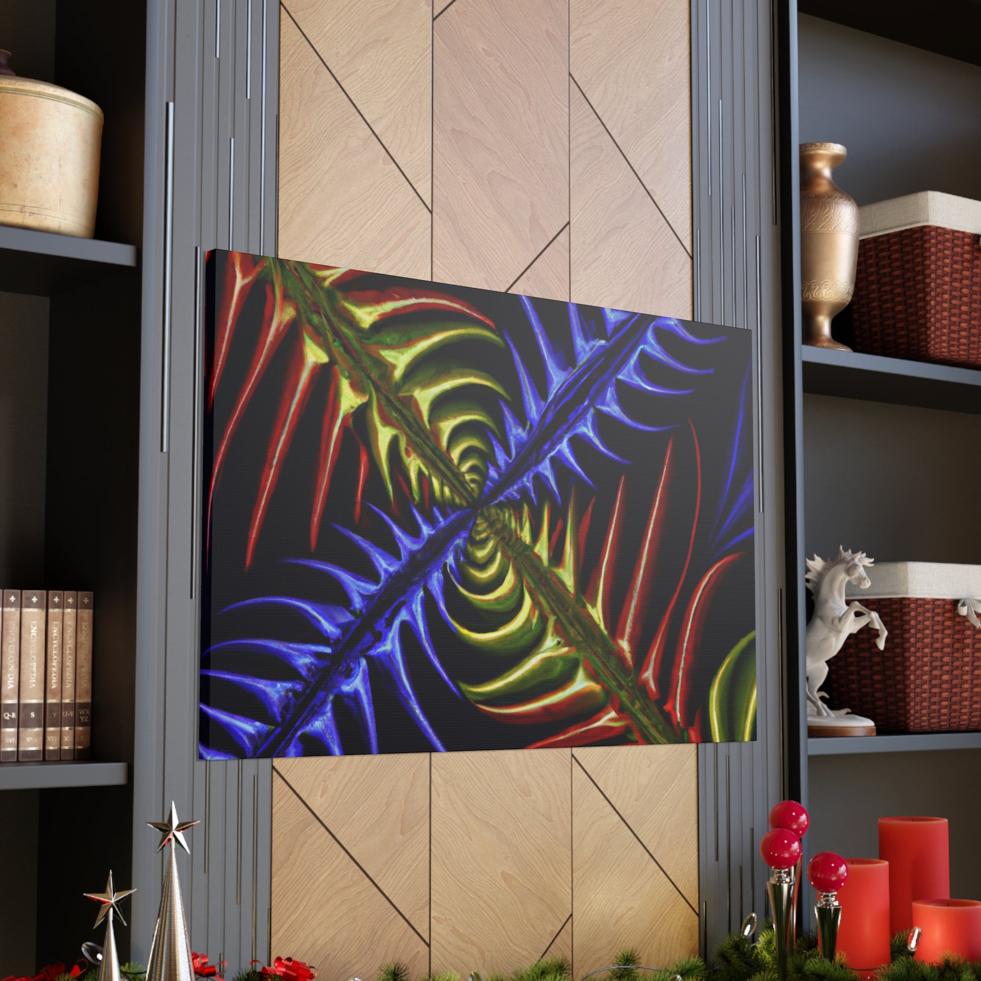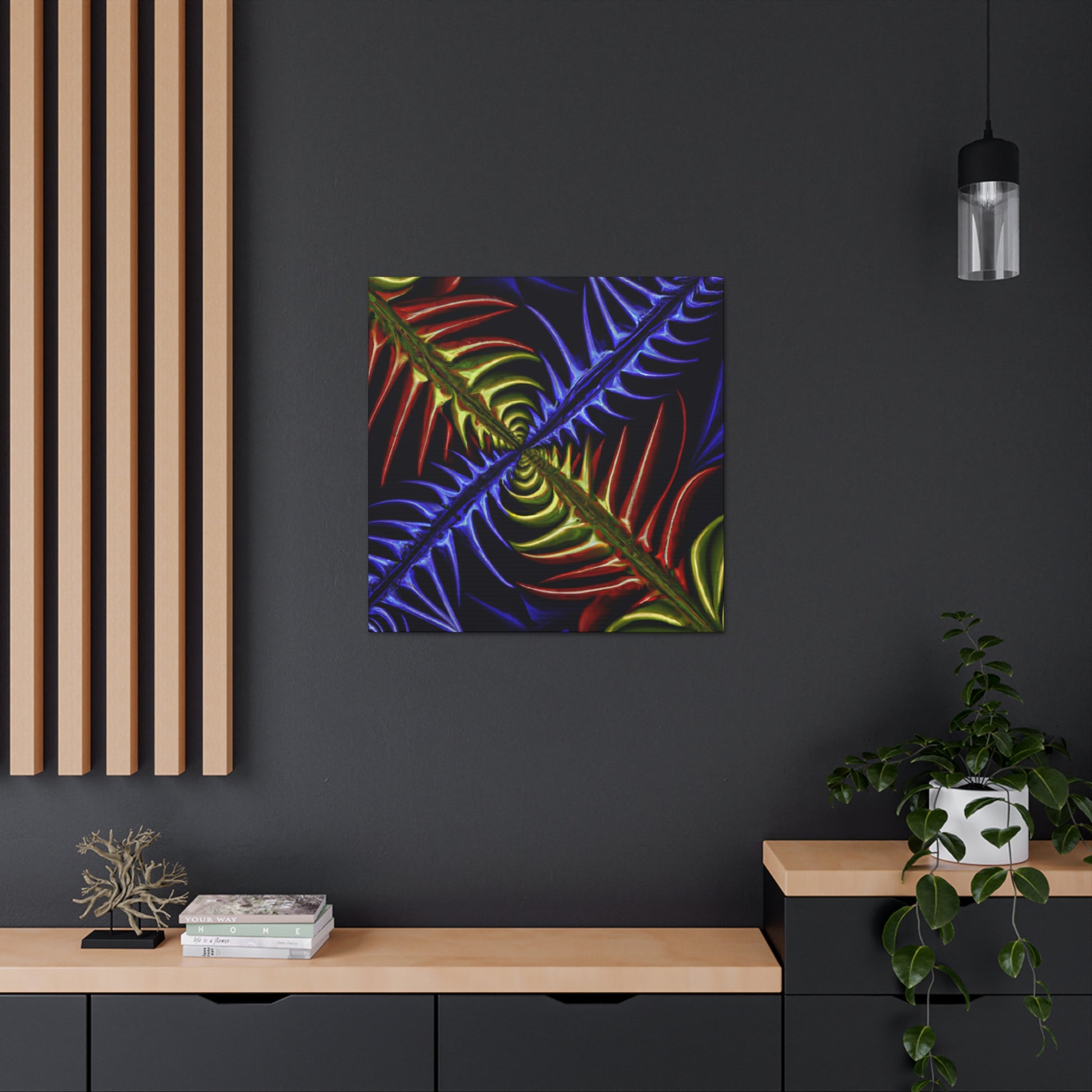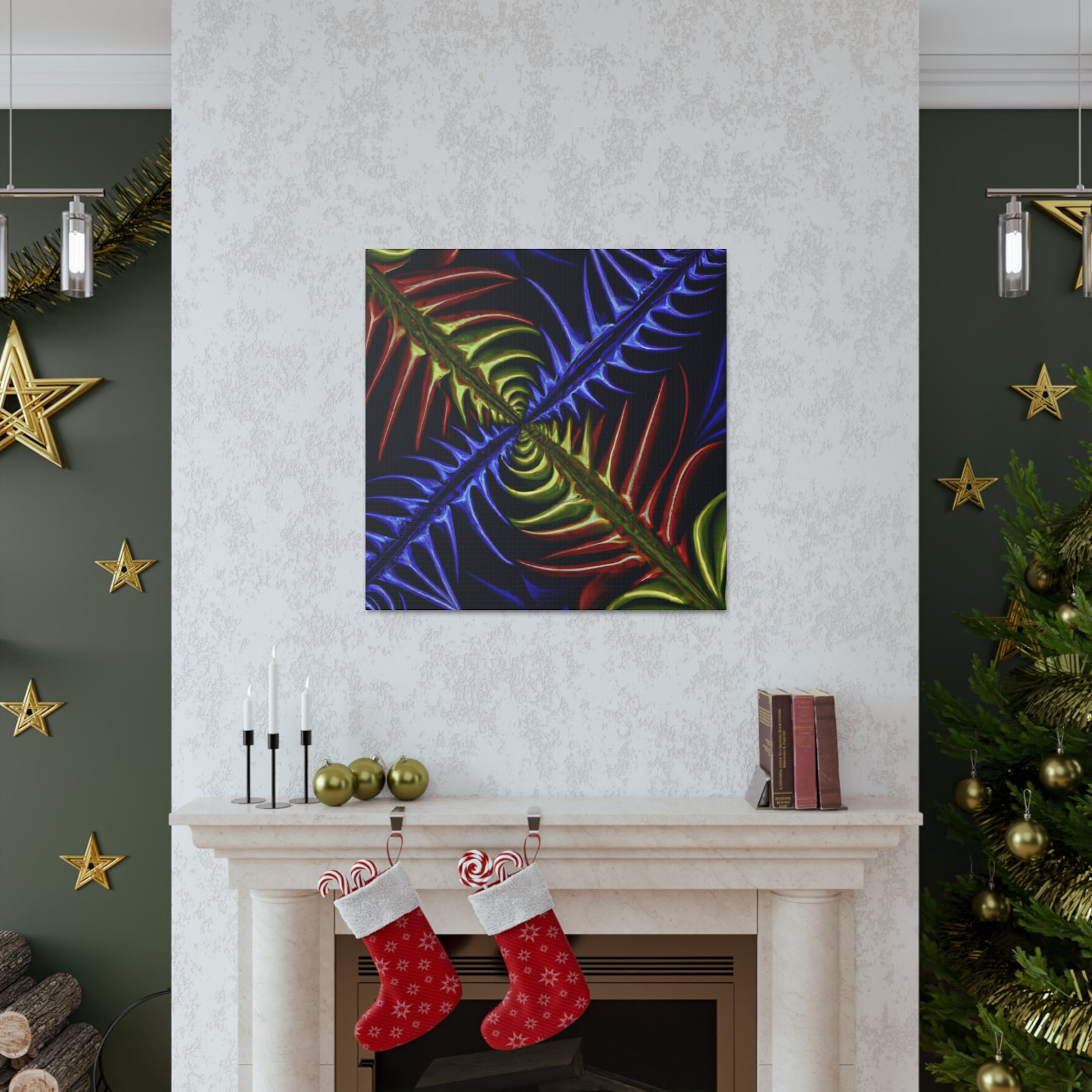 This canvas features a unique combination of trippy geometric palm leaves, kaleidoscope, abstract, and digital art elements, set to vibrant colors and 3D lines. The fractal design gives a stunning visual as it draws the eye. This piece adds a splash of color to any space and will bring a sense of creativity and imagination to your home. #abstractart #palmleaves #kaleidoscope #digitalart #vibrantcolors #3Dlines #fractal #canvasart #canvas #trippygeometric #allemandart