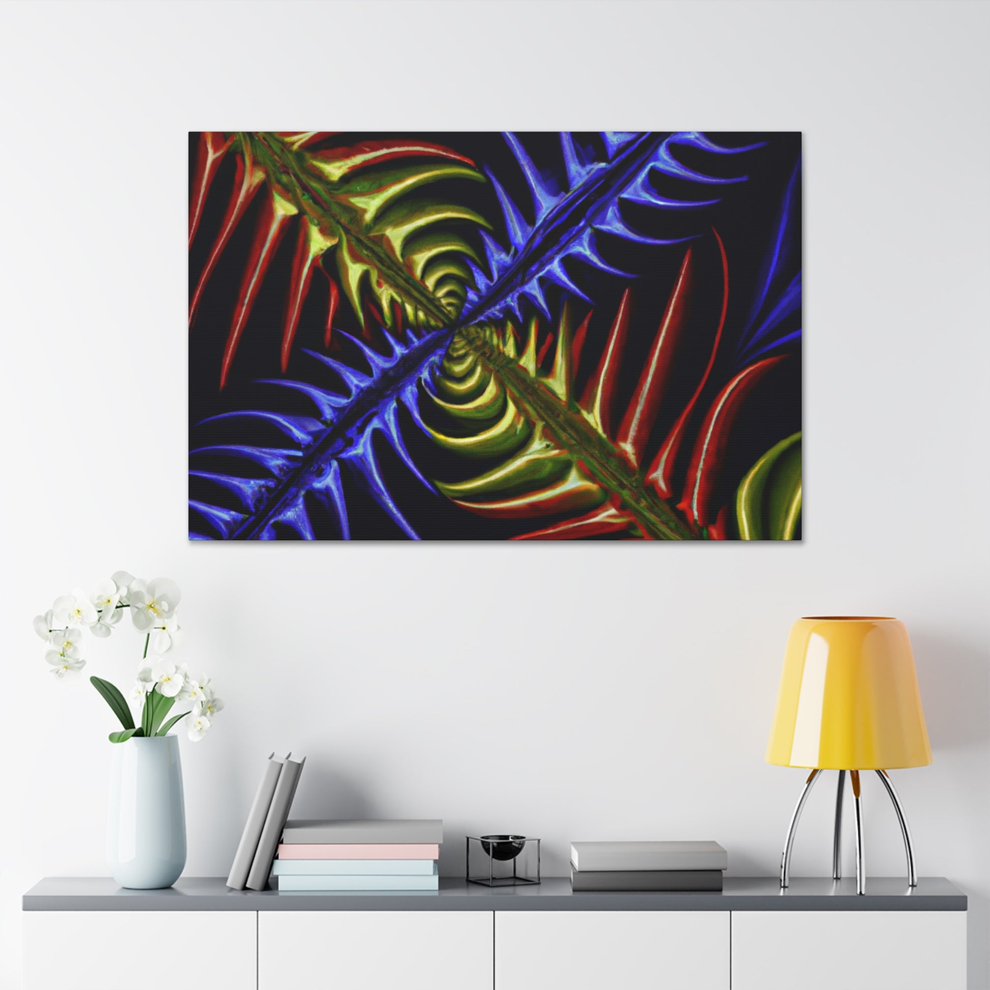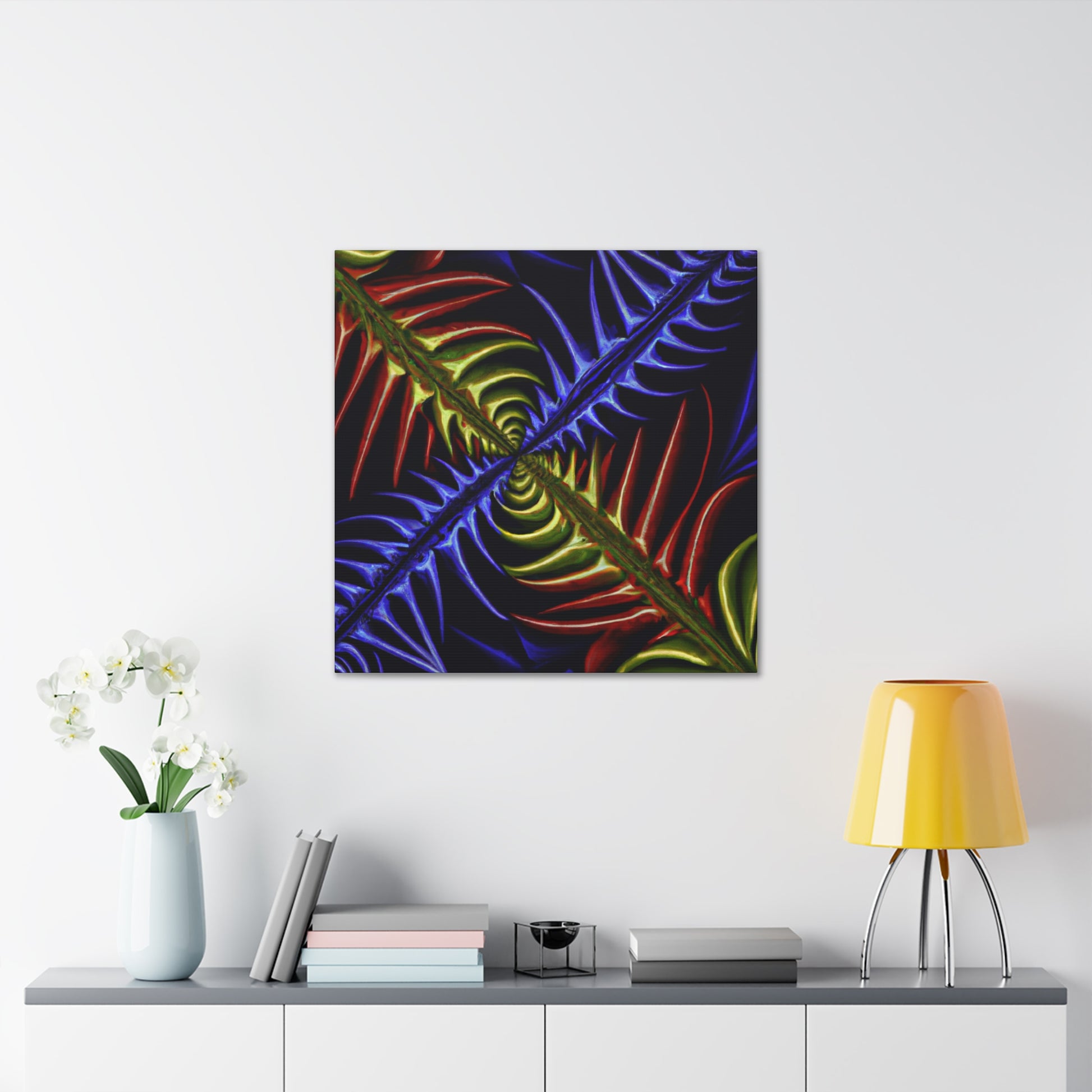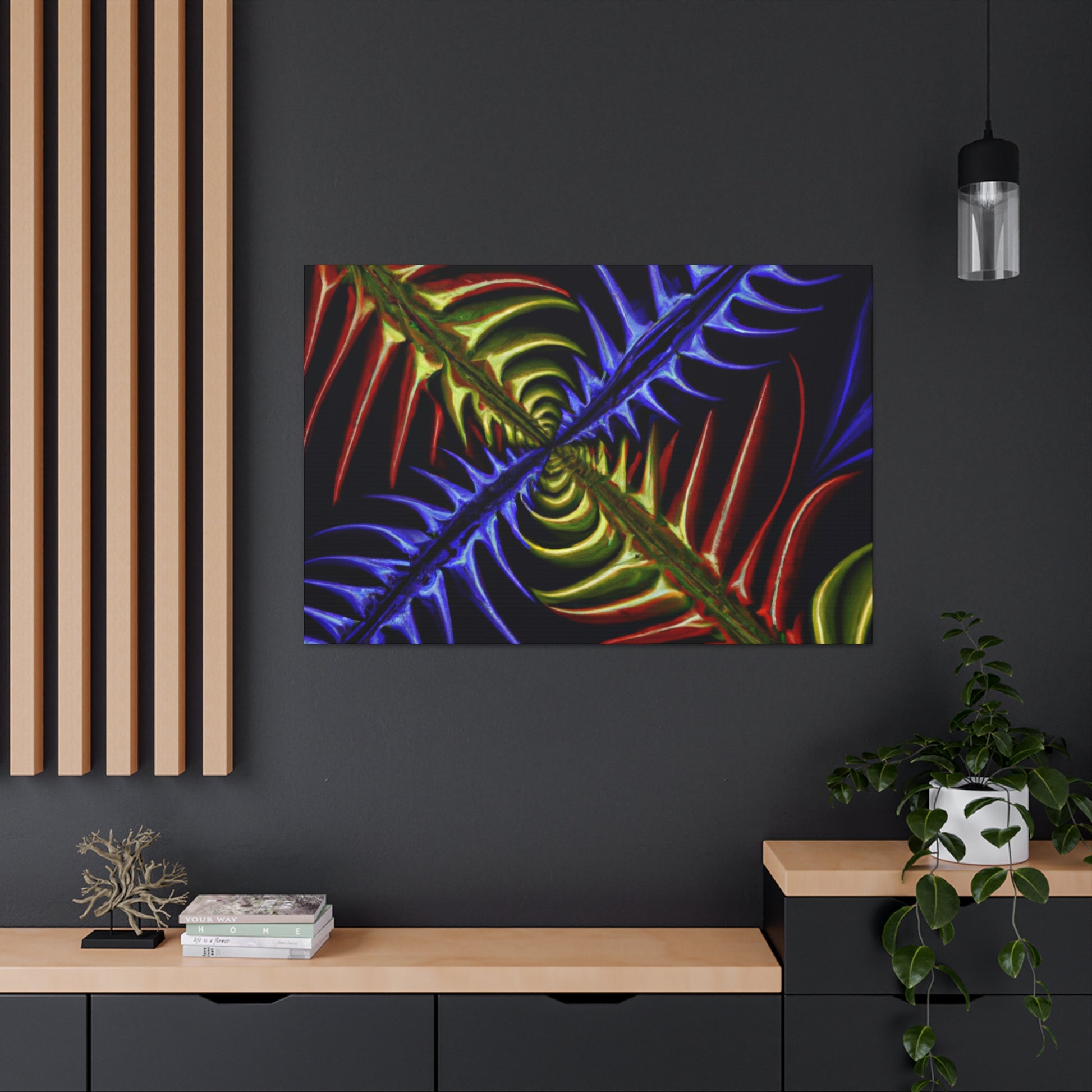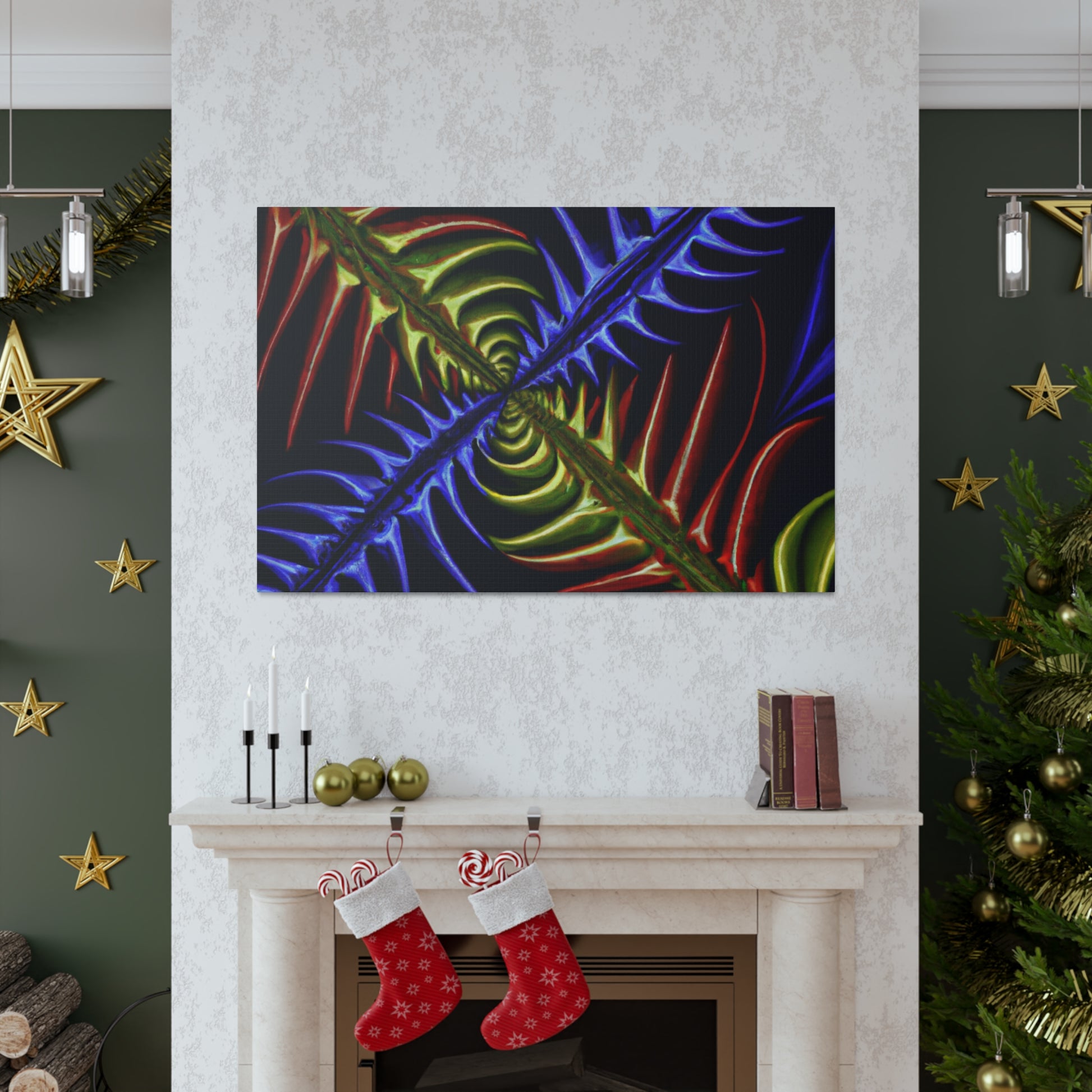 This canvas features a unique combination of trippy geometric palm leaves, kaleidoscope, abstract, and digital art elements, set to vibrant colors and 3D lines. The fractal design gives a stunning visual as it draws the eye. This piece adds a splash of color to any space and will bring a sense of creativity and imagination to your home. #abstractart #palmleaves #kaleidoscope #digitalart #vibrantcolors #3Dlines #fractal #canvasart #canvas #trippygeometric #allemandart
