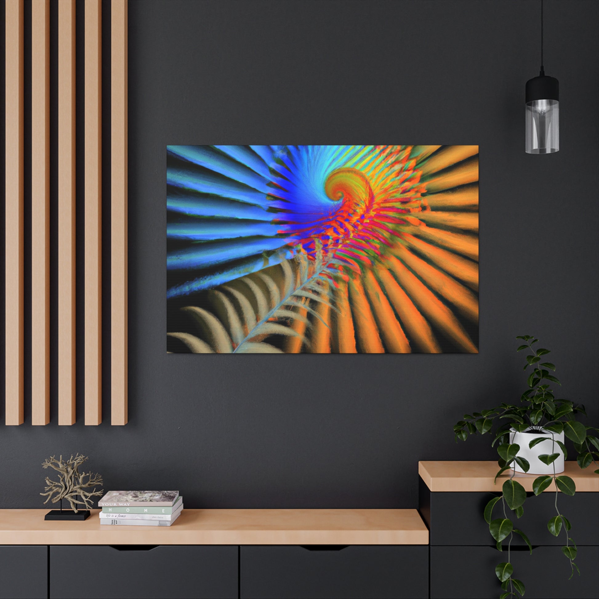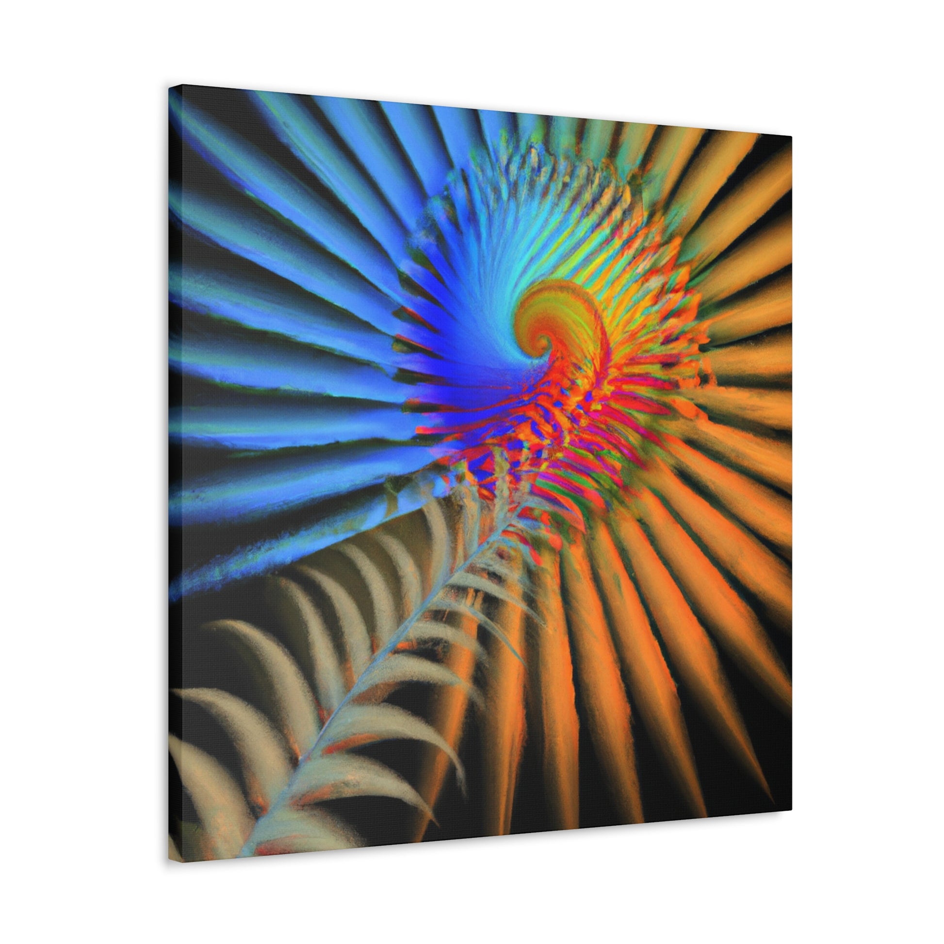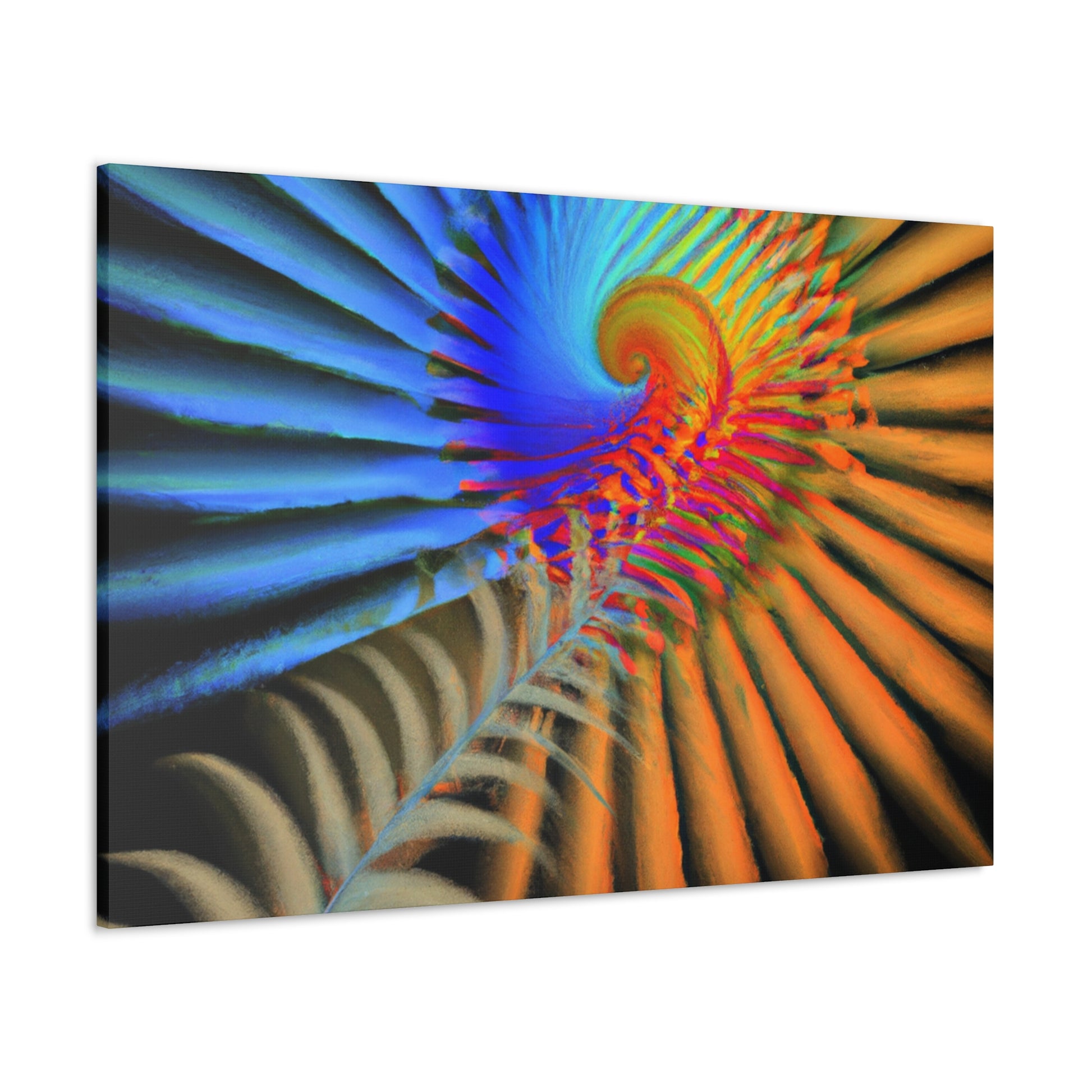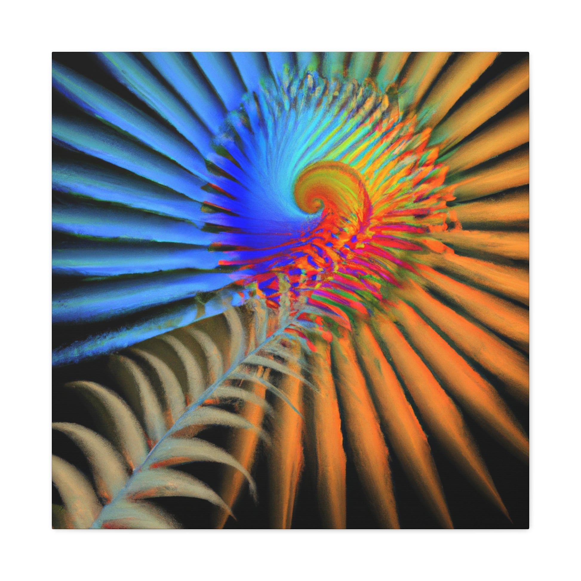 This vibrantly colored digital art canvas features mesmerizing geometrical palm leaves, kaleidoscopic 3D lines, and a dazzling fractal and abstract motif. Perfect for spaces needing a touch of color and energy, these vivid shapes give any room a perfectly balanced modern aesthetic. #digitalart #canvas #abstract #kaleidoscope #fractal #design #art #vibrant #psychedelic #3Dlines #geometric