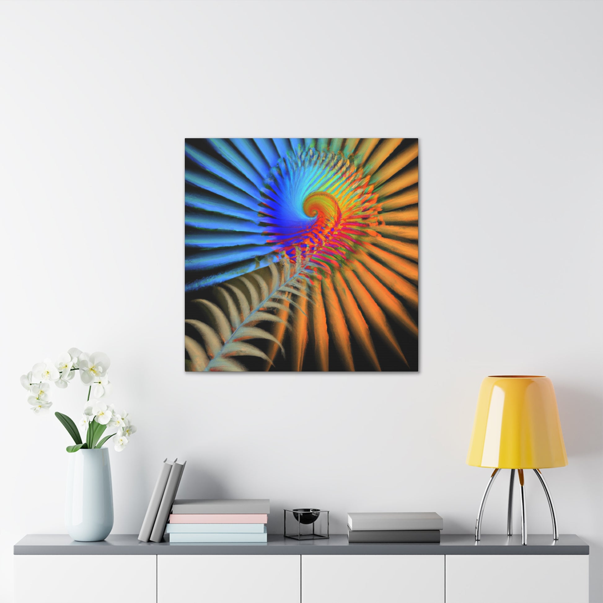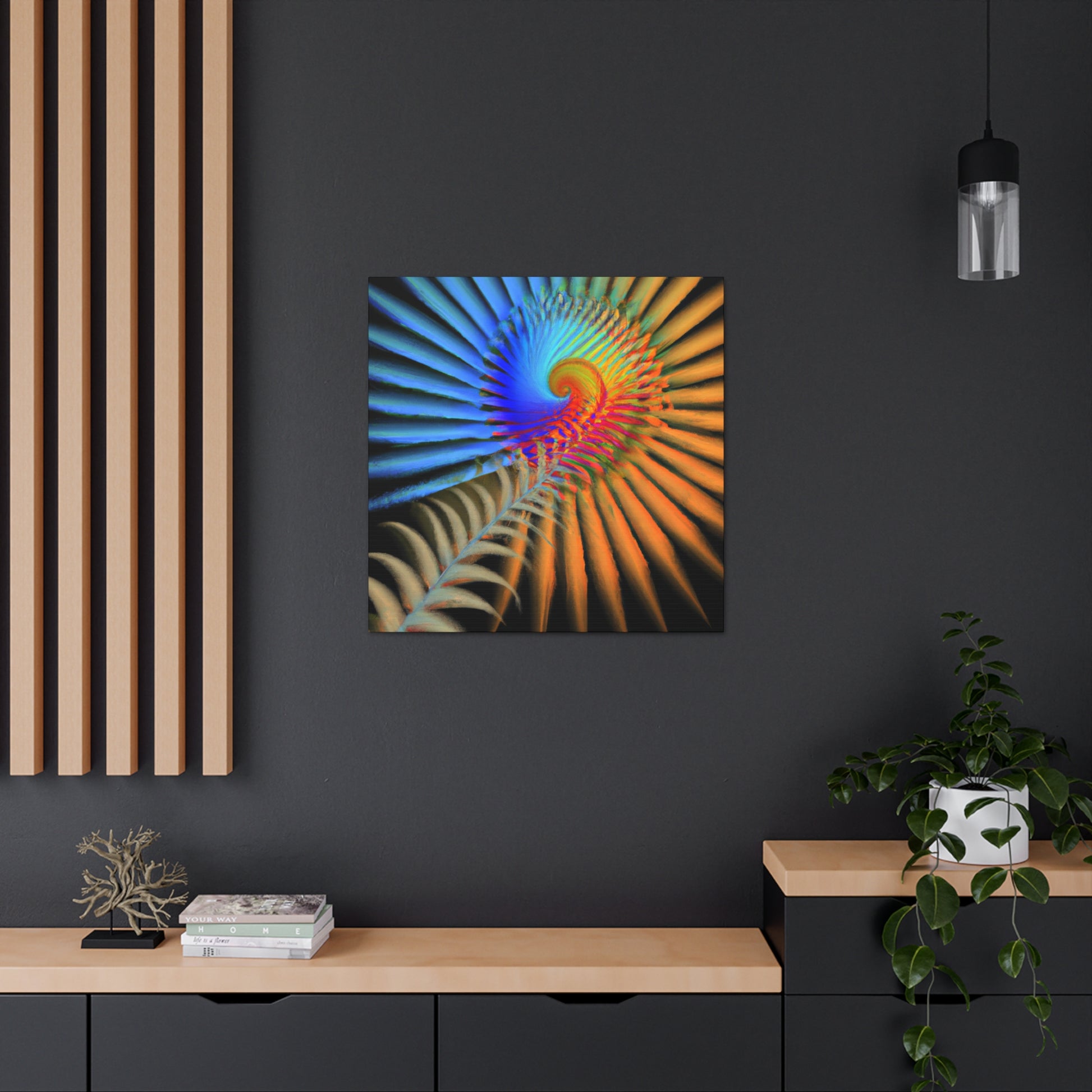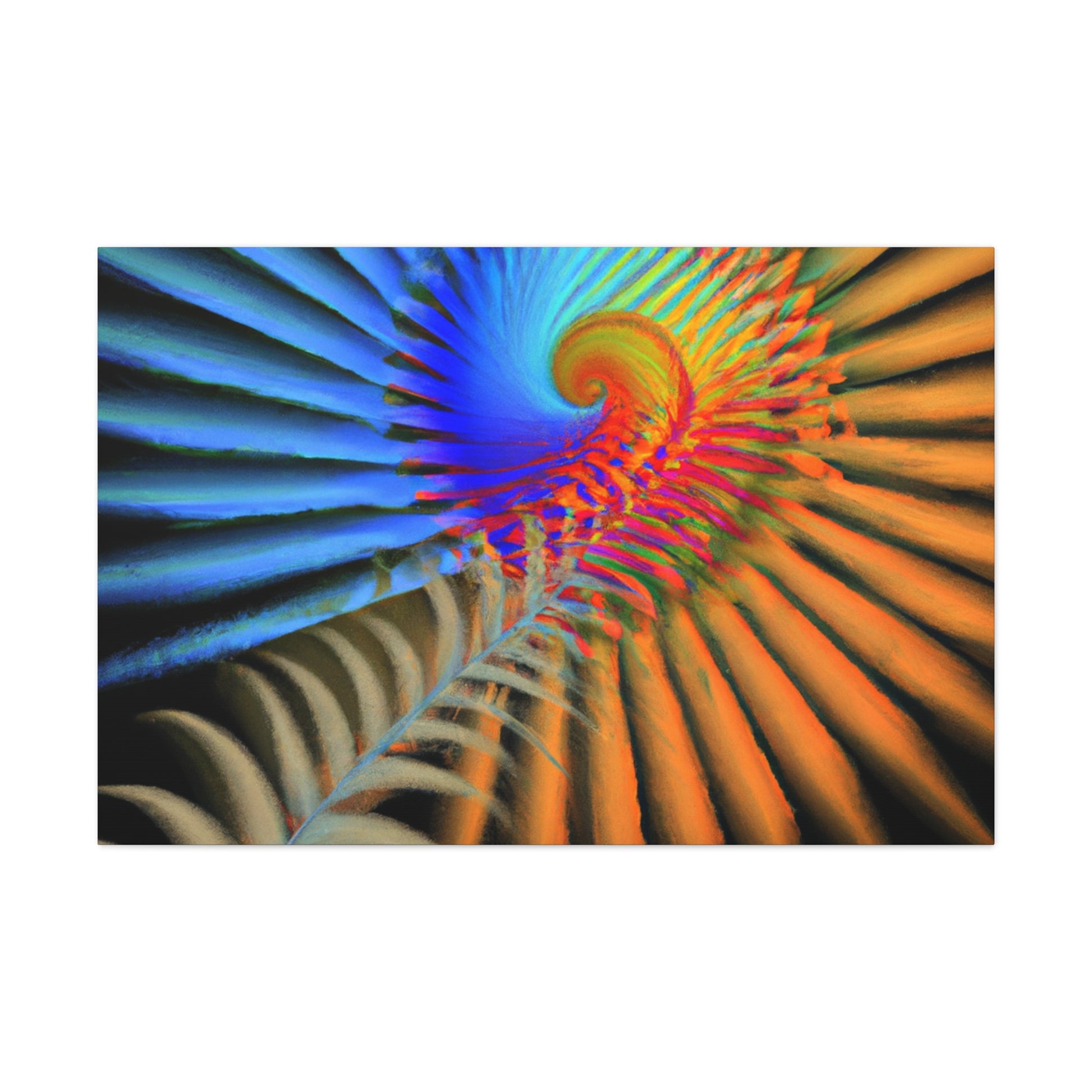 This vibrantly colored digital art canvas features mesmerizing geometrical palm leaves, kaleidoscopic 3D lines, and a dazzling fractal and abstract motif. Perfect for spaces needing a touch of color and energy, these vivid shapes give any room a perfectly balanced modern aesthetic. #digitalart #canvas #abstract #kaleidoscope #fractal #design #art #vibrant #psychedelic #3Dlines #geometric