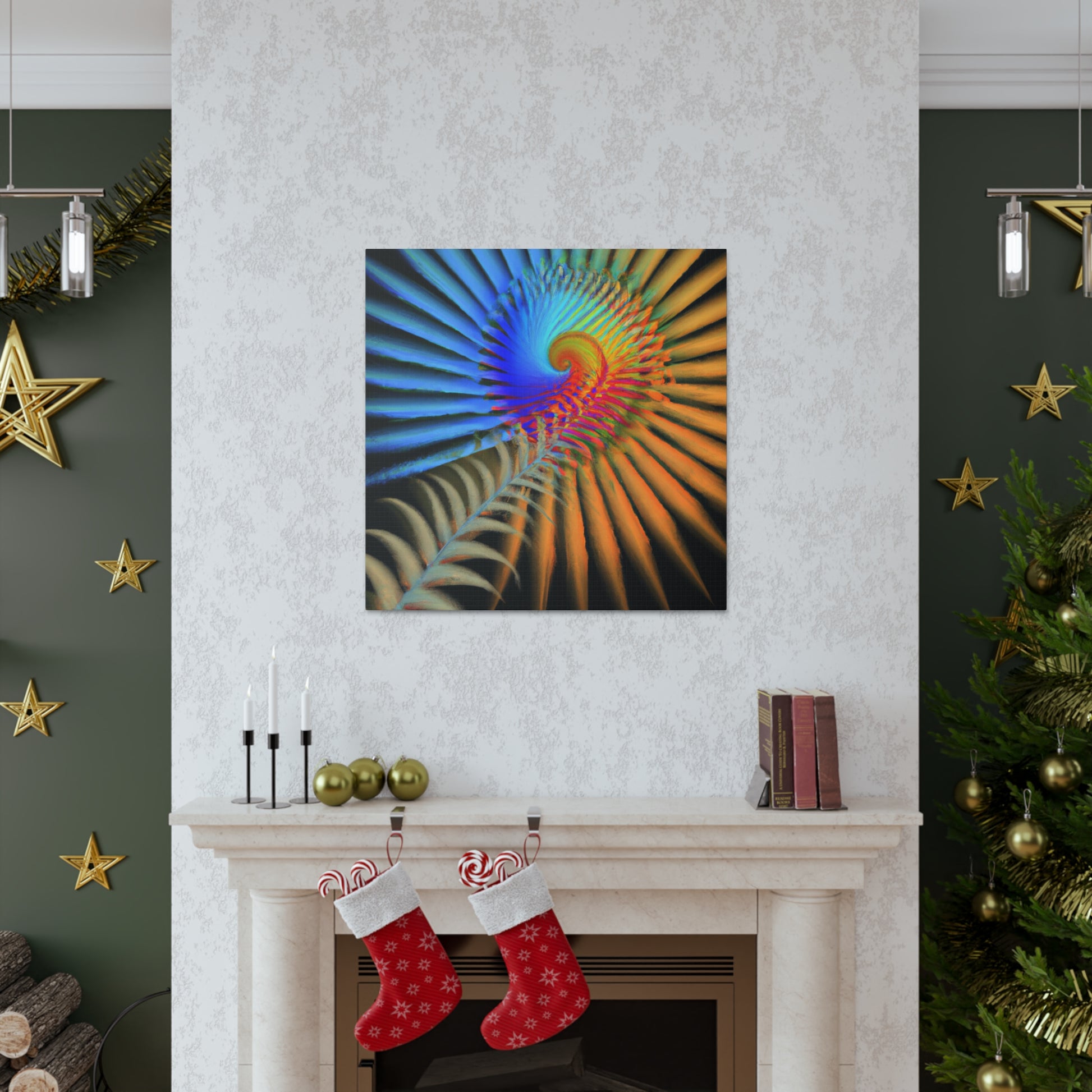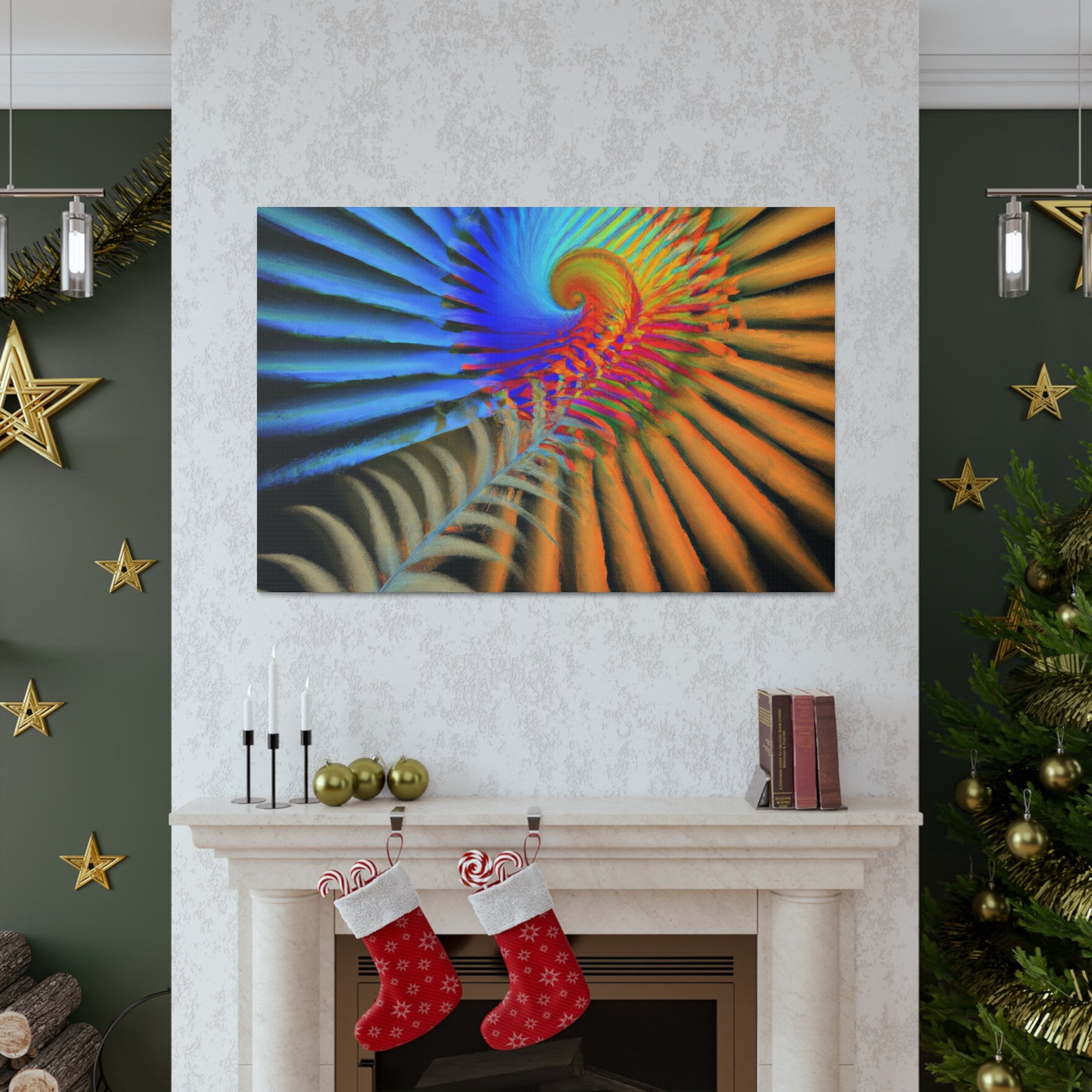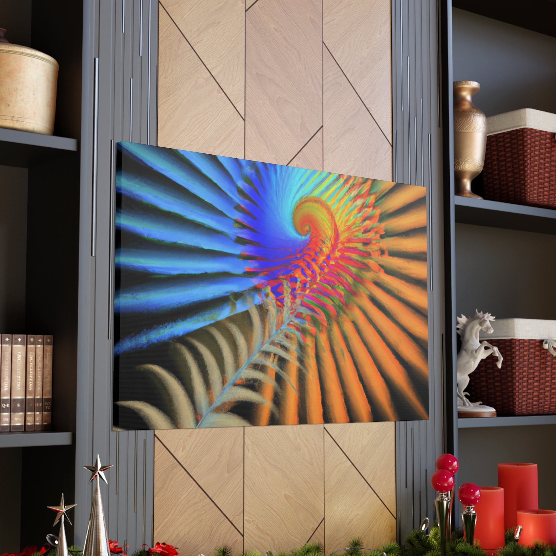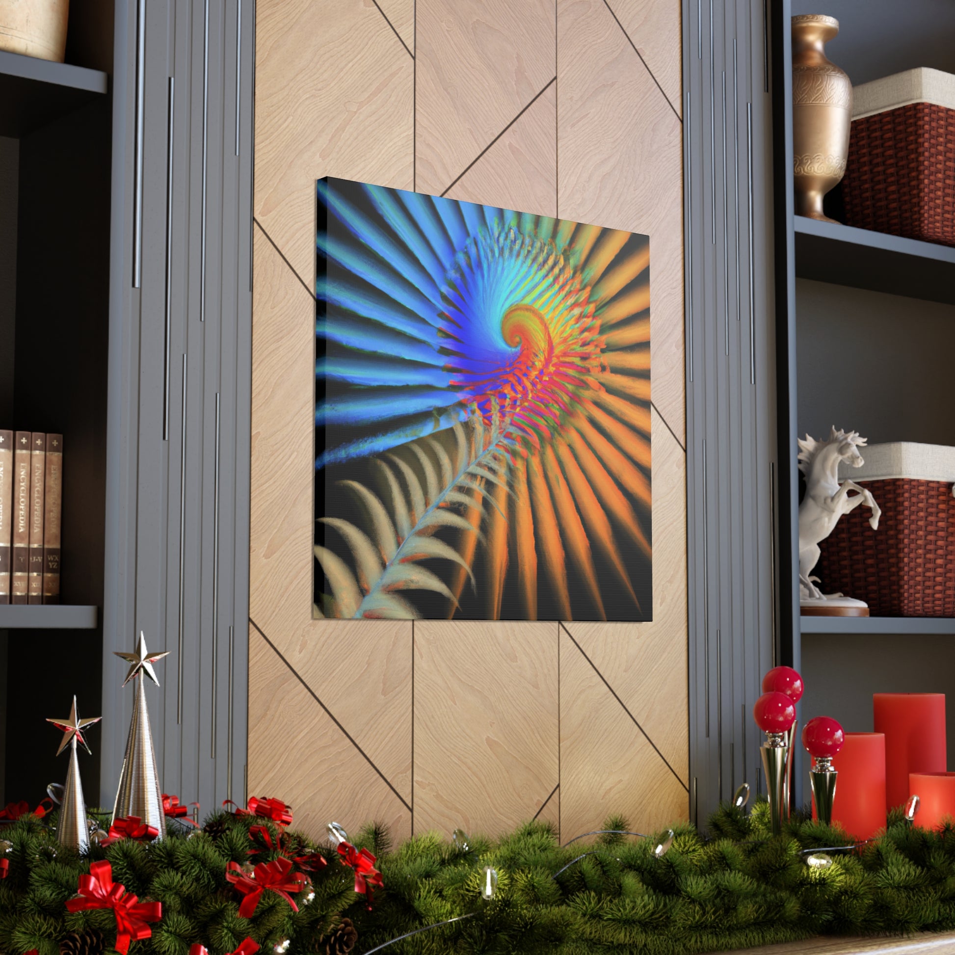 This vibrantly colored digital art canvas features mesmerizing geometrical palm leaves, kaleidoscopic 3D lines, and a dazzling fractal and abstract motif. Perfect for spaces needing a touch of color and energy, these vivid shapes give any room a perfectly balanced modern aesthetic. #digitalart #canvas #abstract #kaleidoscope #fractal #design #art #vibrant #psychedelic #3Dlines #geometric
