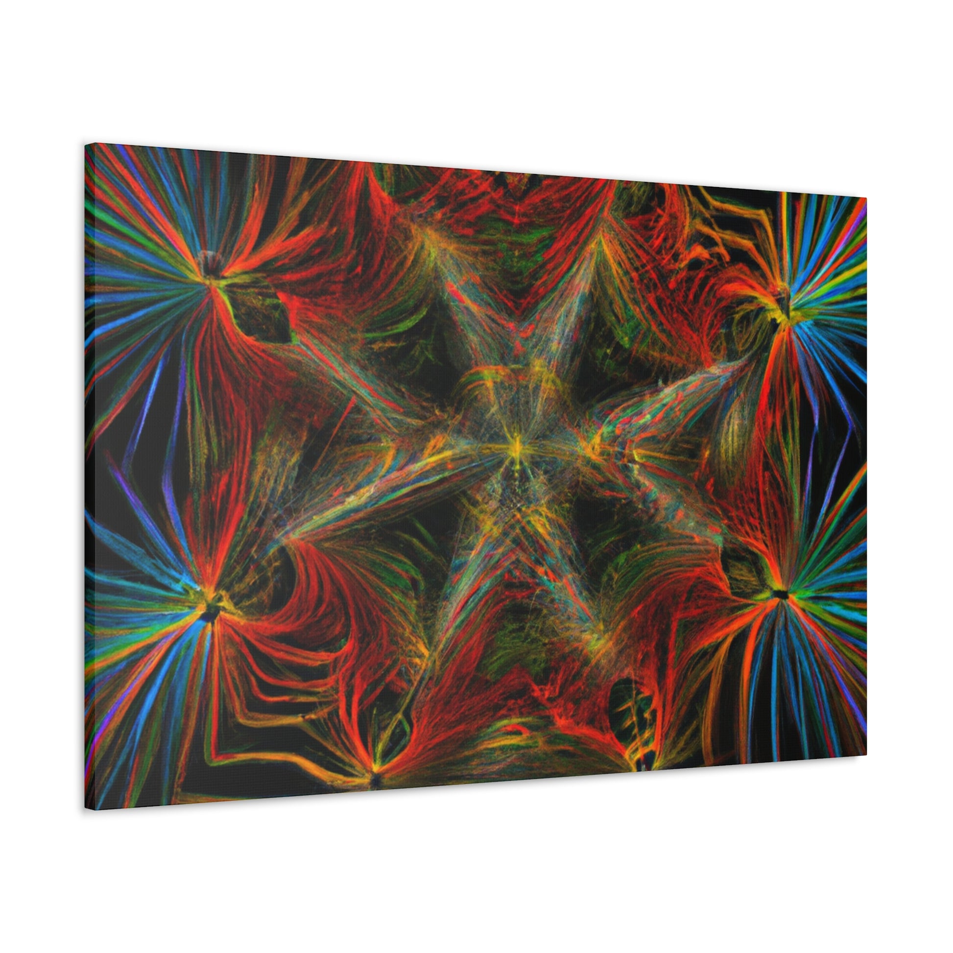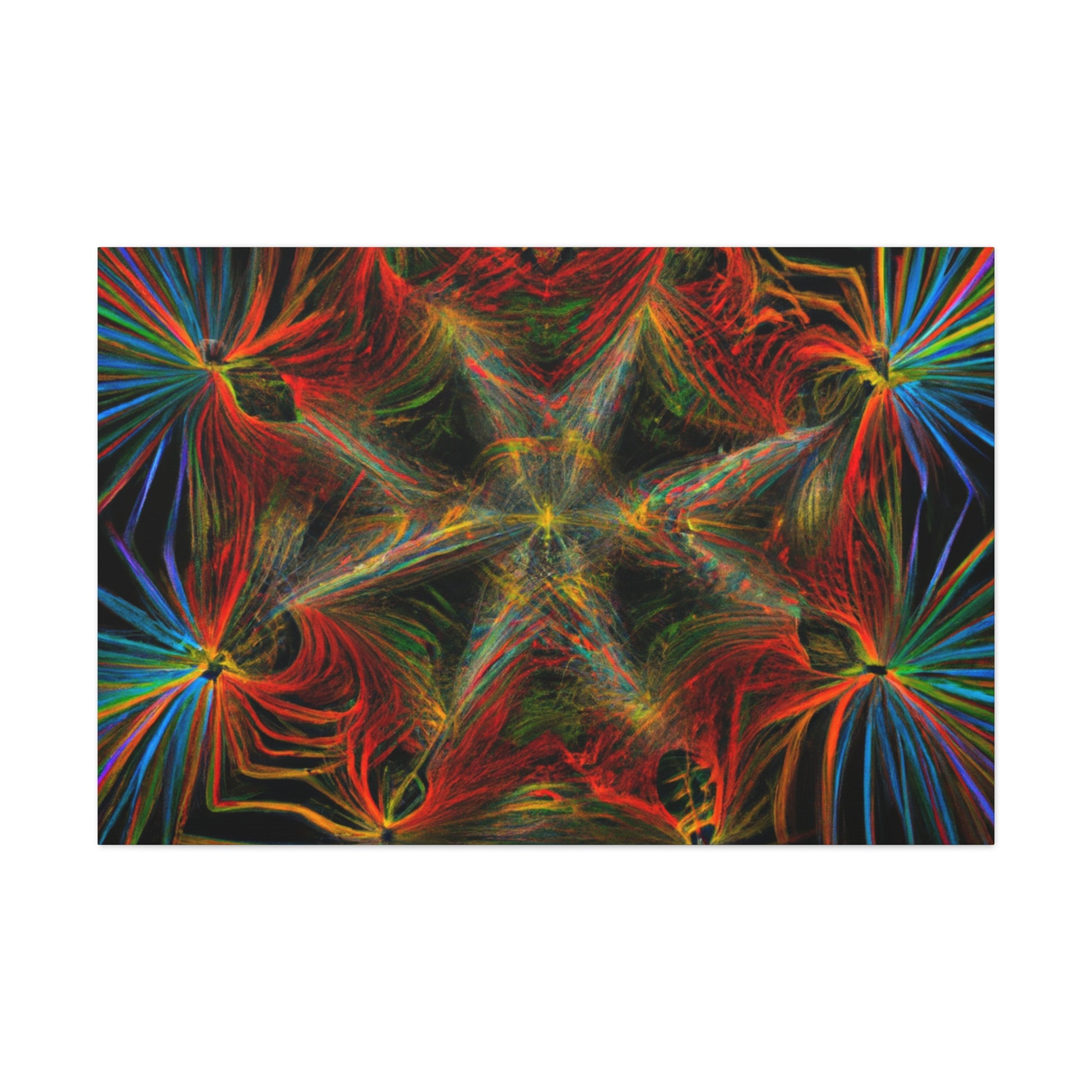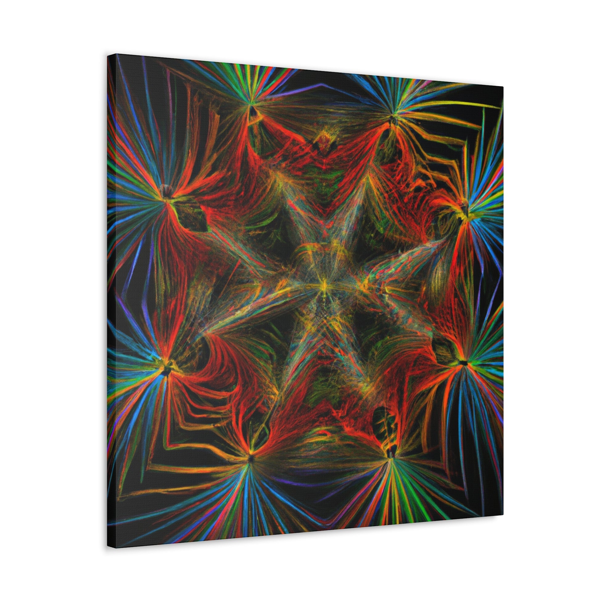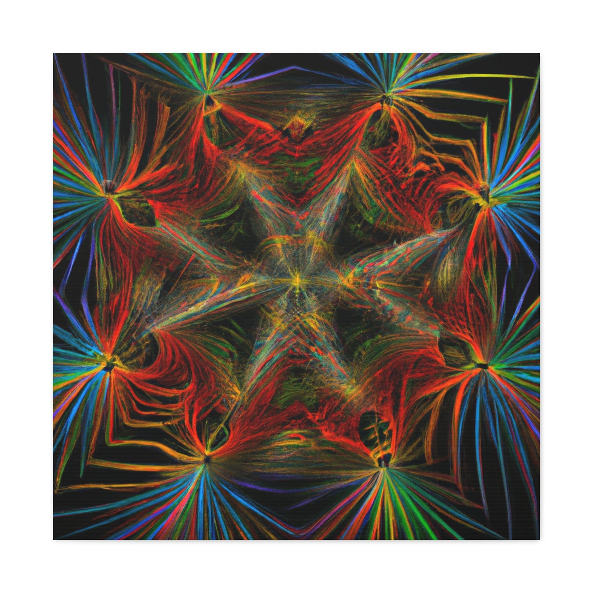 This canvas features abstract, digital art with vibrant colors, 3D lines, fractal and trippy geometric palm leaves. Explore the unique kaleidoscope of colors, patterns and shapes. Get lost in the mesmerizing fractal and the endless, ever changing details. Furthermore, the colors and shapes create a stunning contrast and bring a modern, yet natural, feel to any space. #Geometric #Abstract #DigitalArt #Fractal #PalmLeaves #Kaleidoscope #VibrantColors #3DLines #Trippy #Canvas #Modern
