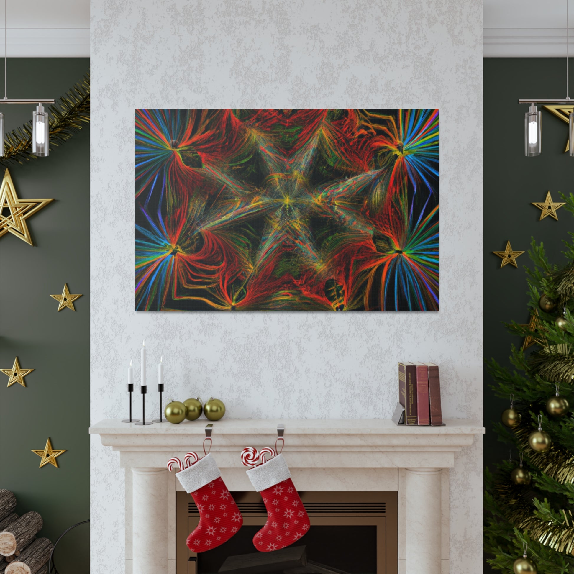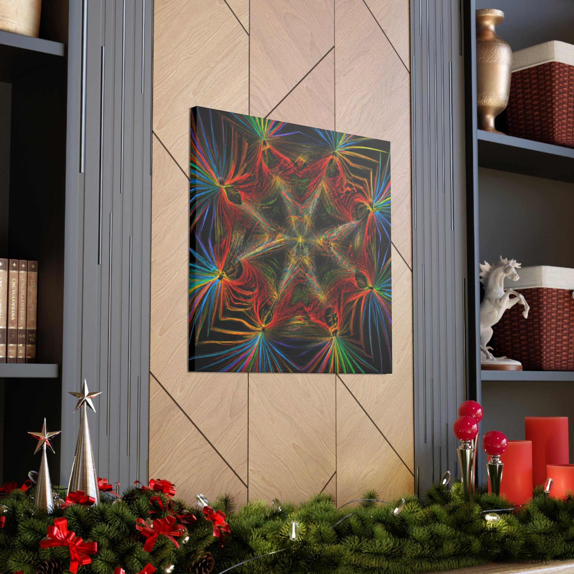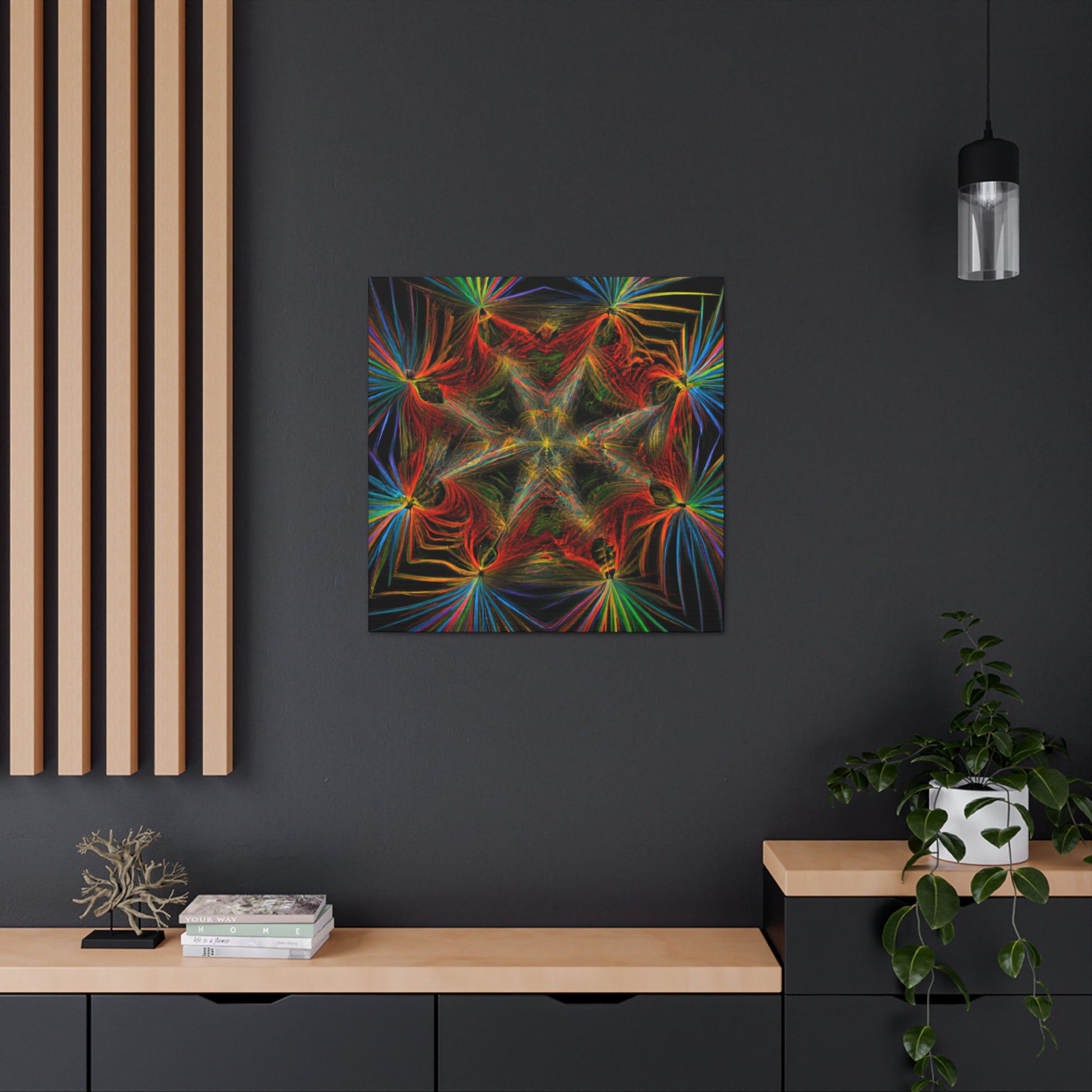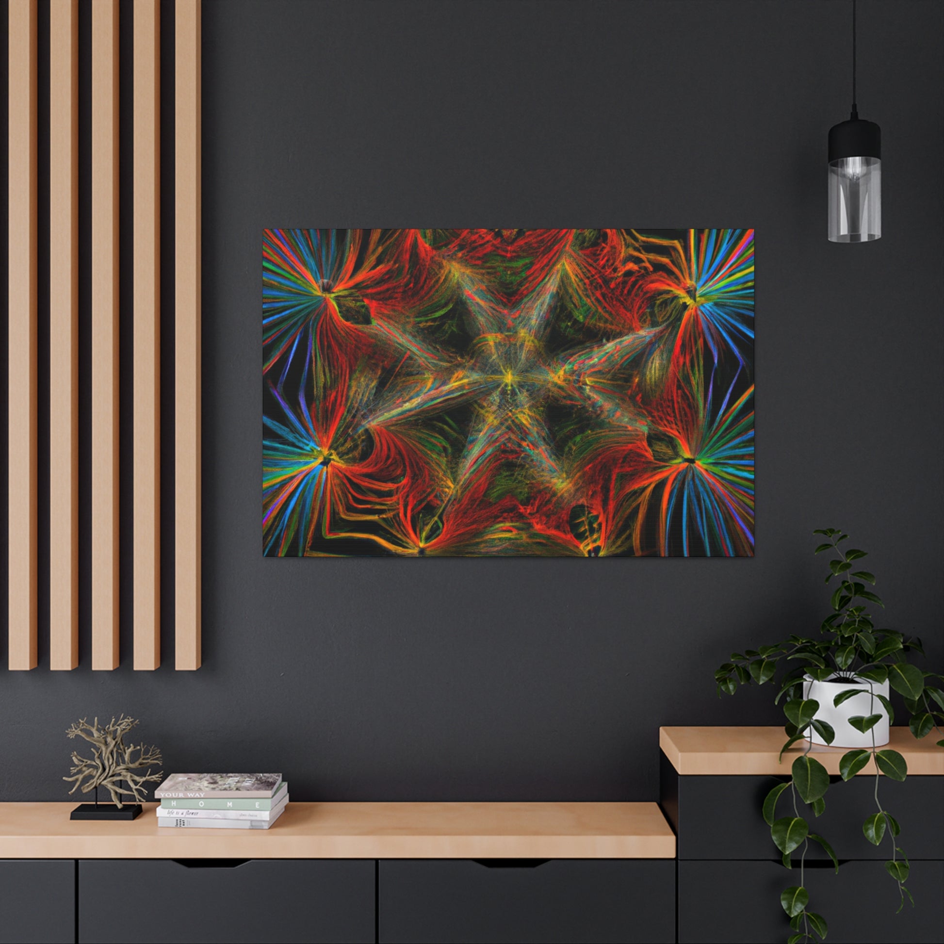 This canvas features abstract, digital art with vibrant colors, 3D lines, fractal and trippy geometric palm leaves. Explore the unique kaleidoscope of colors, patterns and shapes. Get lost in the mesmerizing fractal and the endless, ever changing details. Furthermore, the colors and shapes create a stunning contrast and bring a modern, yet natural, feel to any space. #Geometric #Abstract #DigitalArt #Fractal #PalmLeaves #Kaleidoscope #VibrantColors #3DLines #Trippy #Canvas #Modern