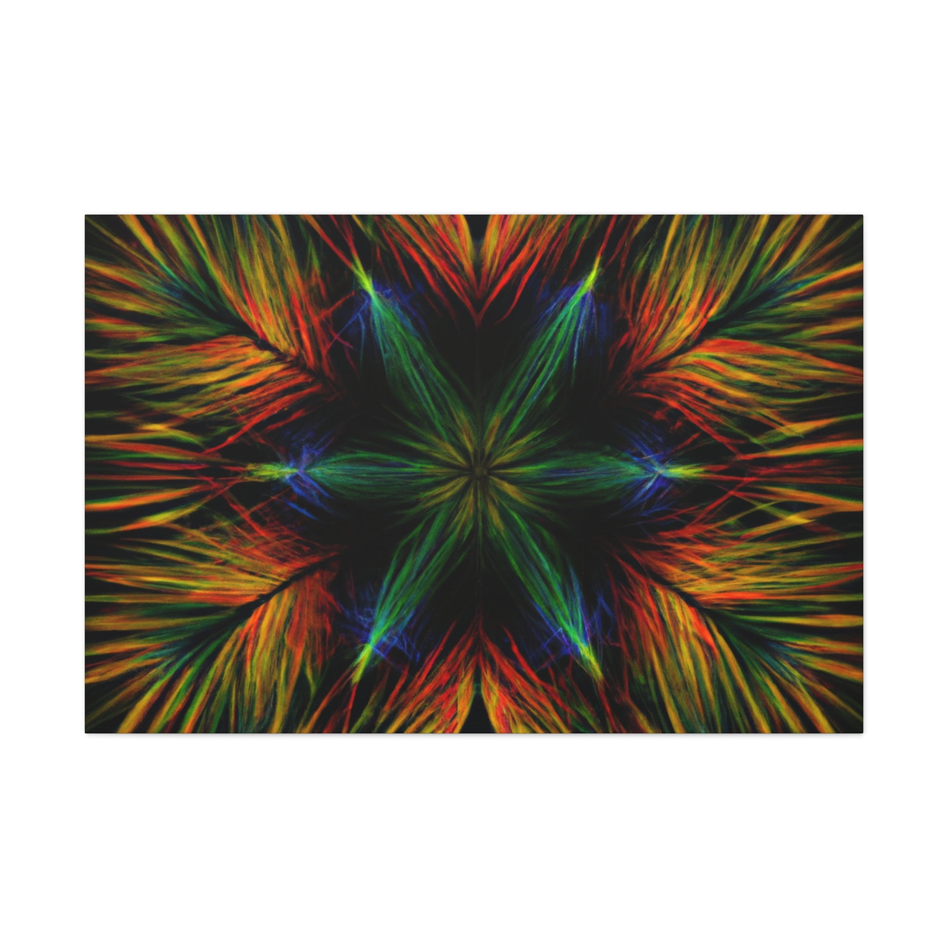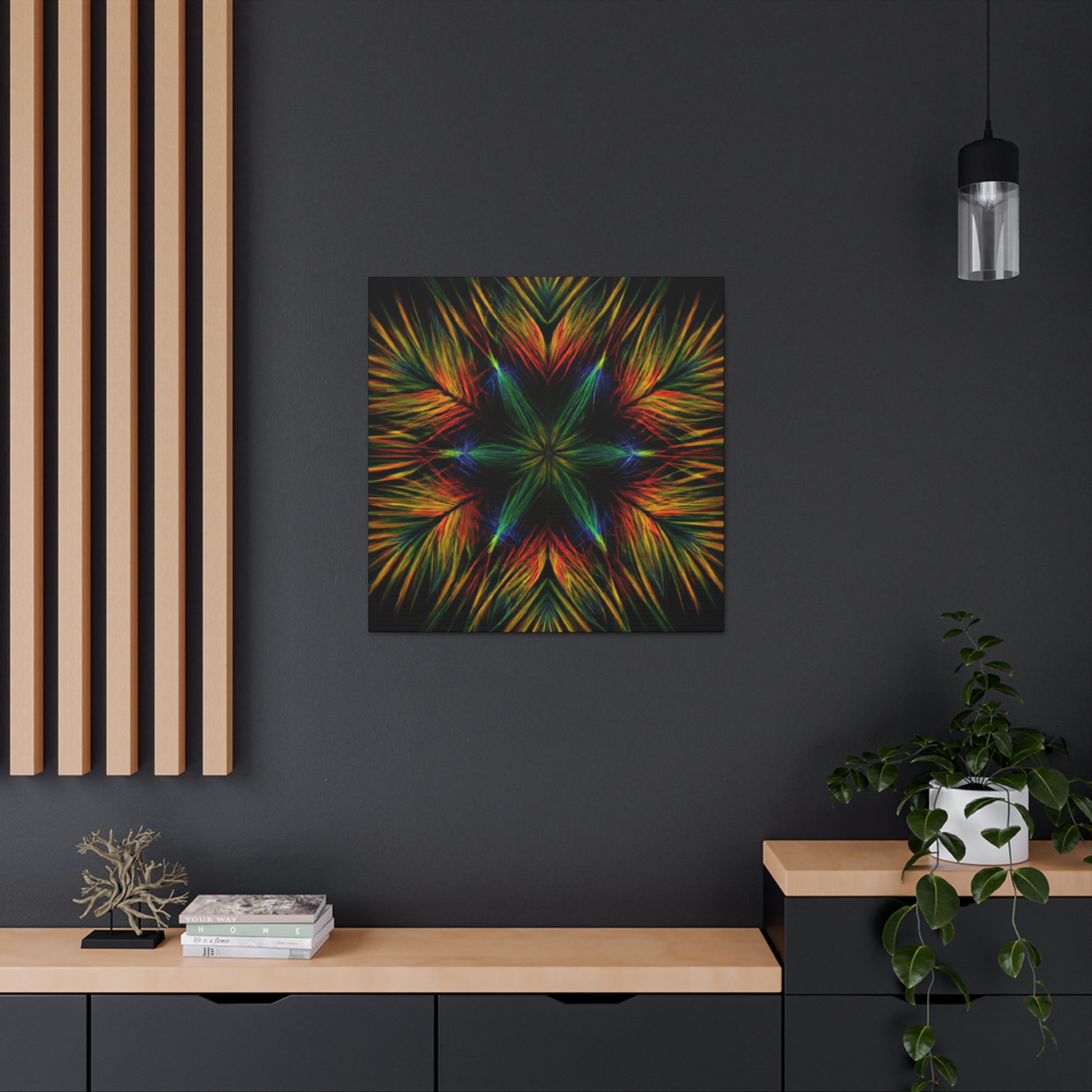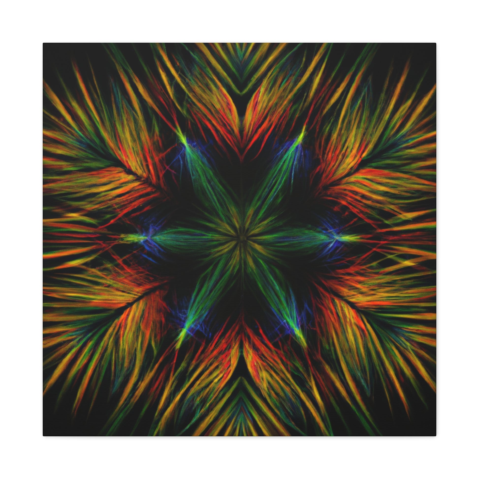 This canvas features a stunning psychedelic design of geometric palm leaves, 3D lines and geometric shapes creating a kaleidoscope of vibrant colors. Abstract art, digital art and fractal elements come together to deliver an amazing visual experience in any space. With its remarkable blend of colors and mesmerizing shapes, this canvas will create an inspirational atmosphere. #digitalart #abstractart #fractals #canvasart #kaleidoscope #psychedelicart #geometricart #3dlines #vibrantcolors #trippyart #futuristicart