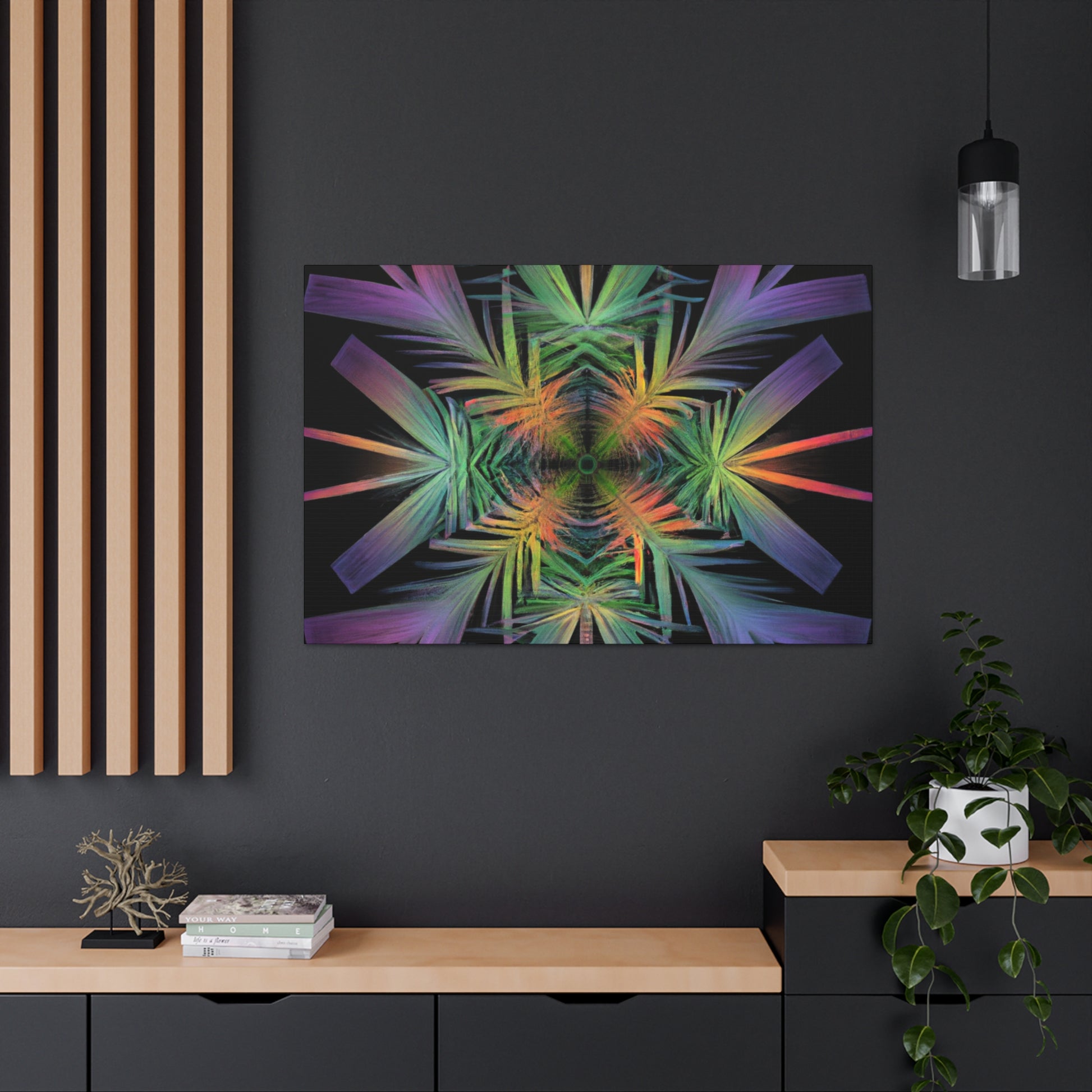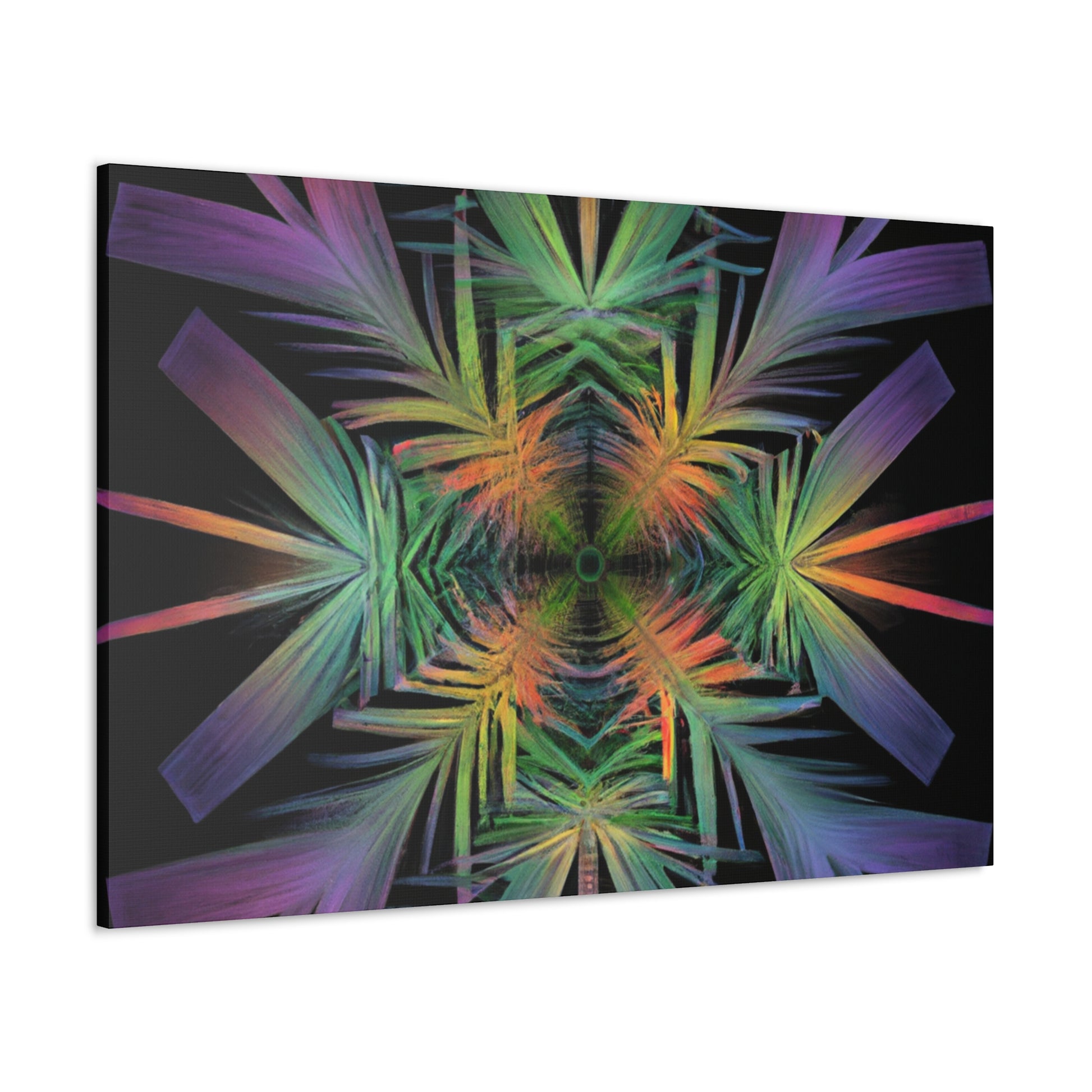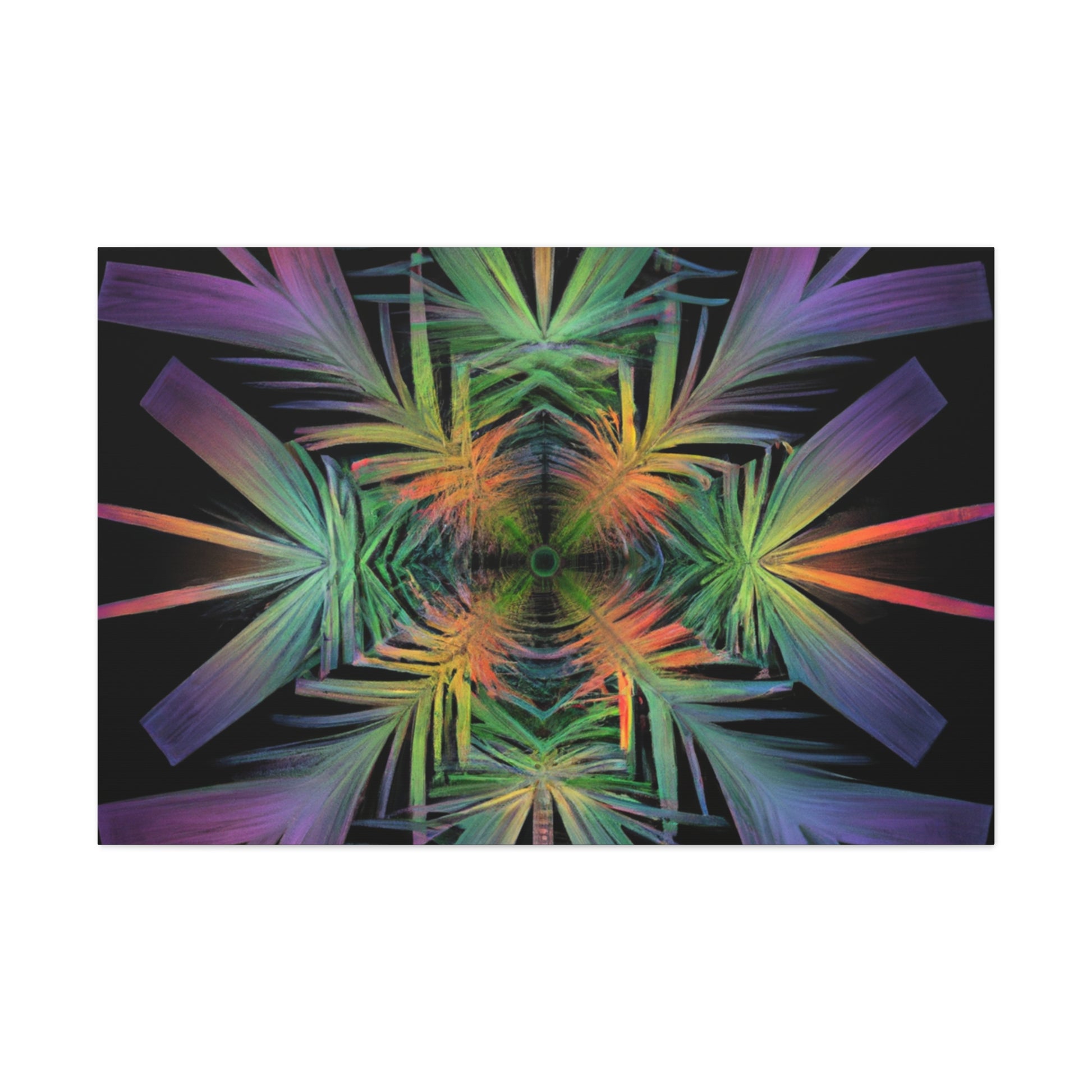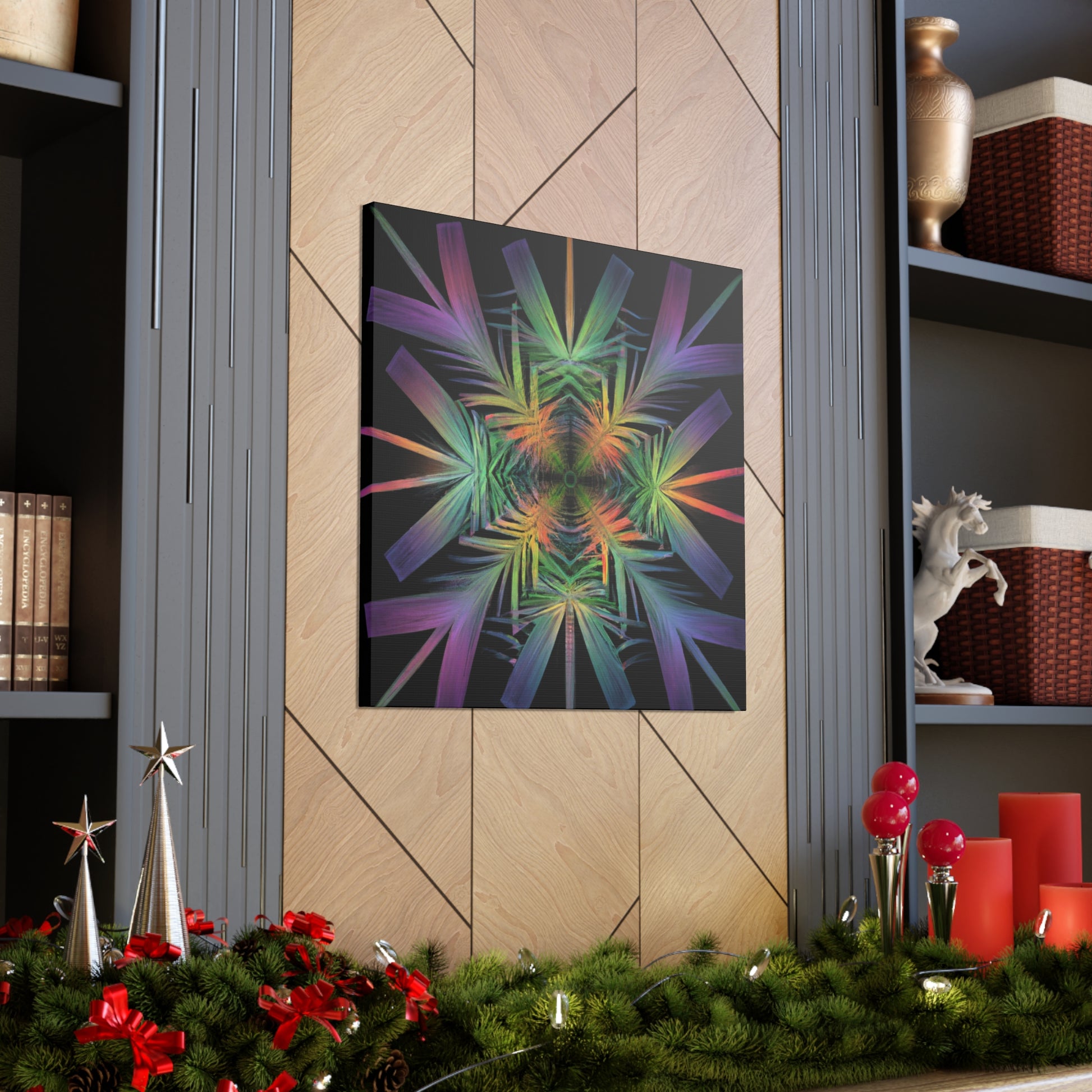 This canvas has it all - from bold, vibrant colors to an abstract, trippy, 3D style composition. It is decorated with a kaleidoscope of geometric palm leaves, digital art, and fractal lines. It is the perfect statement piece for any room and will bring positive energy to your home. #palmleaves #art #trippy #colors #geometric #kaleidoscope #3D #digitalart #fractal #vibrant #abstract