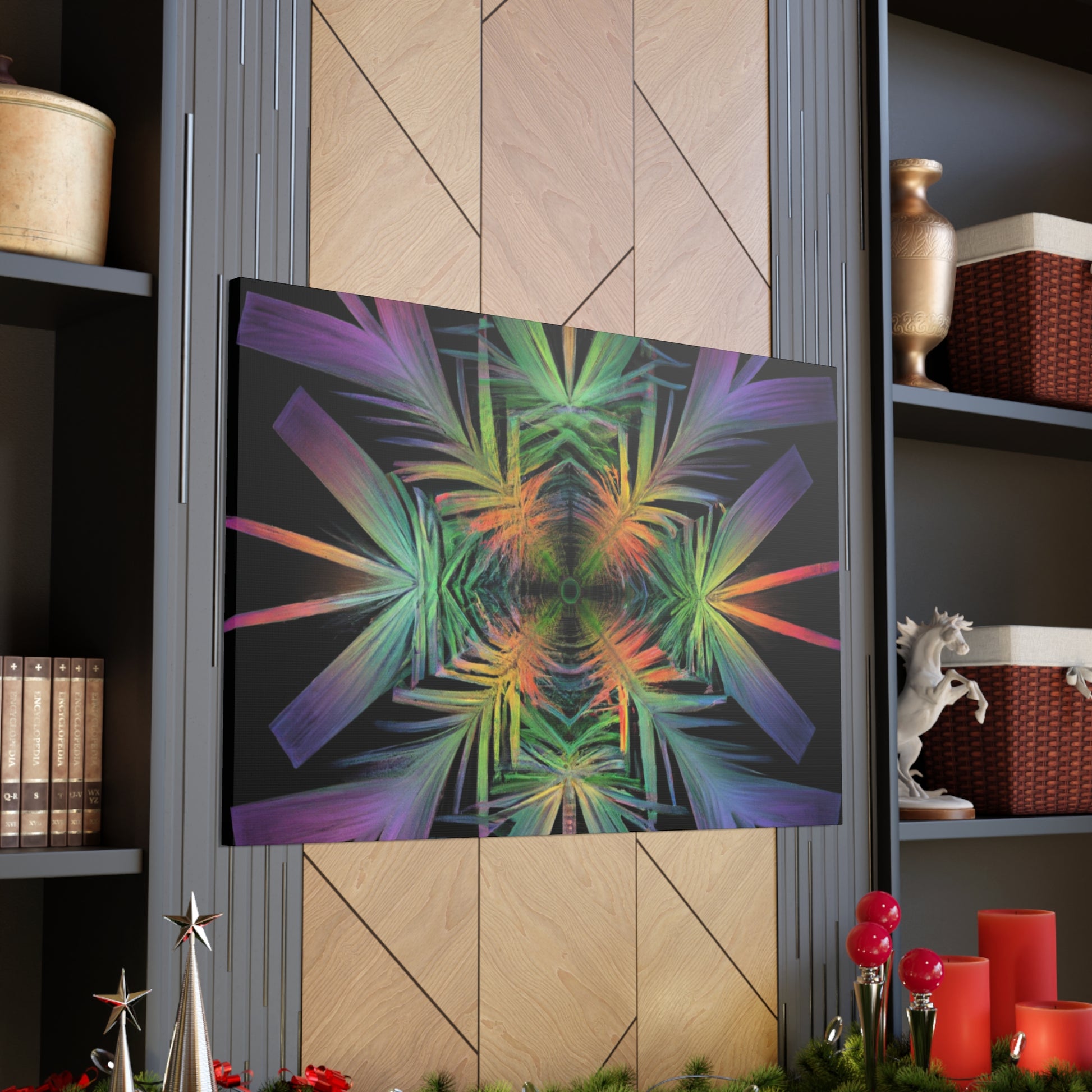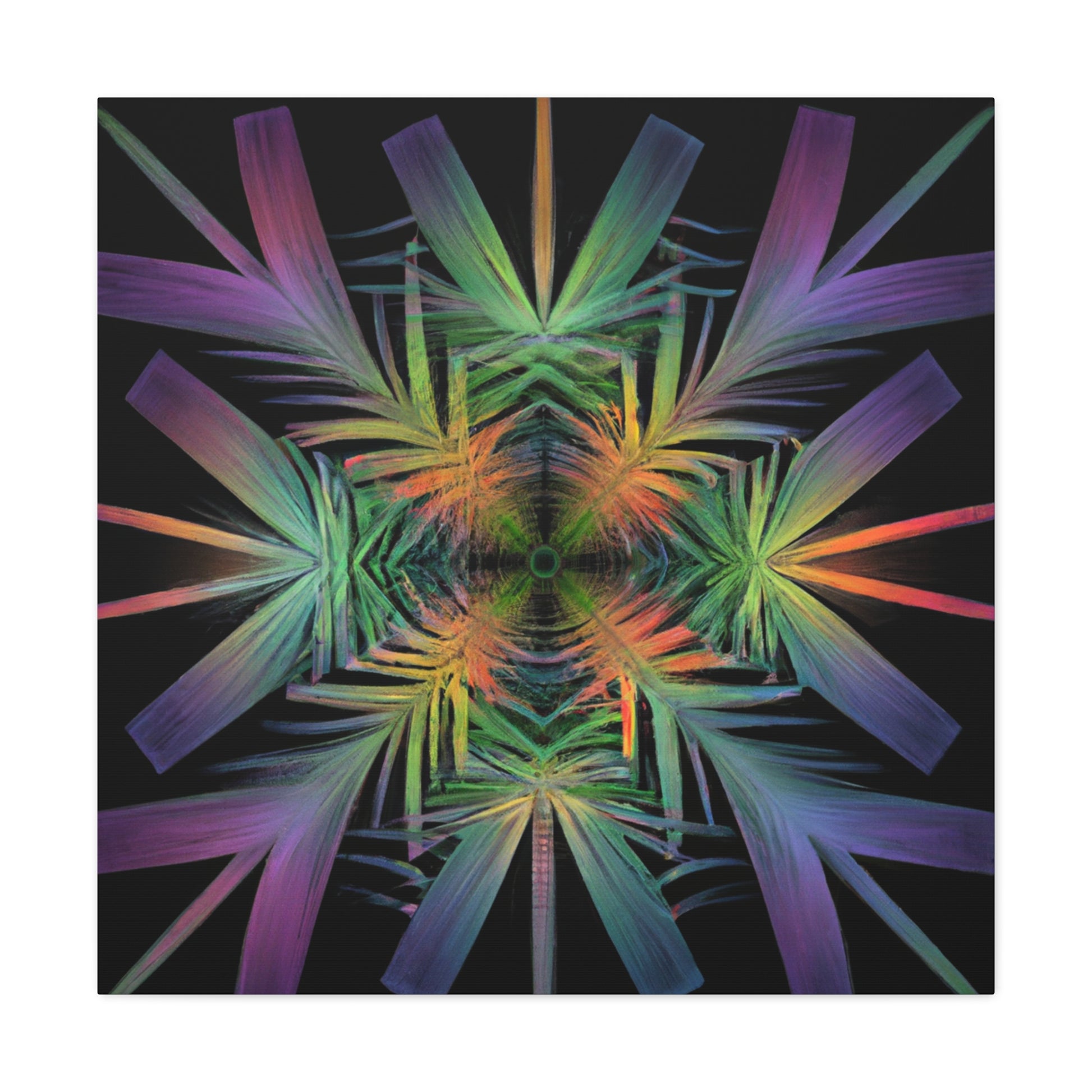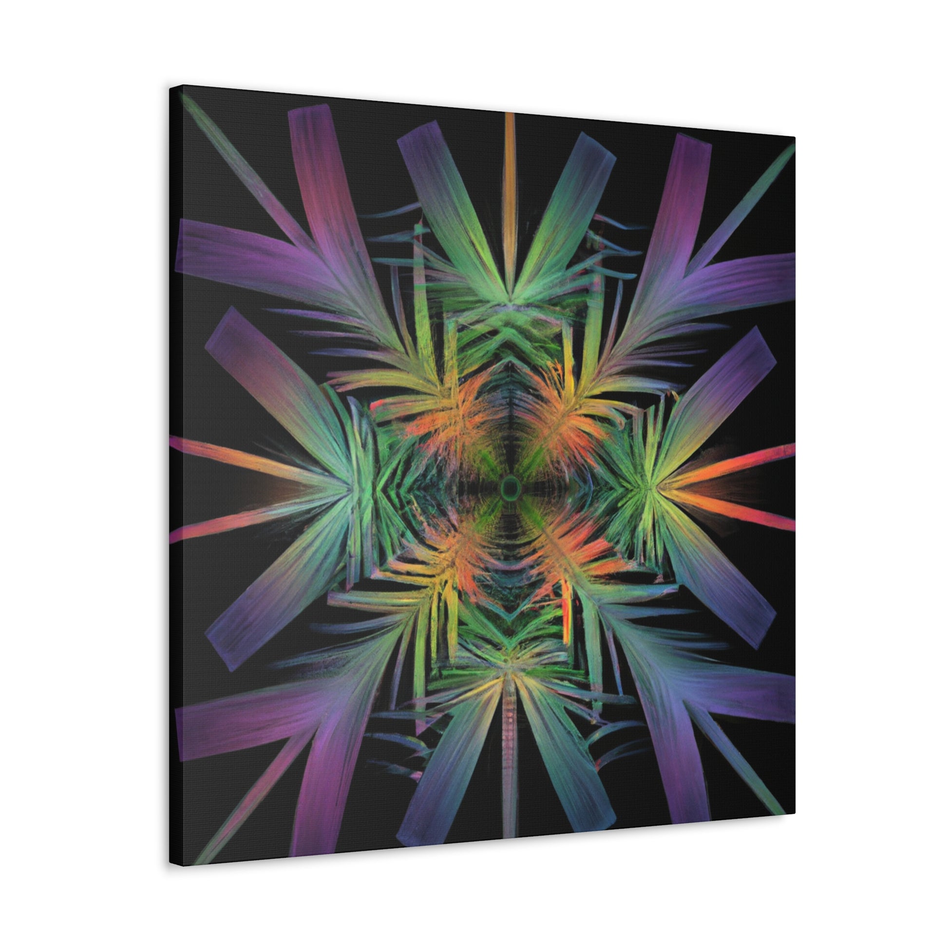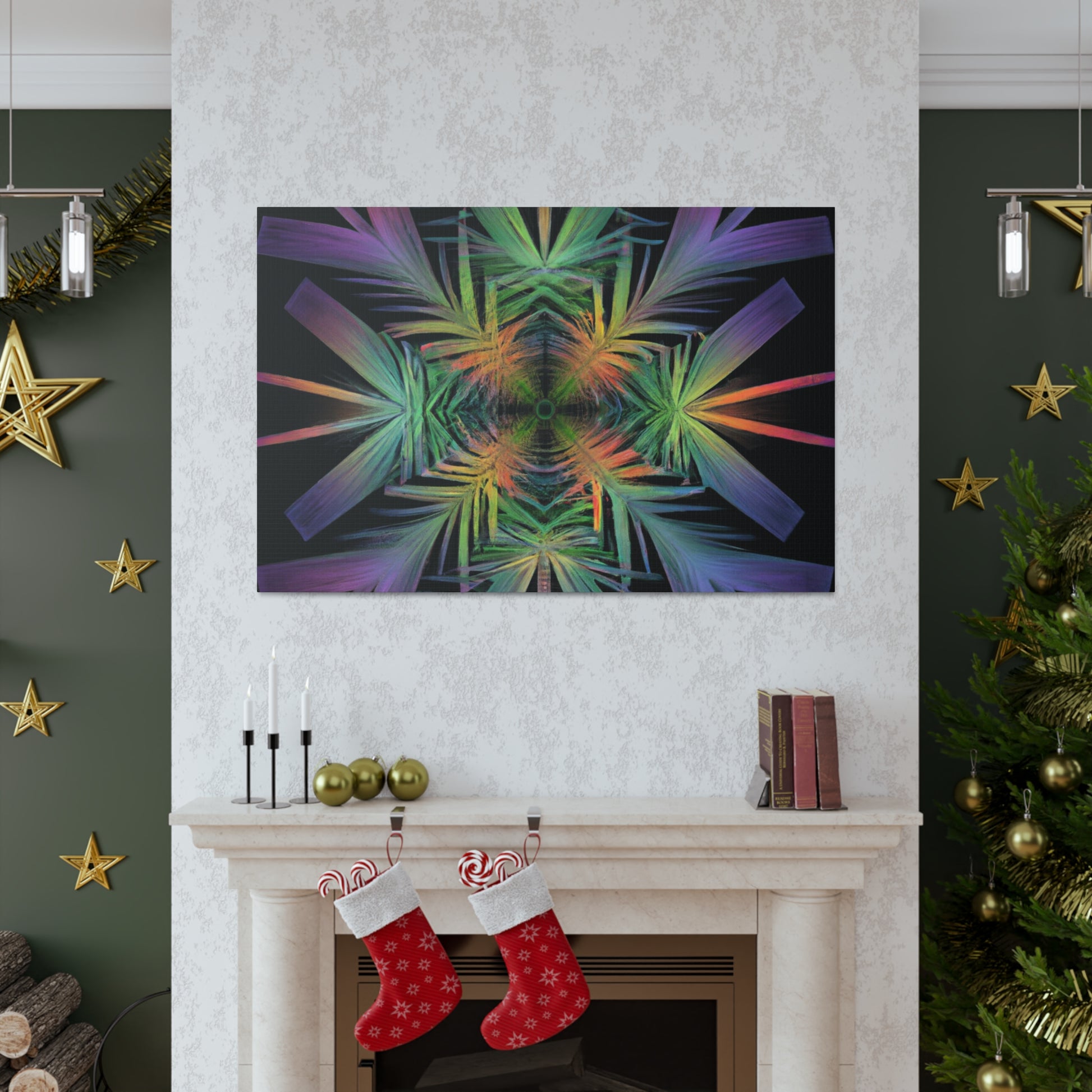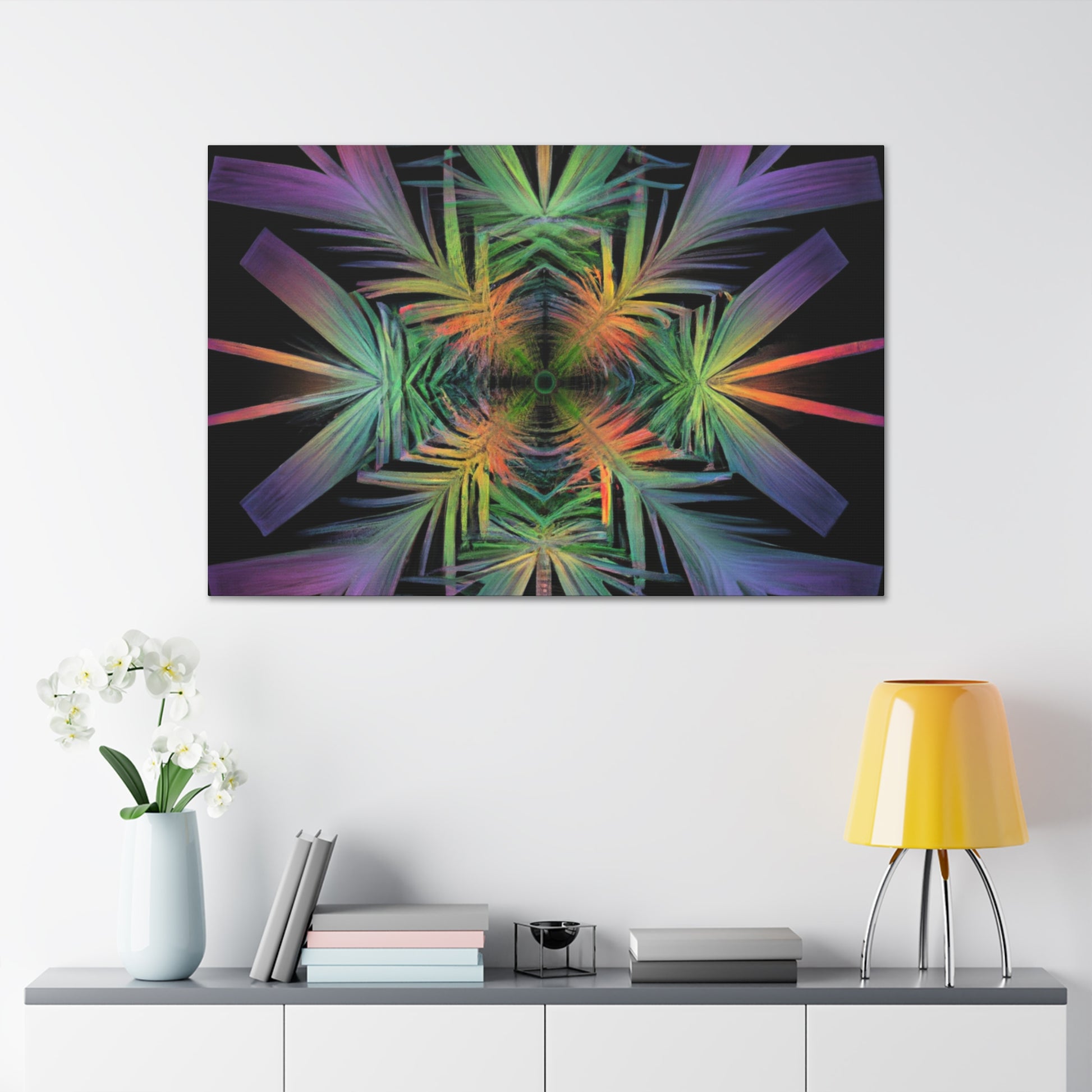 This canvas has it all - from bold, vibrant colors to an abstract, trippy, 3D style composition. It is decorated with a kaleidoscope of geometric palm leaves, digital art, and fractal lines. It is the perfect statement piece for any room and will bring positive energy to your home. #palmleaves #art #trippy #colors #geometric #kaleidoscope #3D #digitalart #fractal #vibrant #abstract