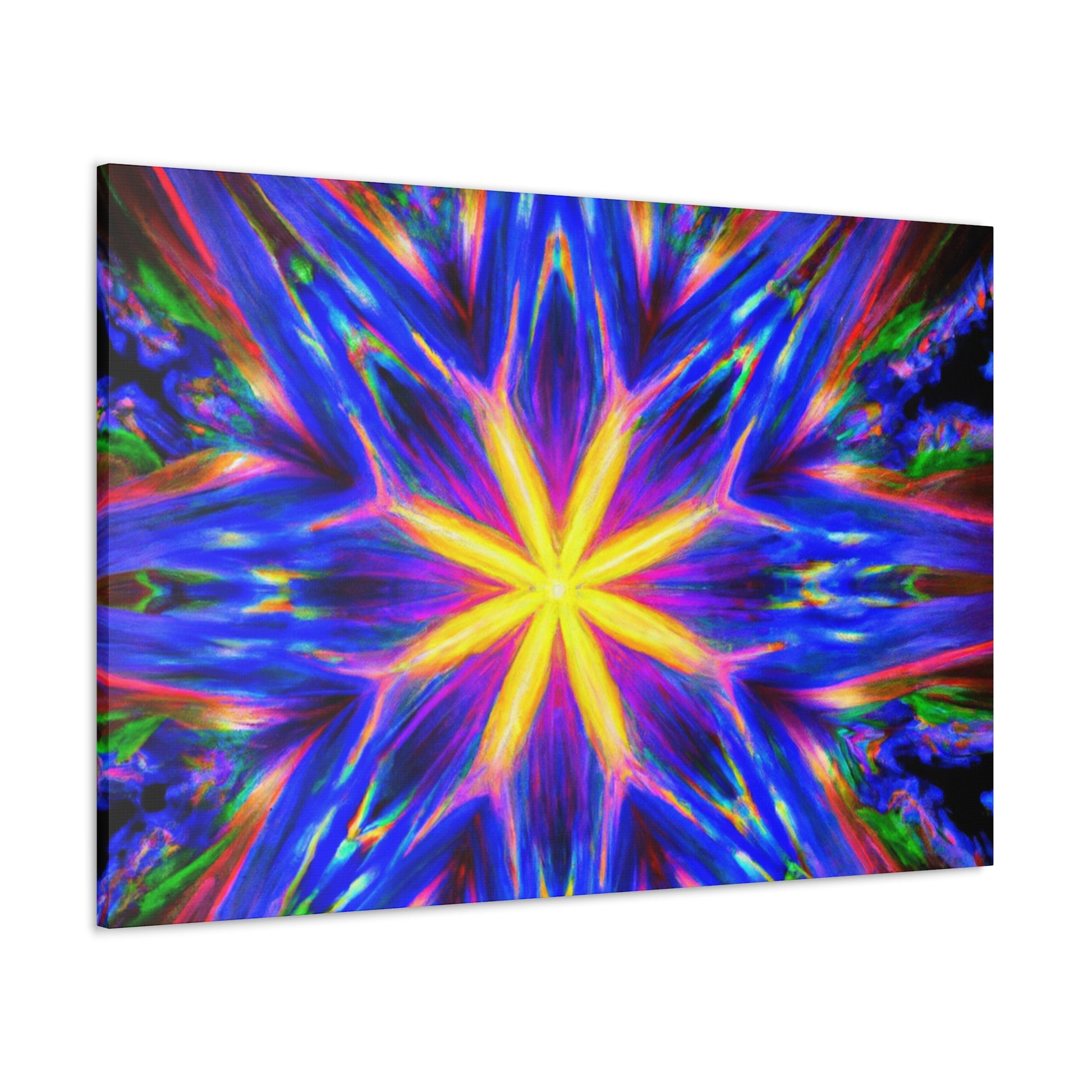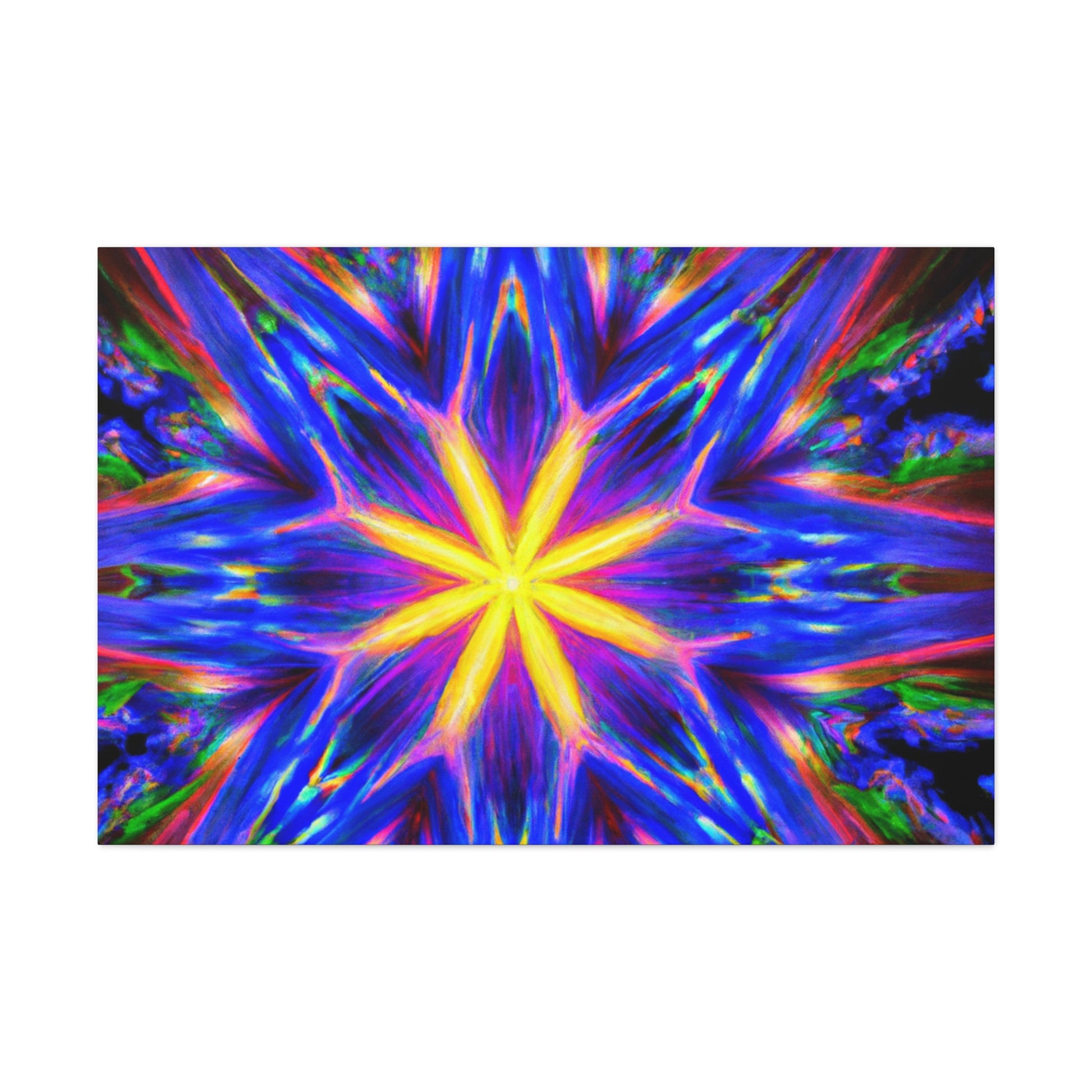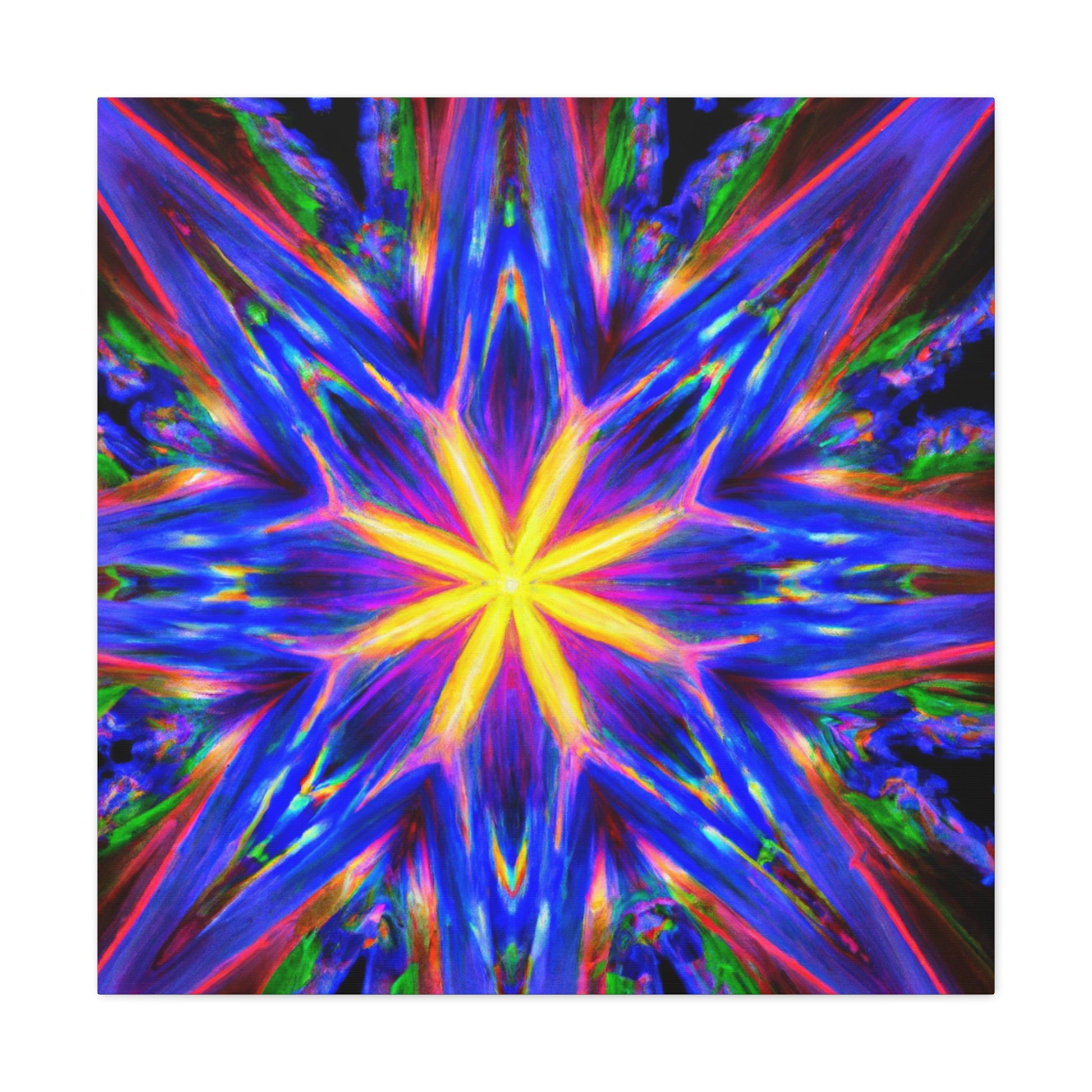 A canvas print of trippy abstract stars, kaleidoscopes, and digital art featuring eye-catching, vibrant colors in clear HD. Symmetrical and centered, this piece of art will bring a unique and playful touch to any space. #abstractart #trippystars #kaleidoscope #digitalart #vibrantcolors #HD #symmetrical #canvasprint #wallart #roomdecor #uniquedecor