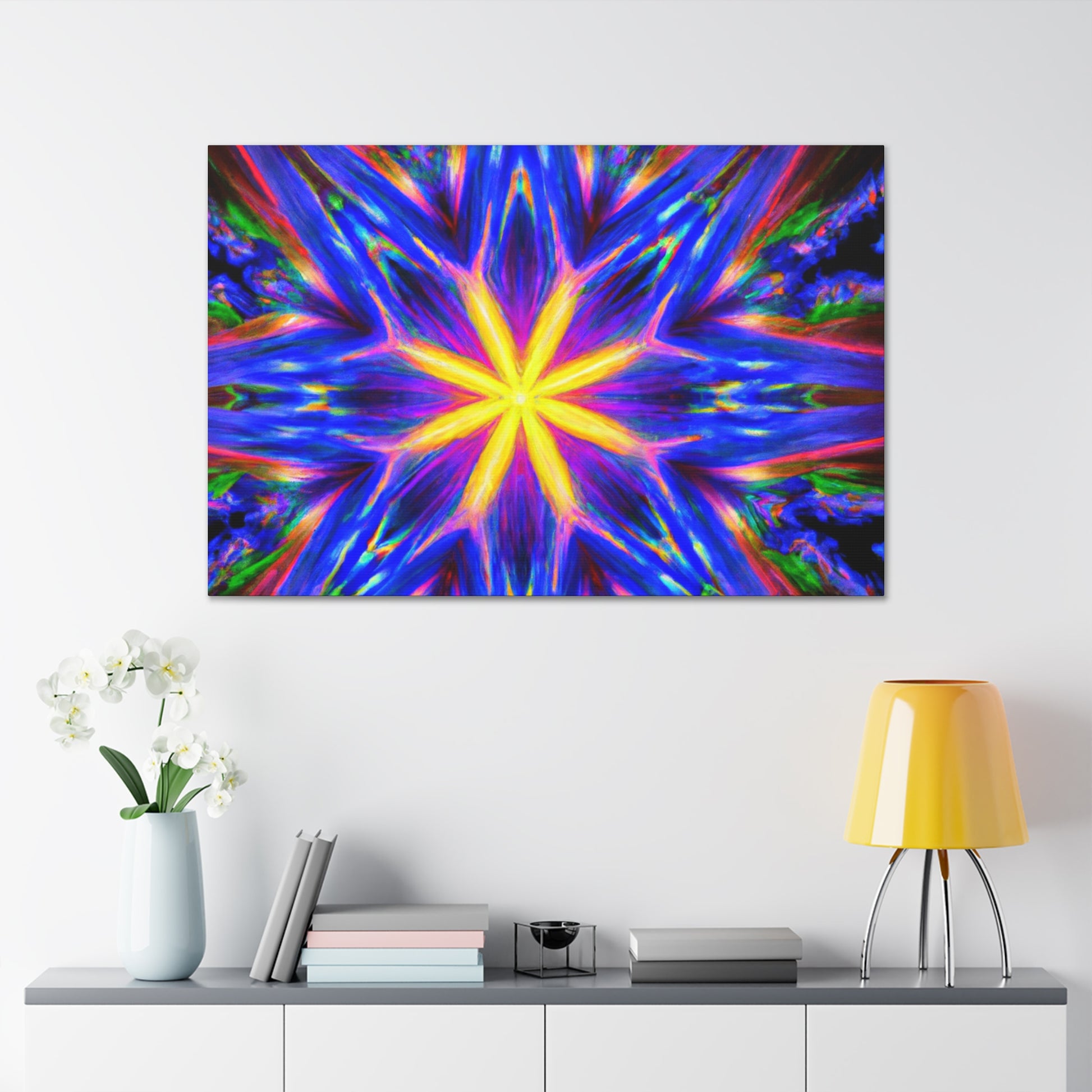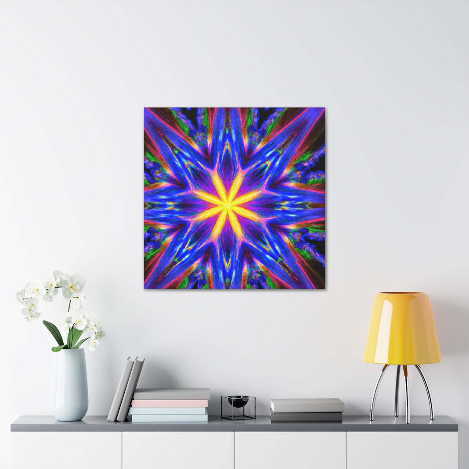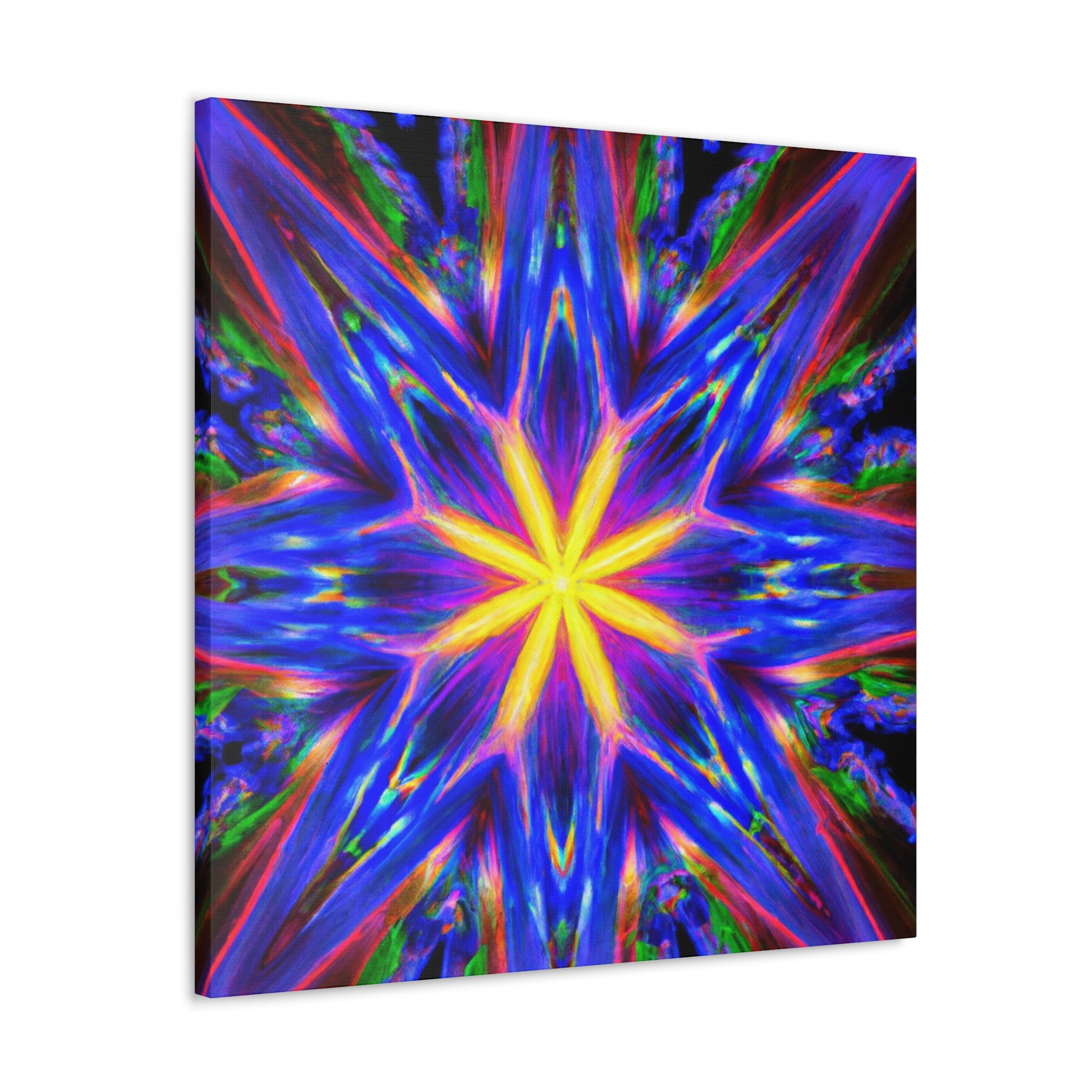 A canvas print of trippy abstract stars, kaleidoscopes, and digital art featuring eye-catching, vibrant colors in clear HD. Symmetrical and centered, this piece of art will bring a unique and playful touch to any space. #abstractart #trippystars #kaleidoscope #digitalart #vibrantcolors #HD #symmetrical #canvasprint #wallart #roomdecor #uniquedecor