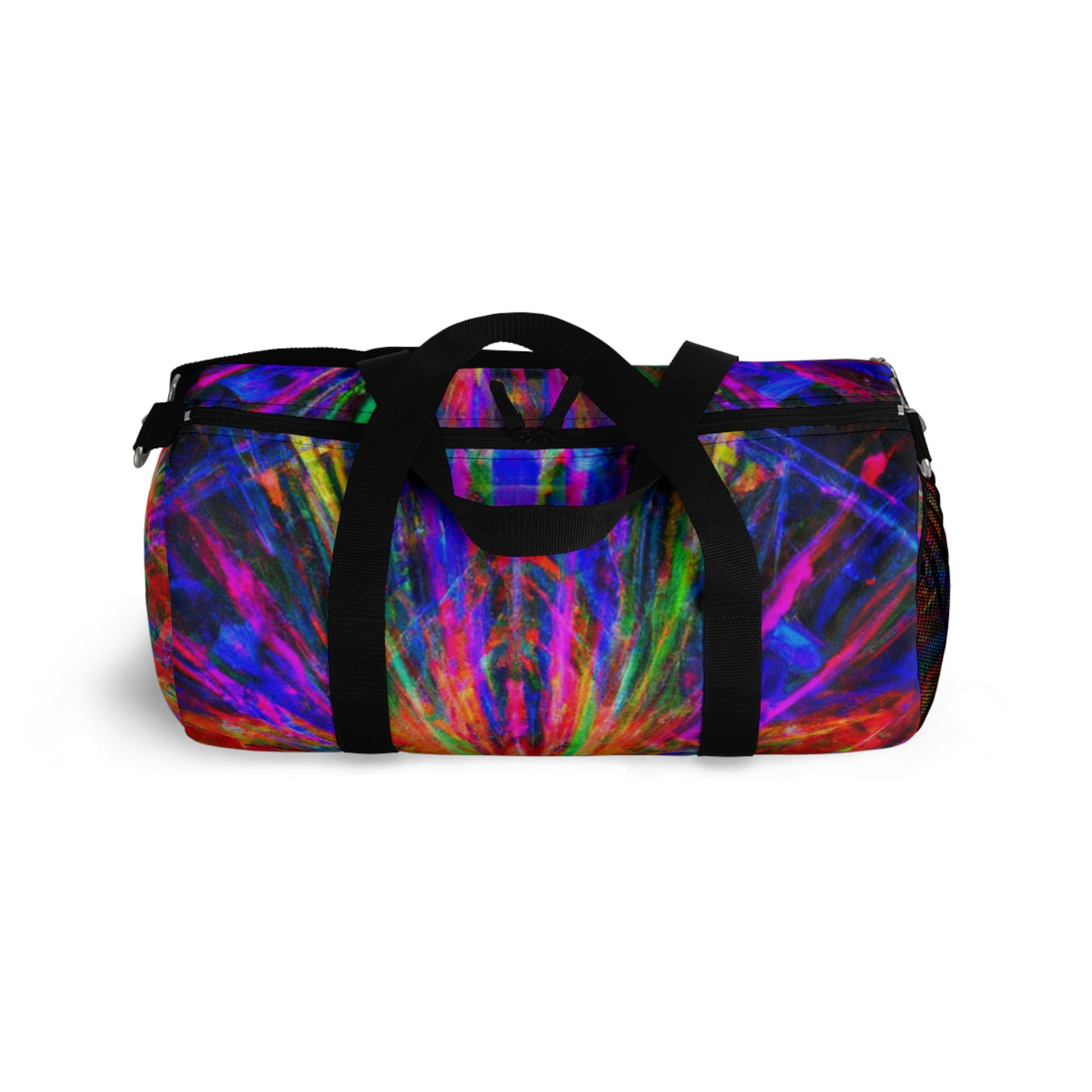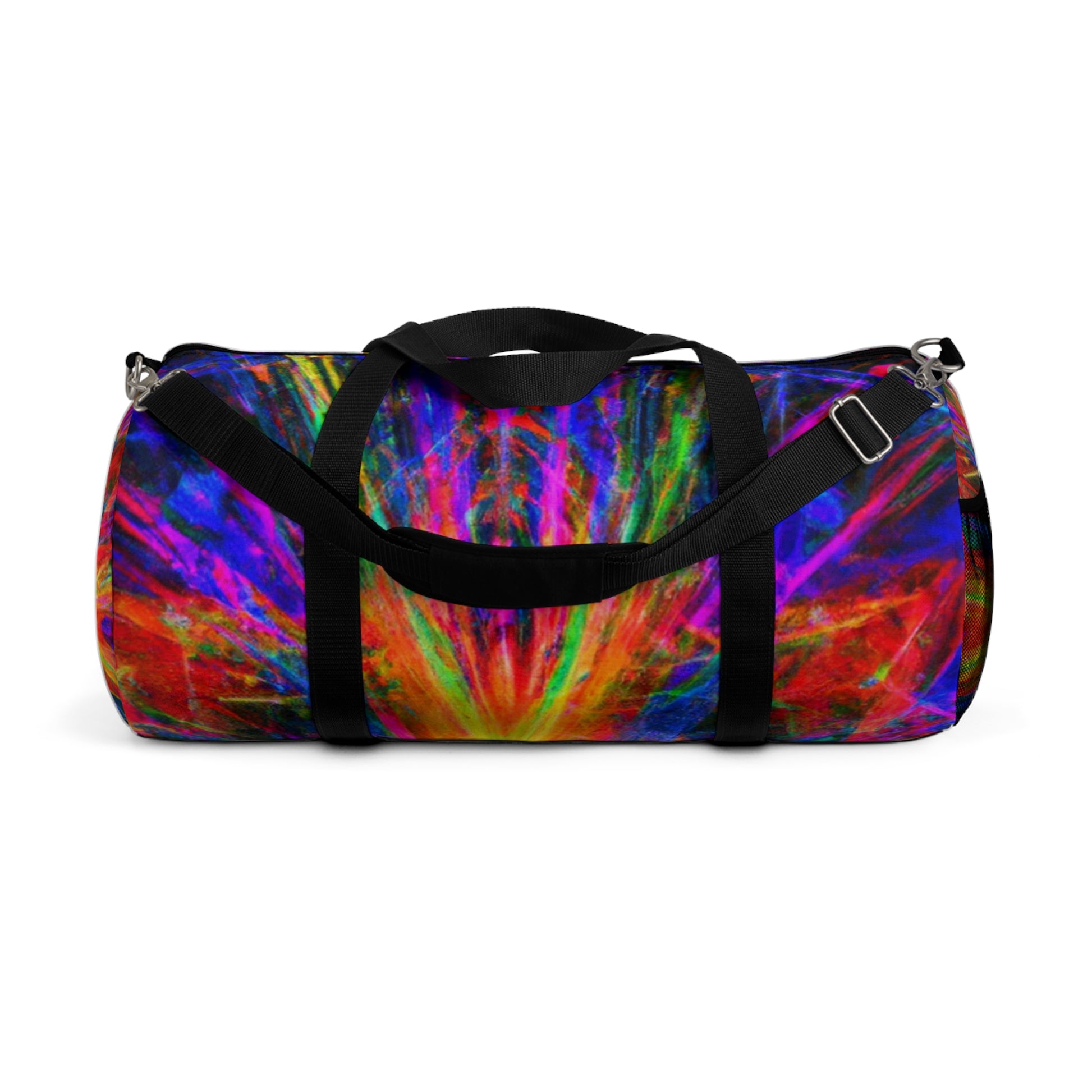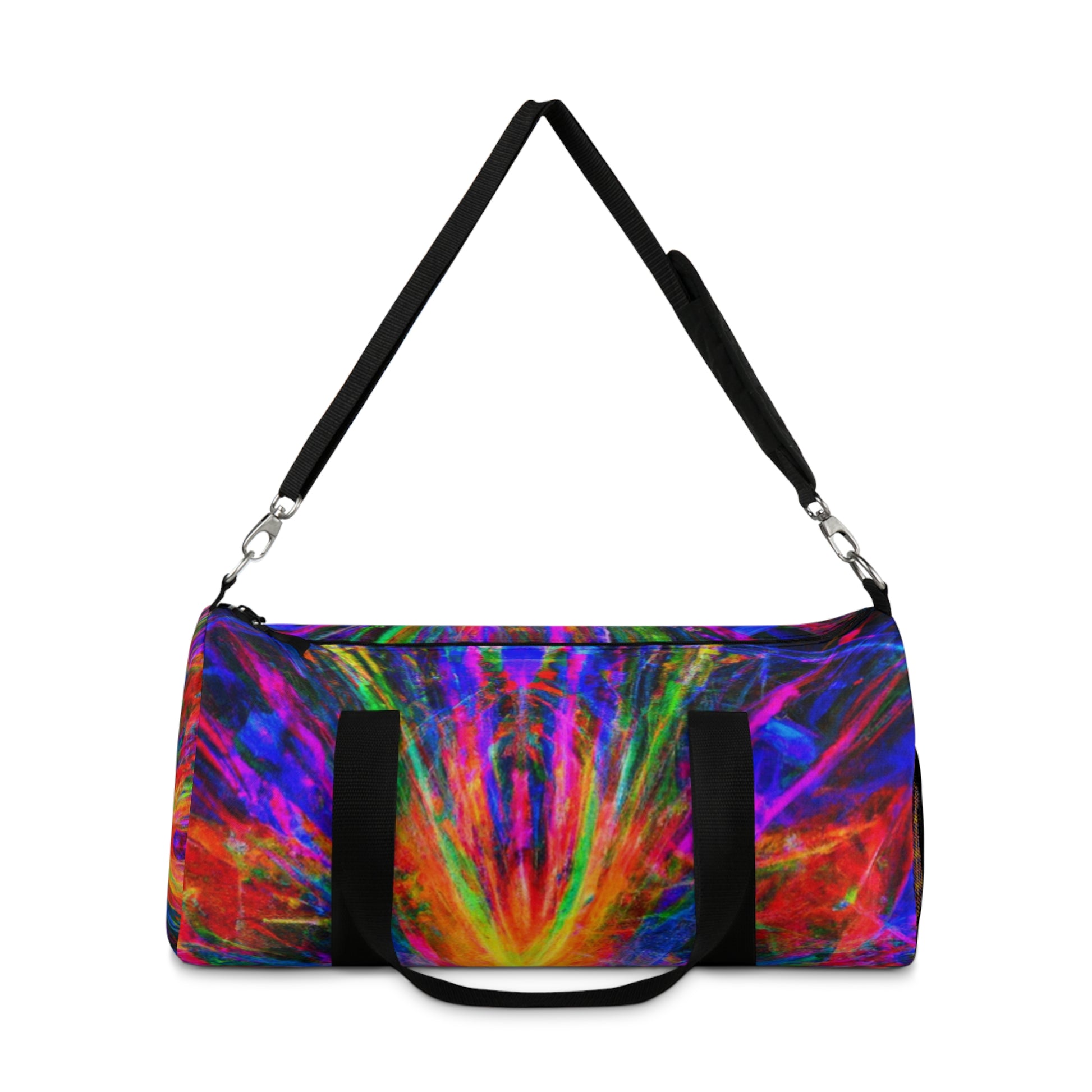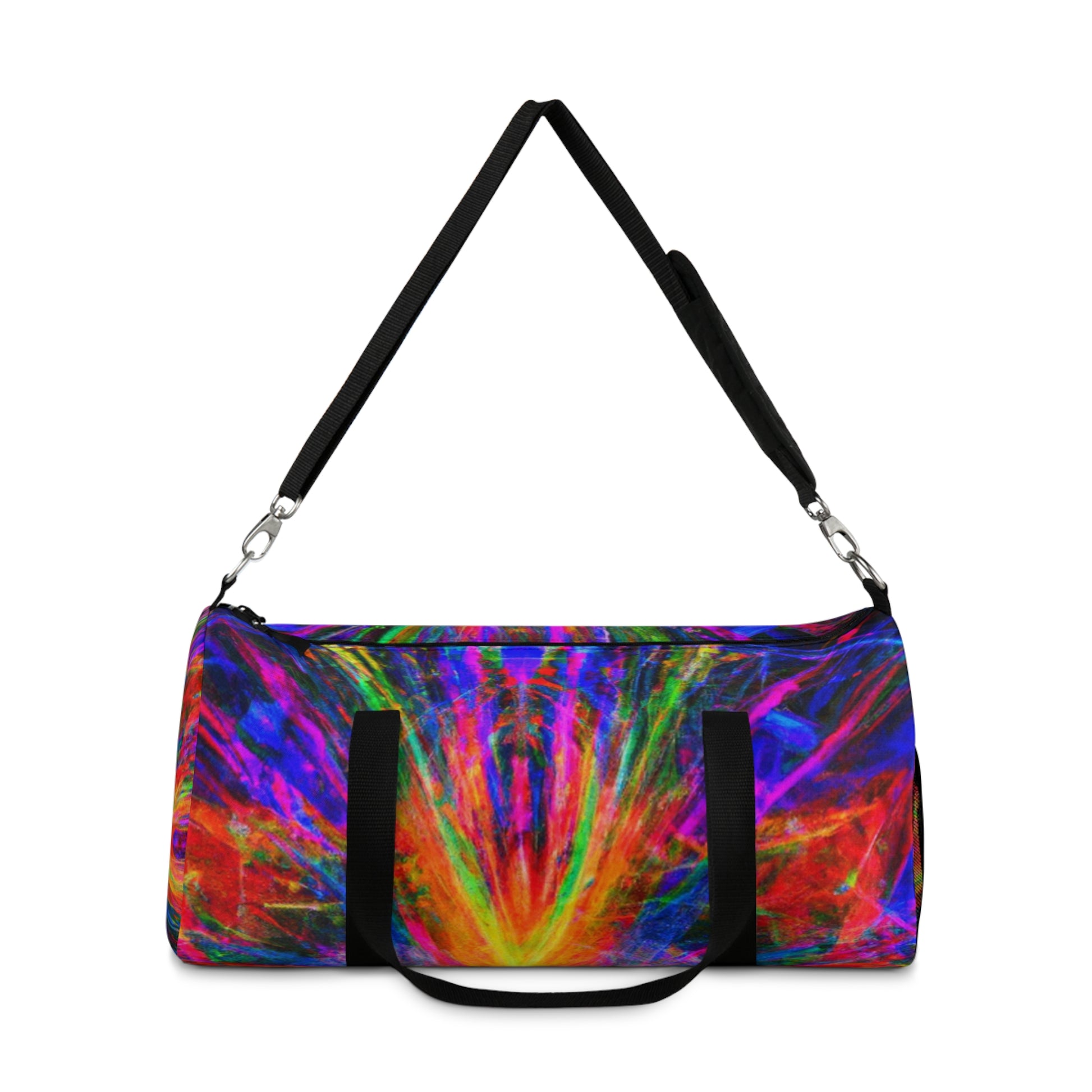 This unique and stylish duffle bag is adorned with an eye-catching print of trippy stars, kaleidoscope, abstract, digital art, and vibrant colors with 3D lines. The perfect accessory to add a splash of boldness to any outing! #trippystars #kaleidoscope #abstract #digitalart #vibrantcolors #3Dlines #dufflebag #fashionaccessories #unique #stylish #bold #outing #accessories #bag #daytrip #style #travel #adventure #vibes #shopping #trending #weekendbag #vibrant #fashionista #eye-catching #artsy #travelbag #journey