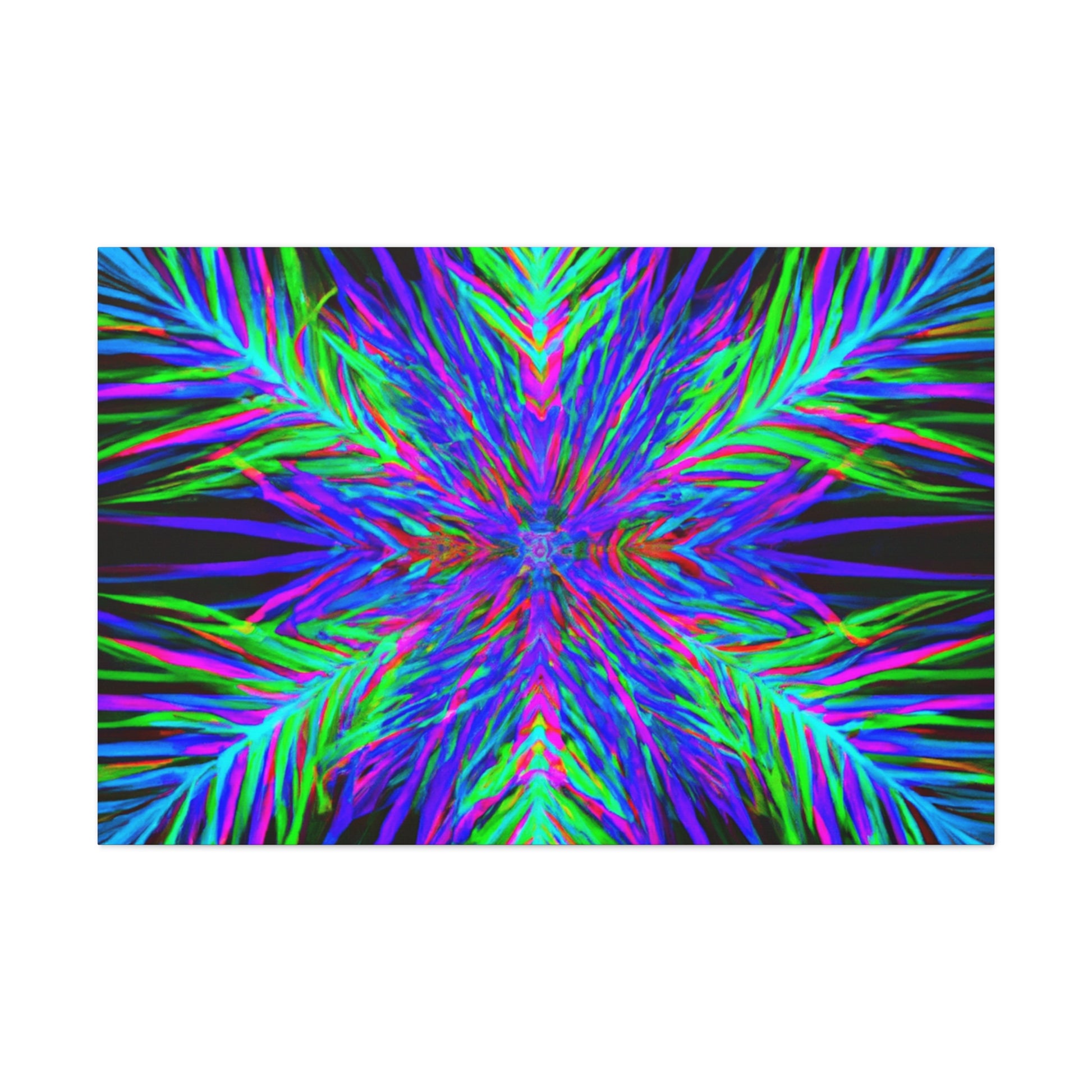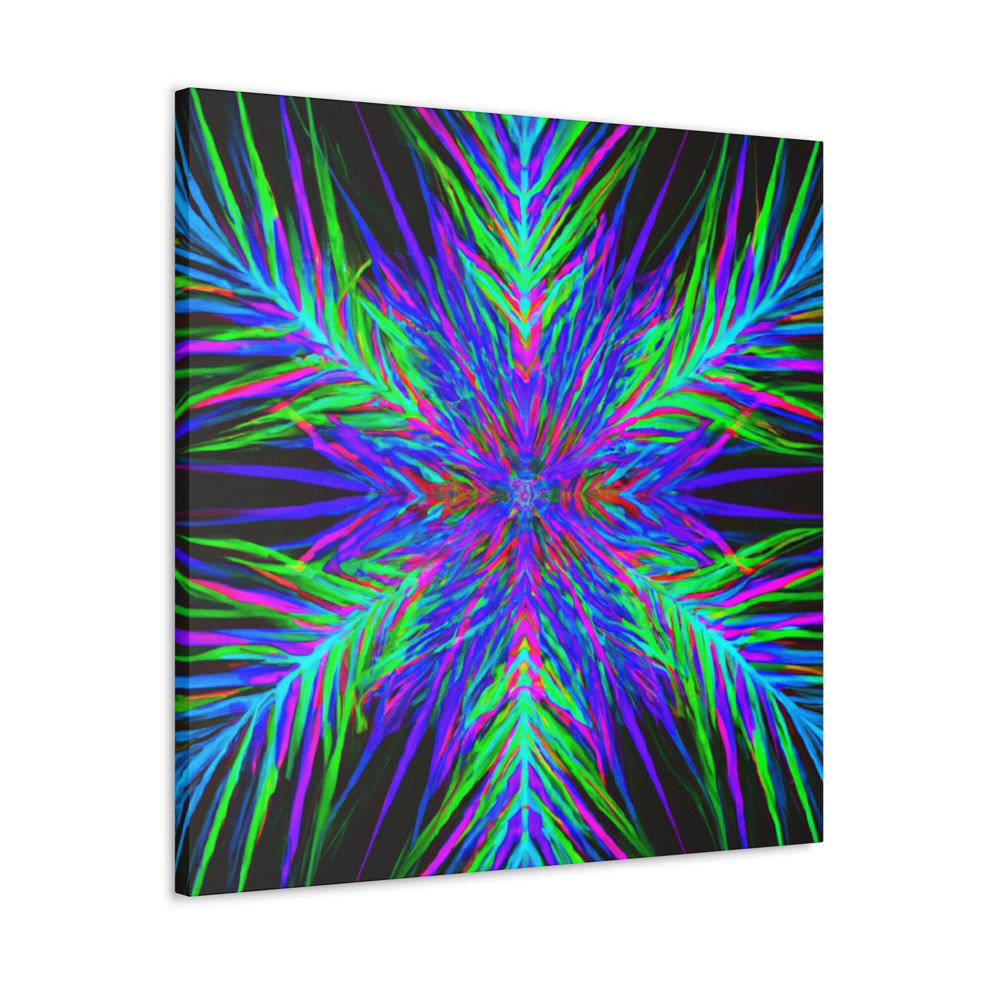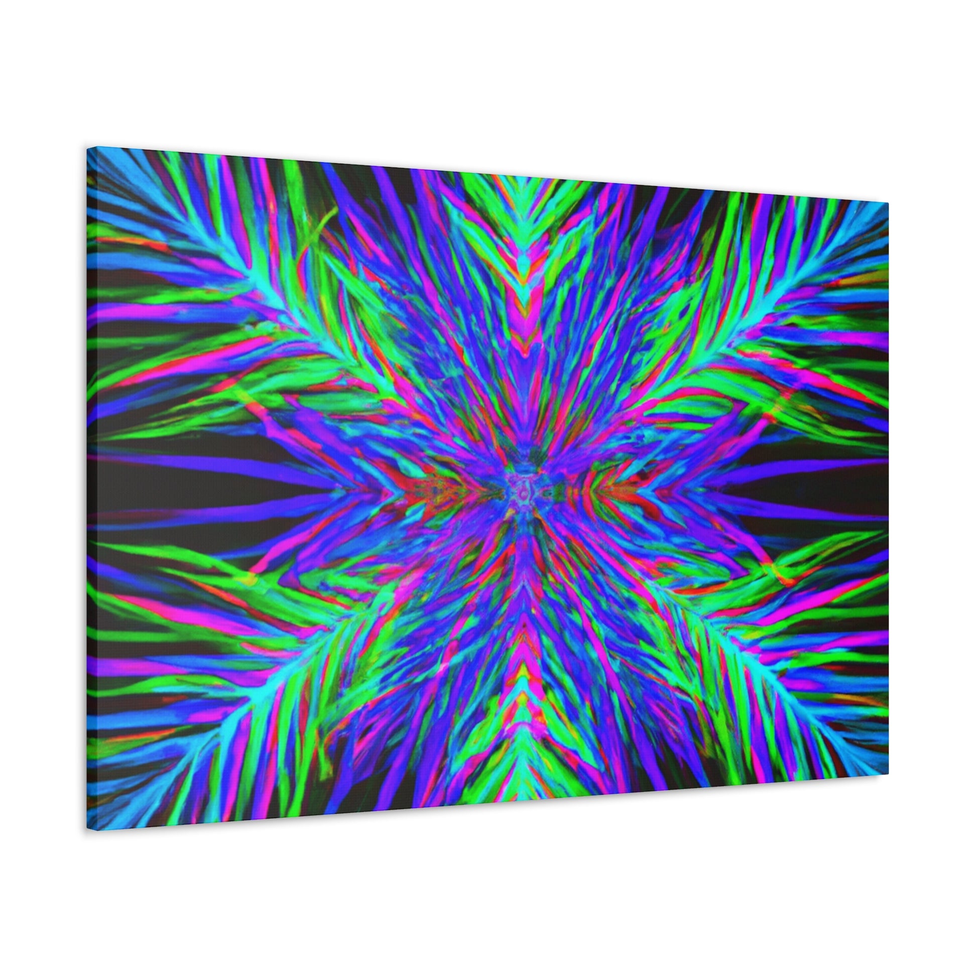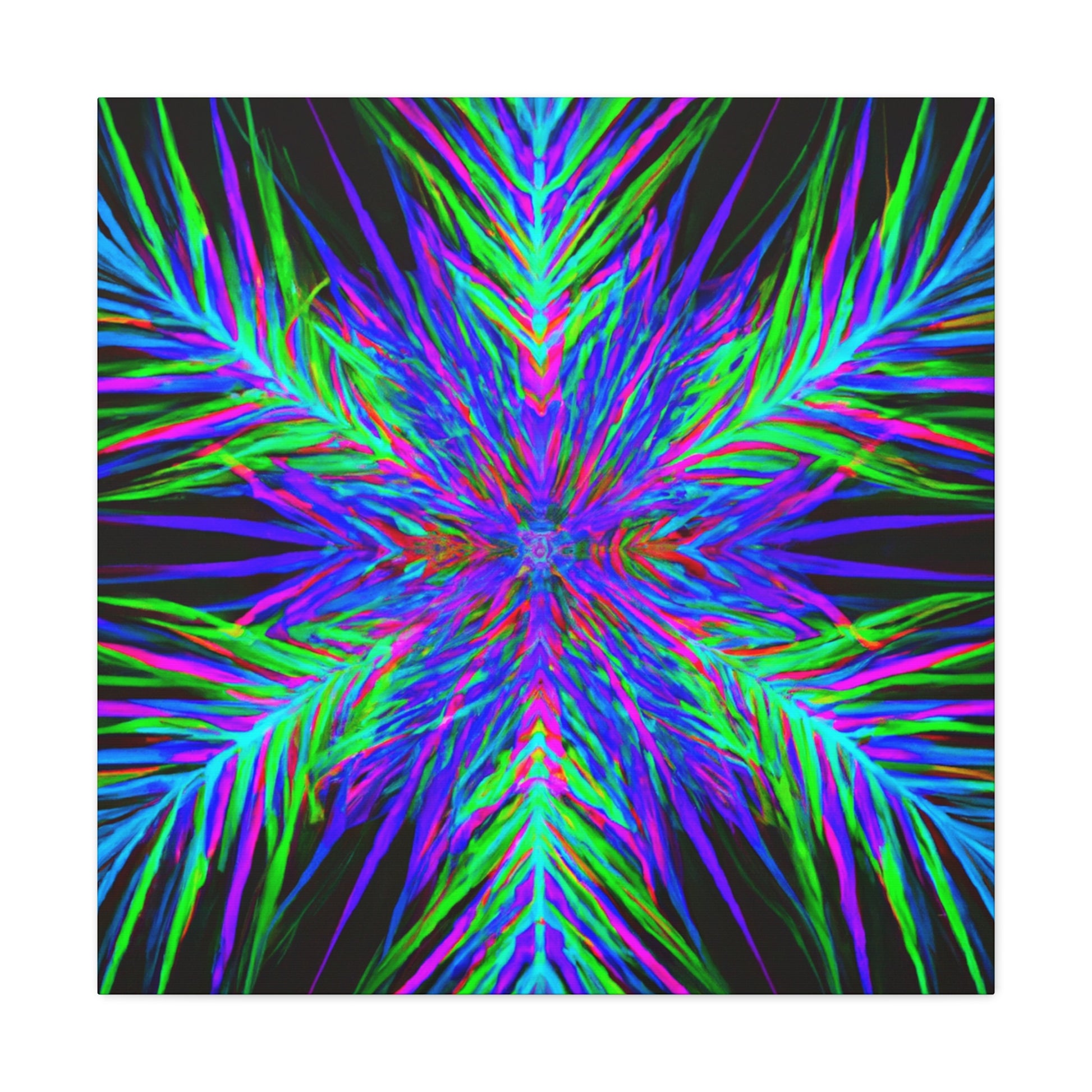 This mesmerizing canvas art piece features trippy geometric palm leaves, abstract shapes, and stunning digital art in vibrant colors and 3D lines. Its kaleidoscope pattern and lively fractal design will be the ideal conversation starter and a beautiful addition to any wall. #WallArt #DigitalArt #CanvasArt #Abstract #AbstractPainting #Fractal #Kaleidoscope #GeometricArt #VibrantColors #3DLines #PalmLeaves