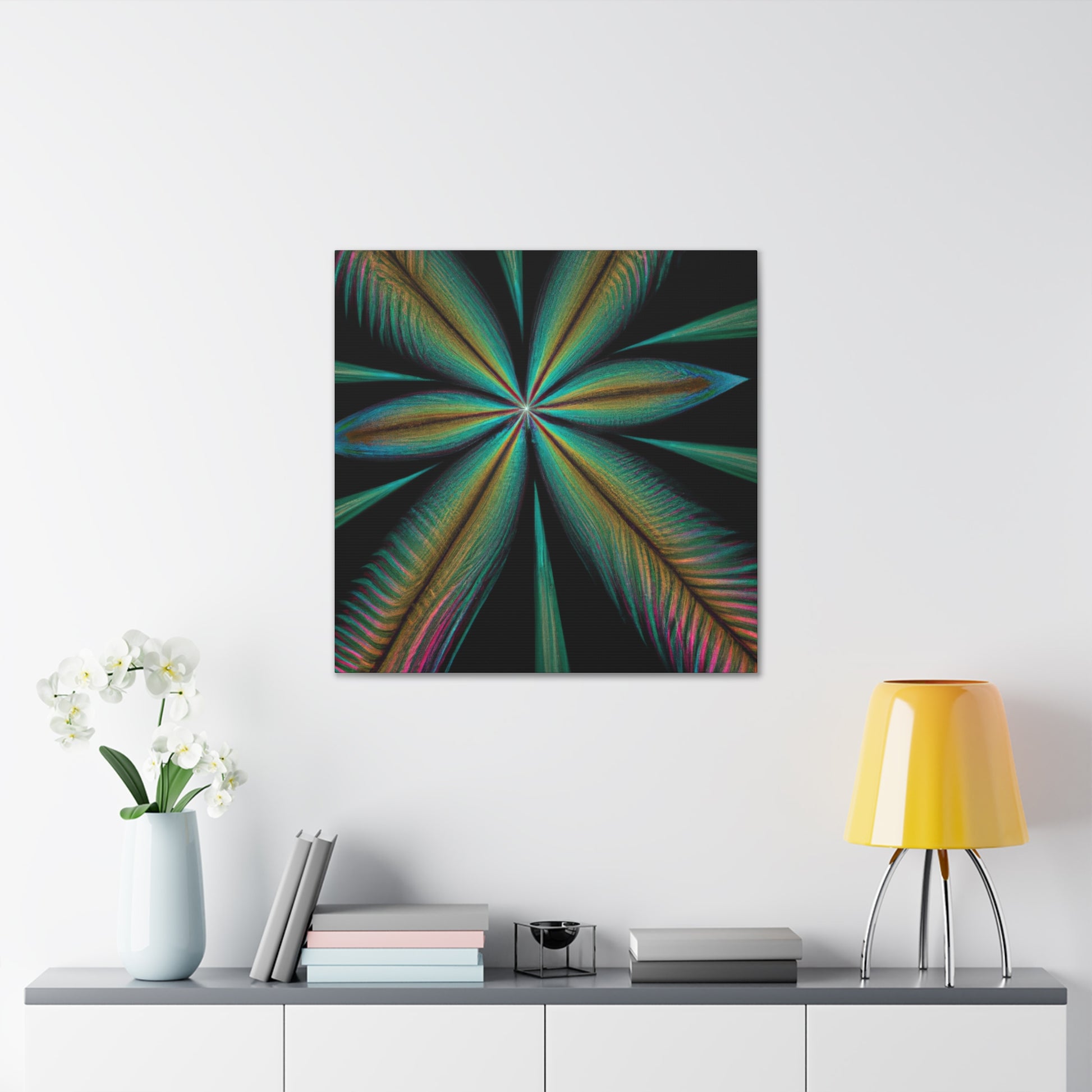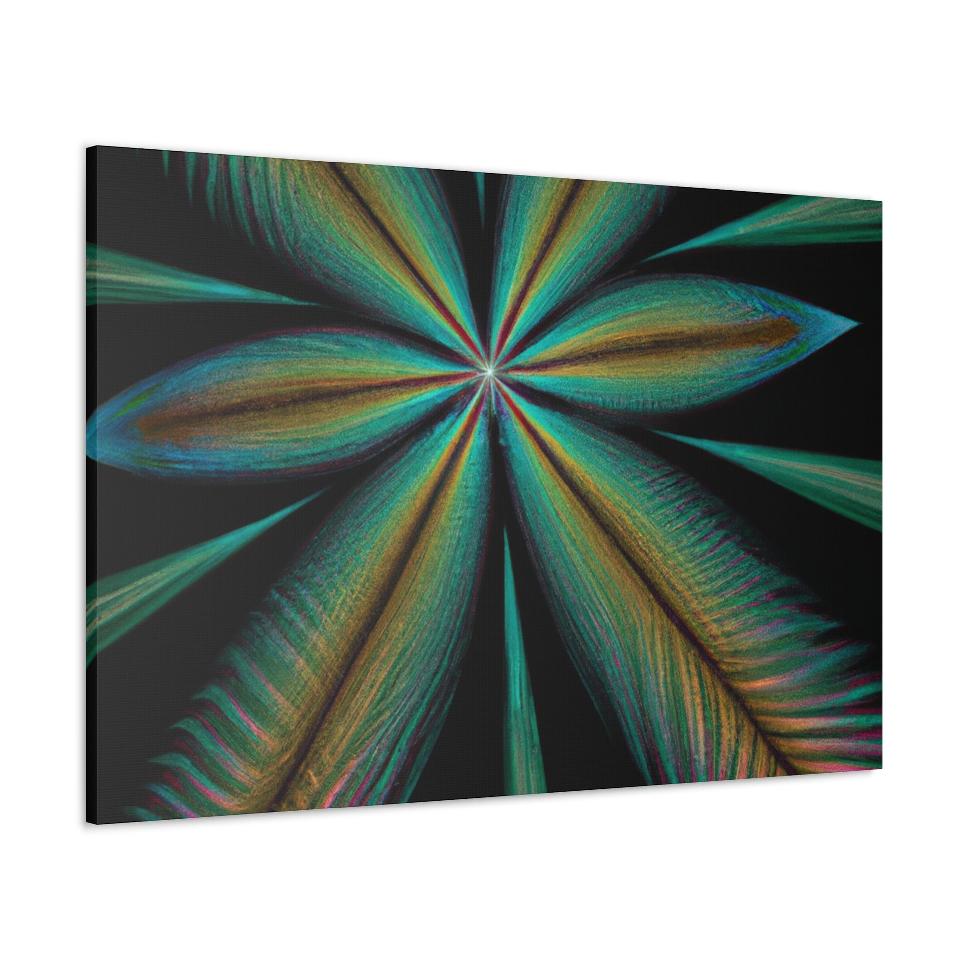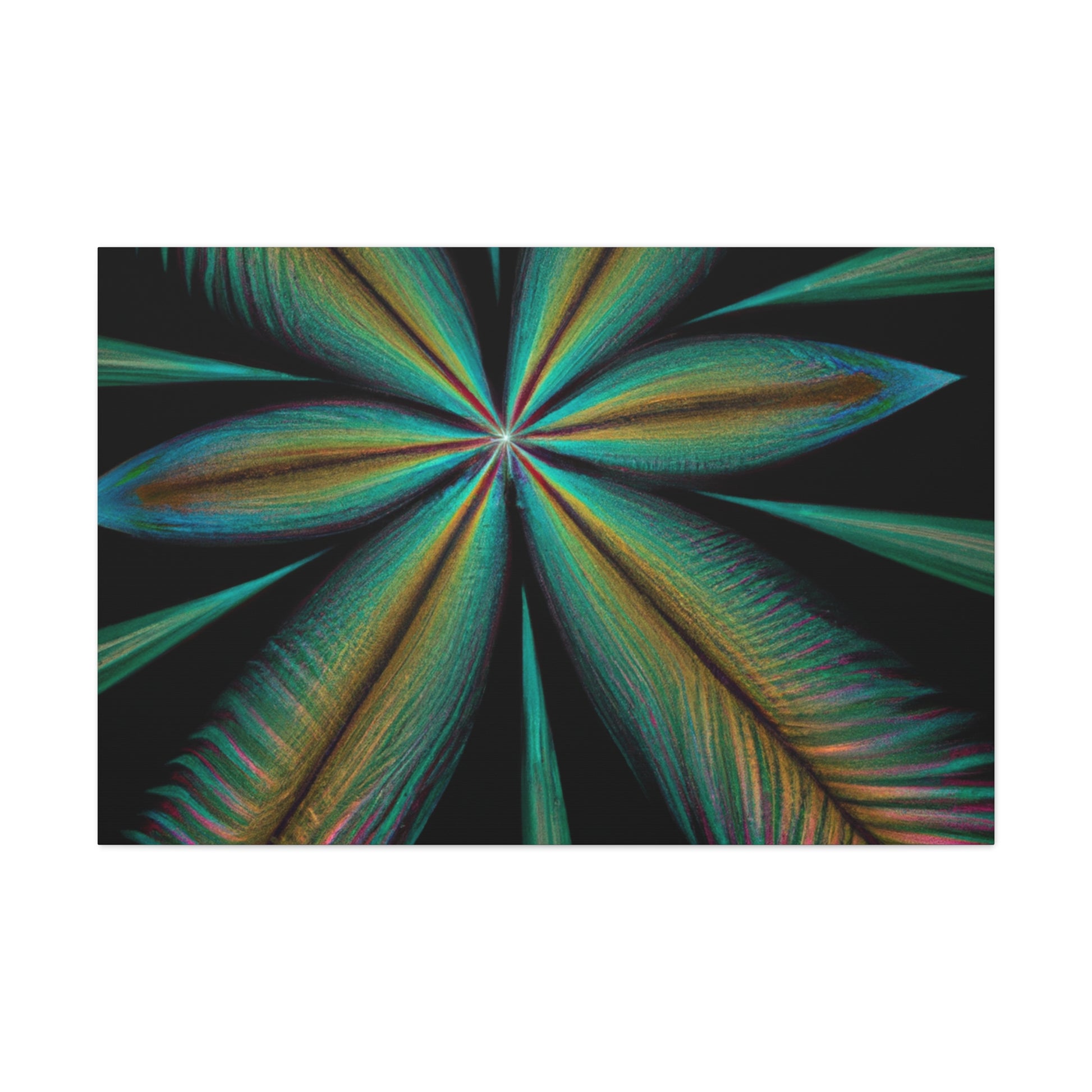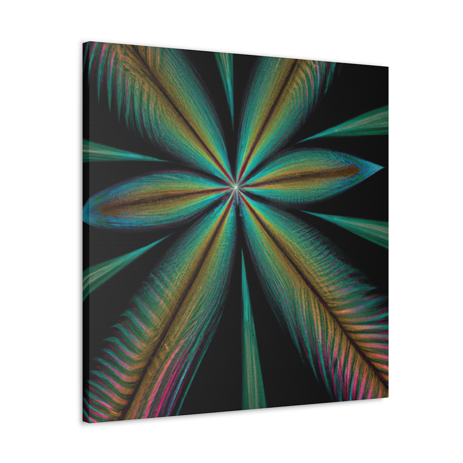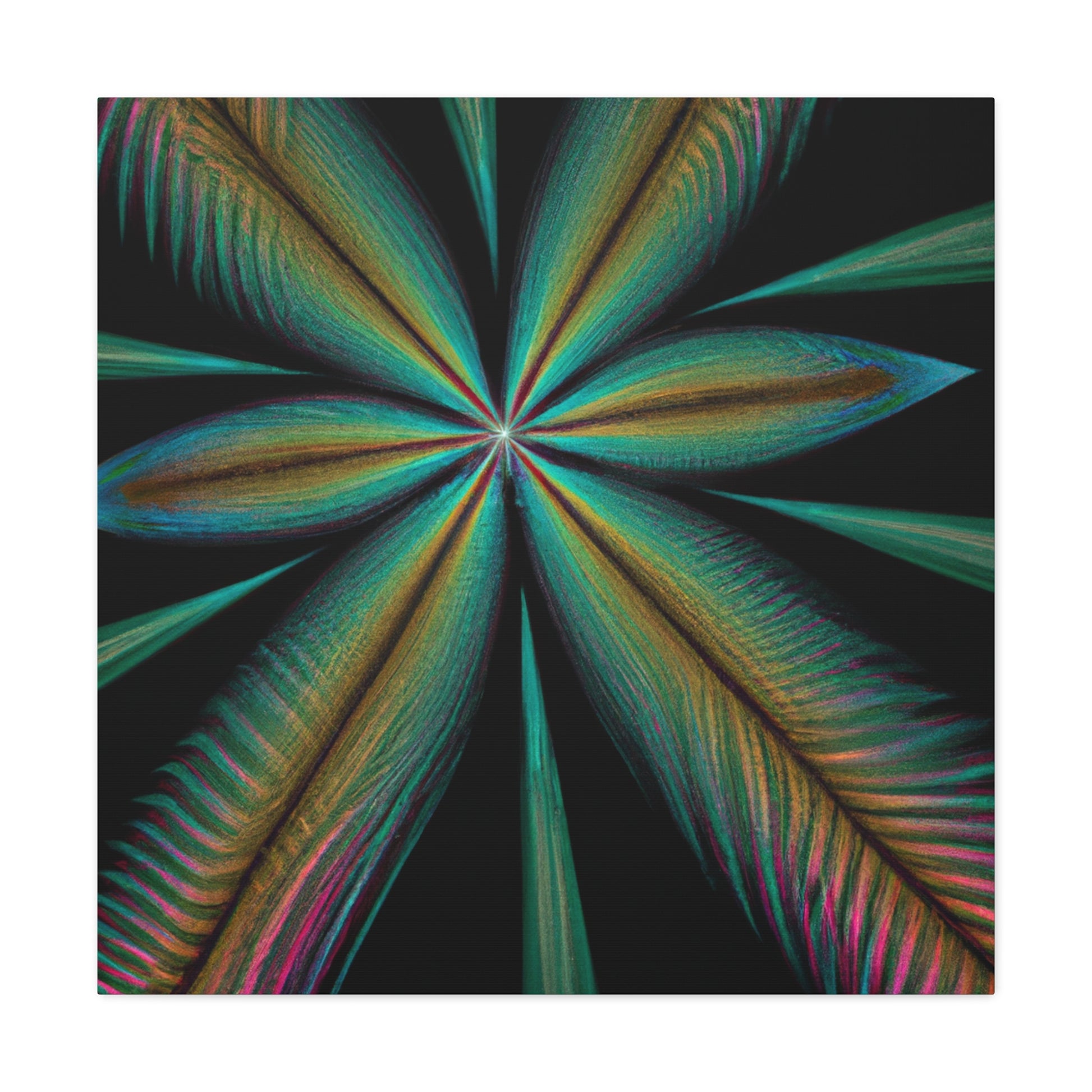 This vibrant abstract digital art canvas will bring life to any home or office! A colorful mixture of Trippy Geometric Palm Leaves, kaleidoscope, 3D lines and fractal make this piece unforgettable. Enjoy the fusion of bright colors and contemporary art and let your walls shine with this striking design. #abstract #digitalart #kaleidoscope #palmleaves #trippy #vibrantcolors #3dlines #fractal #geometric #art #contemporaryart