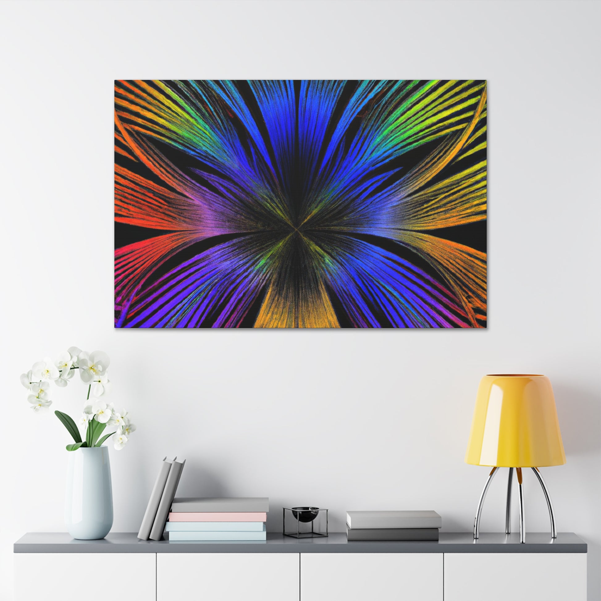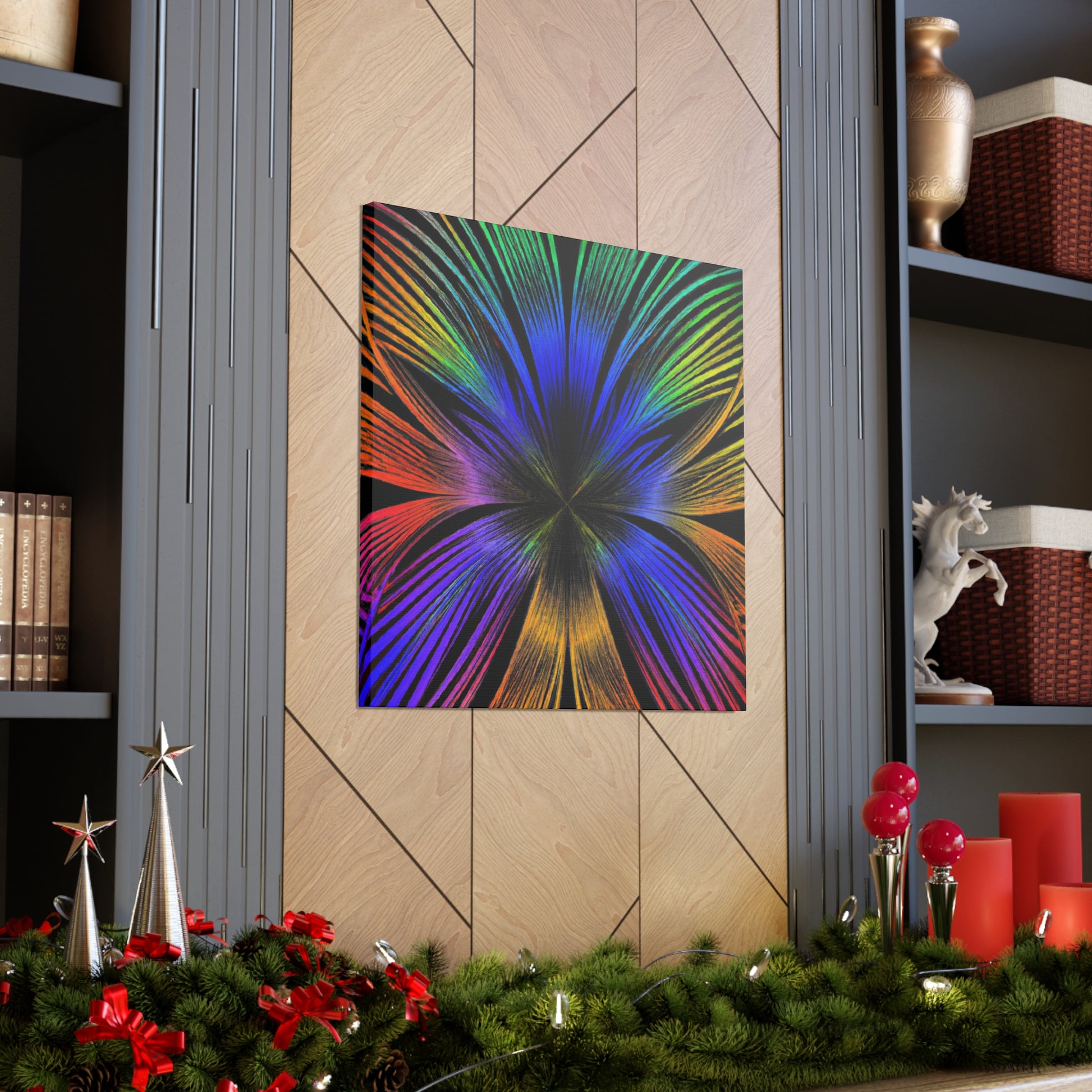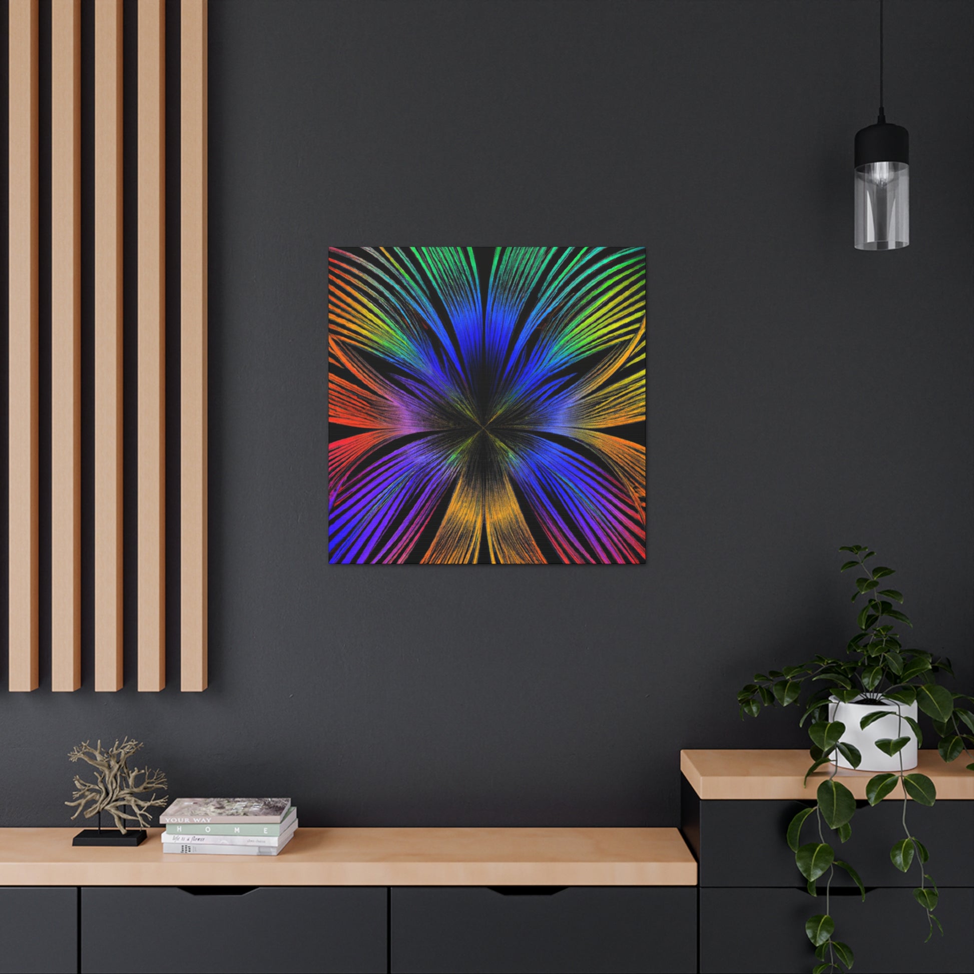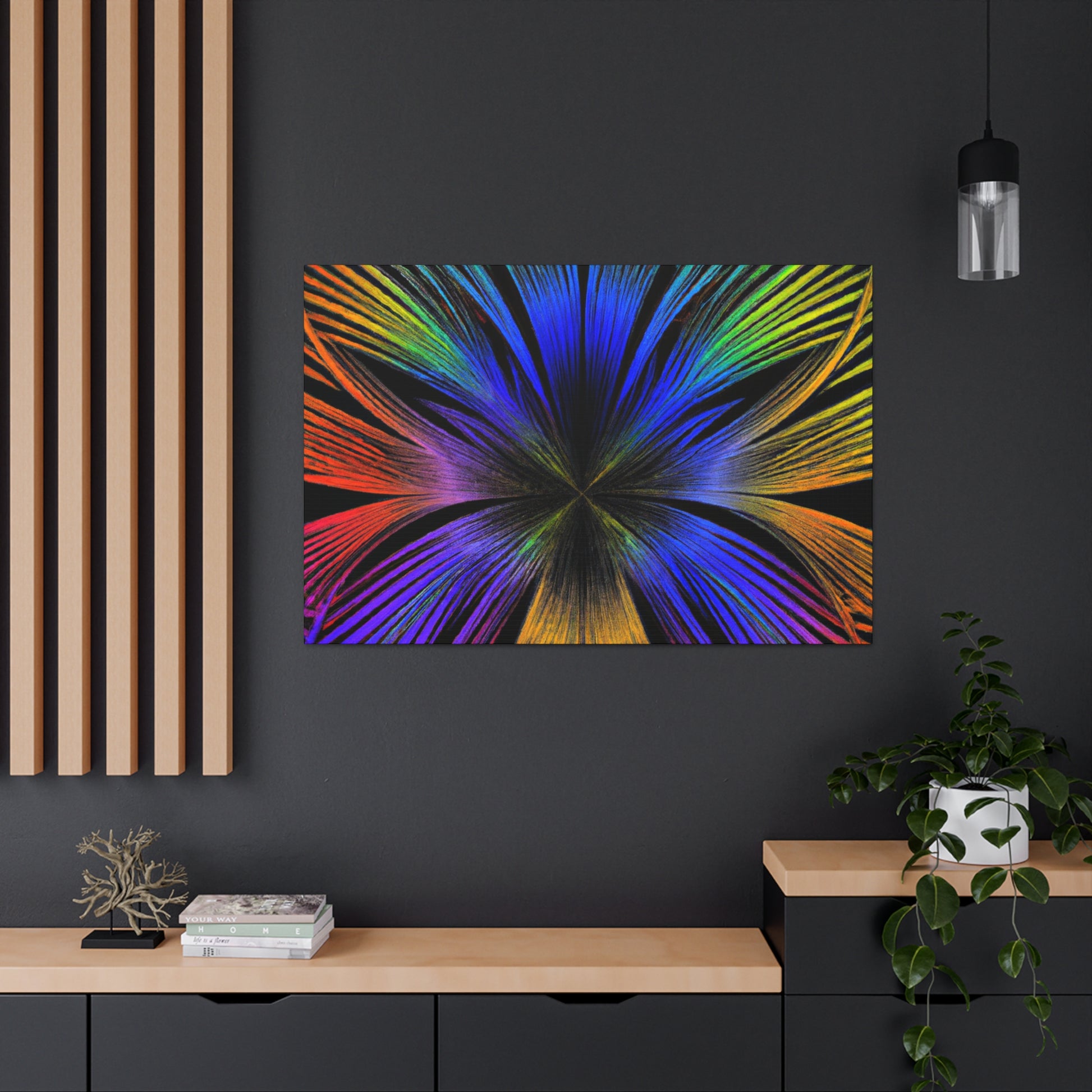 A canvas of Trippy Geometric Palm Leaves, Kaleidoscope, Abstract, Digital Art, and Vibrant Colors is the perfect accent for your wall. The 3D lines, fractal design, and bright colors create an inspiring and unique piece of art for your home. Let this piece bring a bit of color and creativity to your life. #Kaleidoscope #Abstract #DigitalArt #VibrantColors #3dLines #Fractal #Canvas #Creative #Inspiring #Artistic #HomeDecor