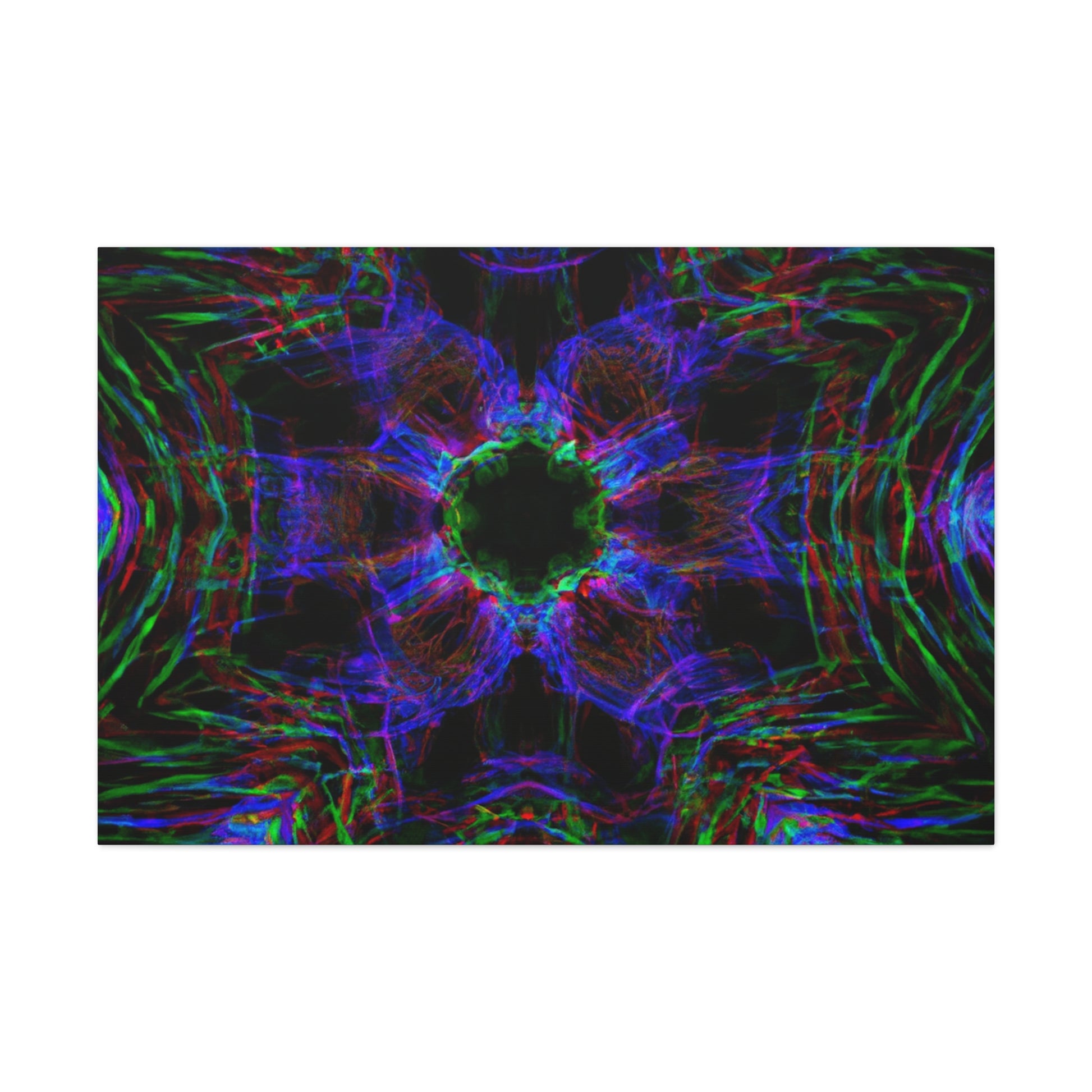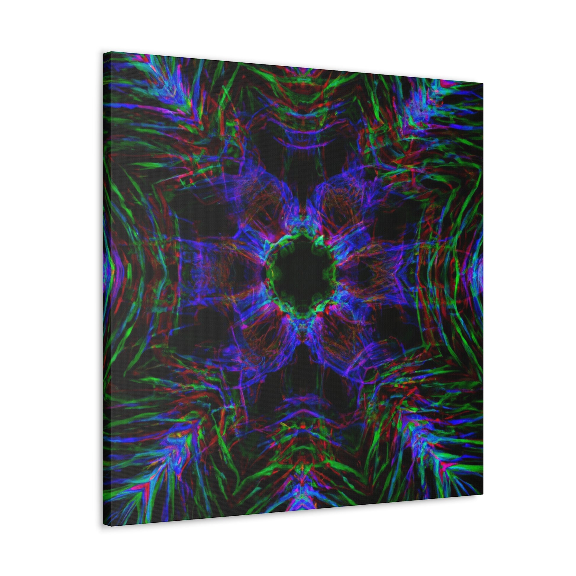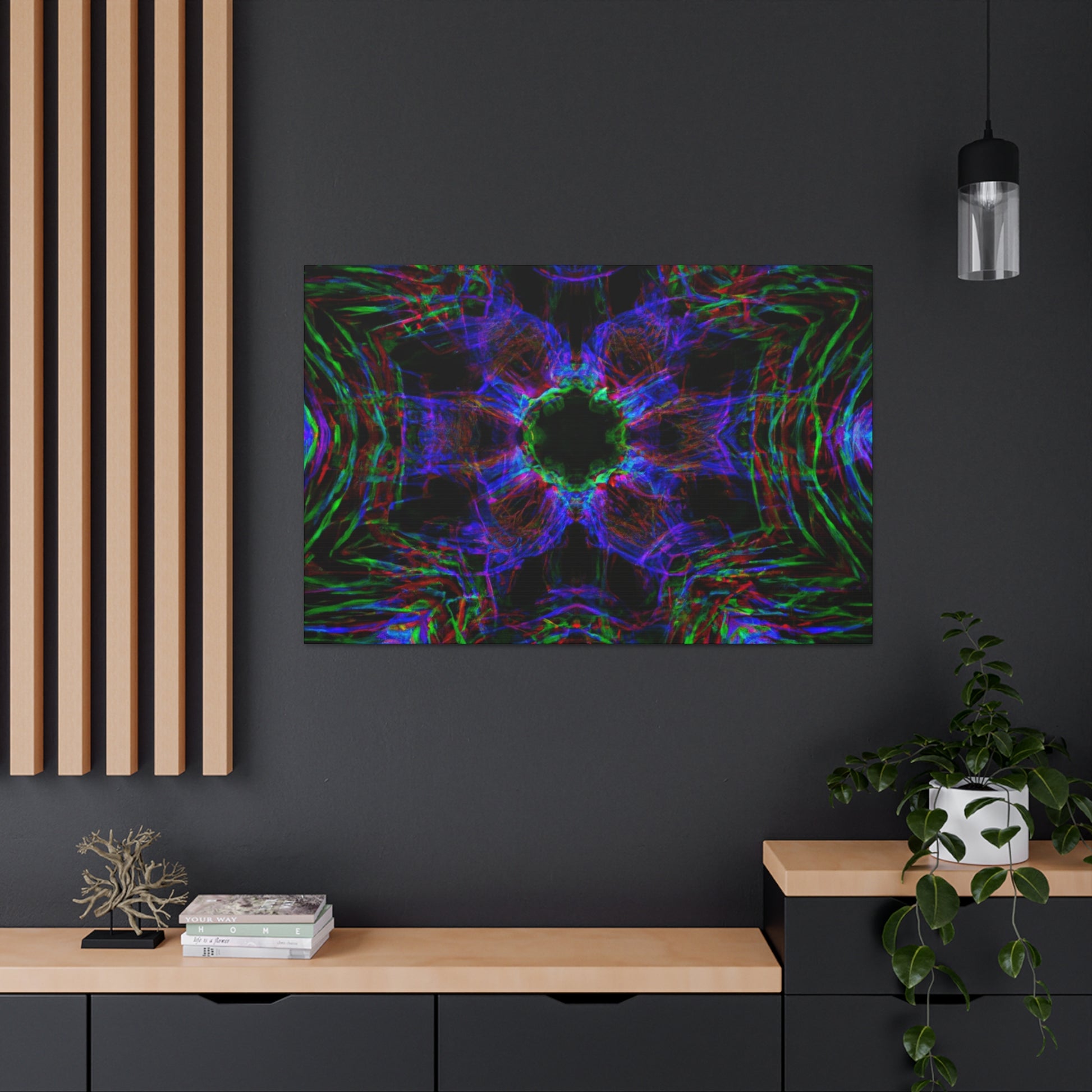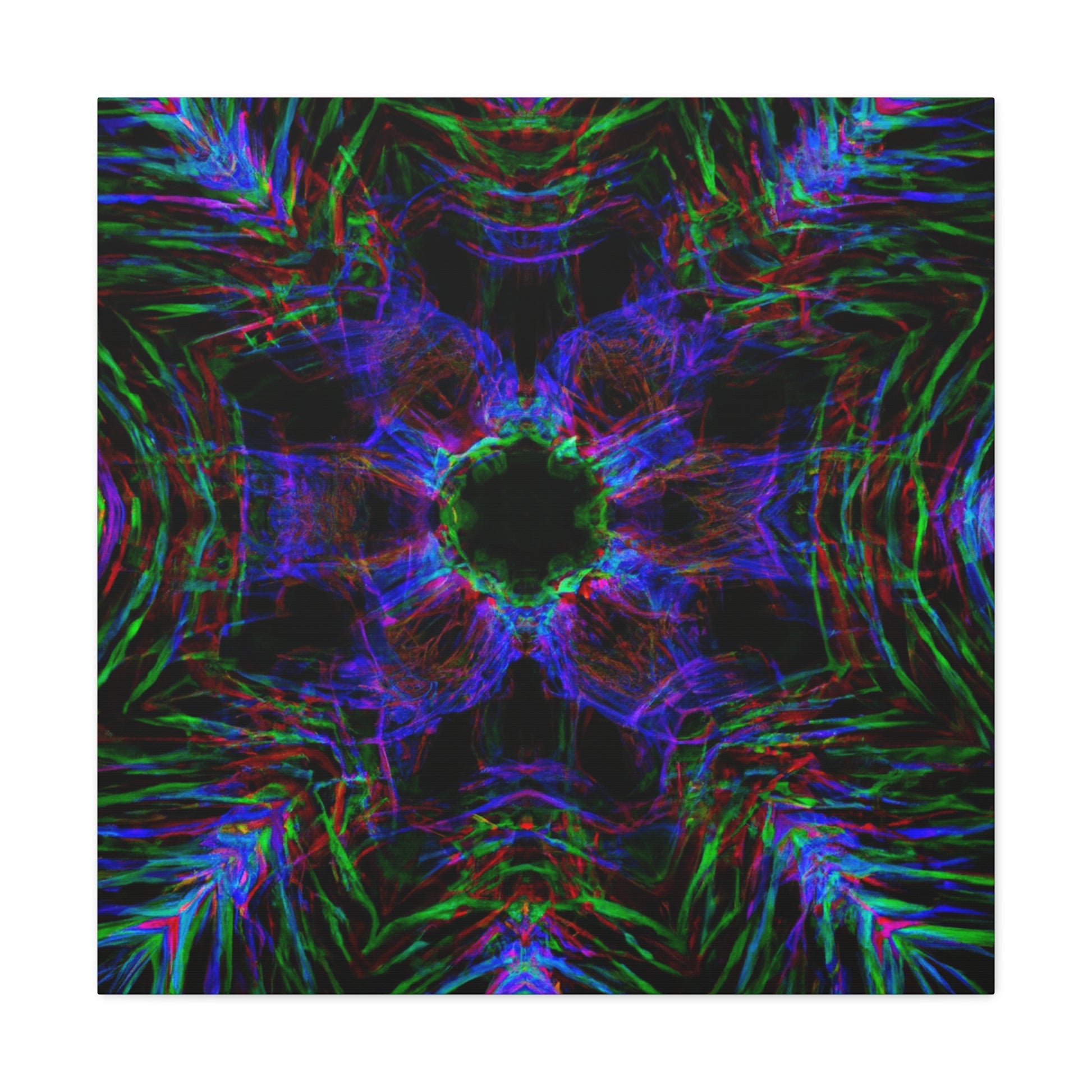 This awe-inspiring, handcrafted canvas art is spiced up by a unique mix of modern and abstract elements. Vibrant colors, 3D lines, fractals, and kaleidoscopic geometric palm leaves combine to create a stunning effect! Add a unique and daring touch to any interior with this one-of-a-kind digital art print. #abstractart #palmleaves #kaleidoscope #trippyart #3Dlines #geometricart #fractal #digitalart #vibrantcolors #interiordecor #canvasart