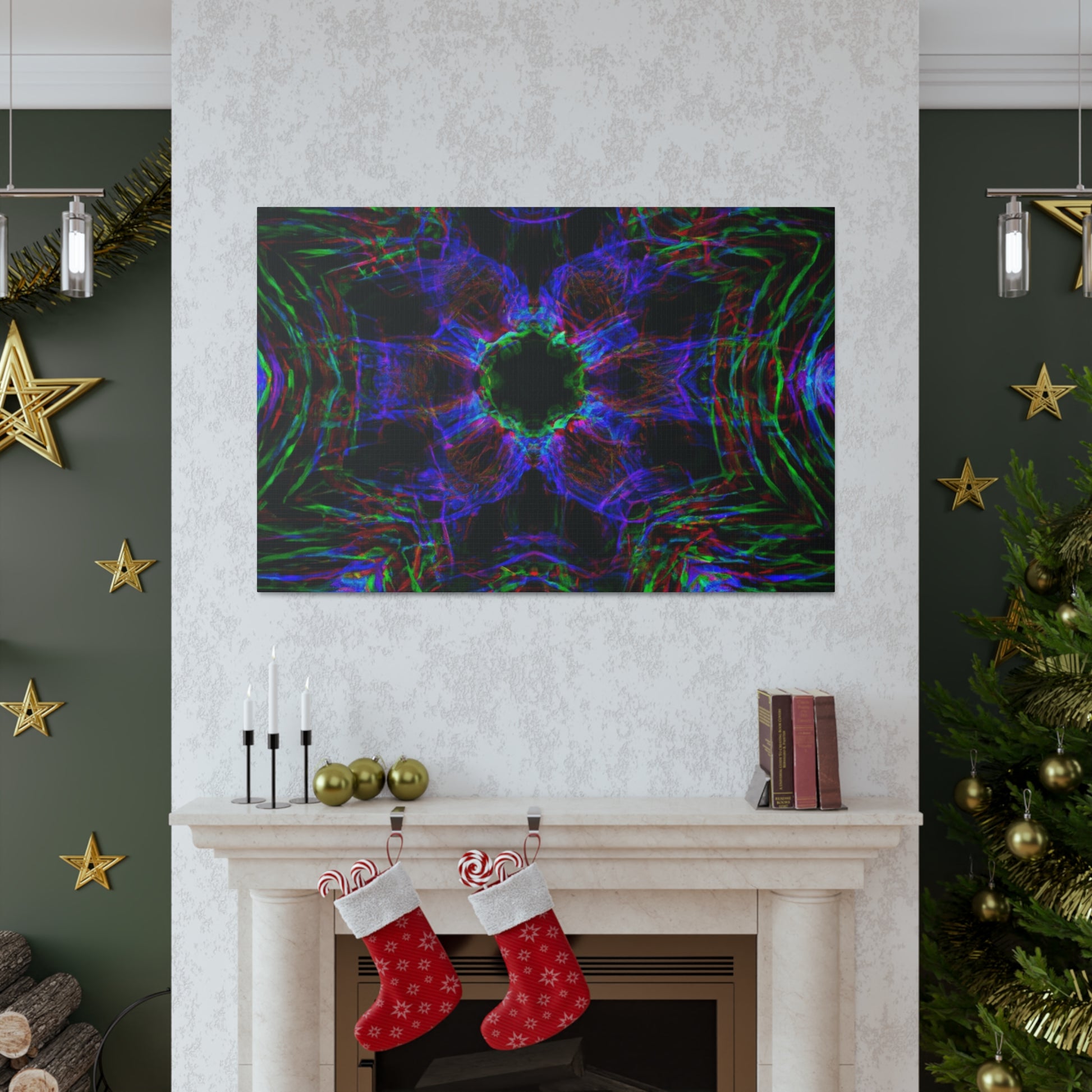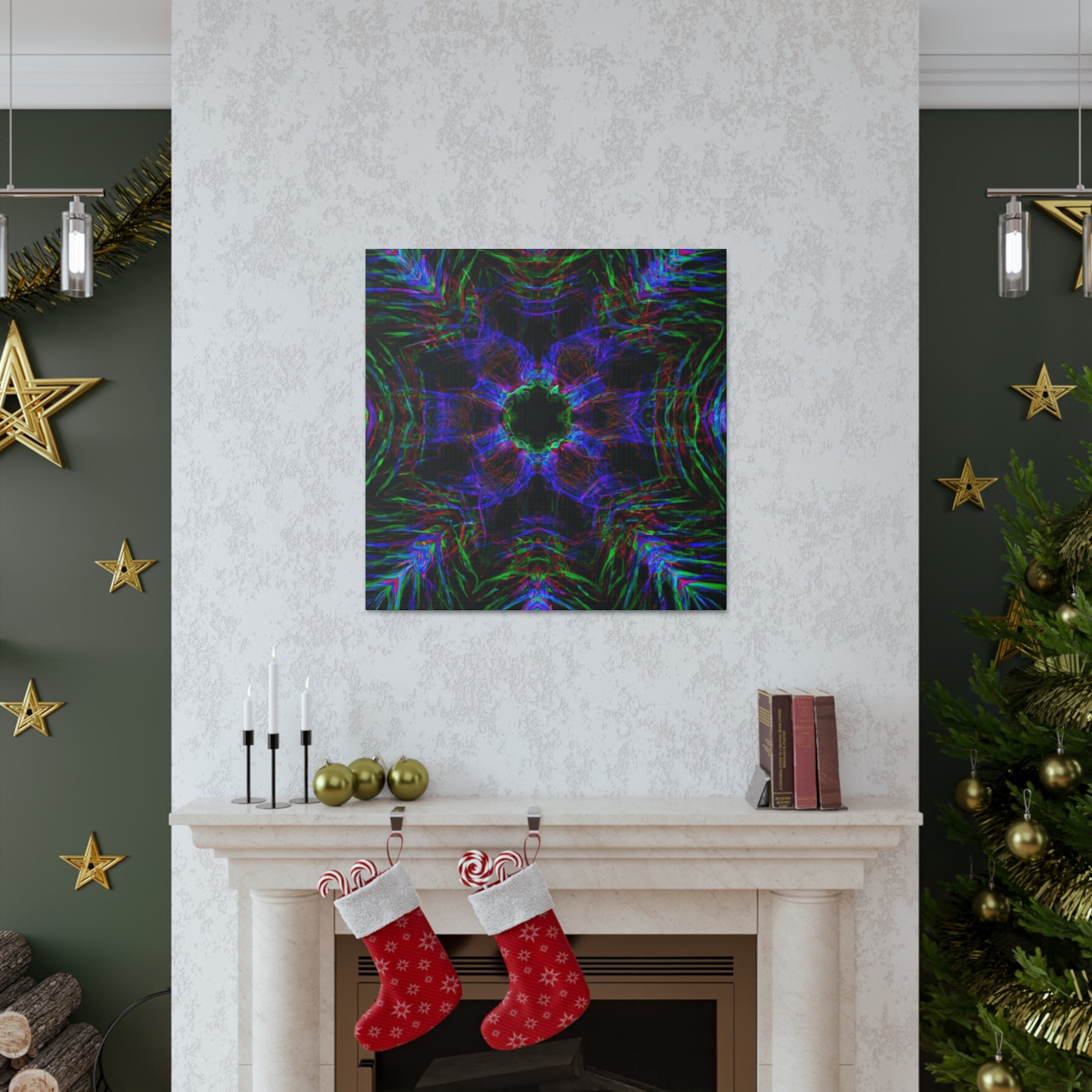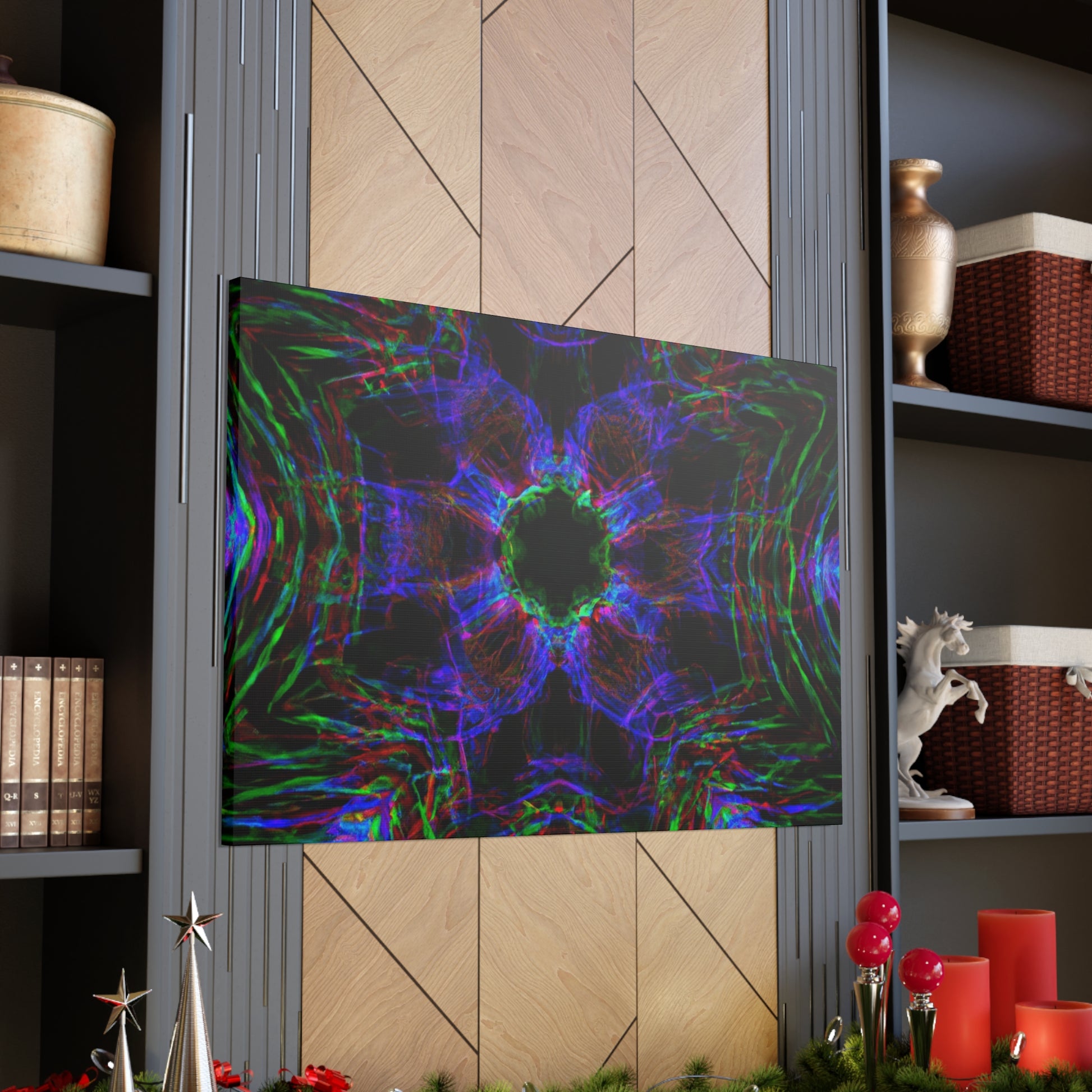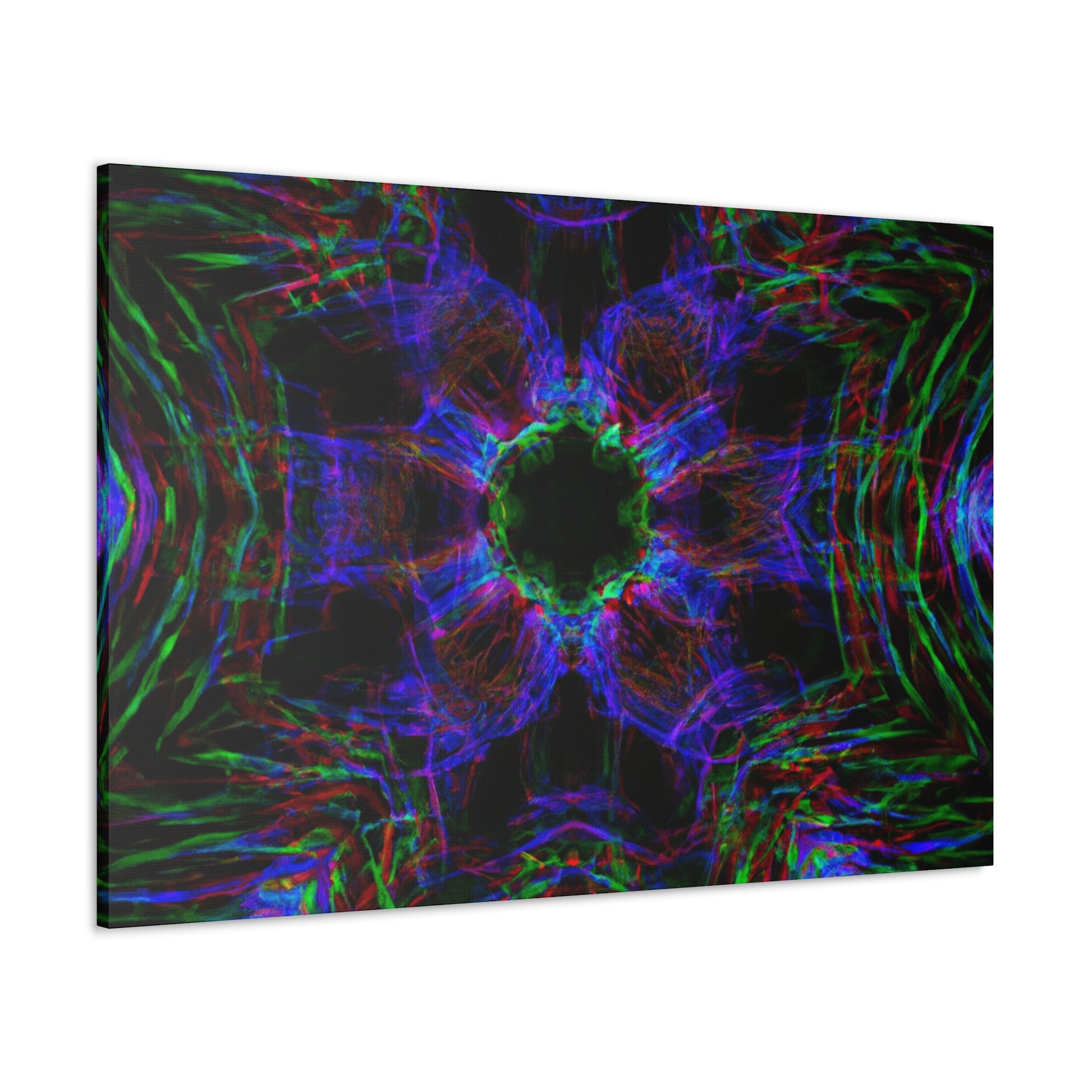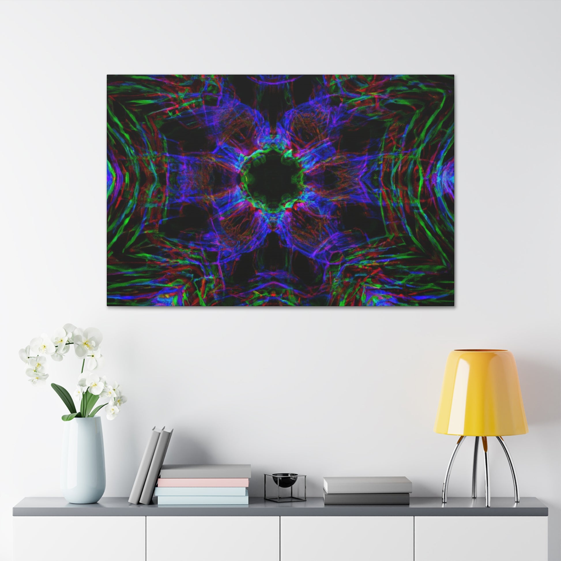 This awe-inspiring, handcrafted canvas art is spiced up by a unique mix of modern and abstract elements. Vibrant colors, 3D lines, fractals, and kaleidoscopic geometric palm leaves combine to create a stunning effect! Add a unique and daring touch to any interior with this one-of-a-kind digital art print. #abstractart #palmleaves #kaleidoscope #trippyart #3Dlines #geometricart #fractal #digitalart #vibrantcolors #interiordecor #canvasart