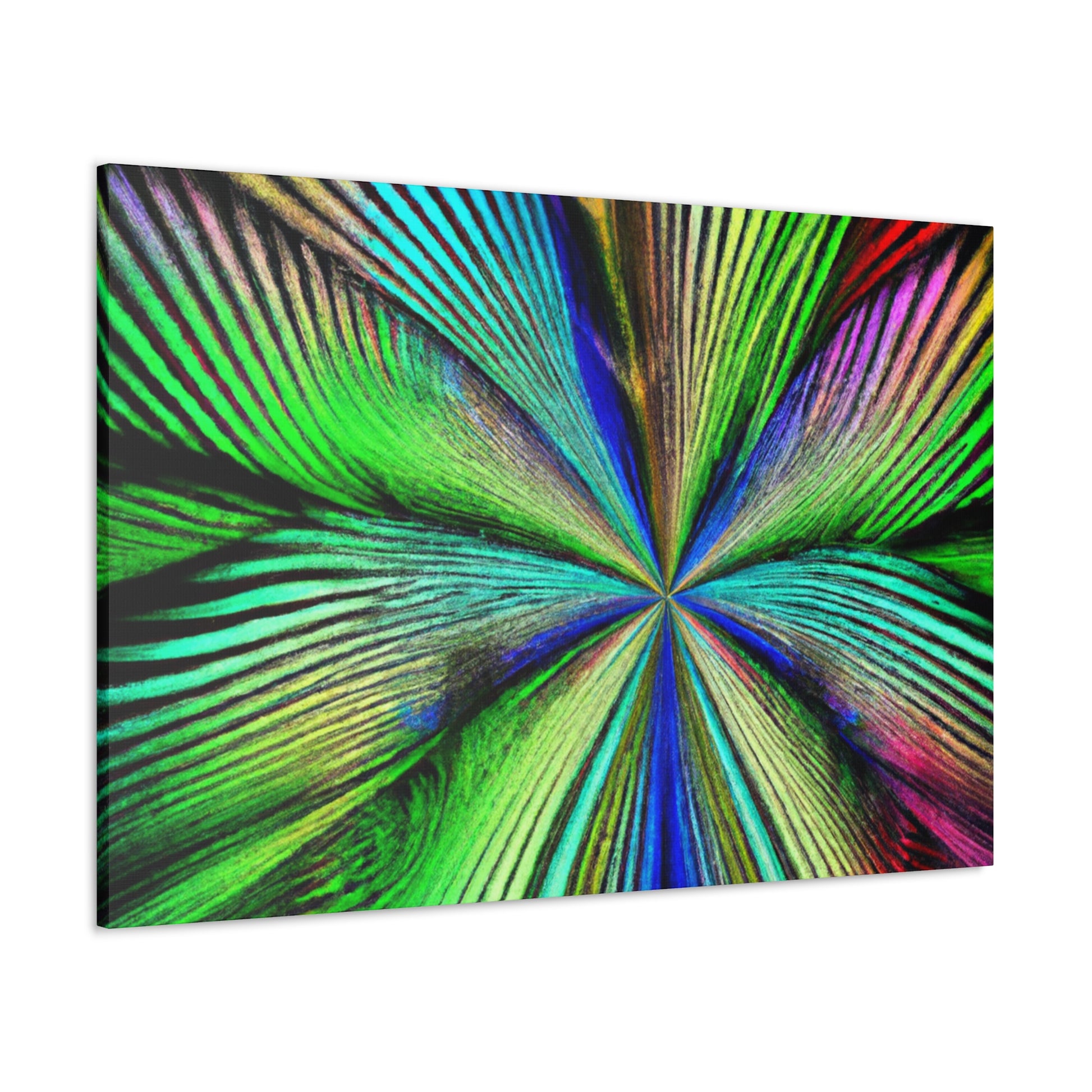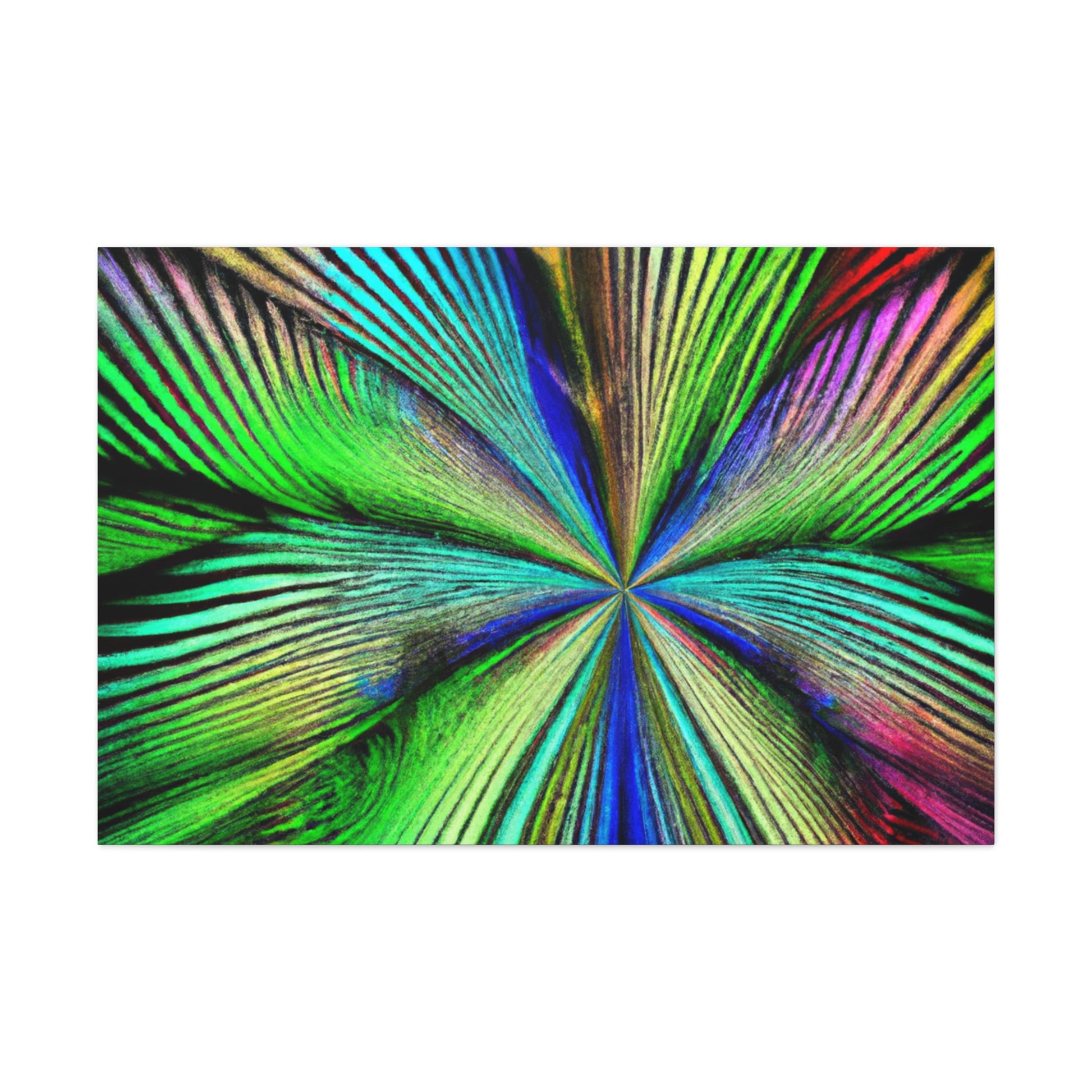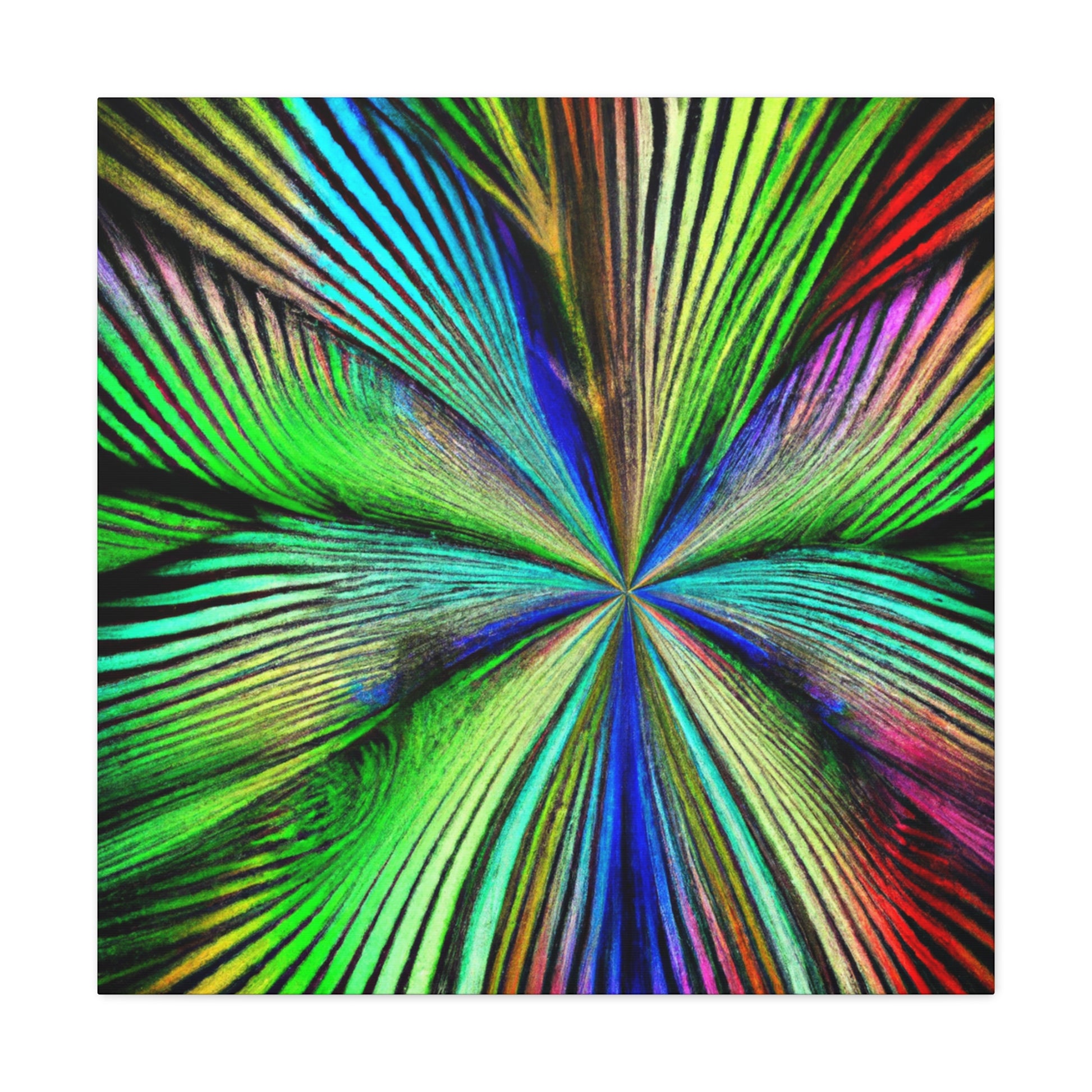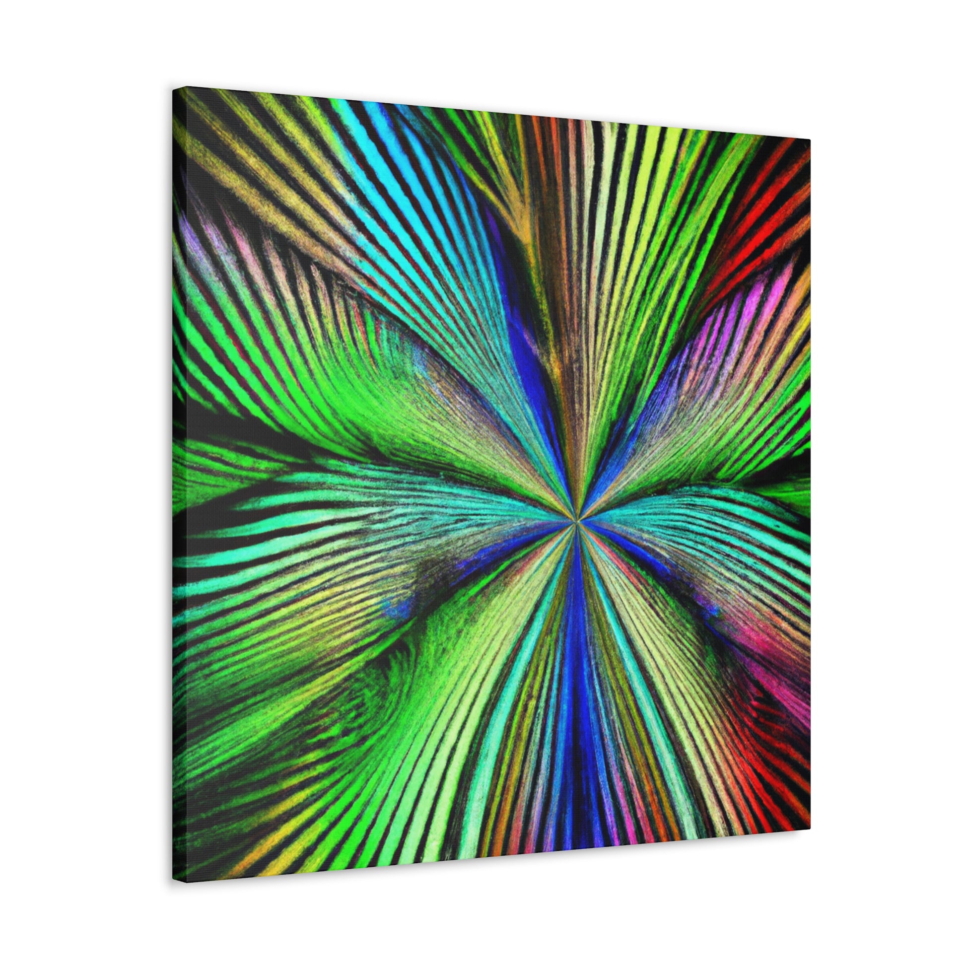 This magnificent canvas showcases a dazzling explosion of color. It features a psychedelic interpretation of geometric palm leaves in vibrant reds, blues and yellows, radiating from the center in hypnotic 3D lines. A kaleidoscope of abstract shapes shift and distort as you view the piece from different angles. This mesmerising effect makes it an ideal addition to any home or office, infusing the space with bold creativity and life. #digitalart #abstractart #canvasart #vibrantcolors #fractalart #psychedelicart #3Dlines #kaleidoscopeart #geometricart #palmleavesart #interiordesign