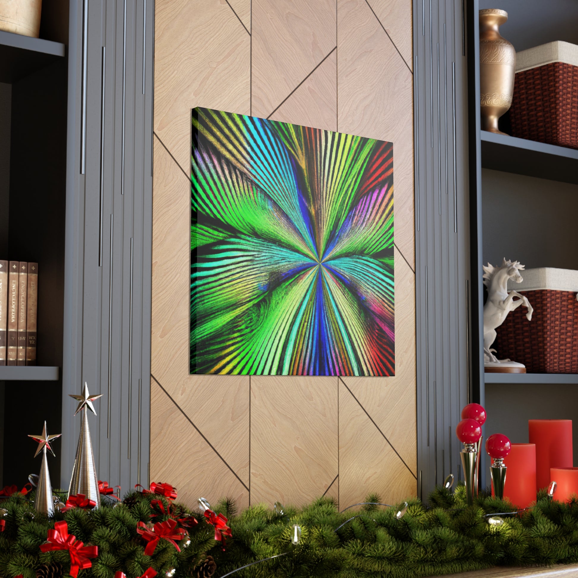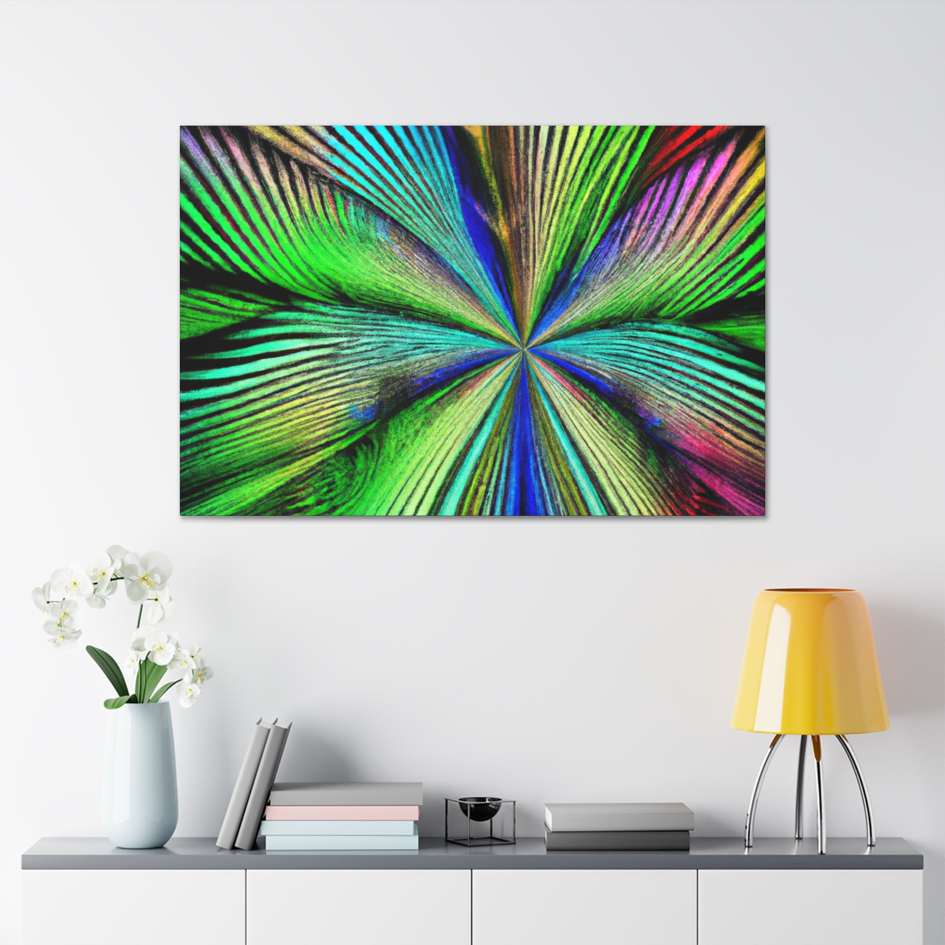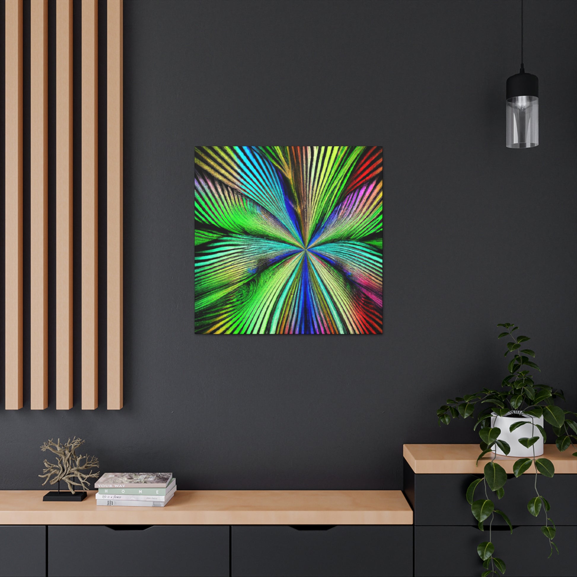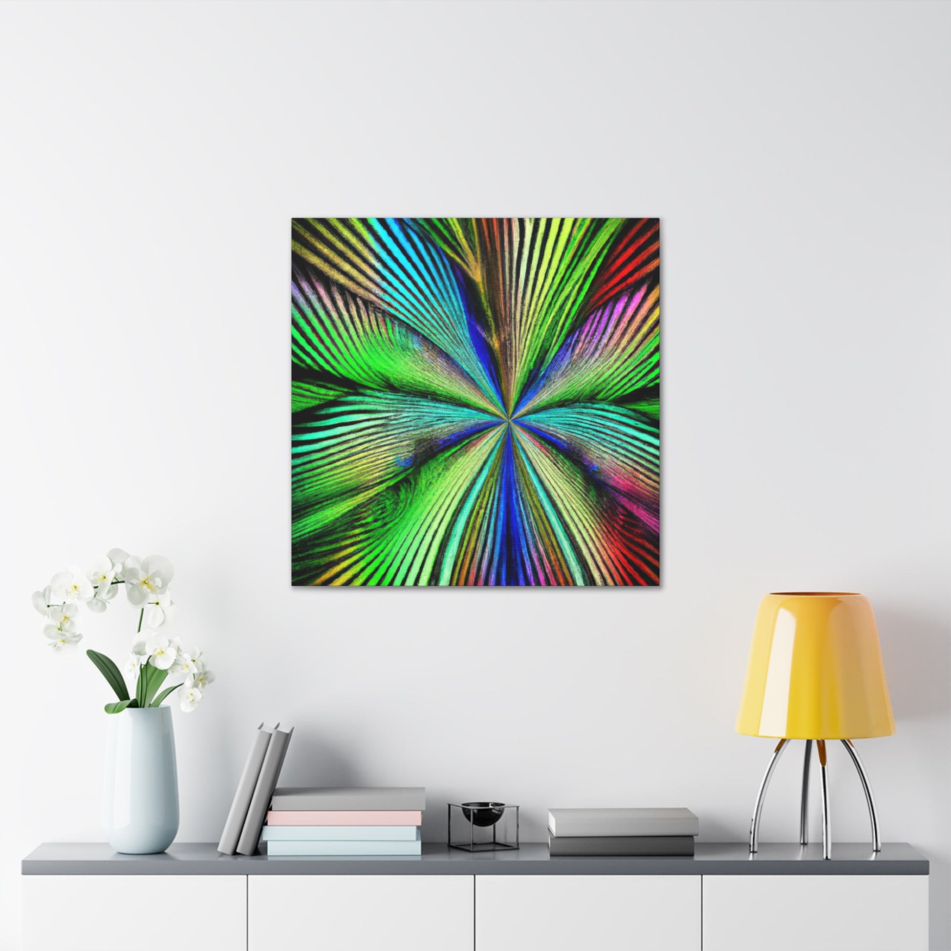 This magnificent canvas showcases a dazzling explosion of color. It features a psychedelic interpretation of geometric palm leaves in vibrant reds, blues and yellows, radiating from the center in hypnotic 3D lines. A kaleidoscope of abstract shapes shift and distort as you view the piece from different angles. This mesmerising effect makes it an ideal addition to any home or office, infusing the space with bold creativity and life. #digitalart #abstractart #canvasart #vibrantcolors #fractalart #psychedelicart #3Dlines #kaleidoscopeart #geometricart #palmleavesart #interiordesign