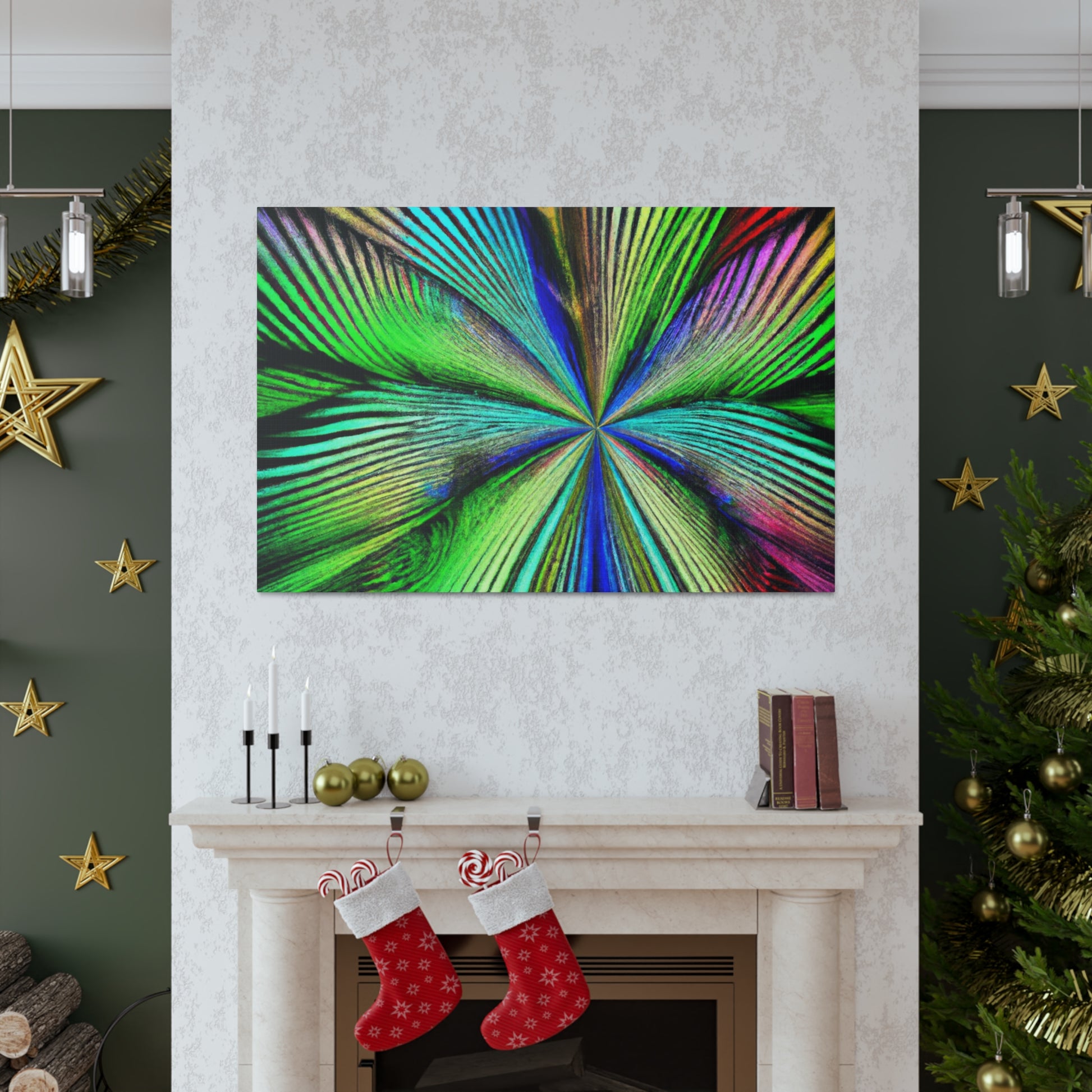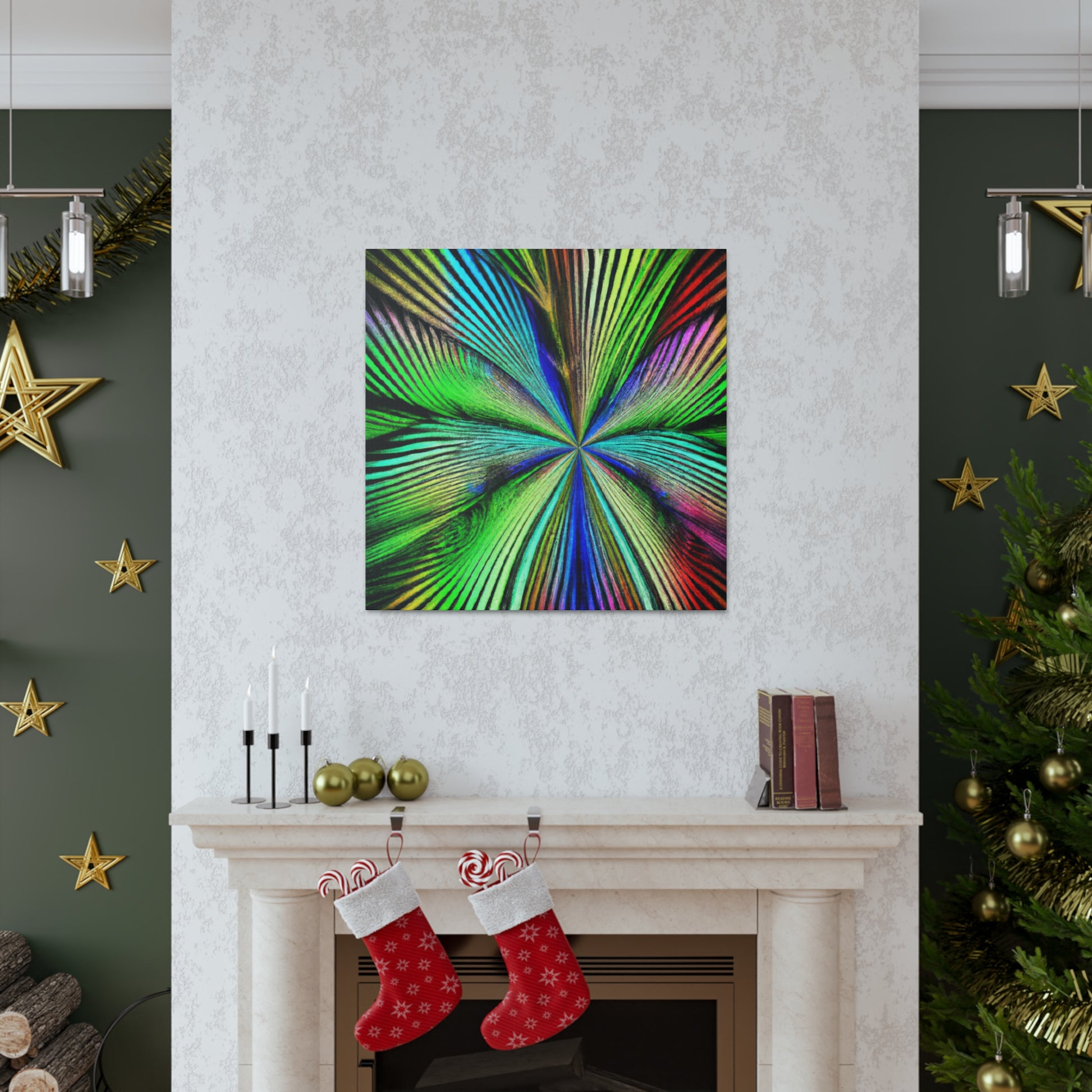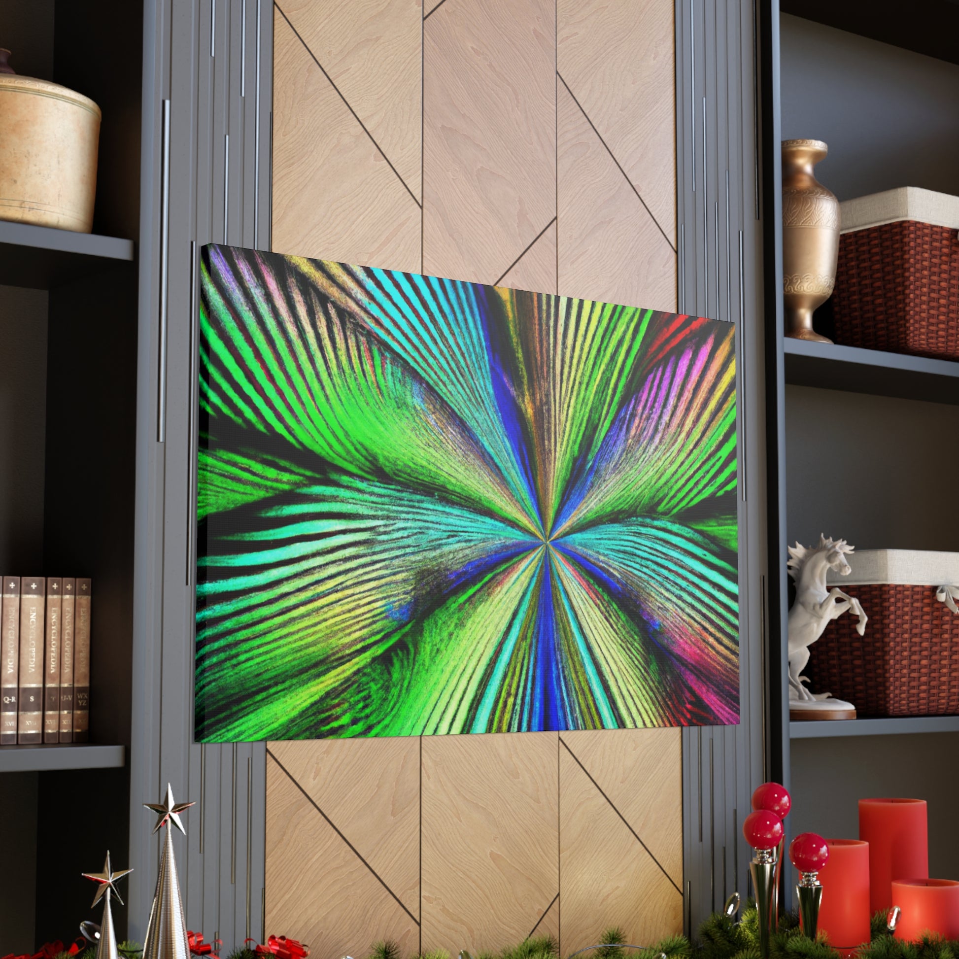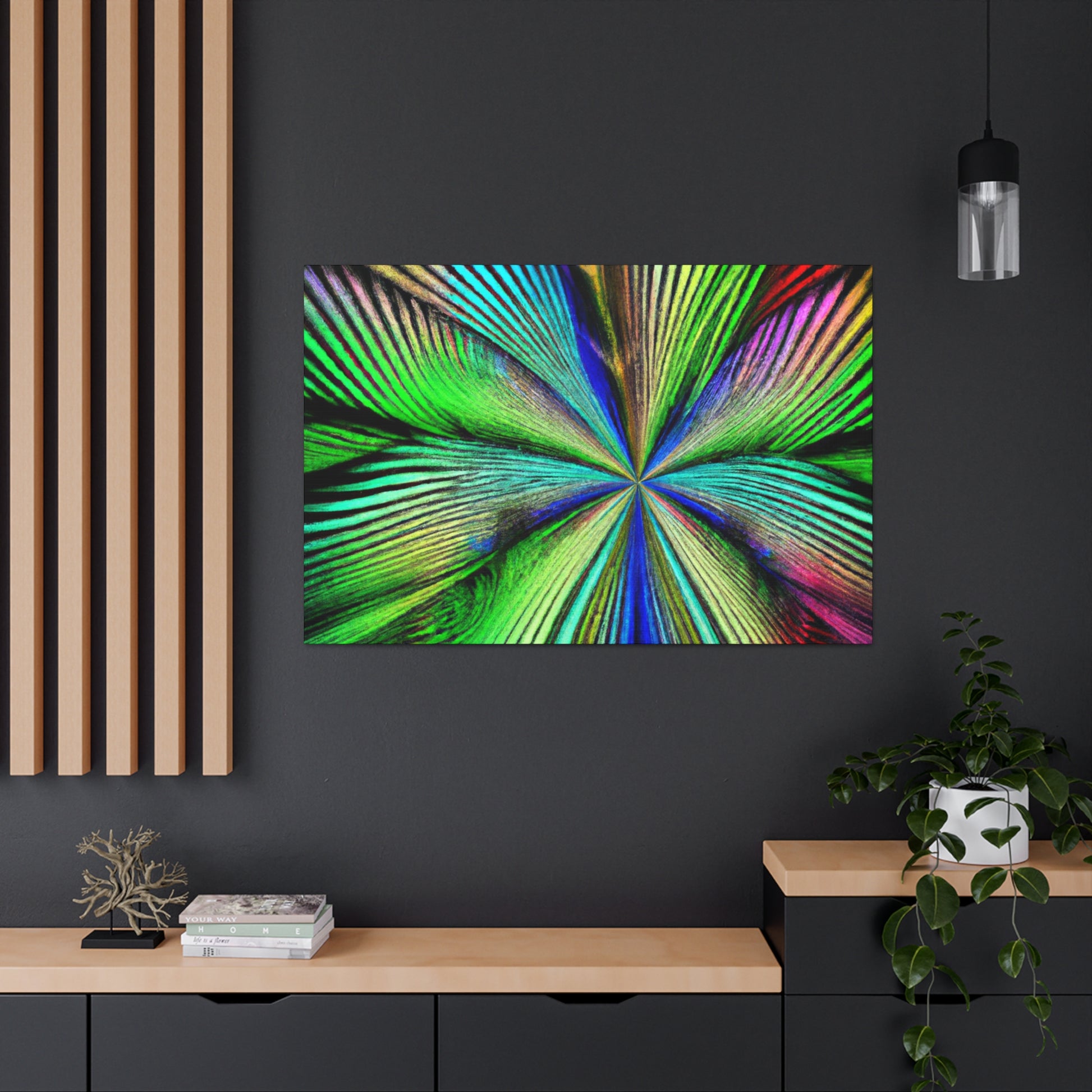 This magnificent canvas showcases a dazzling explosion of color. It features a psychedelic interpretation of geometric palm leaves in vibrant reds, blues and yellows, radiating from the center in hypnotic 3D lines. A kaleidoscope of abstract shapes shift and distort as you view the piece from different angles. This mesmerising effect makes it an ideal addition to any home or office, infusing the space with bold creativity and life. #digitalart #abstractart #canvasart #vibrantcolors #fractalart #psychedelicart #3Dlines #kaleidoscopeart #geometricart #palmleavesart #interiordesign