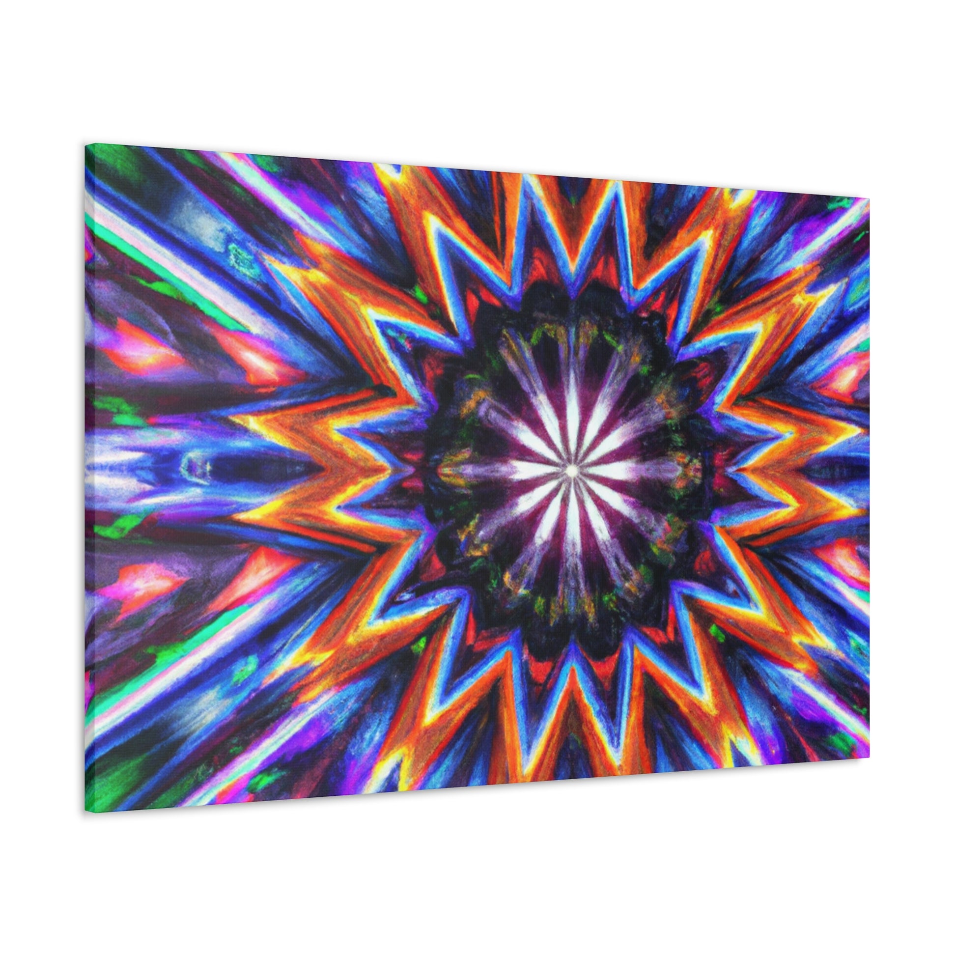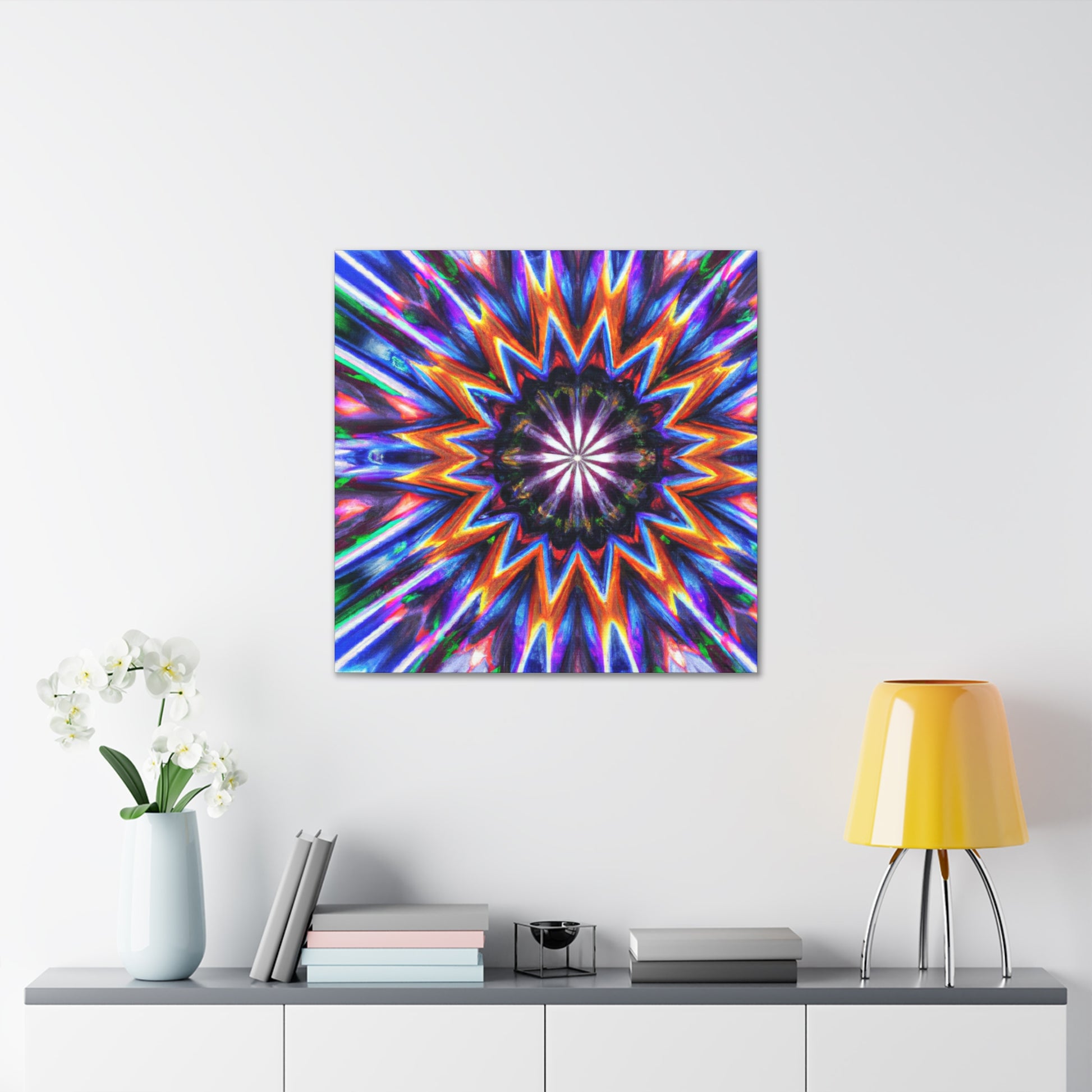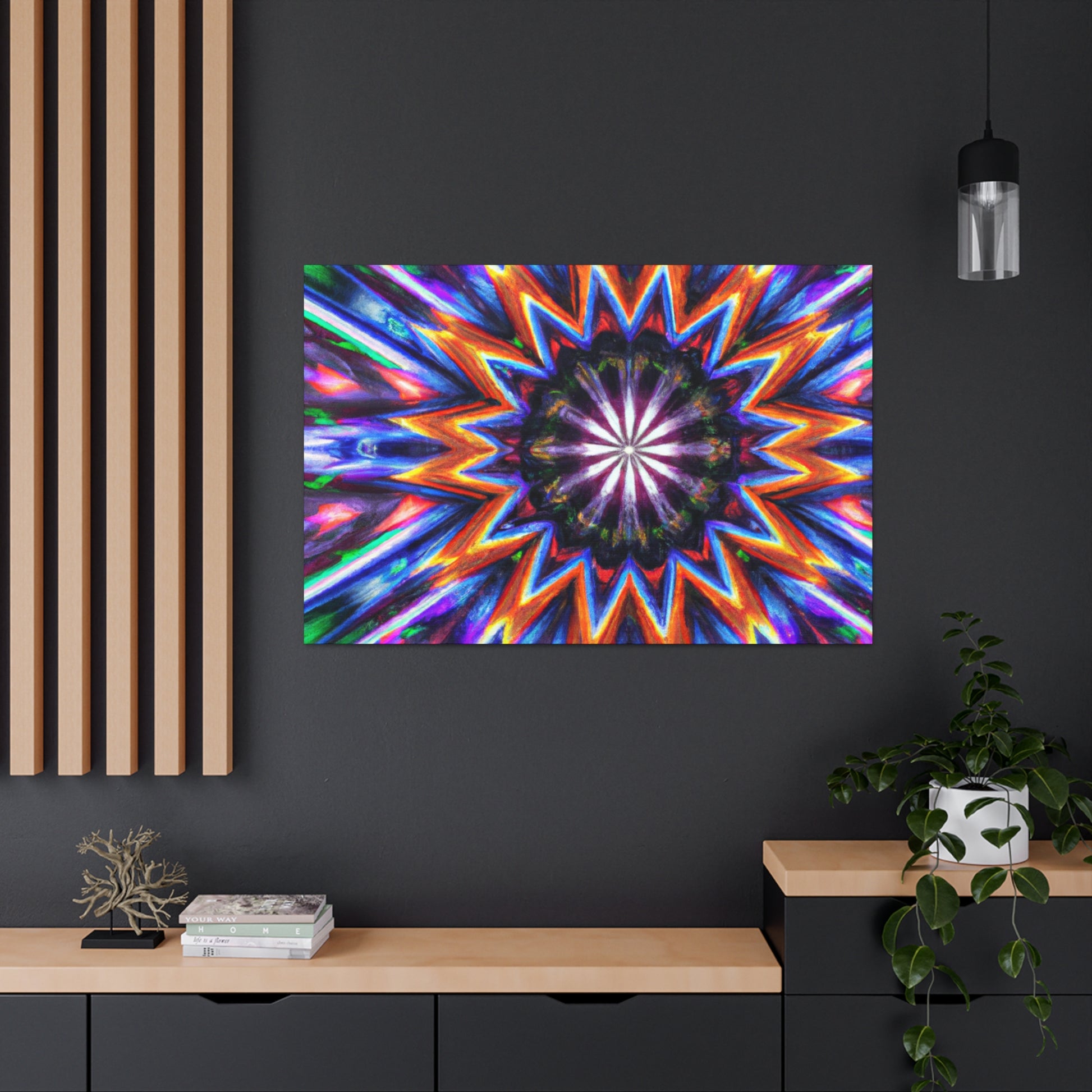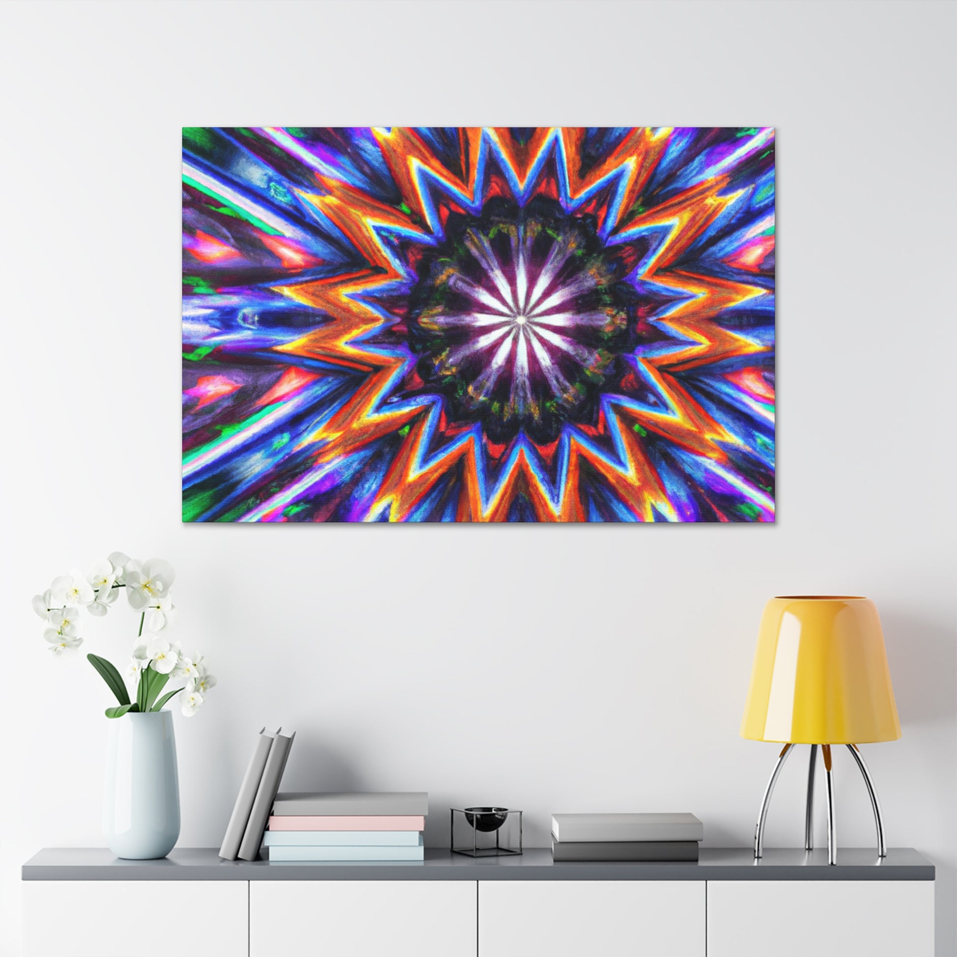 This vibrant, abstract canvas is perfect for making any room pop! Its Trippy stars, kaleidscope, and digital art design creates a symmetrical, HD effect in the room. Vibrant colors and symmetry will give your home a unique look. This canvas is sure to be a conversation piece and a favorite of all! #TrippyStars #Kaleidoscope #AbstractArt #DigitalArt #VibrantColors #HD #HomeDesign #InterierDecor #Centerpiece #LivingRoomDecor #UniqueDesign