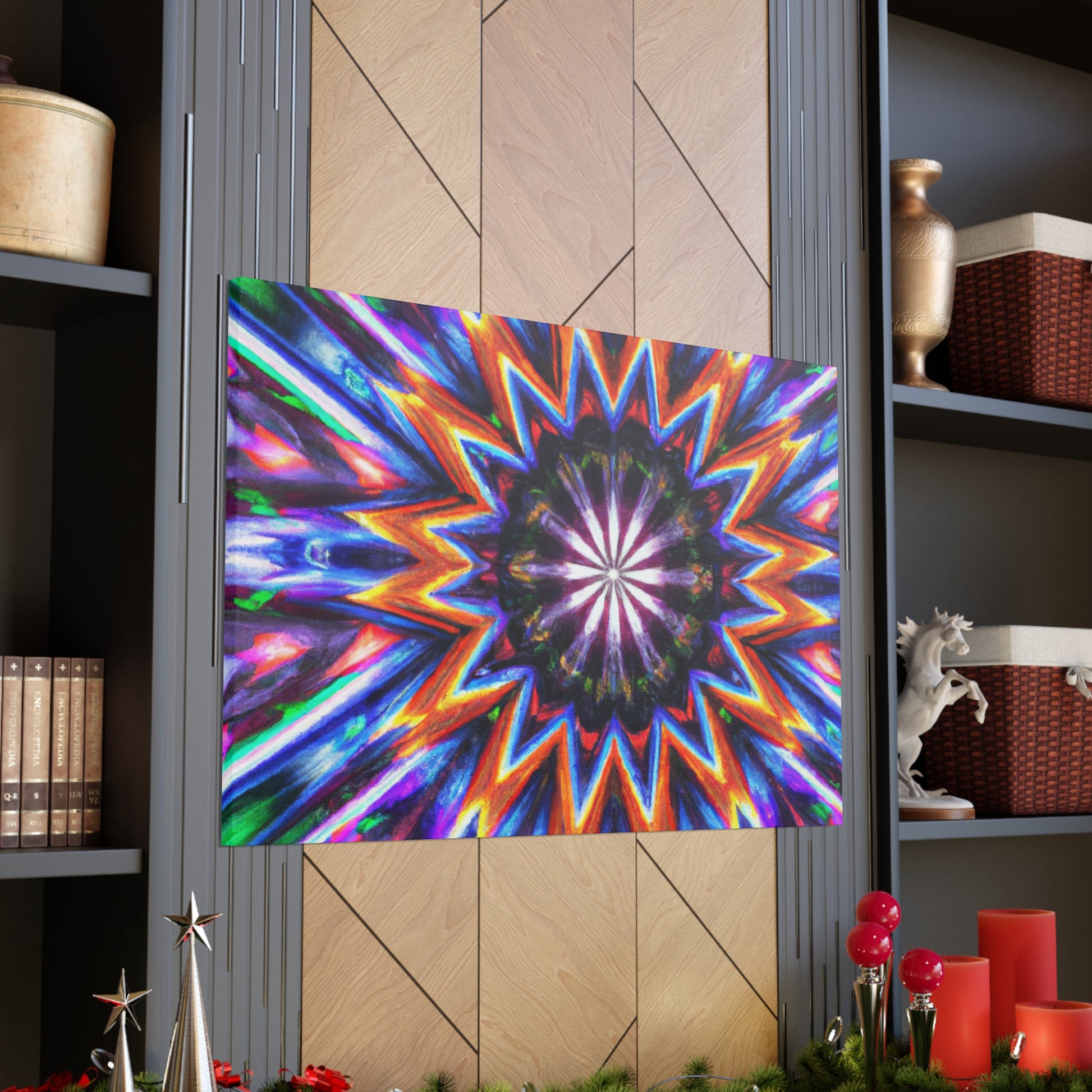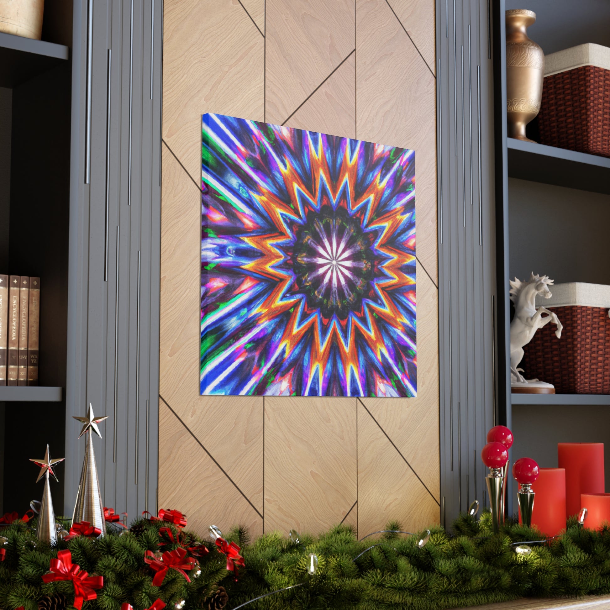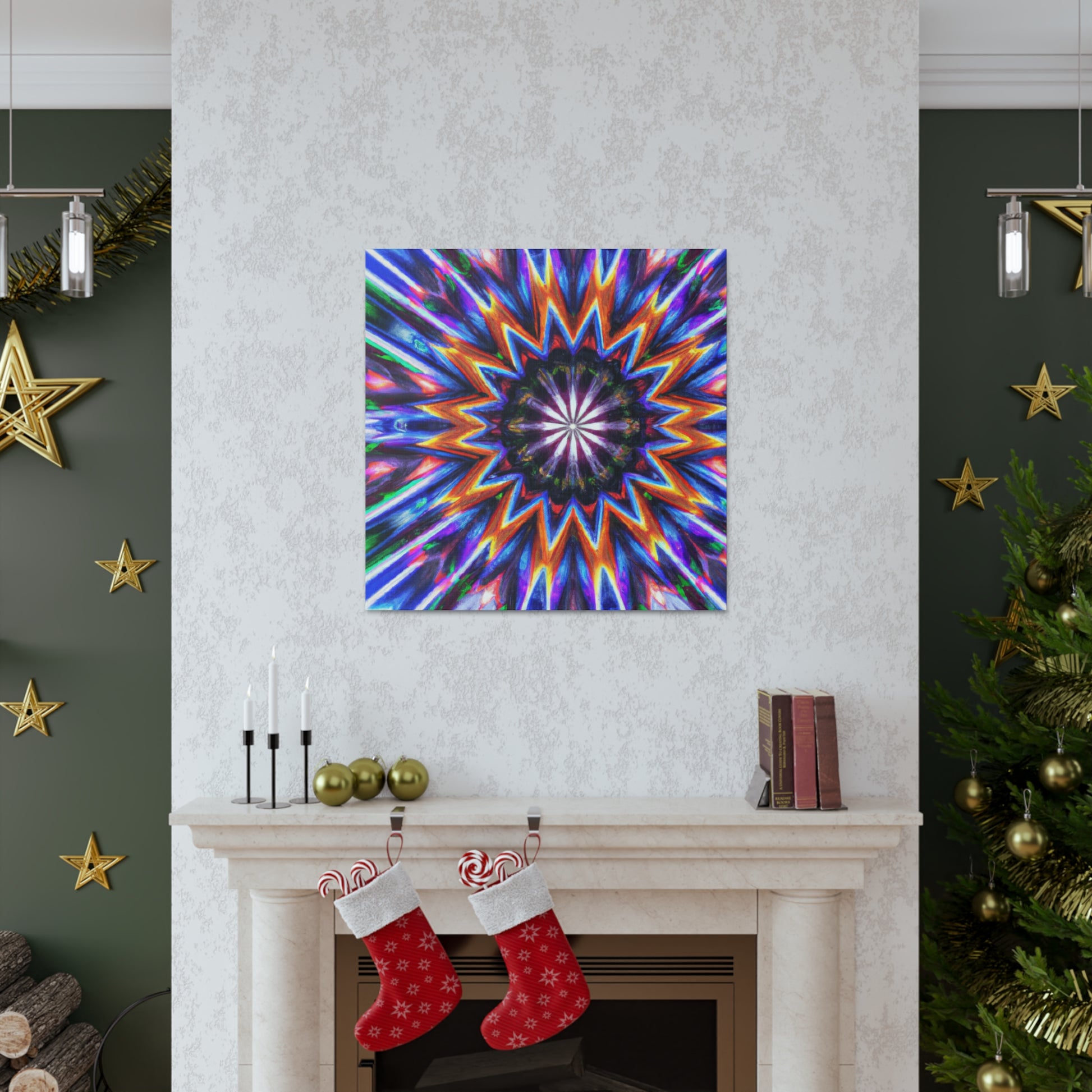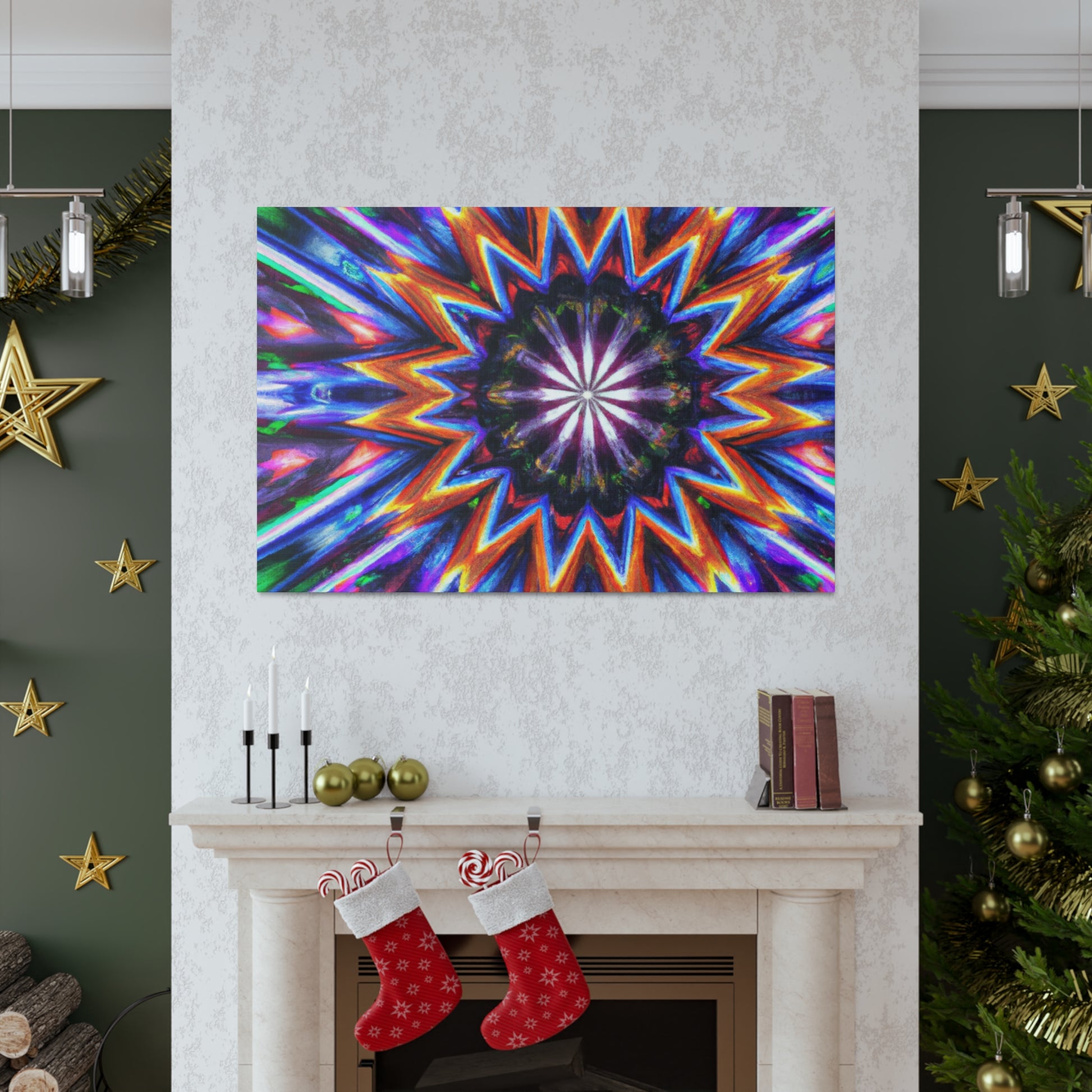 This vibrant, abstract canvas is perfect for making any room pop! Its Trippy stars, kaleidscope, and digital art design creates a symmetrical, HD effect in the room. Vibrant colors and symmetry will give your home a unique look. This canvas is sure to be a conversation piece and a favorite of all! #TrippyStars #Kaleidoscope #AbstractArt #DigitalArt #VibrantColors #HD #HomeDesign #InterierDecor #Centerpiece #LivingRoomDecor #UniqueDesign