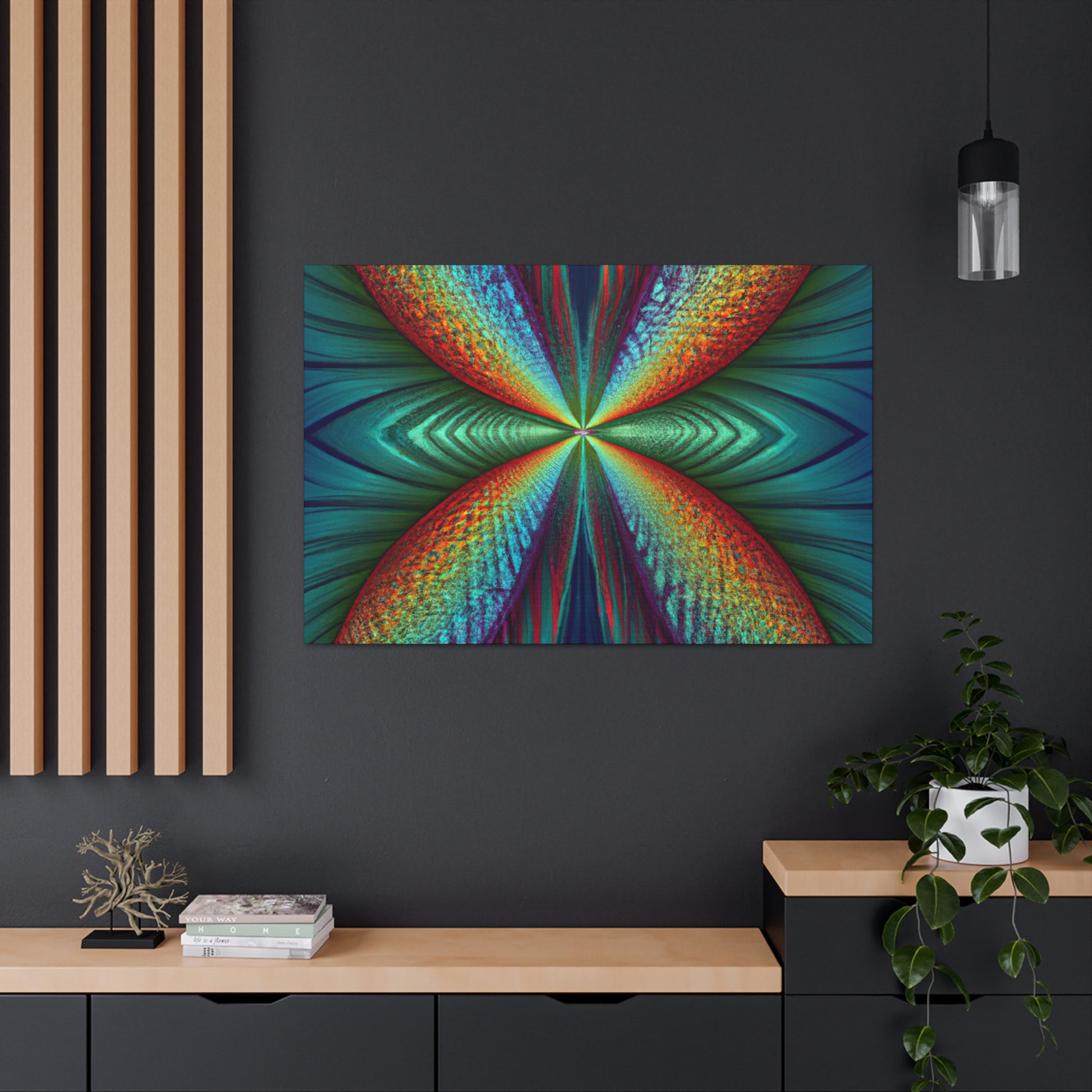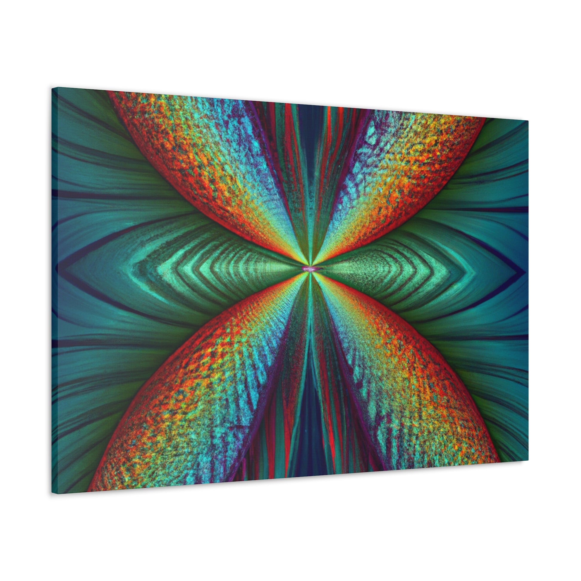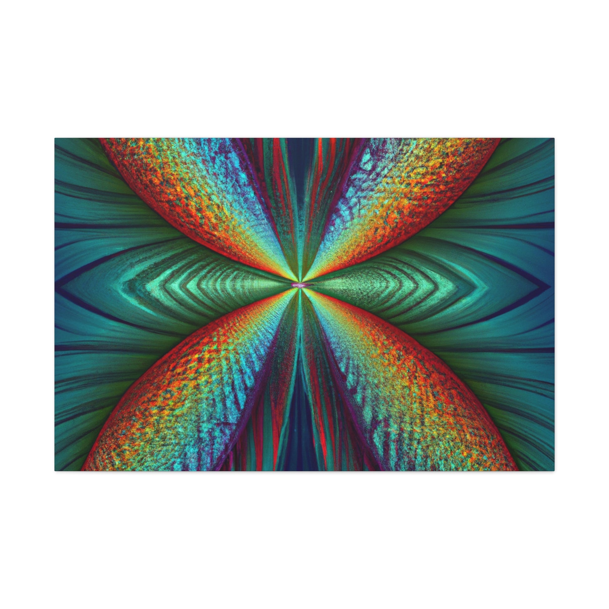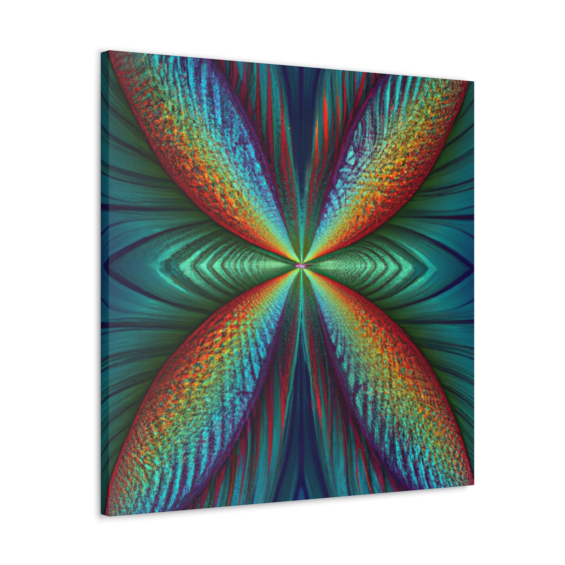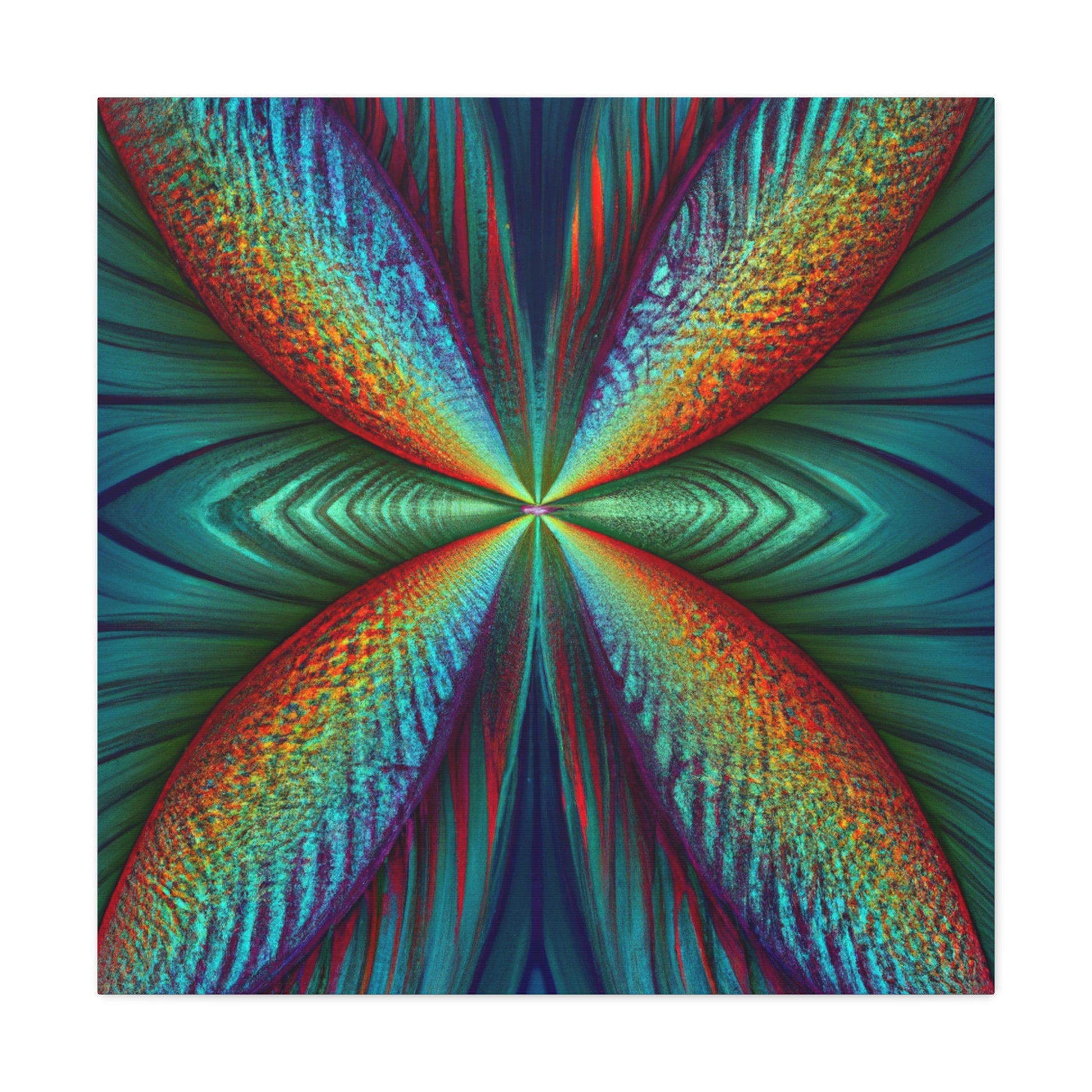 This canvas art is sure to add a vibrant touch to any living space. Featuring trippy geometric palm leaves, surreal kaleidoscope patterns, flowing abstract designs, and conformative 3D lines, this art is like an explosion of fractal shapes and colors. Hang this contemporary art piece and make a statement in your home! #Trippy #Geometric #PalmLeaves #Kaleidoscope #Abstract #DigitalArt #VibrantColors #3DLines #Fractal #ContemporaryArt #CanvasArt