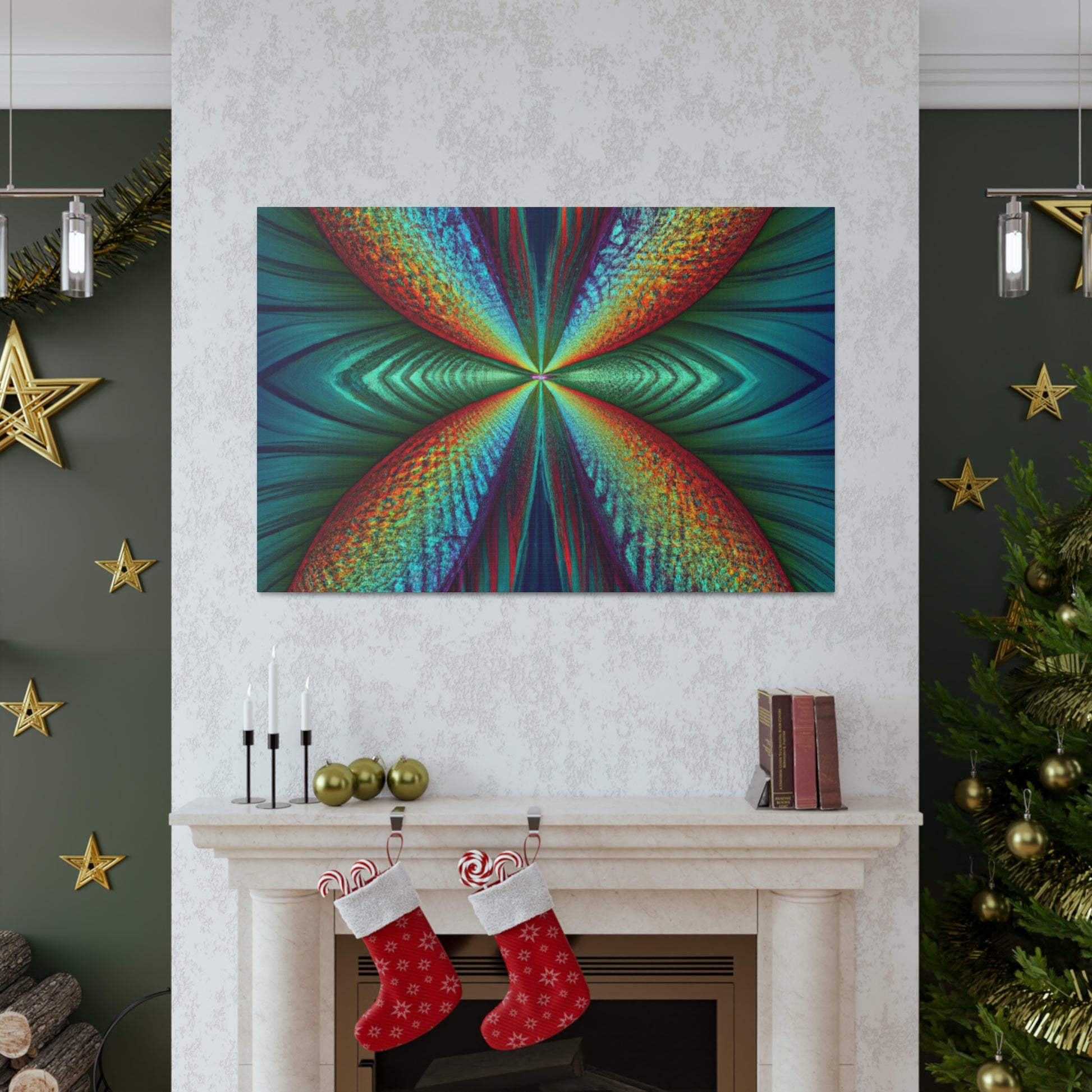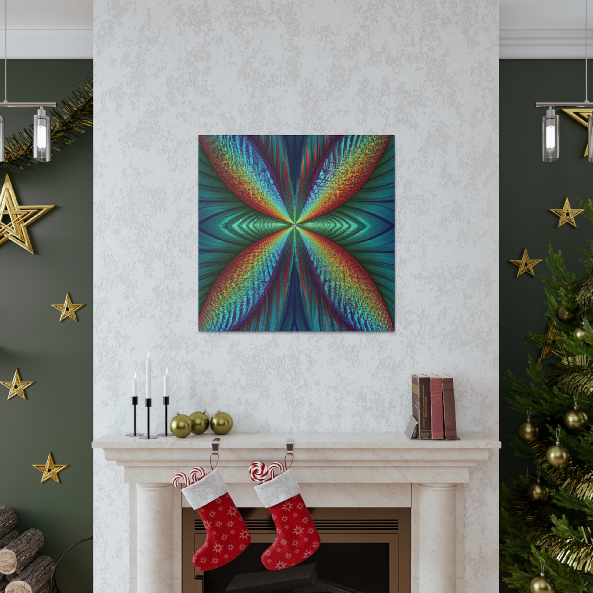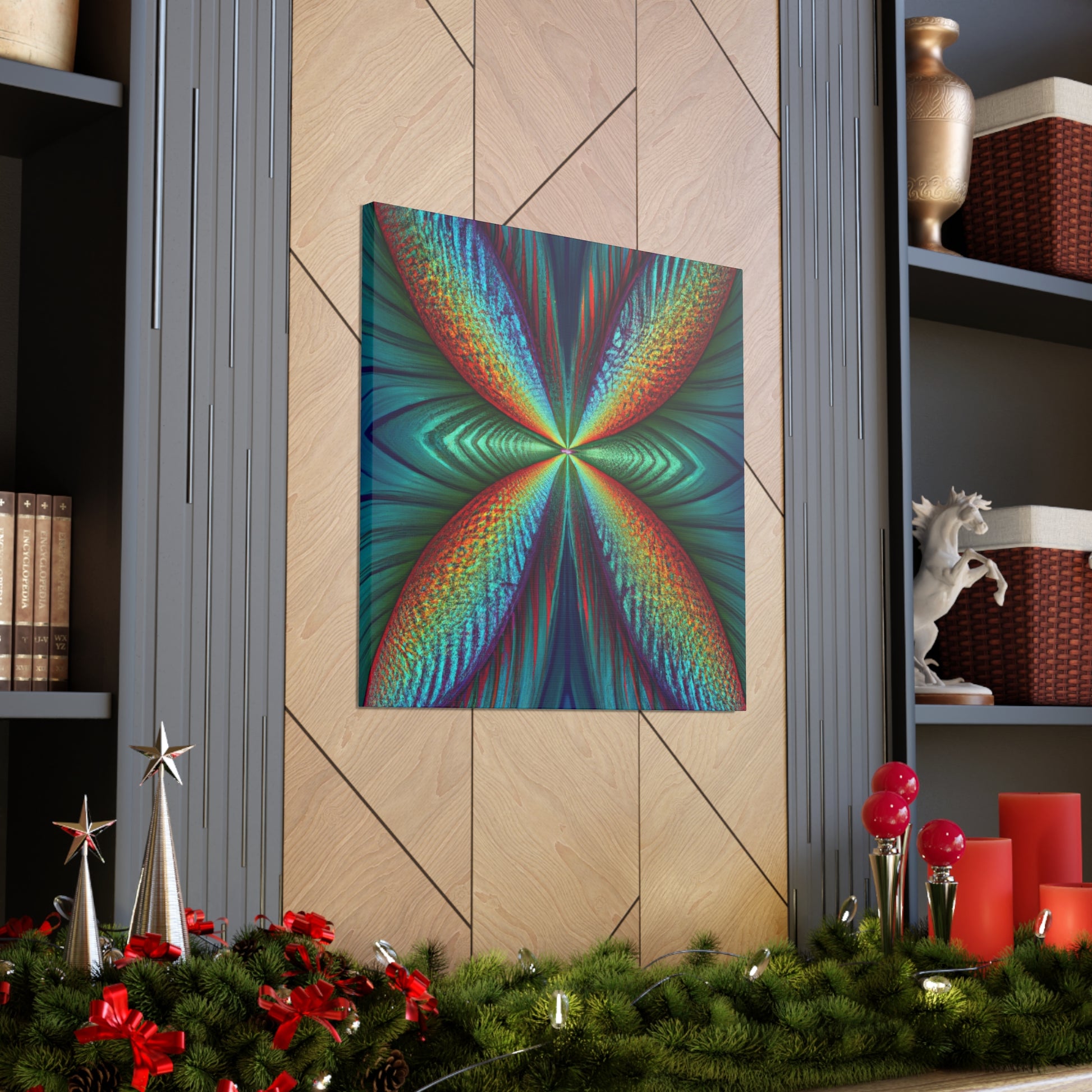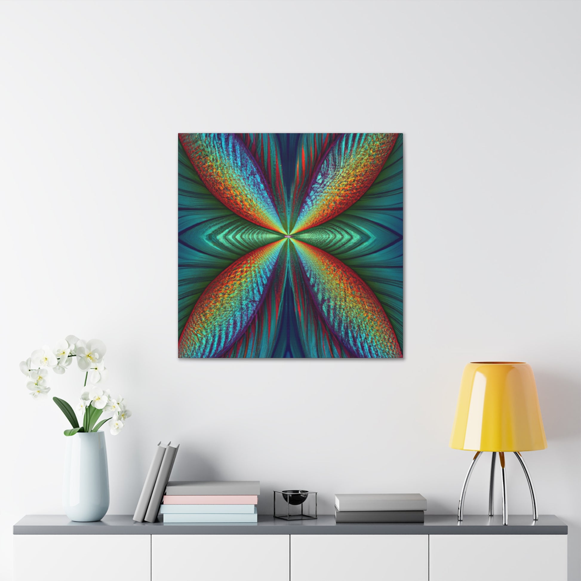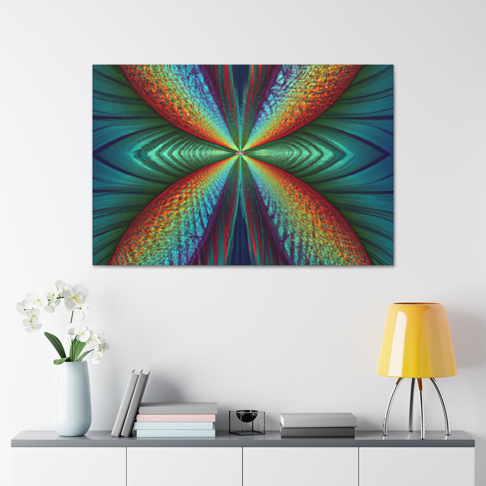 This canvas art is sure to add a vibrant touch to any living space. Featuring trippy geometric palm leaves, surreal kaleidoscope patterns, flowing abstract designs, and conformative 3D lines, this art is like an explosion of fractal shapes and colors. Hang this contemporary art piece and make a statement in your home! #Trippy #Geometric #PalmLeaves #Kaleidoscope #Abstract #DigitalArt #VibrantColors #3DLines #Fractal #ContemporaryArt #CanvasArt