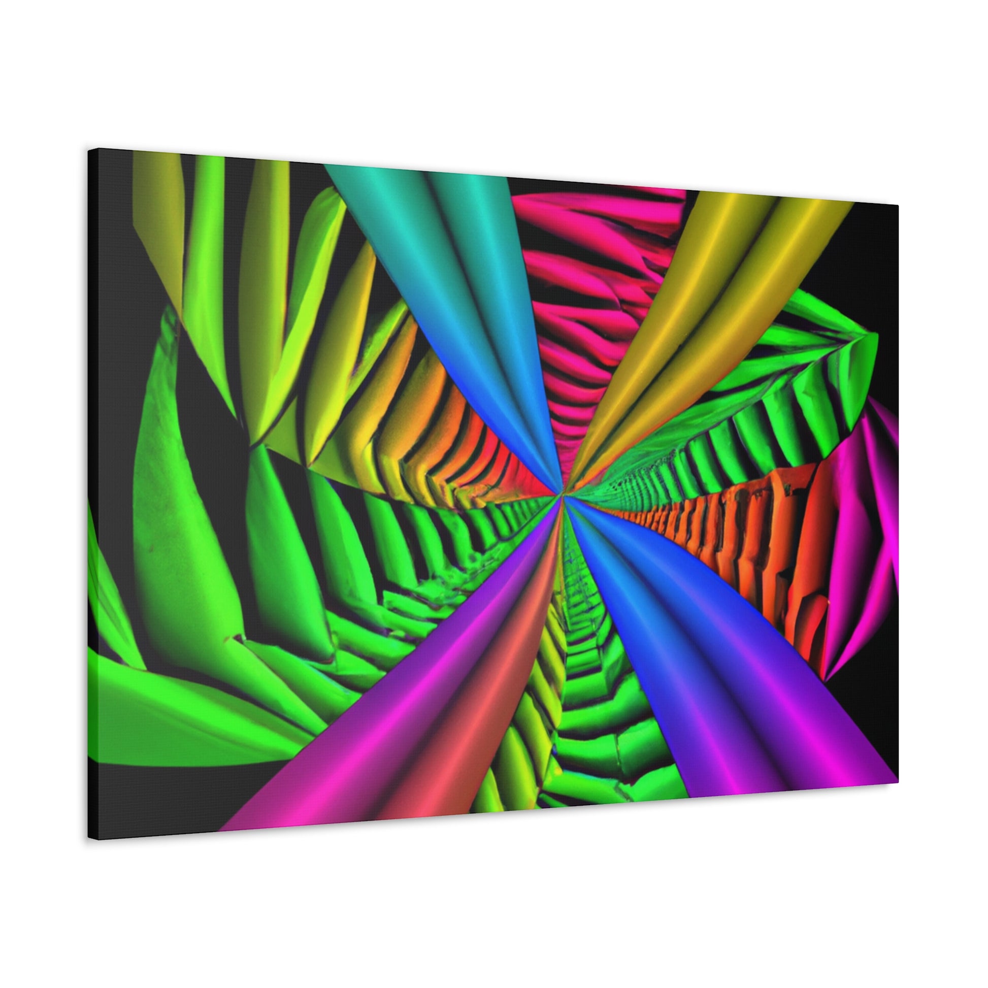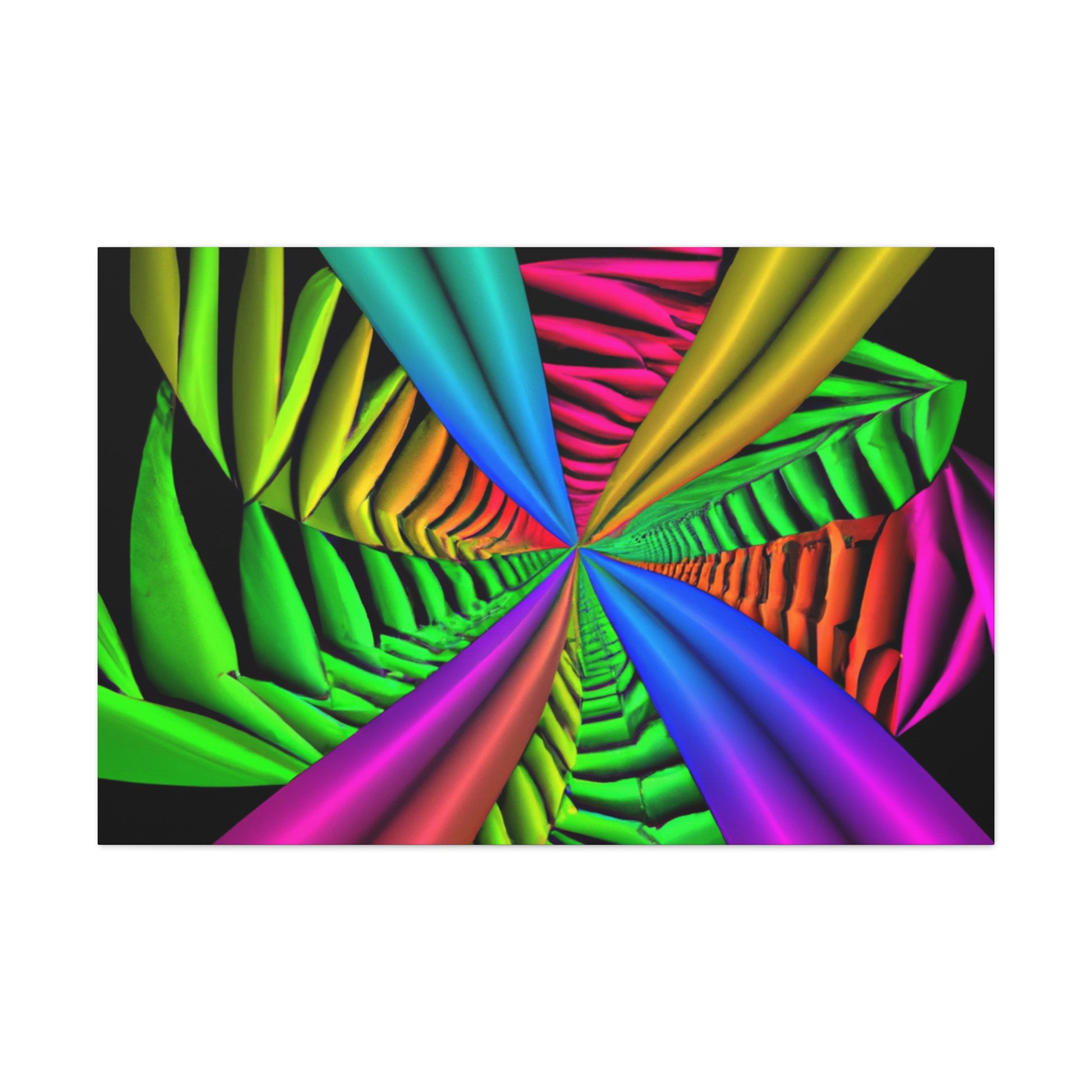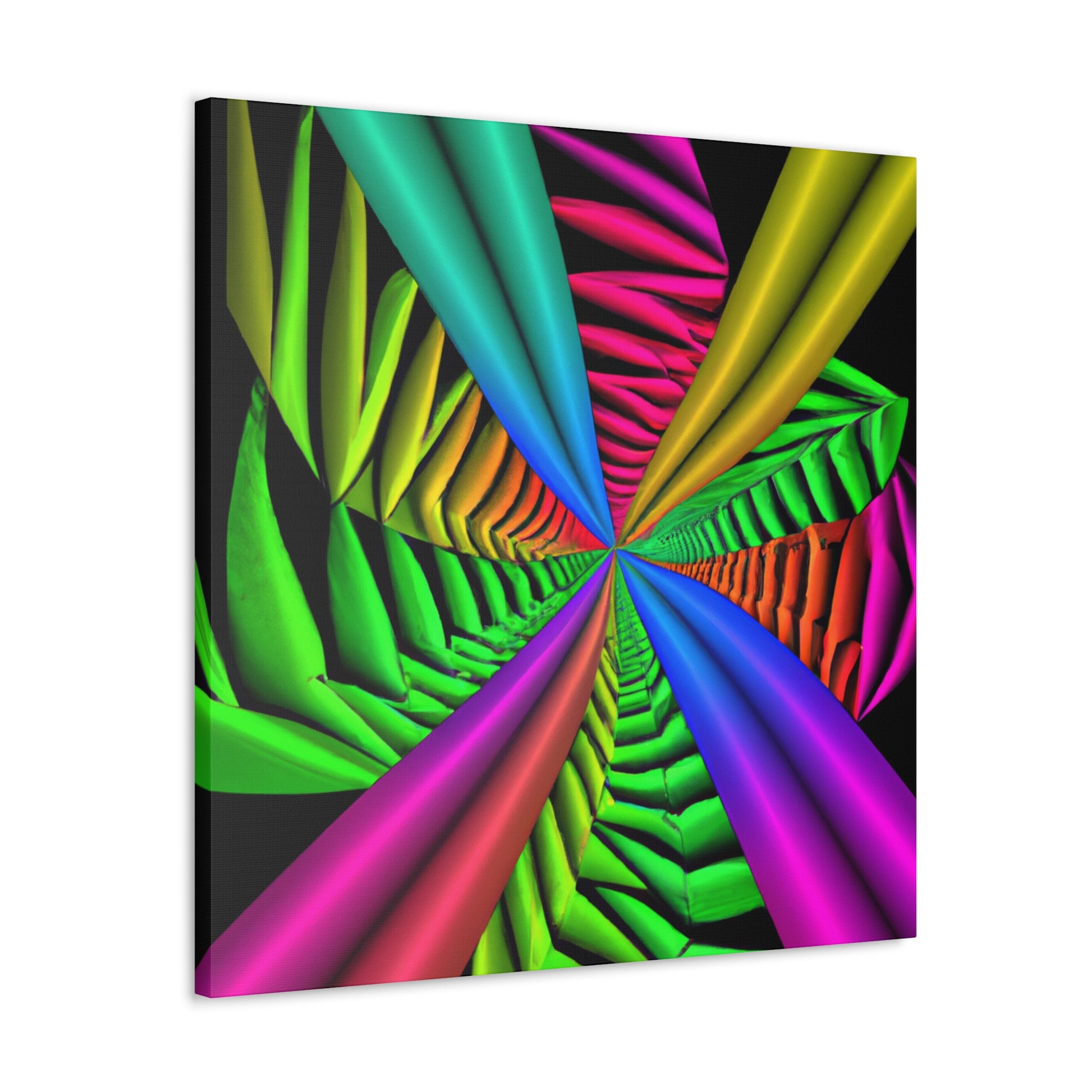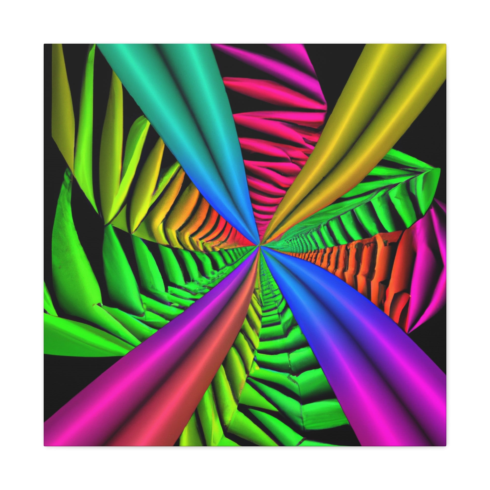 This canvas is a unique and vibrant addition to any wall. Featuring a captivating Trippy geometric palm leaves design, with kaleidoscope, abstract, digital art, vibrant colors, 3D lines, fractal, it is guaranteed to be a conversation starter. Hang this beautiful artwork to beautifully bring your room to life. #GeometricPalmLeaves #Kaleidoscope #Abstract #DigitalArt #VibrantColors #3DLines #Fractal #WallArt #CanvasArt #HomeDecor #InteriorDesign
