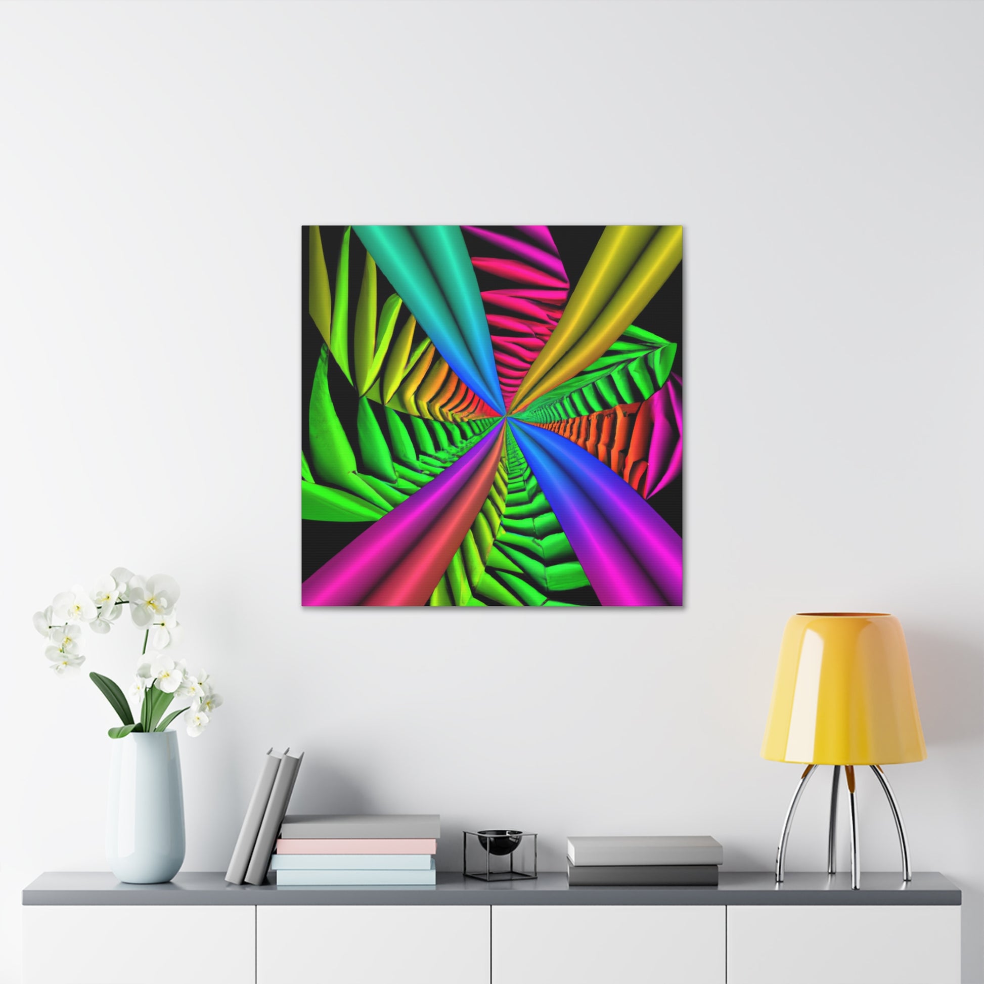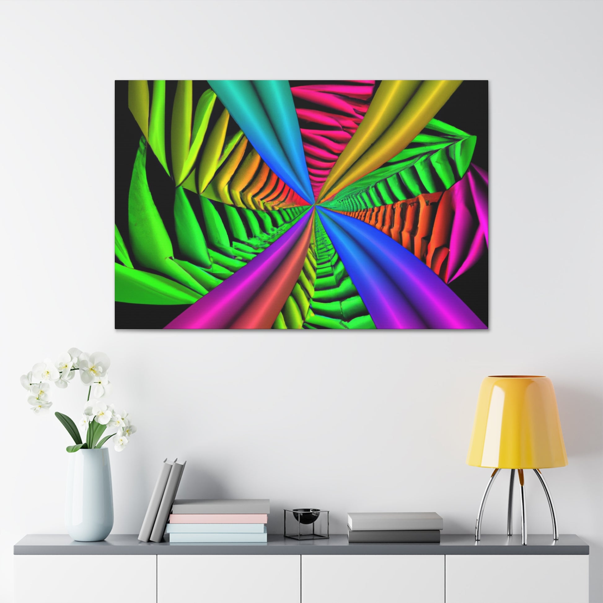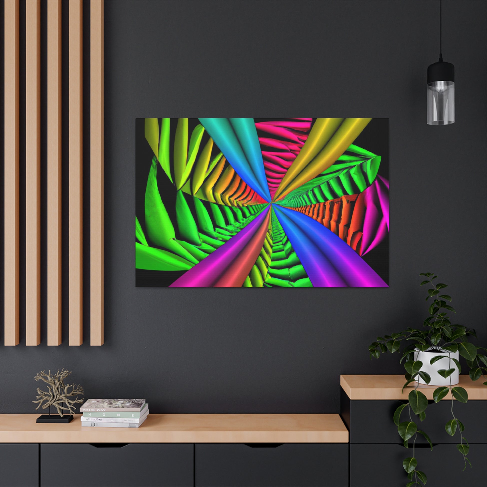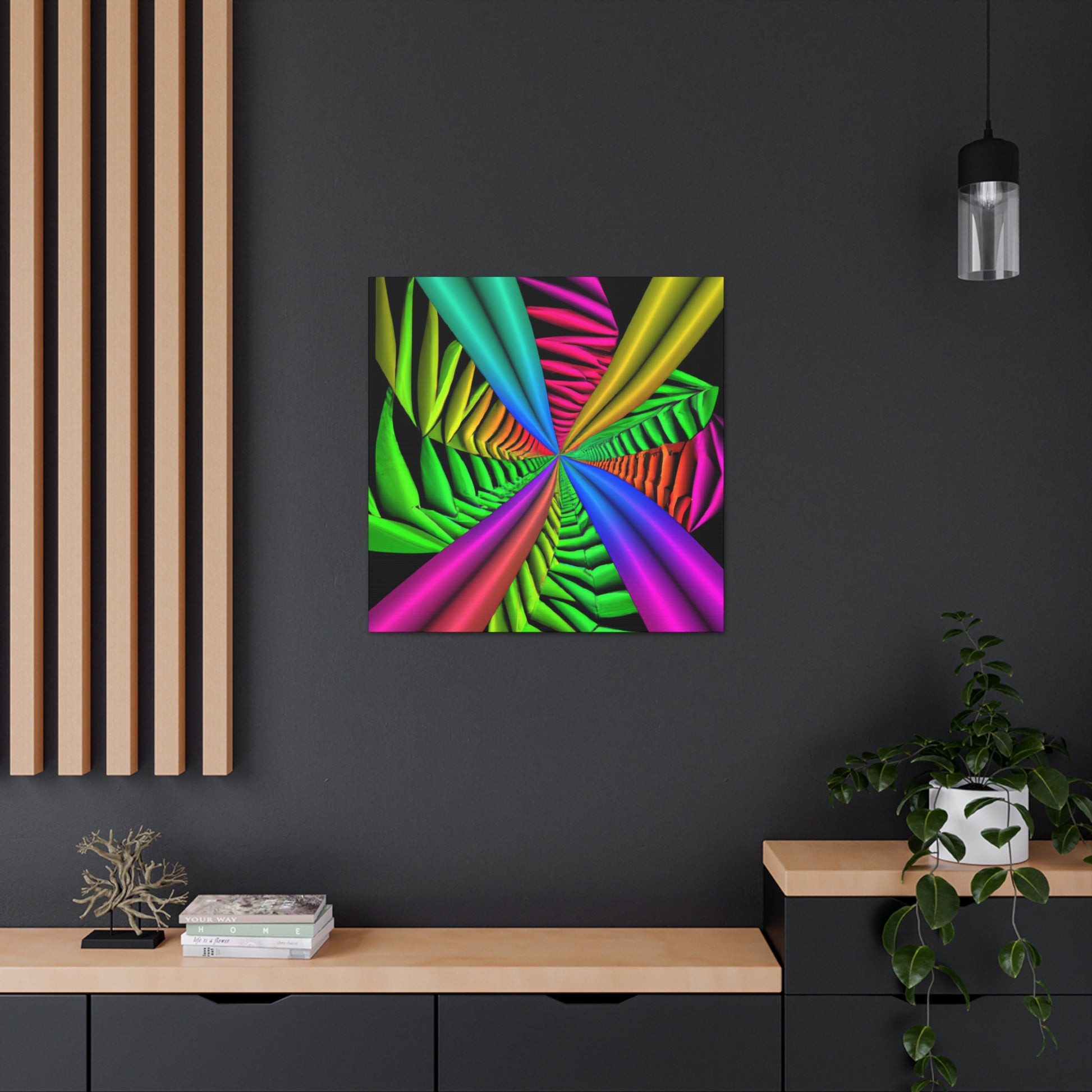 This canvas is a unique and vibrant addition to any wall. Featuring a captivating Trippy geometric palm leaves design, with kaleidoscope, abstract, digital art, vibrant colors, 3D lines, fractal, it is guaranteed to be a conversation starter. Hang this beautiful artwork to beautifully bring your room to life. #GeometricPalmLeaves #Kaleidoscope #Abstract #DigitalArt #VibrantColors #3DLines #Fractal #WallArt #CanvasArt #HomeDecor #InteriorDesign